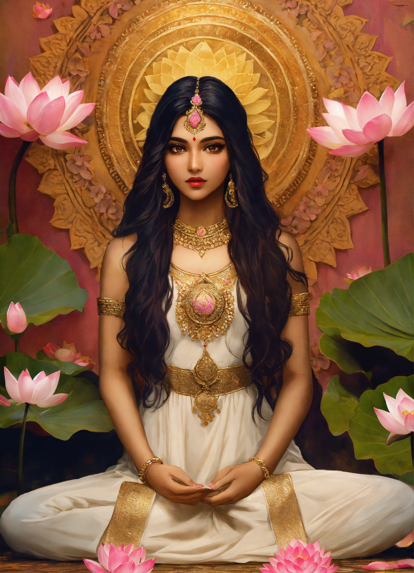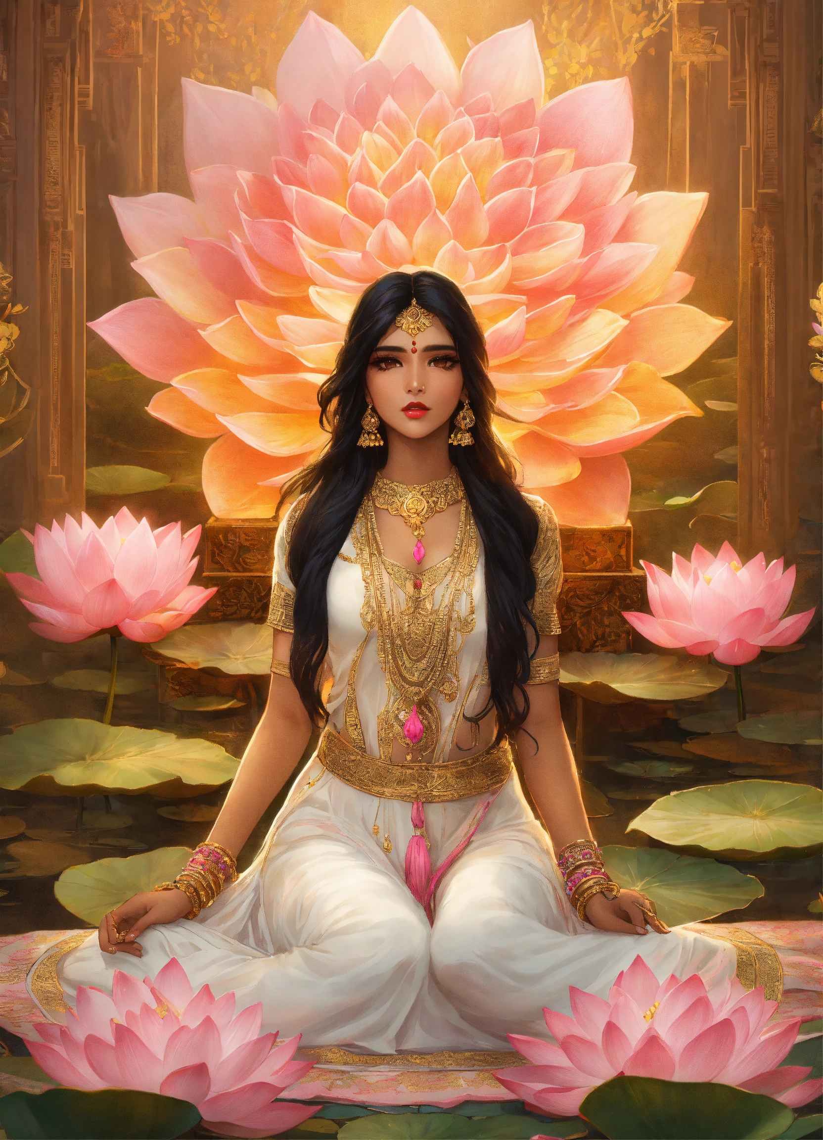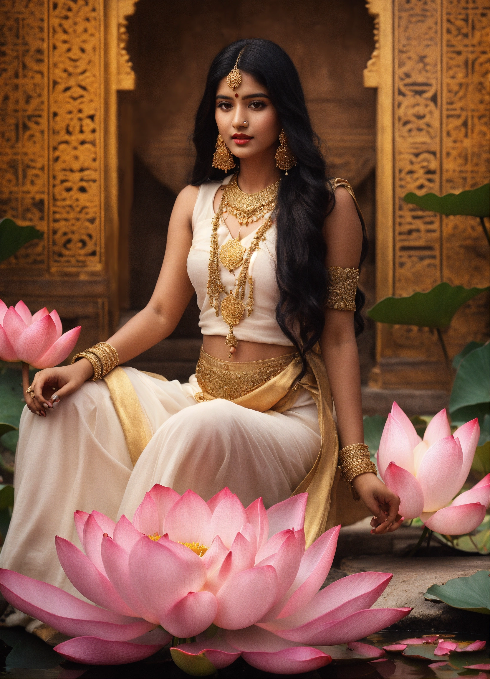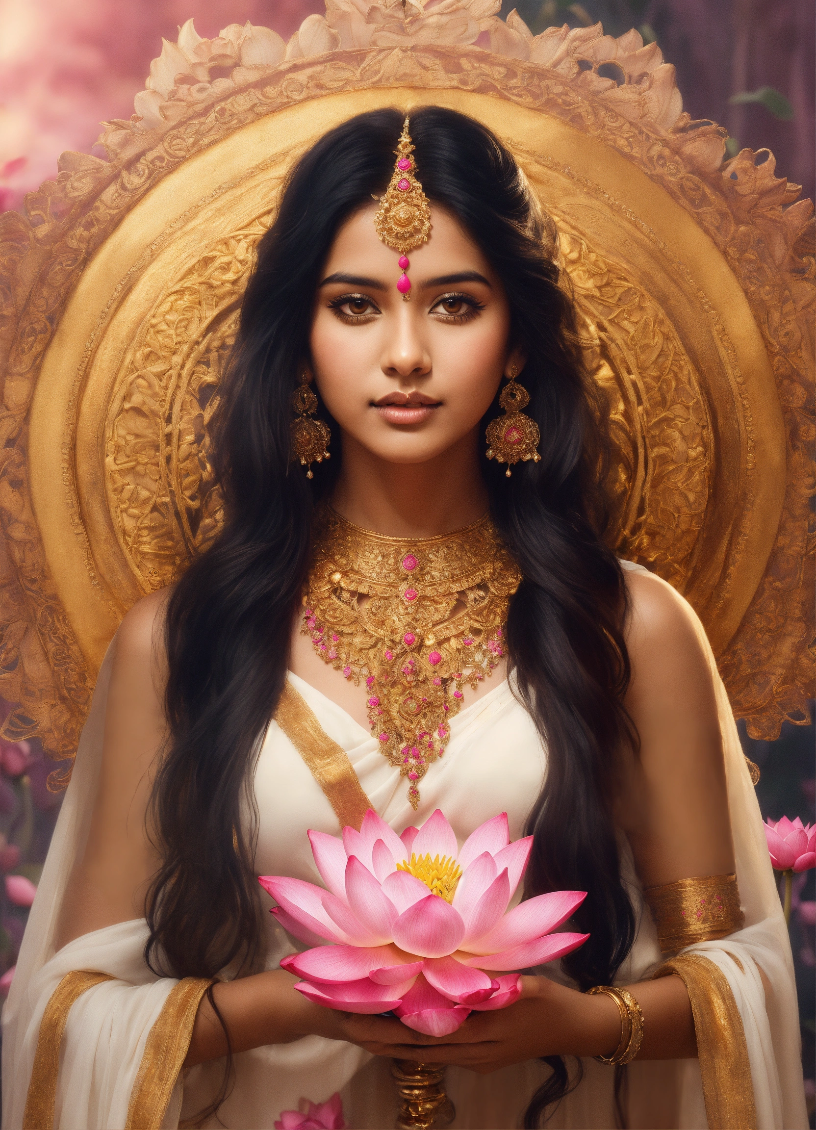An indian girl dressed in a long white dress, barefoot, long black hair, golden brown eyes, pink lips holding a lotus flower, in a setting with incredible details, including a golden lotus flower