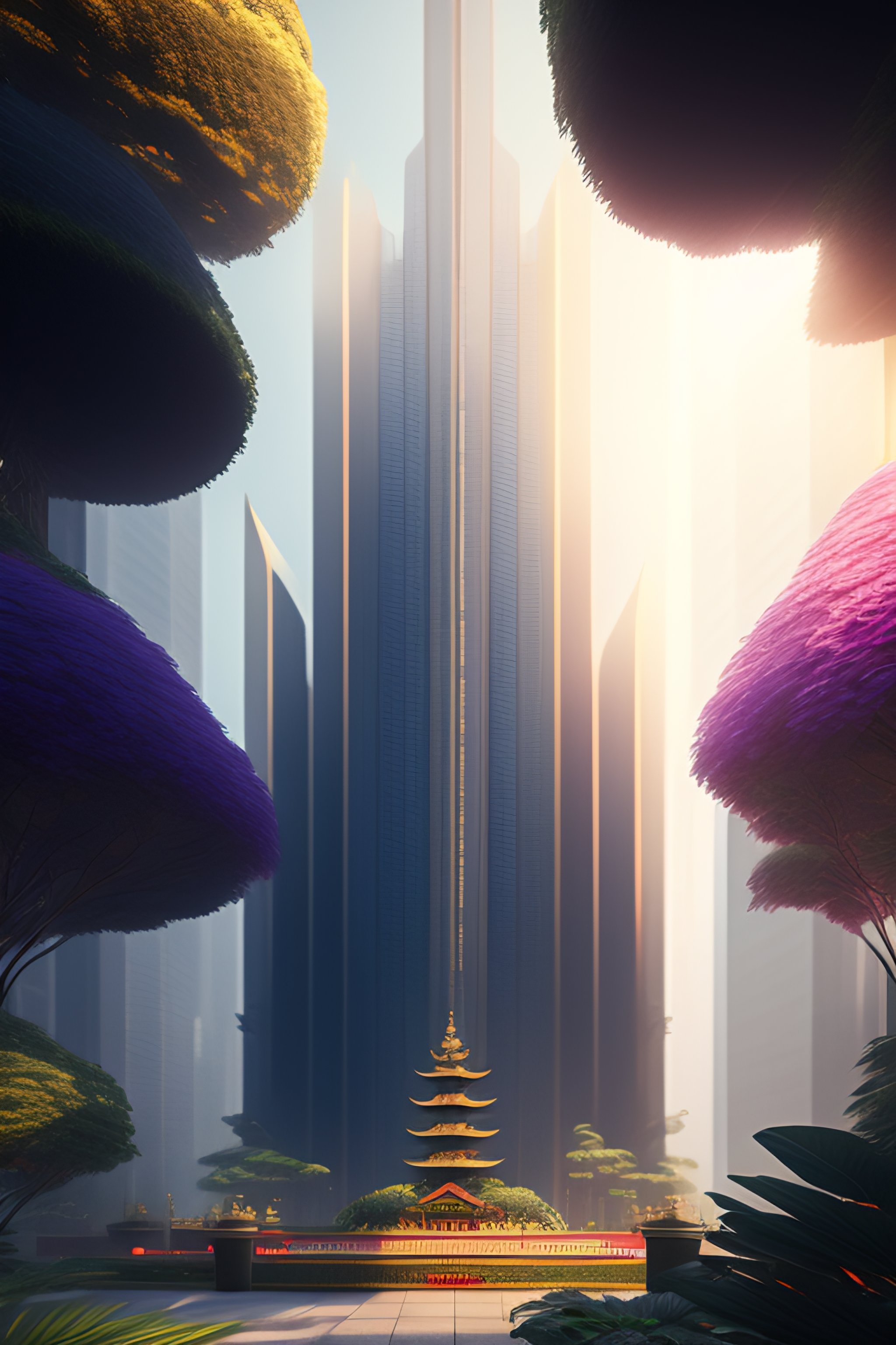 Chinese style temple in front of cyberpunk skyscrapers, hyper realistic, lush gnarly plants, 8 k, denoised, by greg rutkowski, tom bagshaw, james gurney cinematic lighting, fengshui, flower