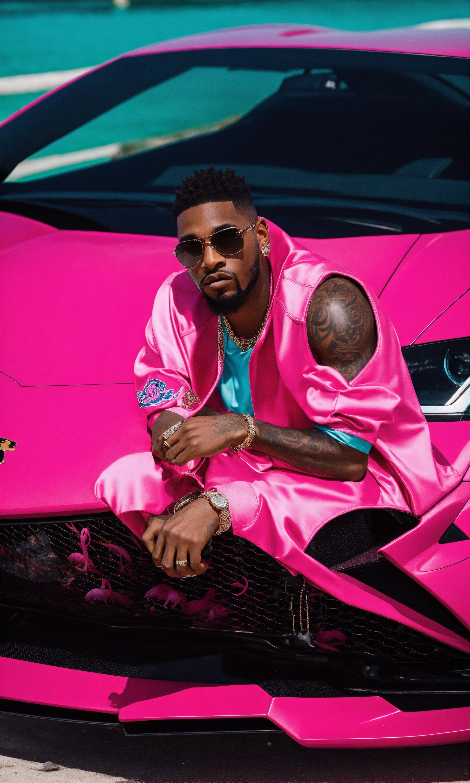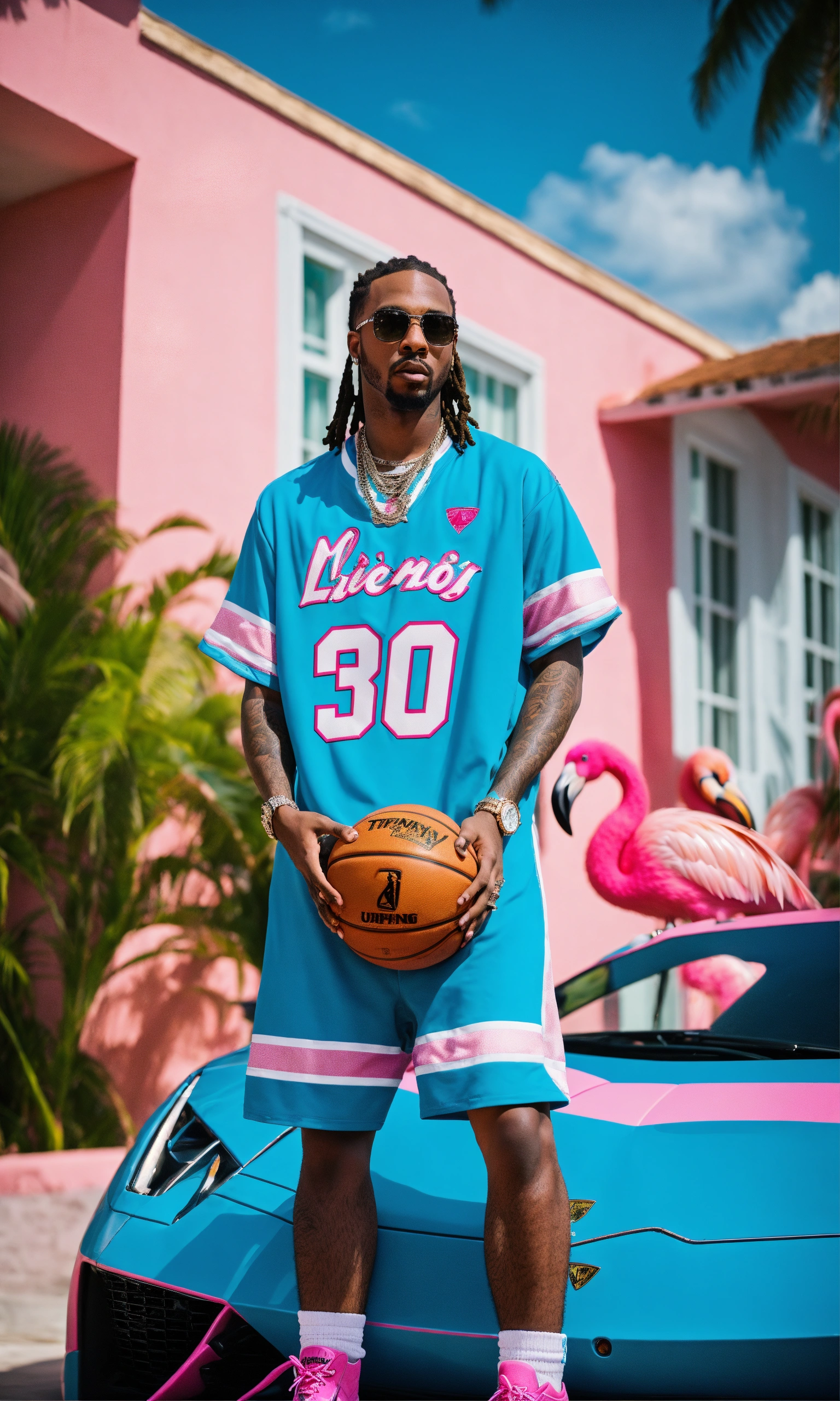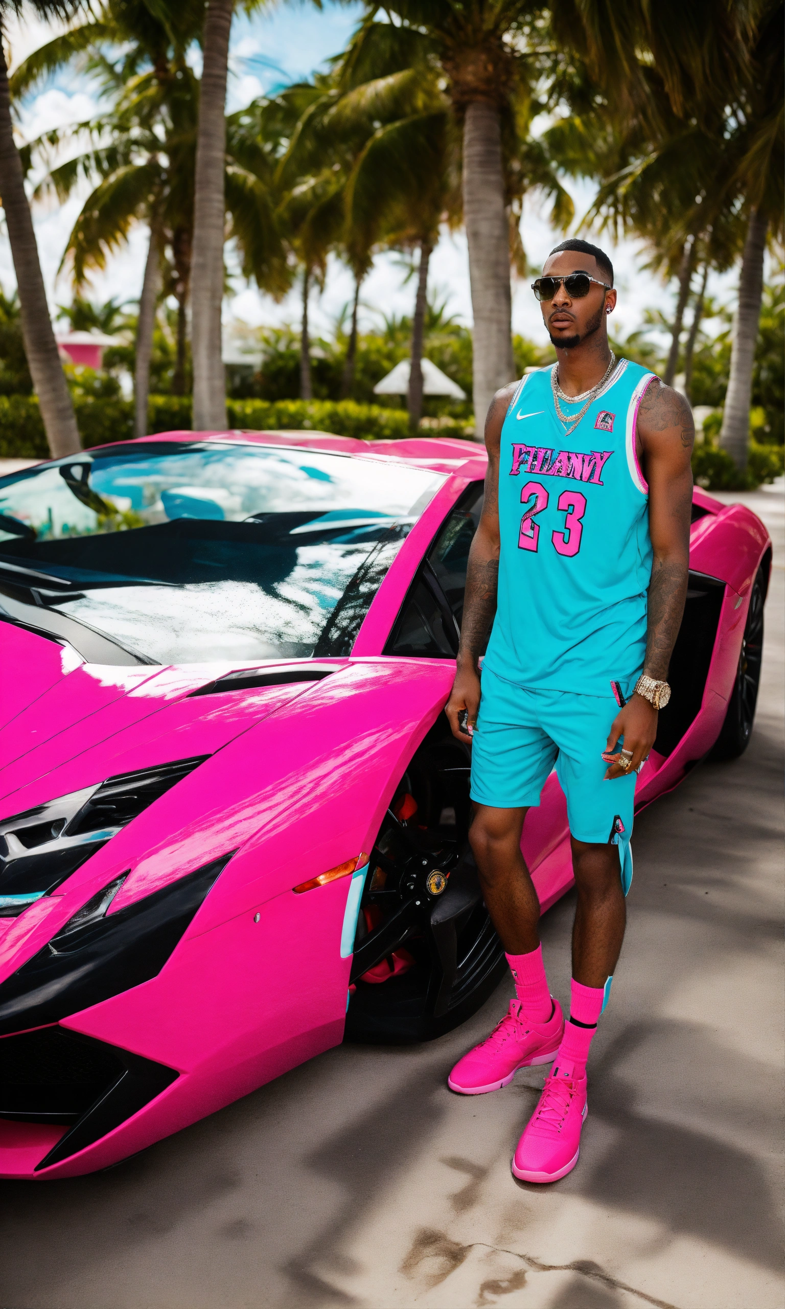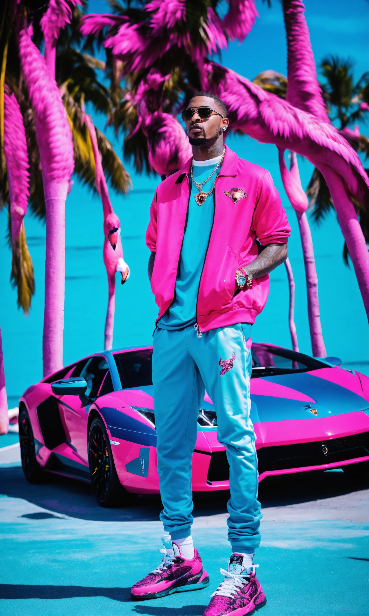 Close up photos of a rapper wear a blue tiffany basketball jersey near a hot pink lamborghini, flamingos in the composite, in miami beach