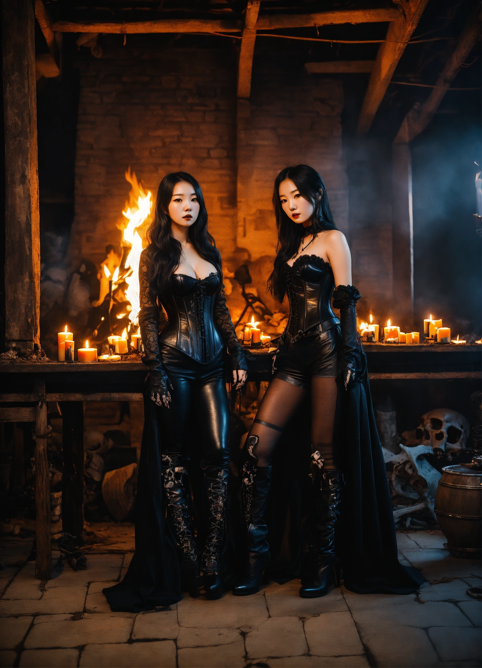 Two stunning young korean gothic women standing in front of fire in a candle lit basement wearing a black leather corset and black leather pants black leather gloves, hyper-realistic, photographic portrait floor strewn with skulls and bones