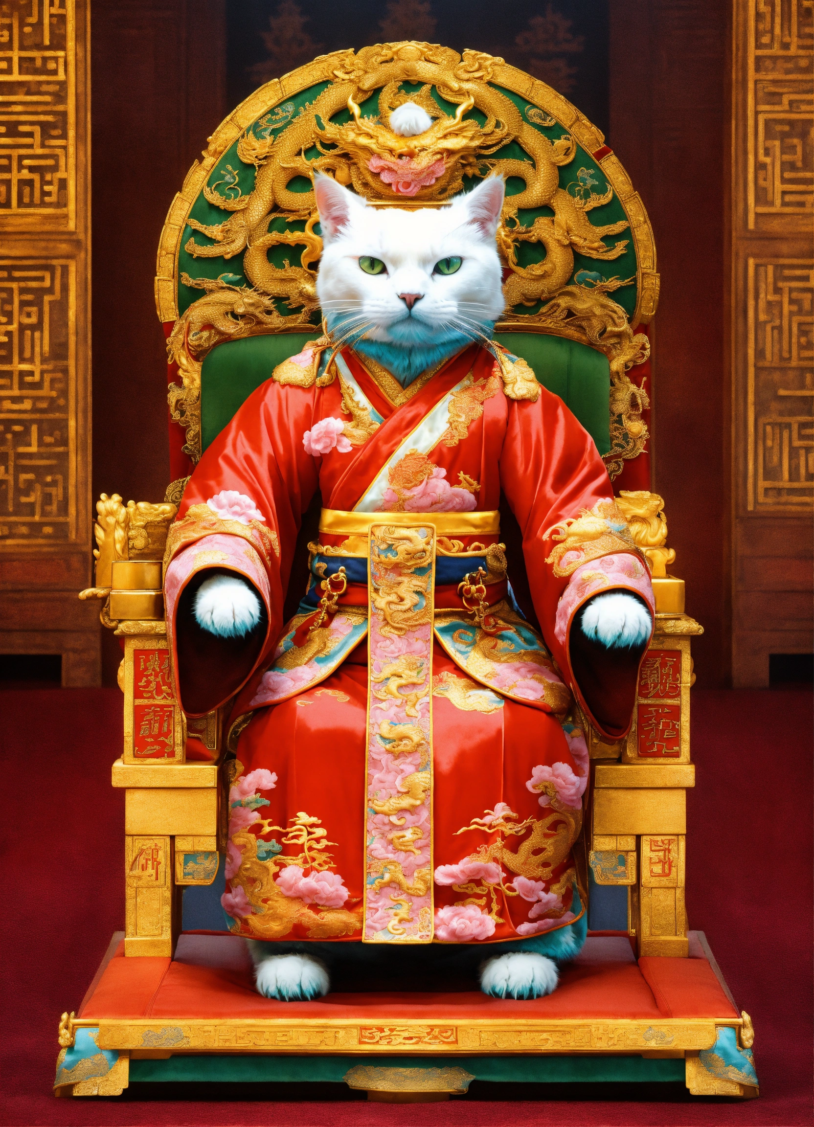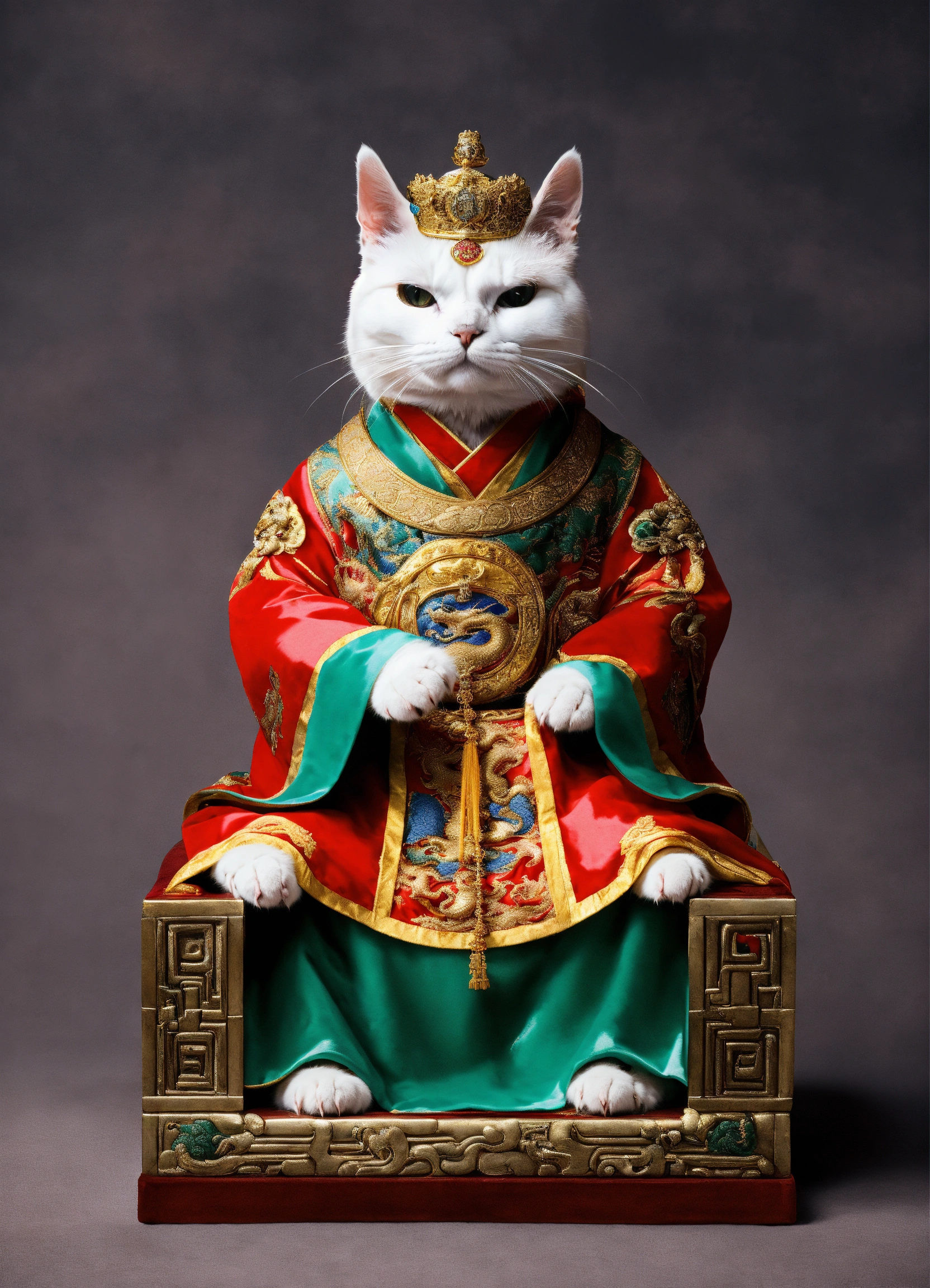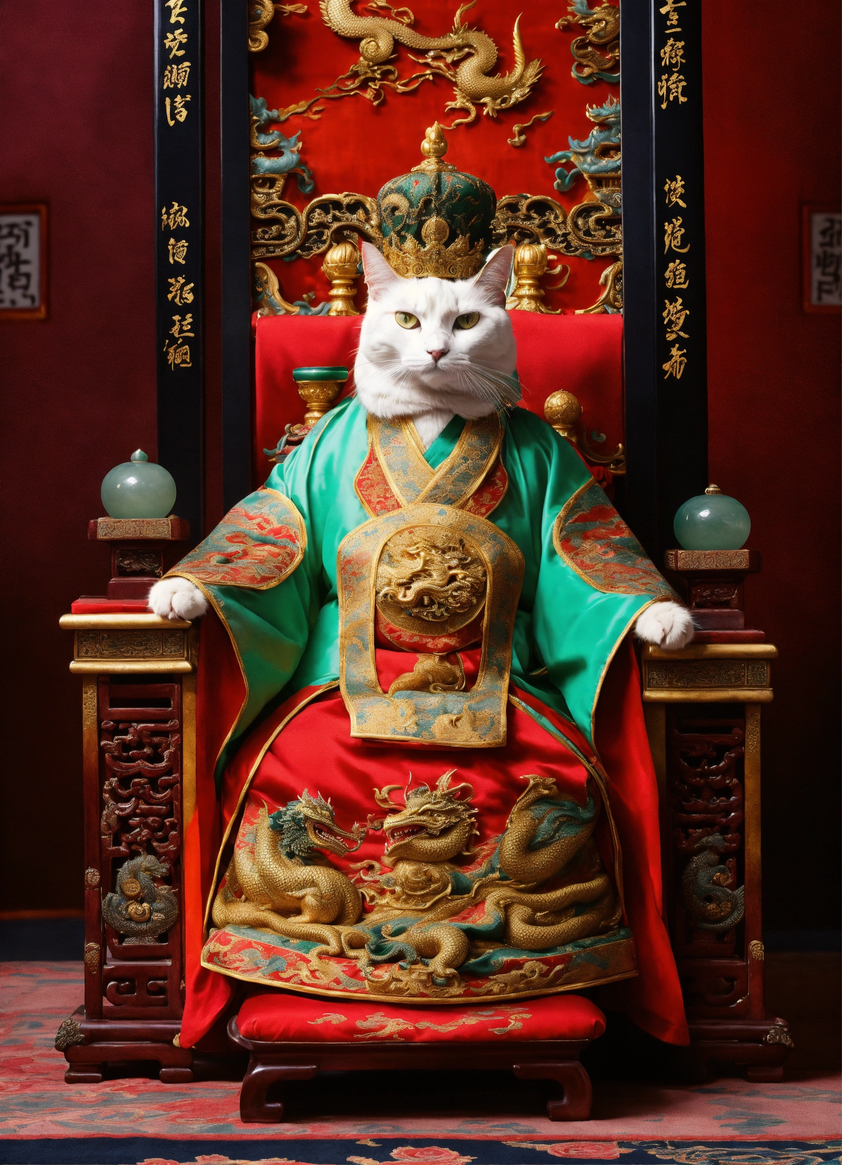 Jade emperor cat clad in royal robes, majestic and seated on a throne this cat embodies the jade emperor, draped in regal dragon robes, radiating majestic authority while seated on a lofty throne. its regal presence evokes reverence and awe.