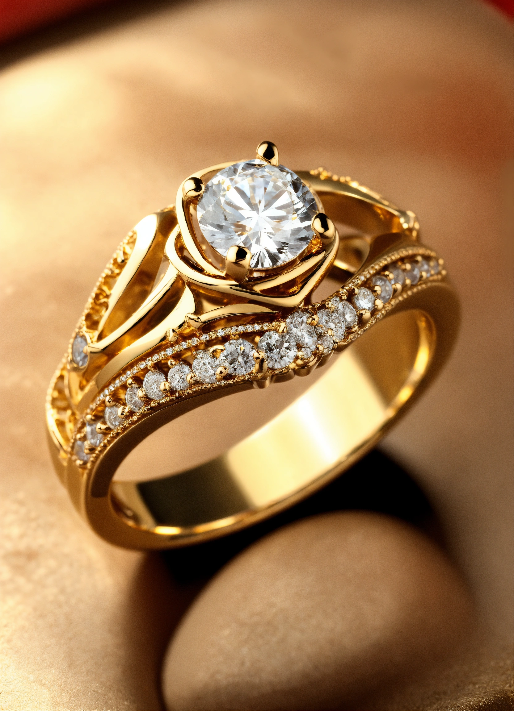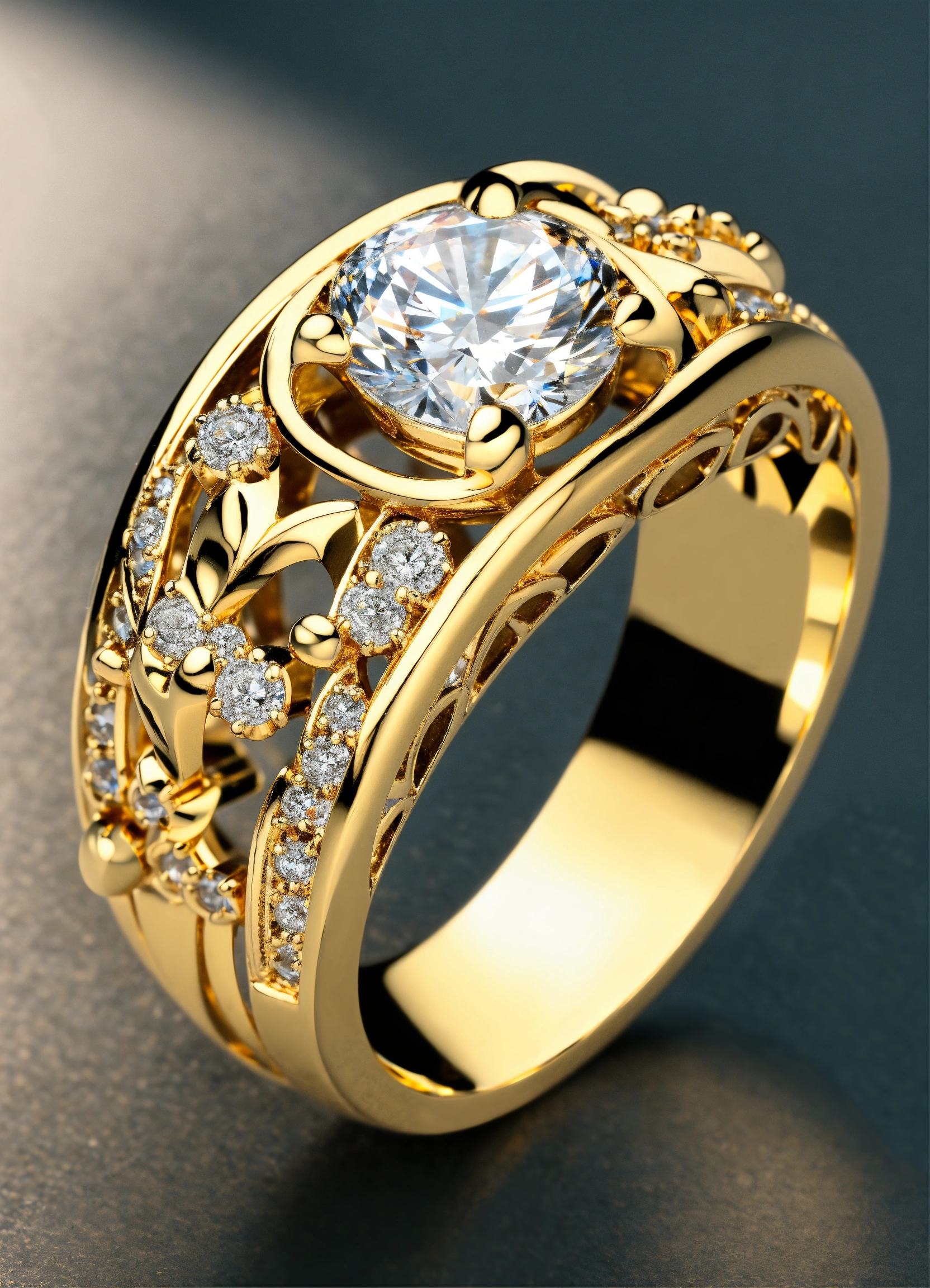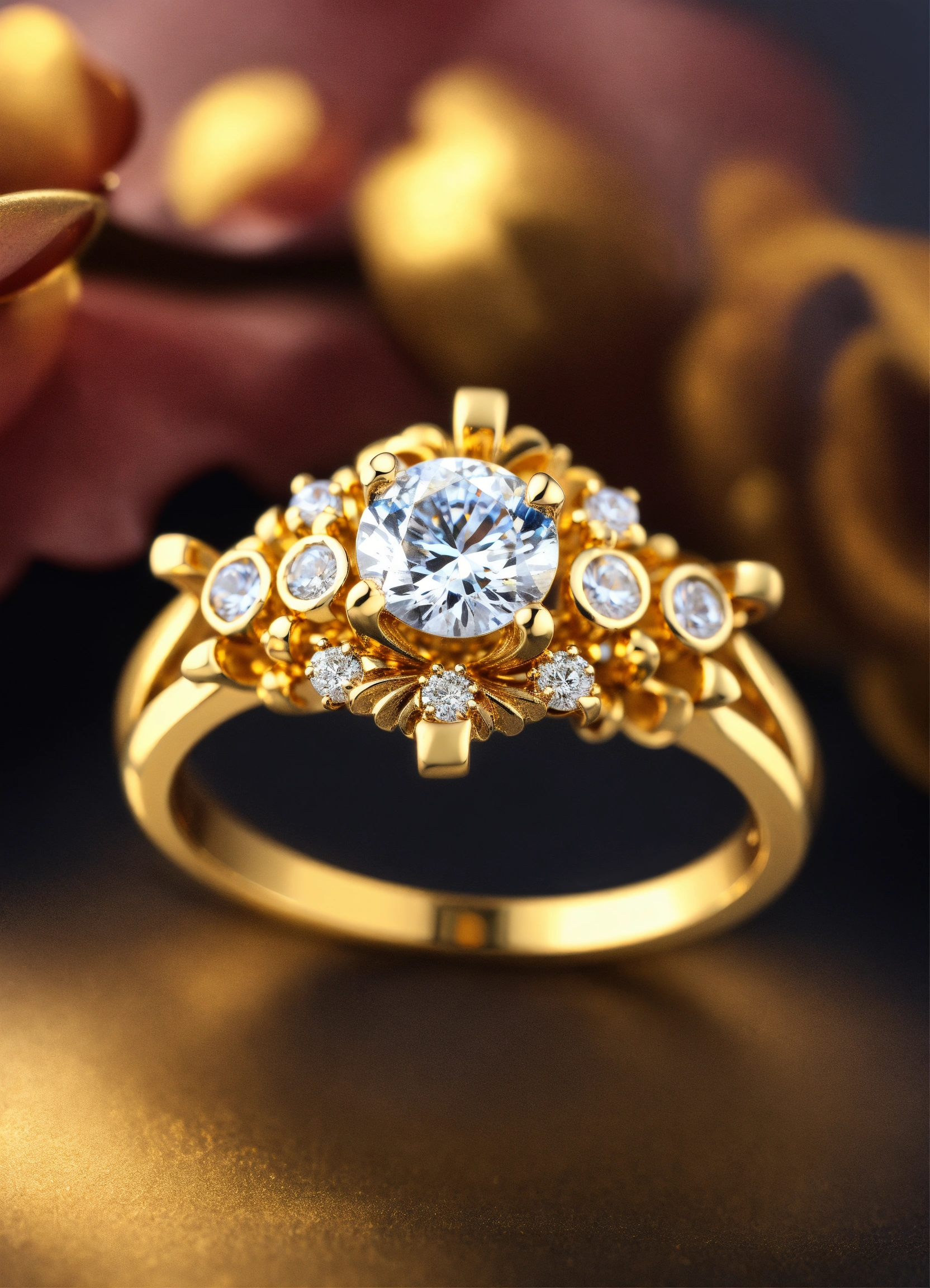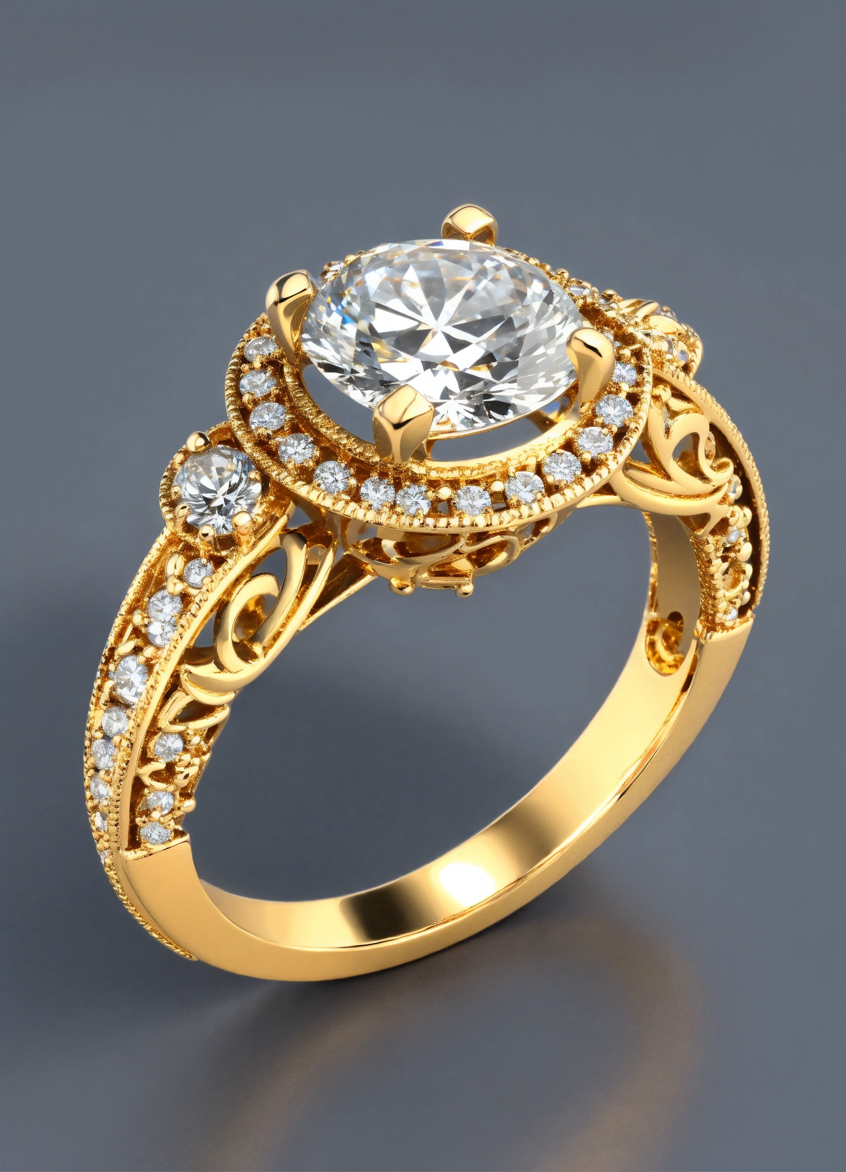 Jewellery design, vintage style, create diamond gold ring with matte finish in prong setting, default-theme, --product-view --ultra-quality