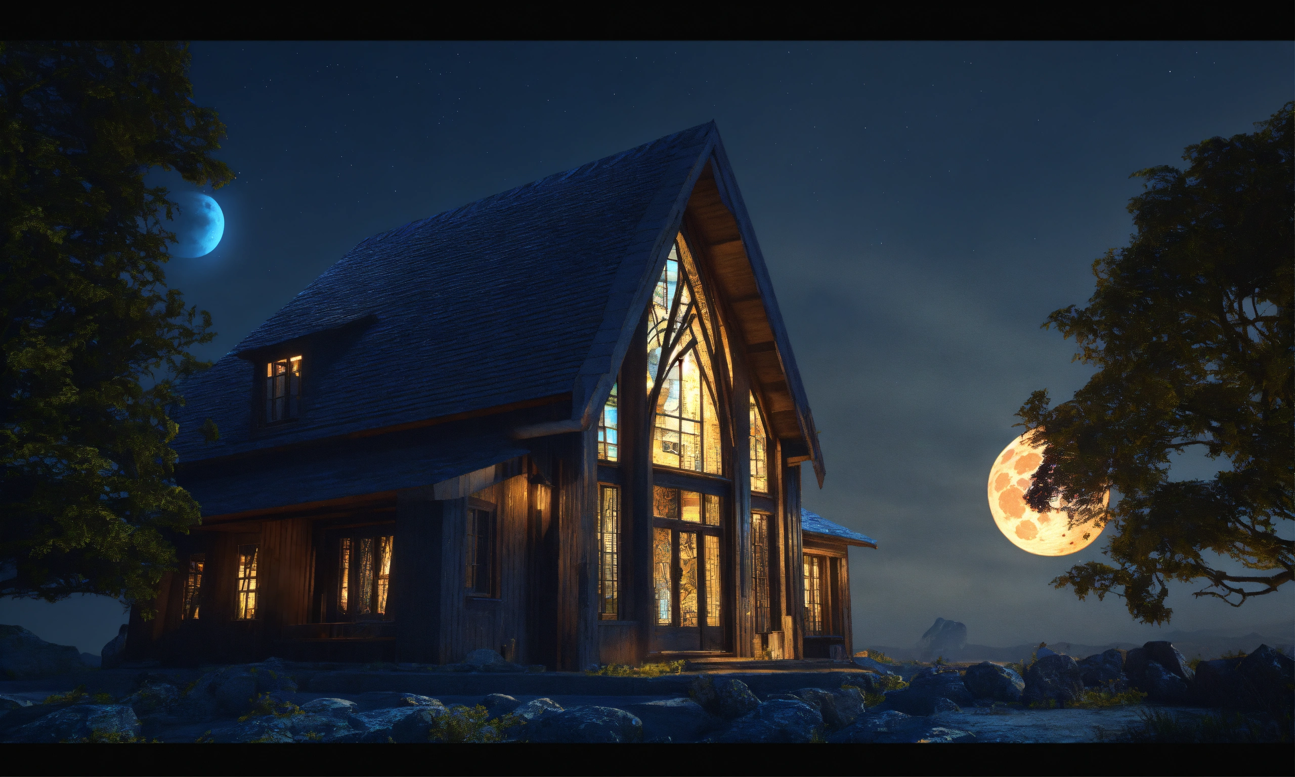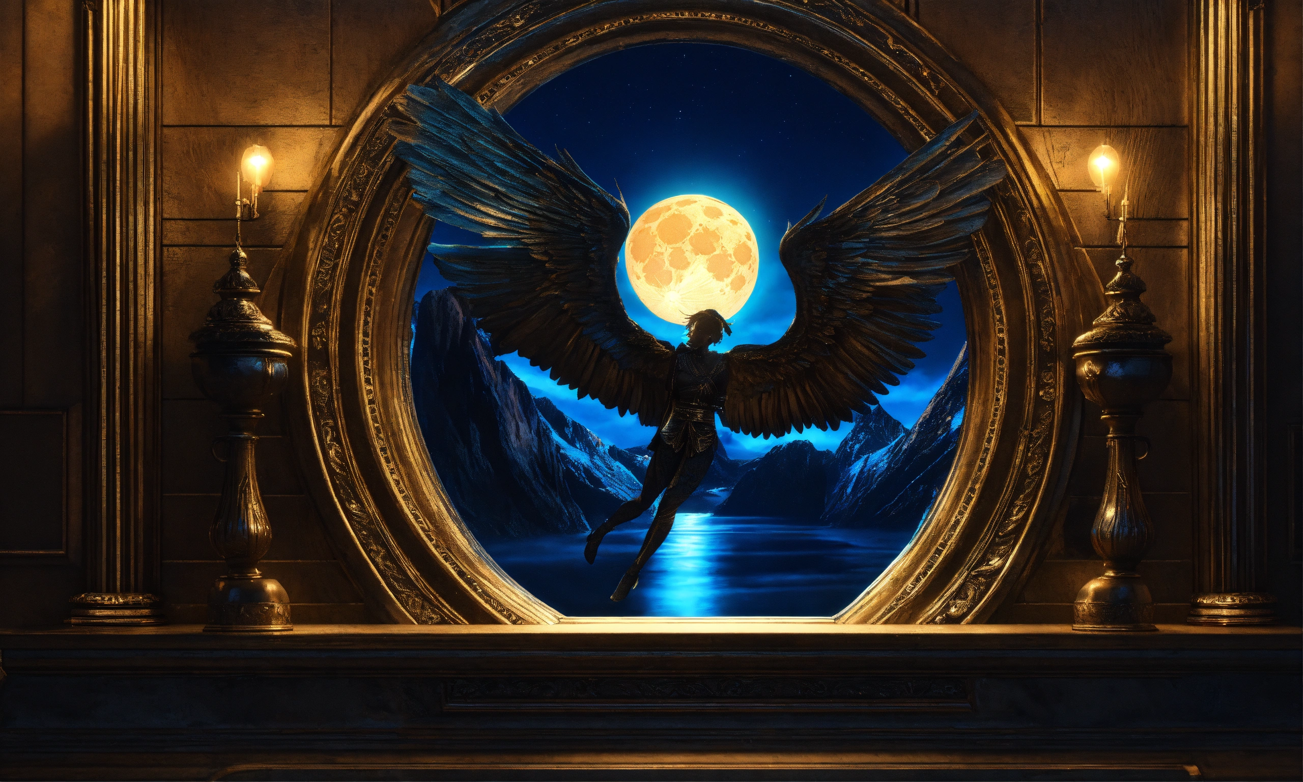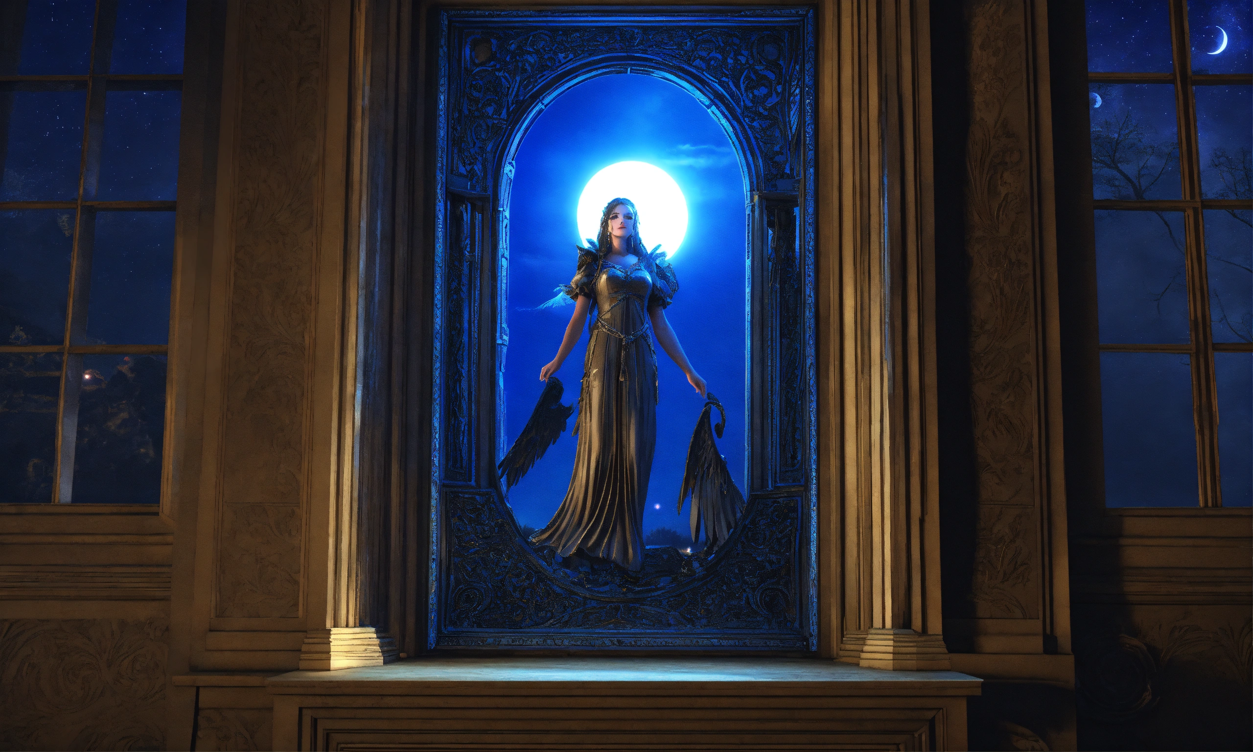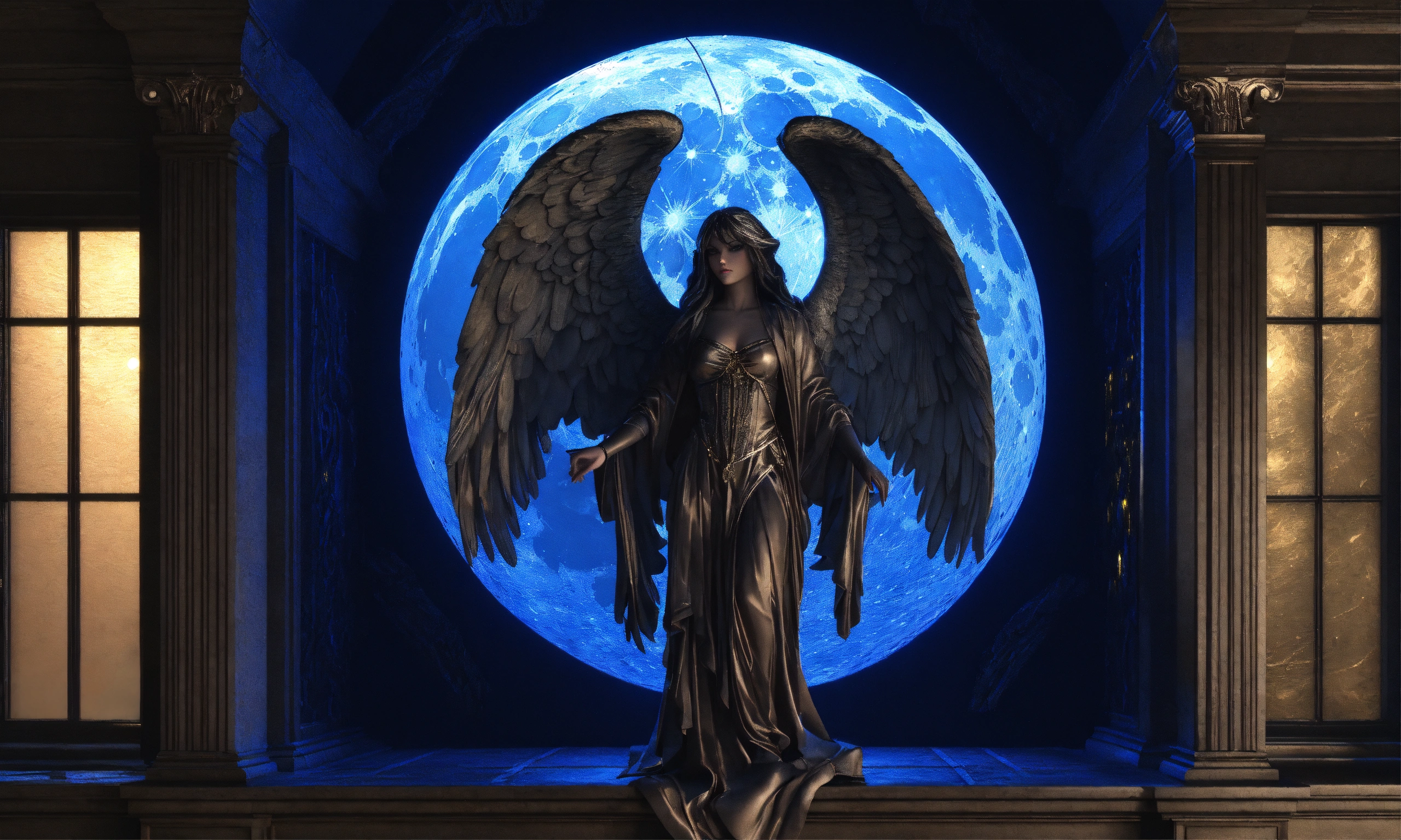 3d windows obsidian sinister angel engraved and hyper realistic 8k at night with a full blue moon