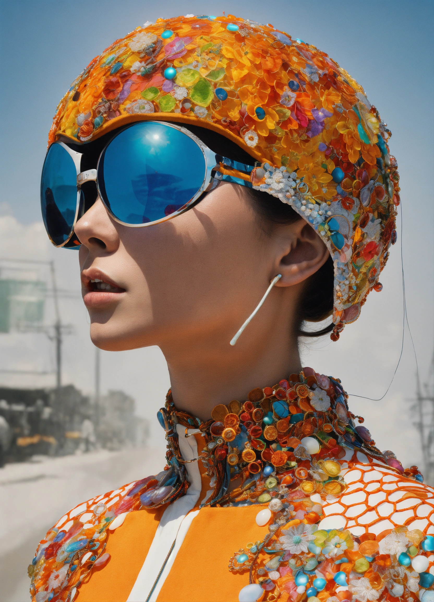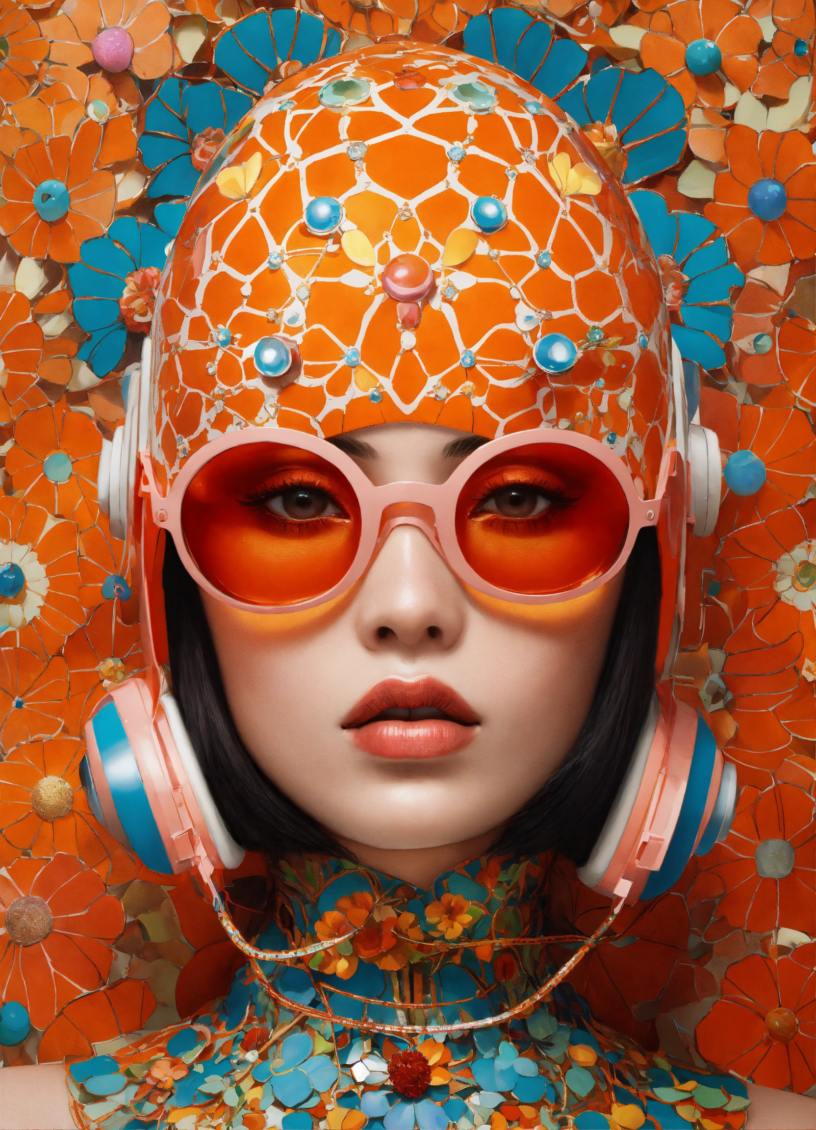 Arctium láppa, sergio lopez, natalie shau, graphic 70's poster, environment map with large transparent multicolor flowers, in a full highly detailed accurate hd clear white color and orange geometric pattern rounded cables and wires, color shells and wires shape a full 16k intricate transparent helmet decorated with a patchwork of jewels and beads profile of an eccentric individual wearing a big full highly detailed colorful sunglasses, volumetric lighting, art by yayoi kusama, phuoc quan