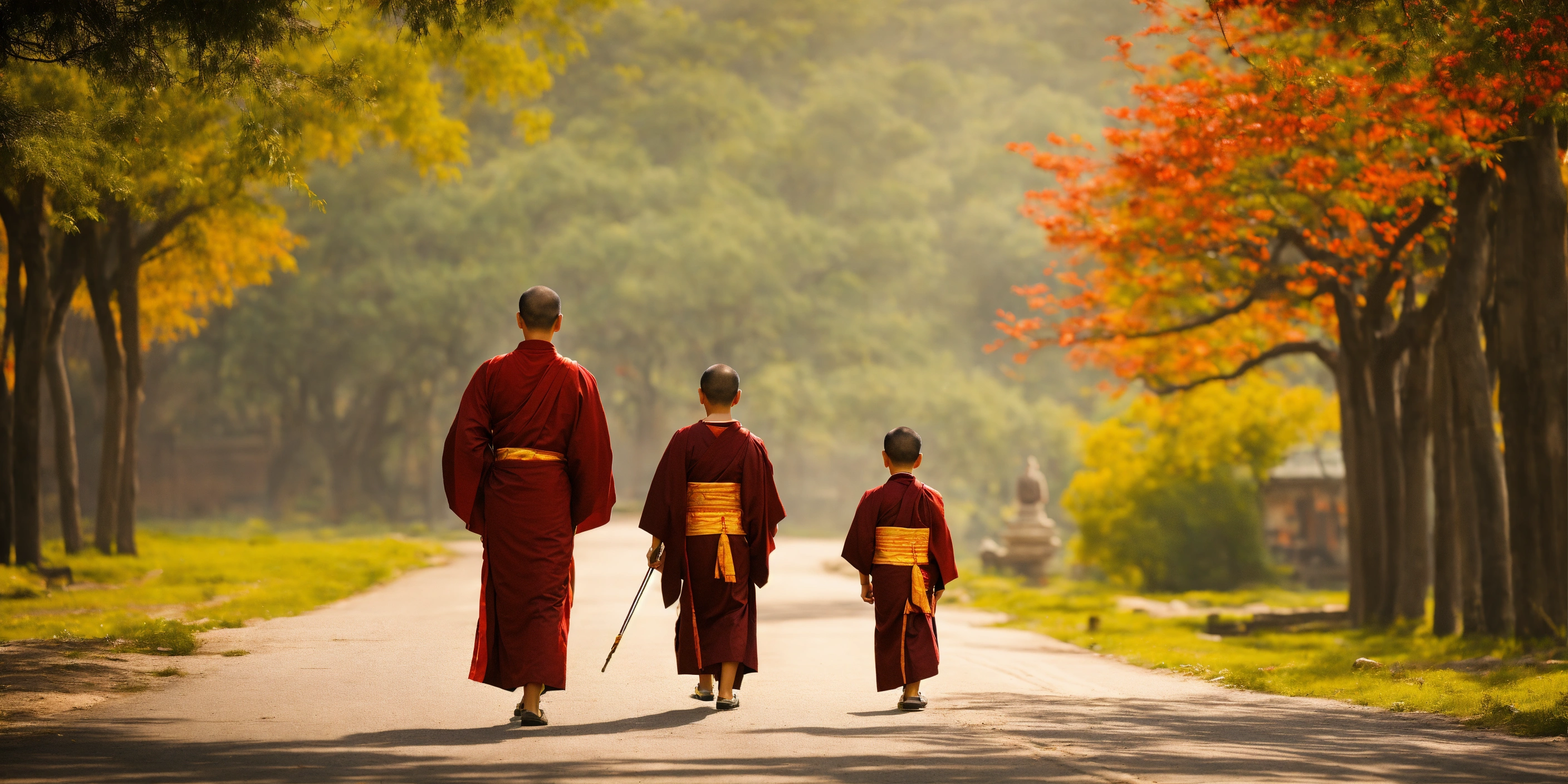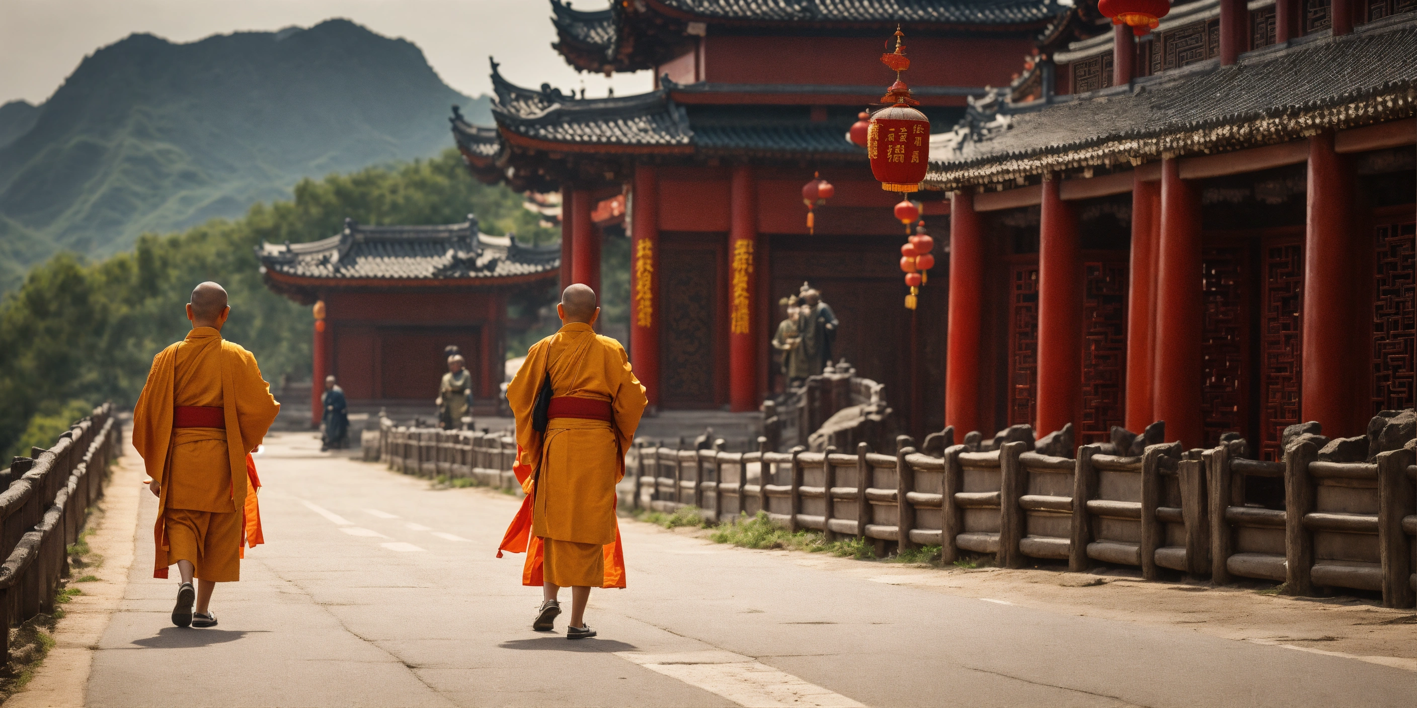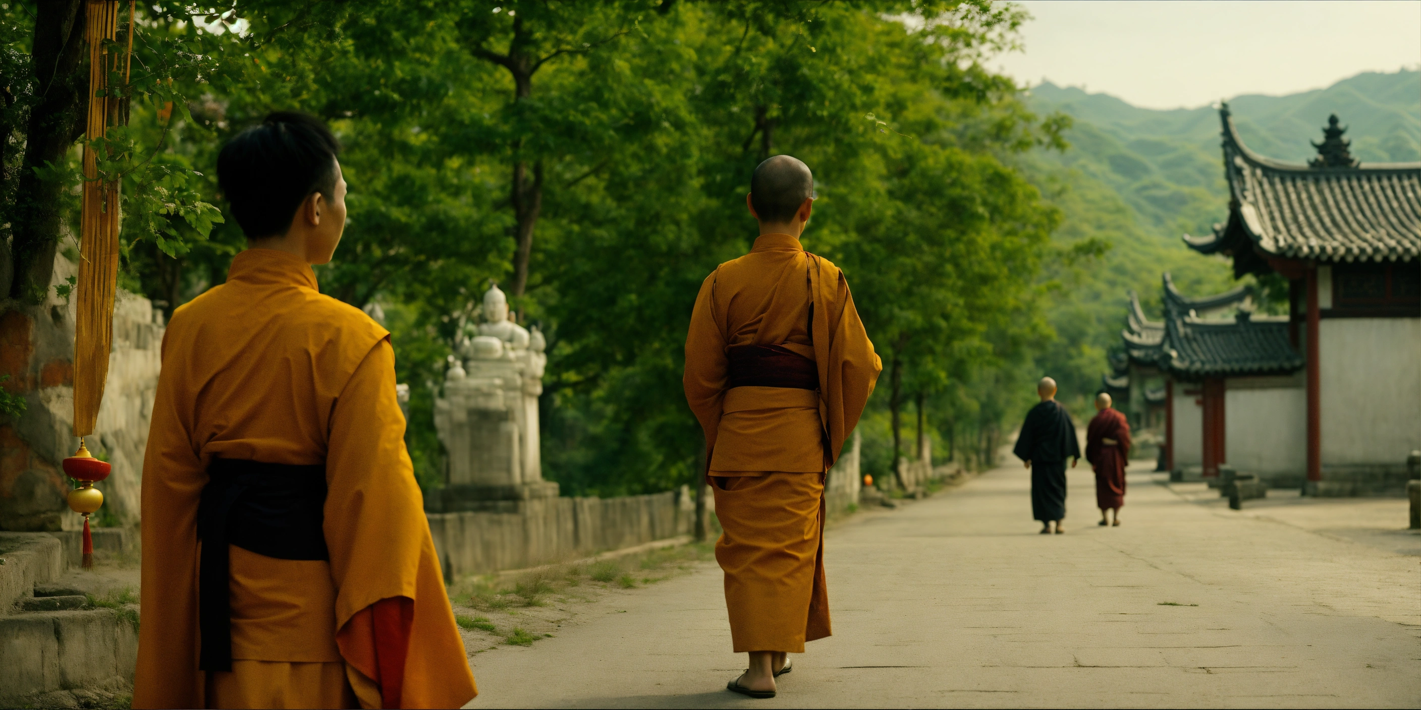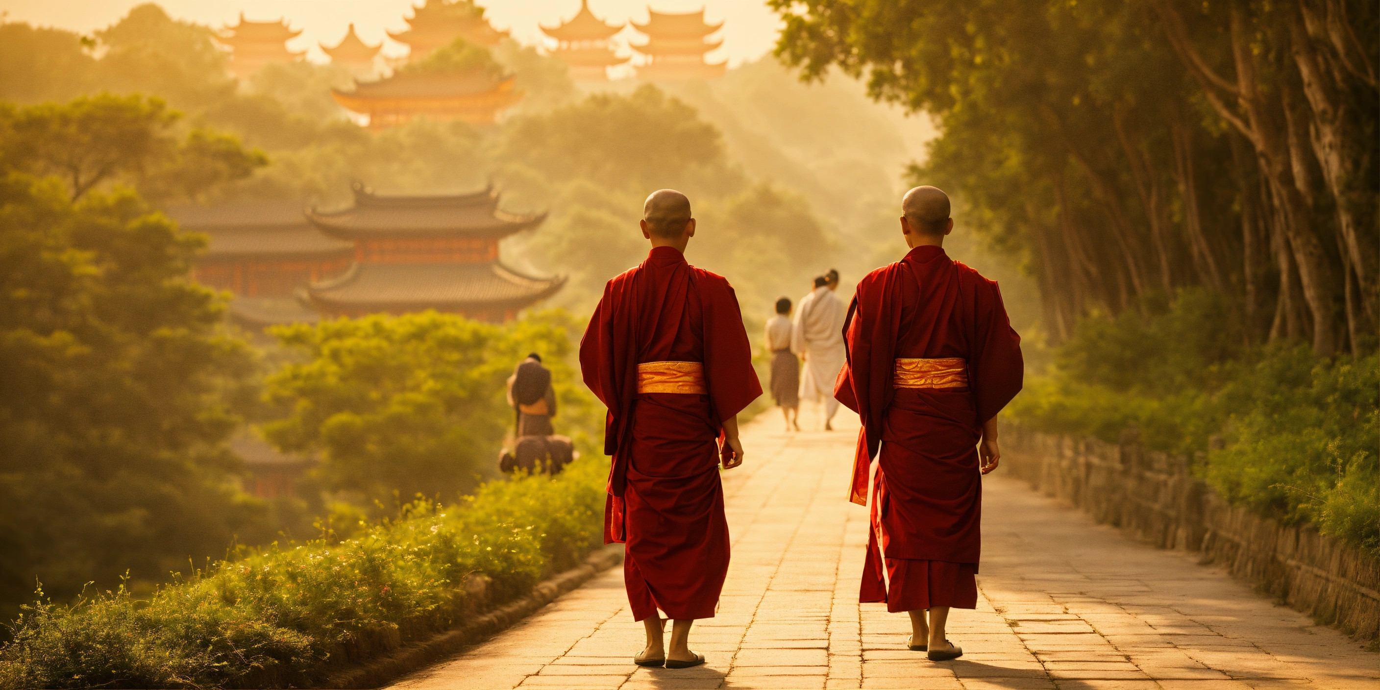 Two young buddhist disciples walking along the road and in the background an old chinese master who sees them coming