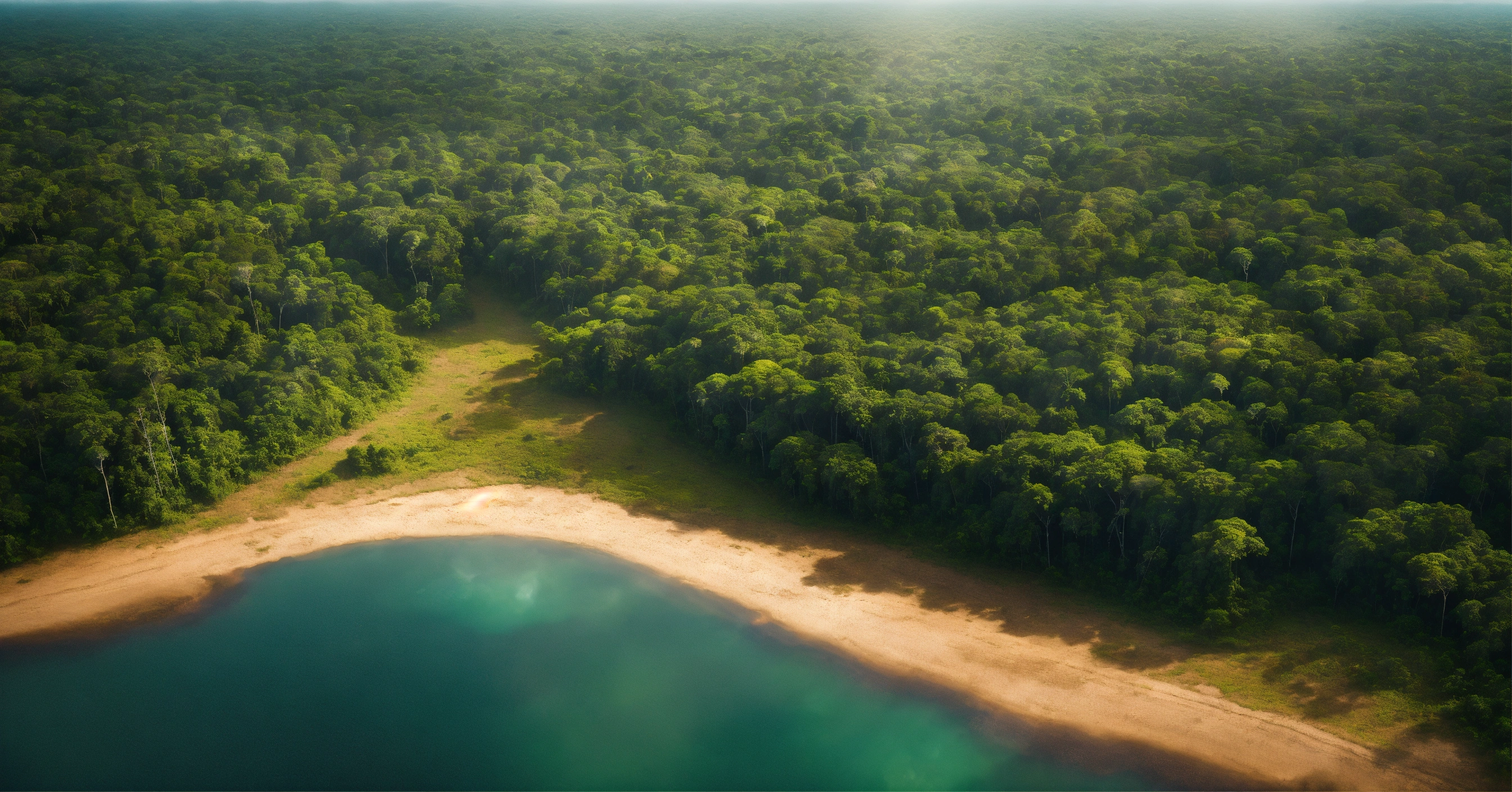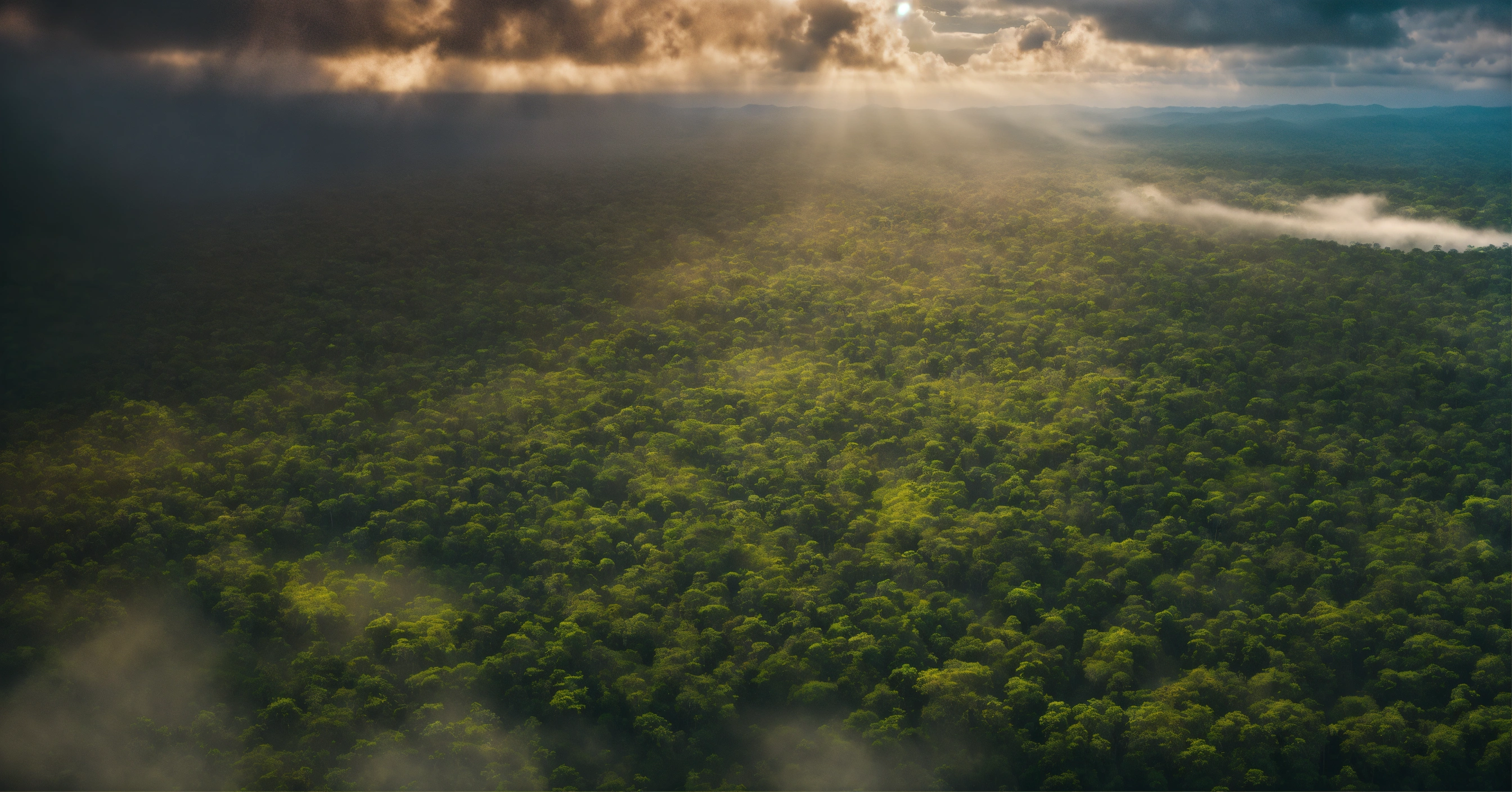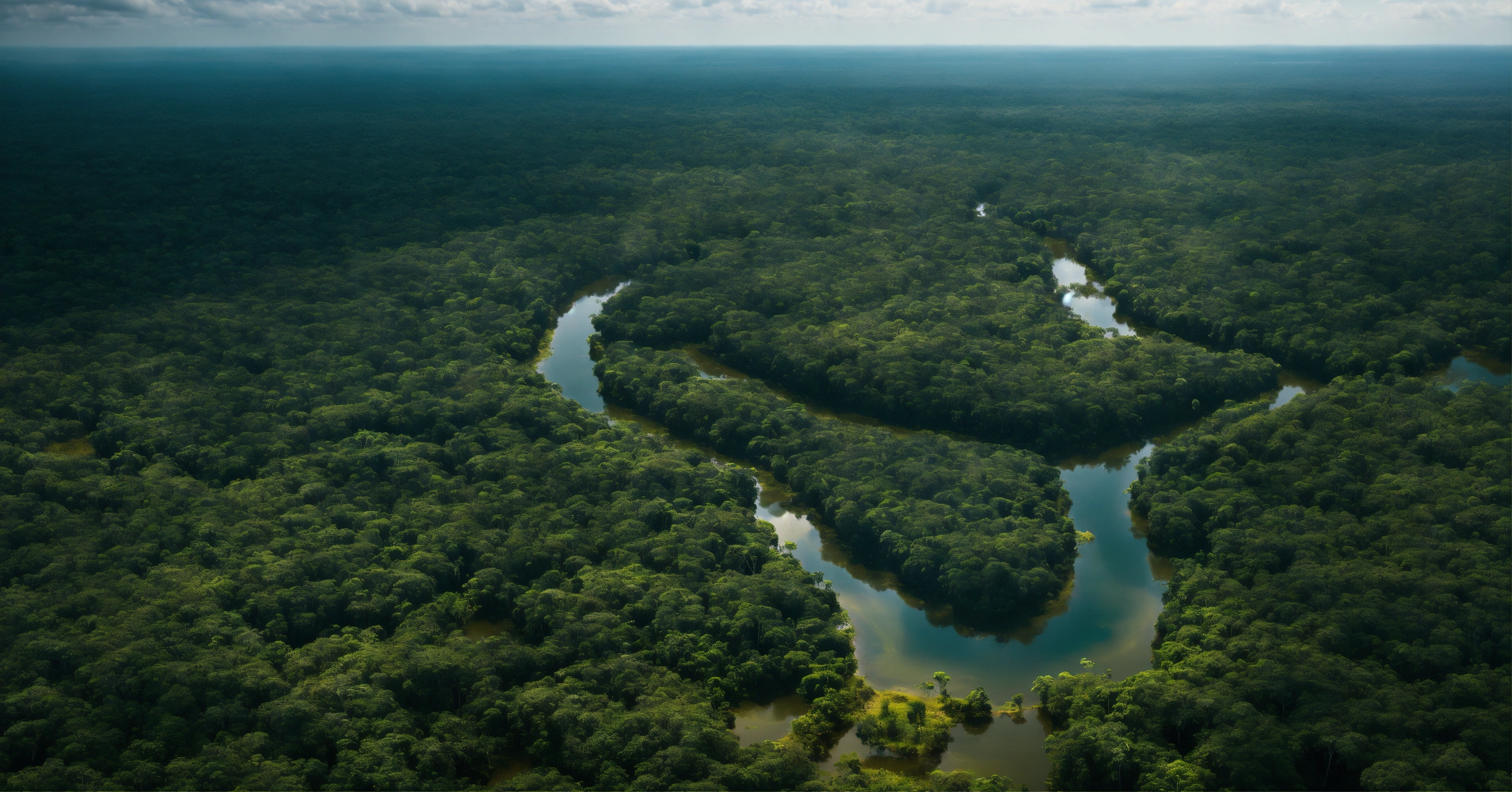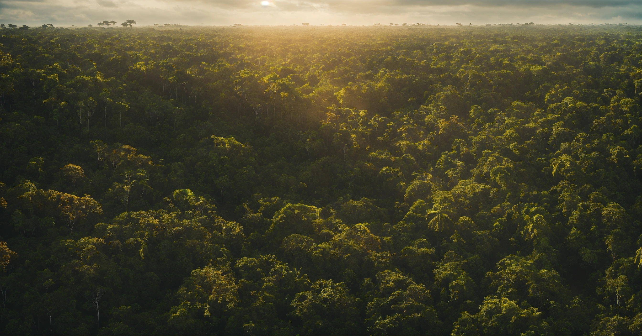 Aerial view of amazon forest, high quality photo, cinematic shot, cinematic, realistic, film grain, volumetric light, imax, photorealistic, hyperdetailed textures, sharp focus, studio photo, epic scene