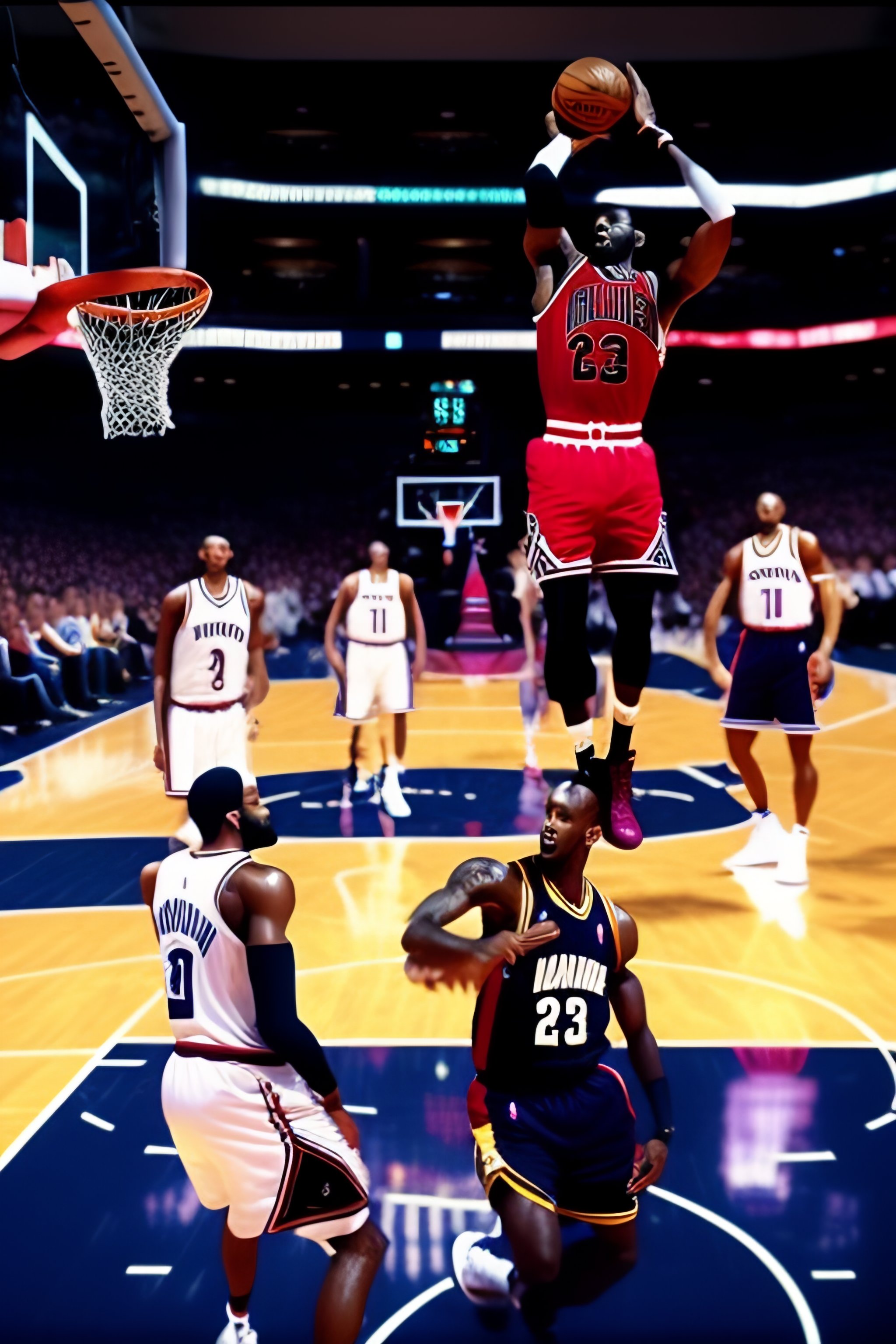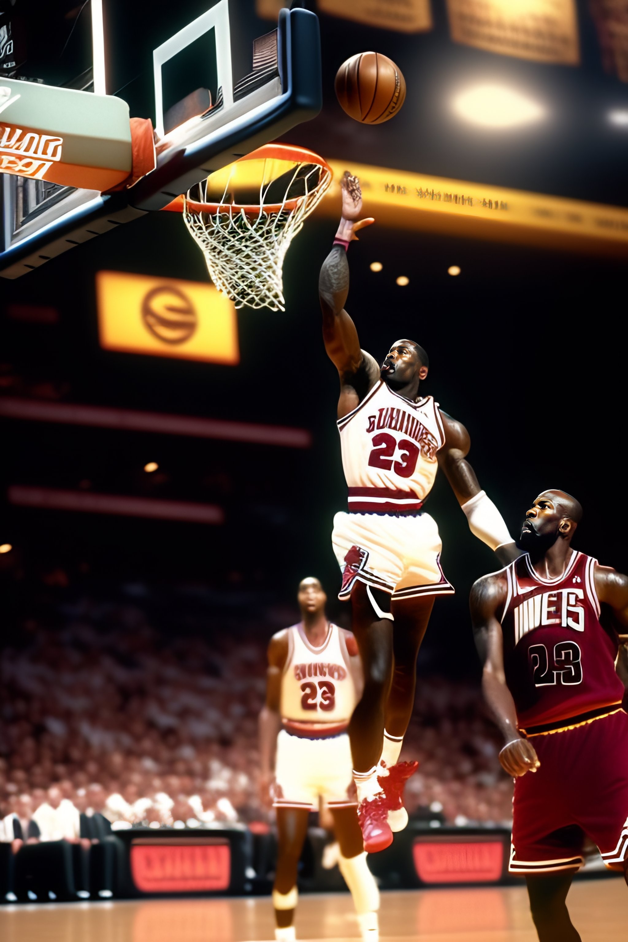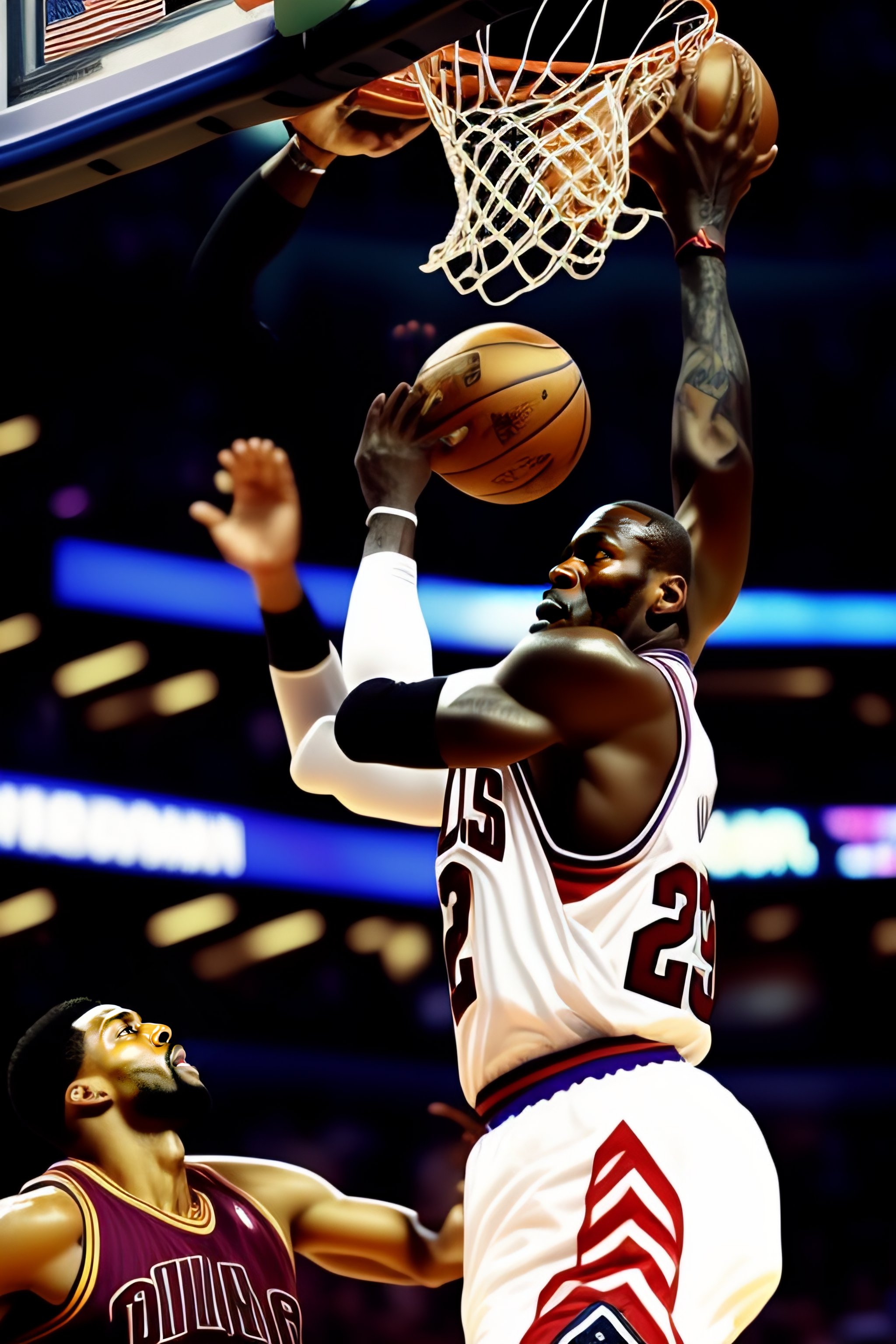 Michael jordan slam dunking a basketball on lebron james during a nba basketball game, ultra hd, realistic