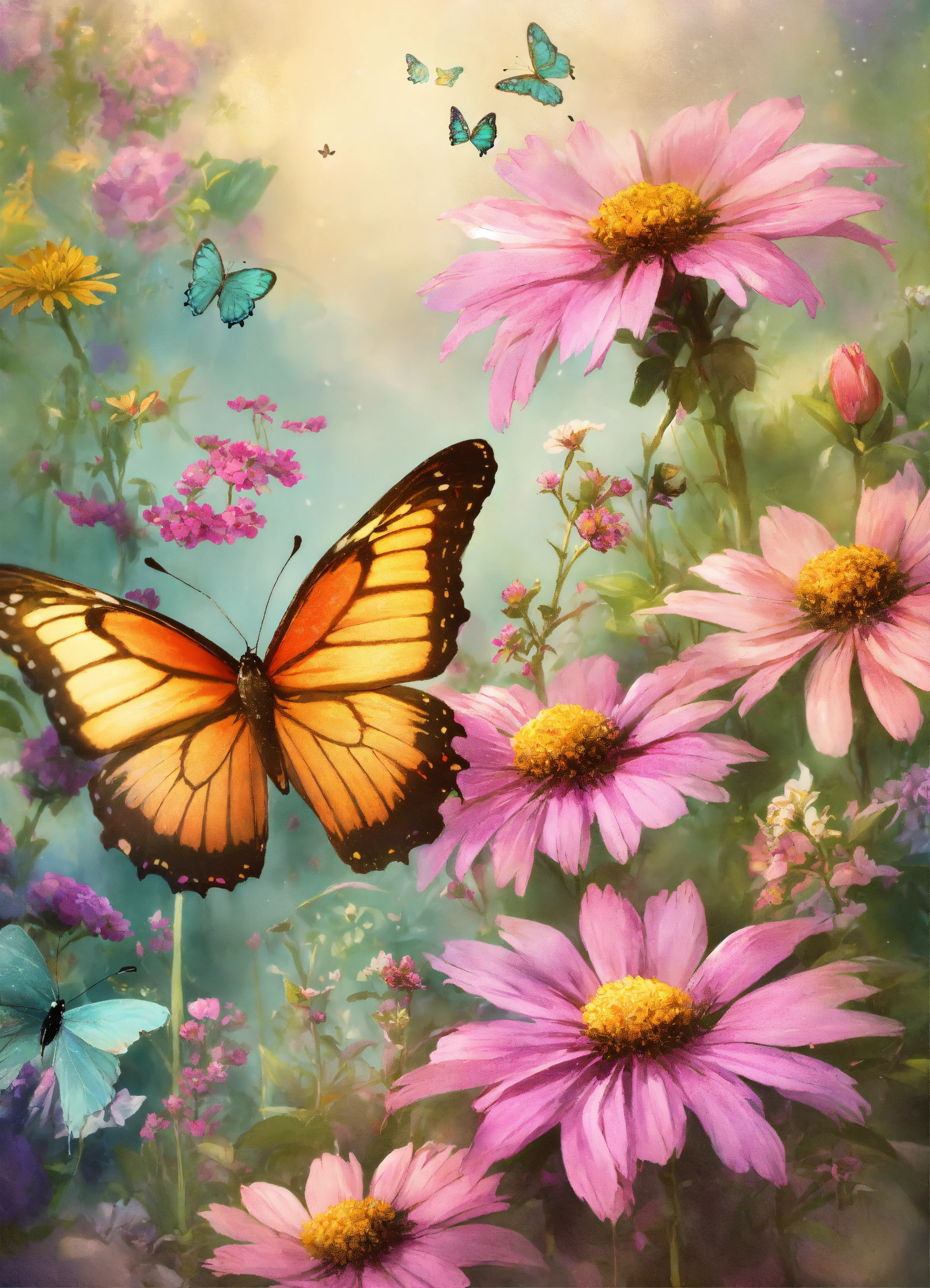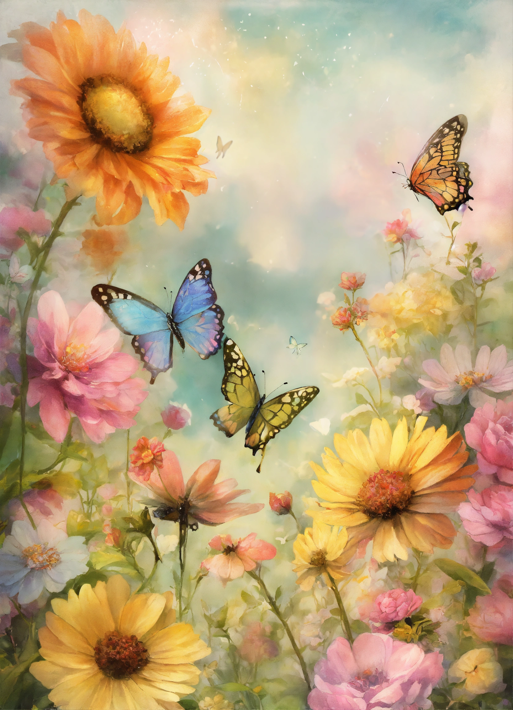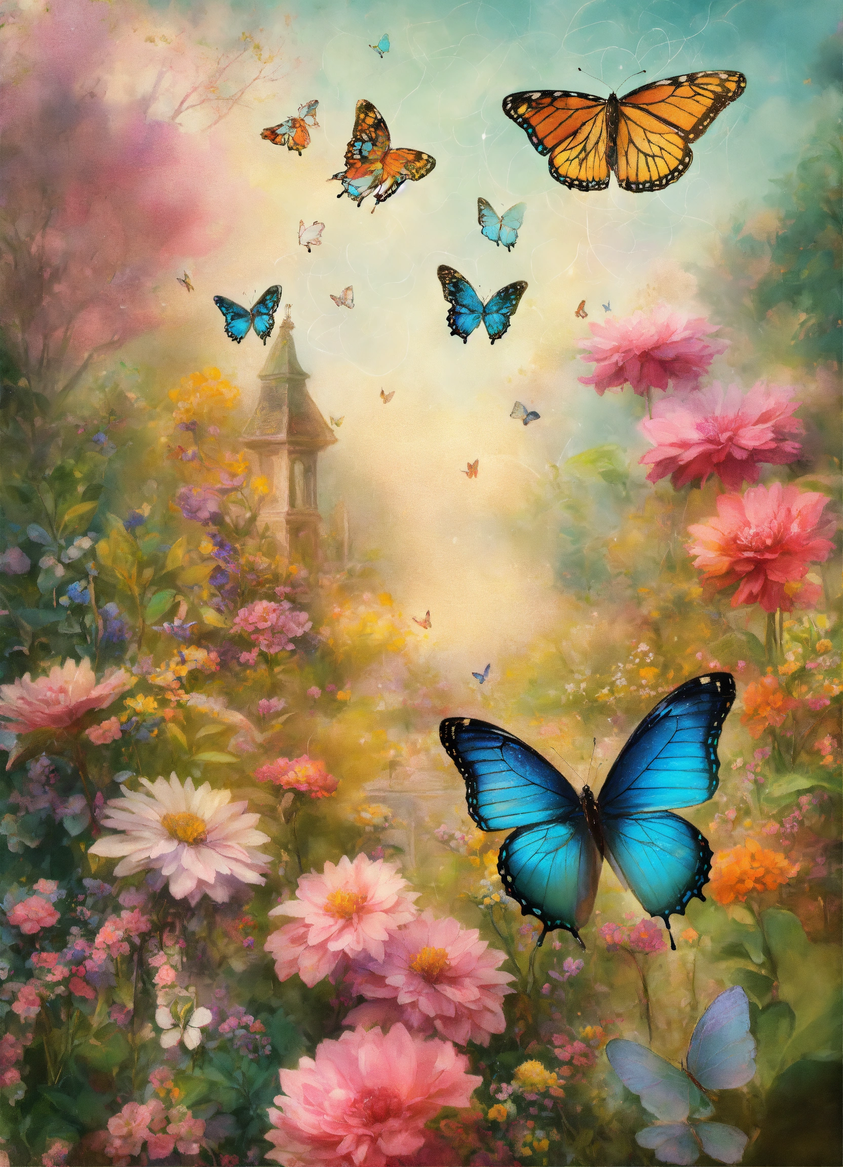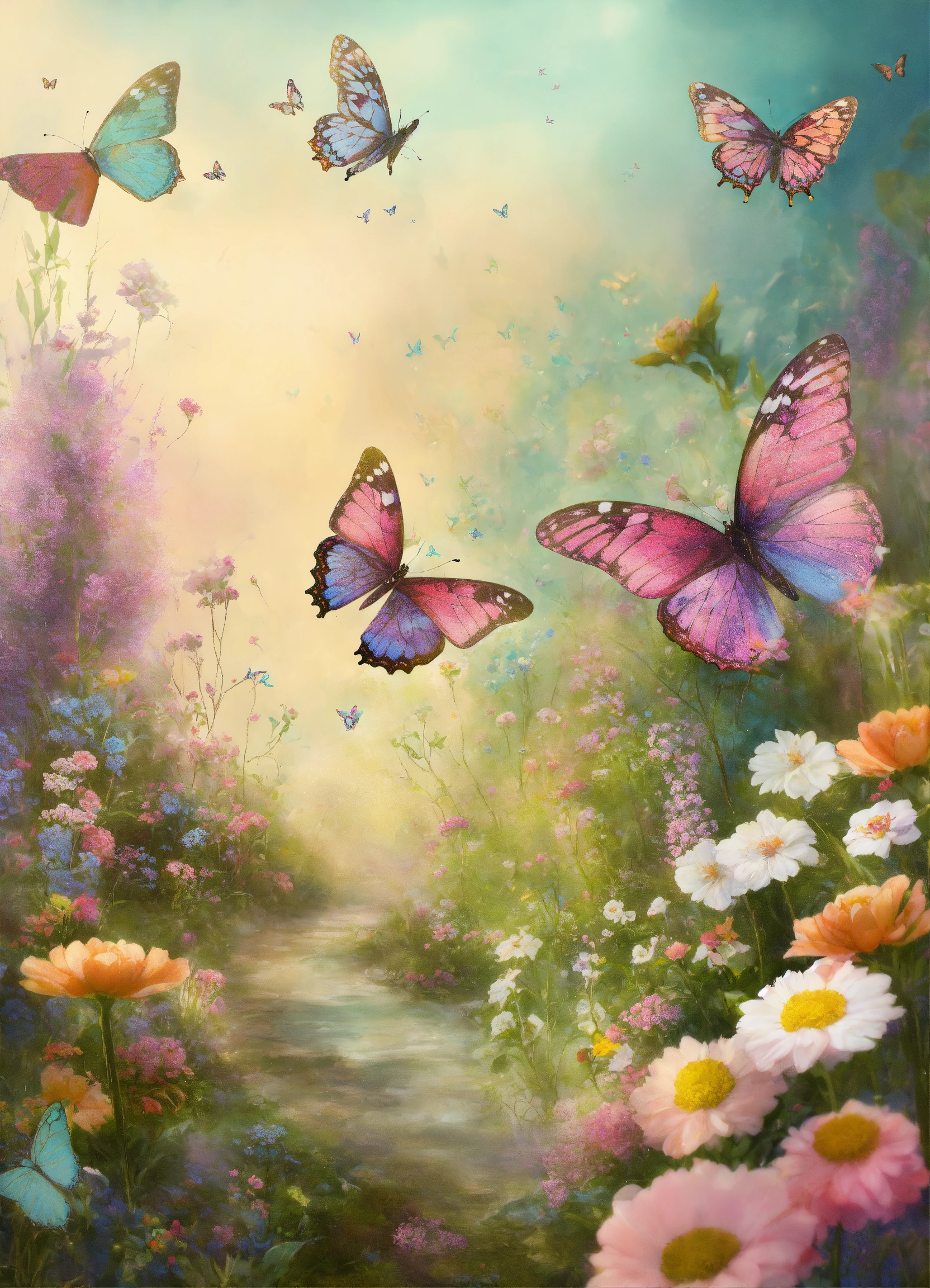 Shabby chic dreamy mist pastel junk journals butterfly garden a garden designed to attract and support butterflies with nectar-rich flowers, swirling magical fairytale abstract art style