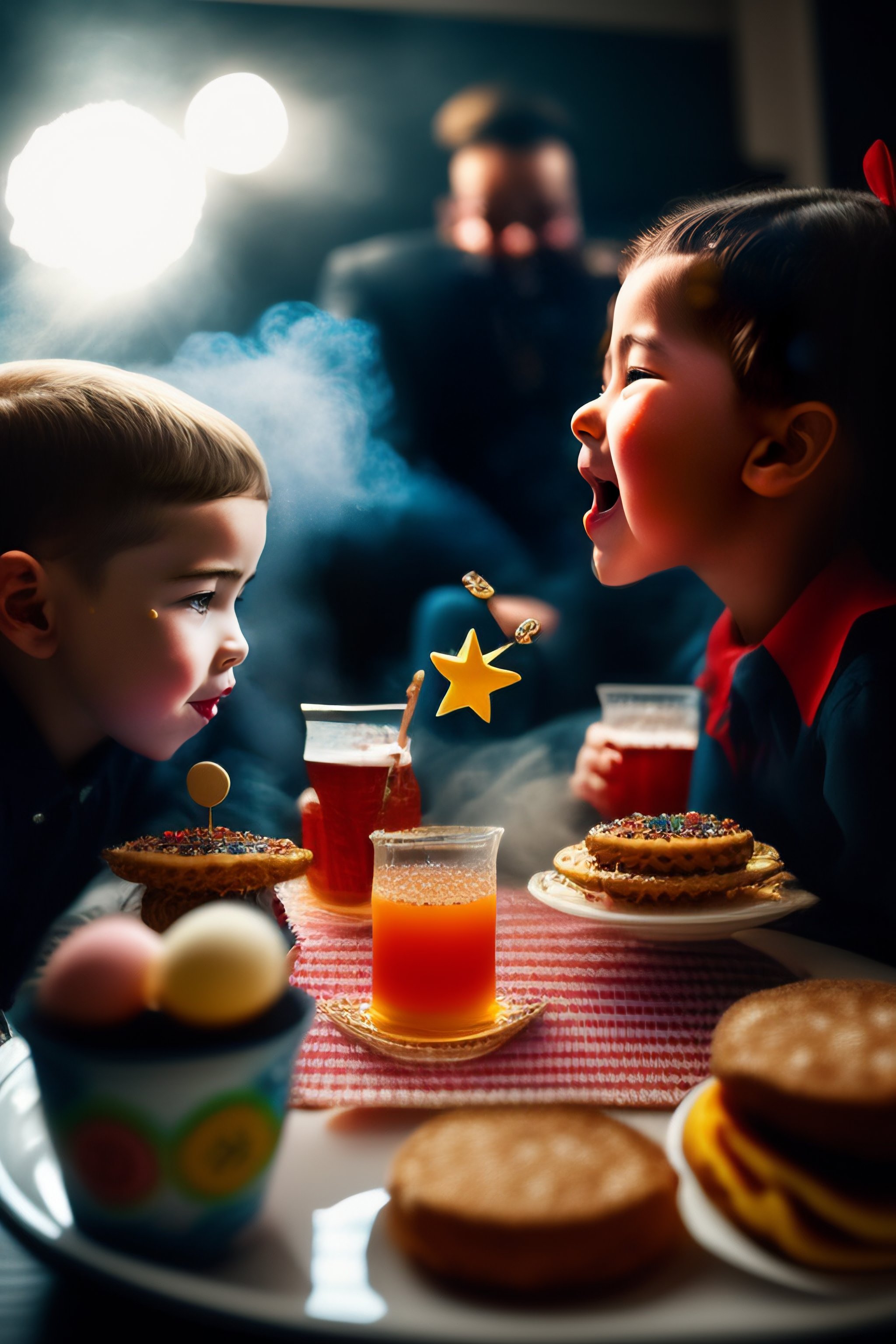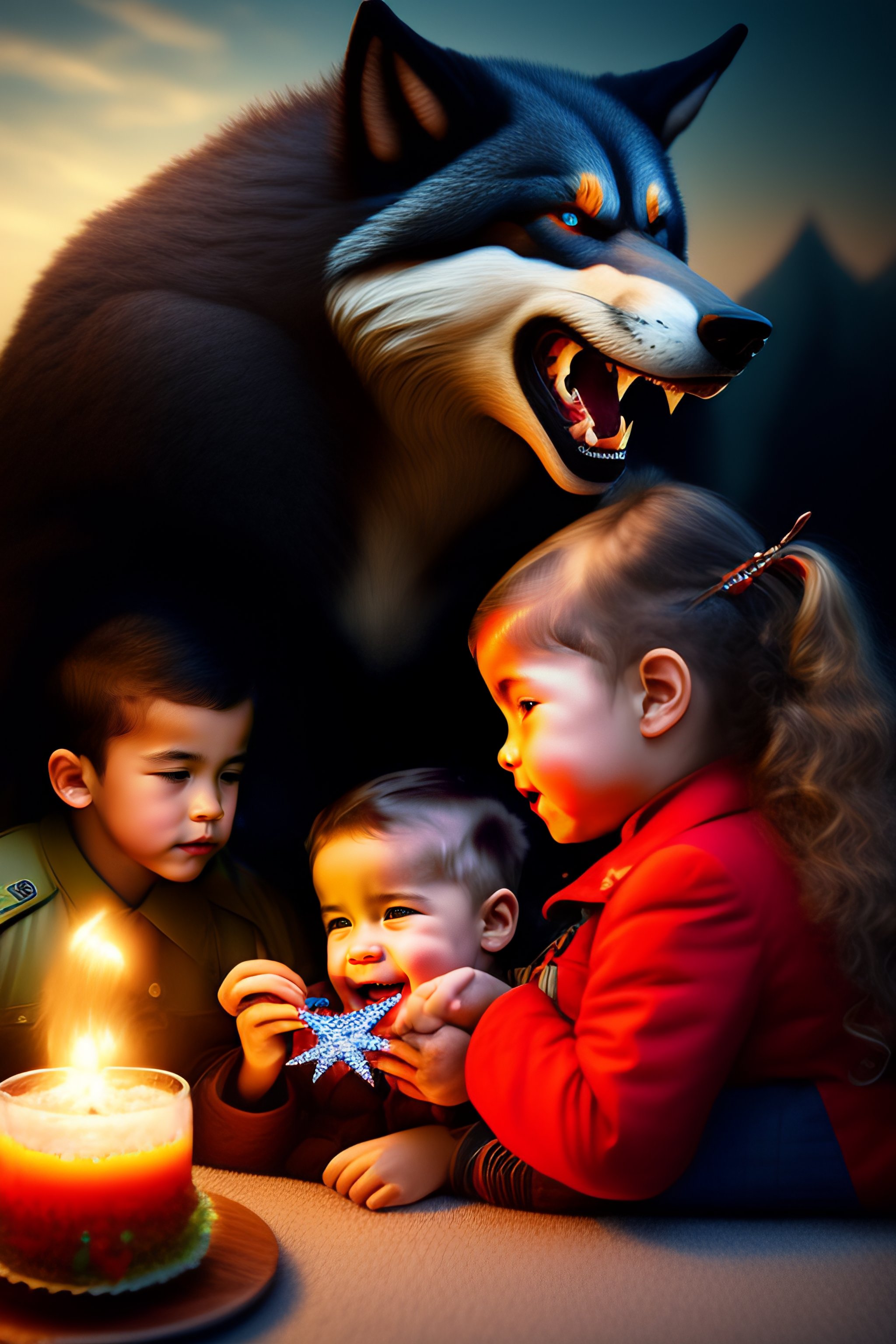 Kinder werewolf party hama eat suger star as wartime photo fairy tale realistic nightmare