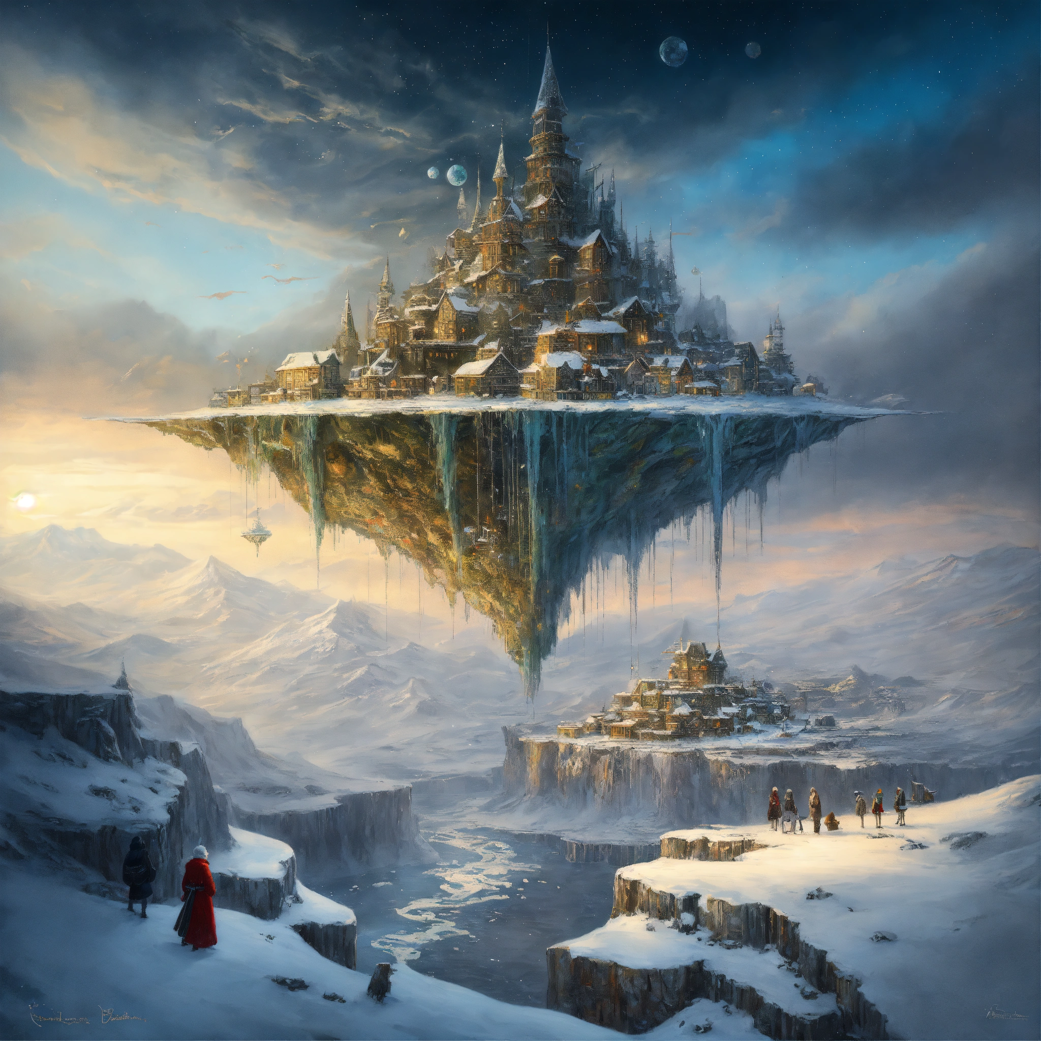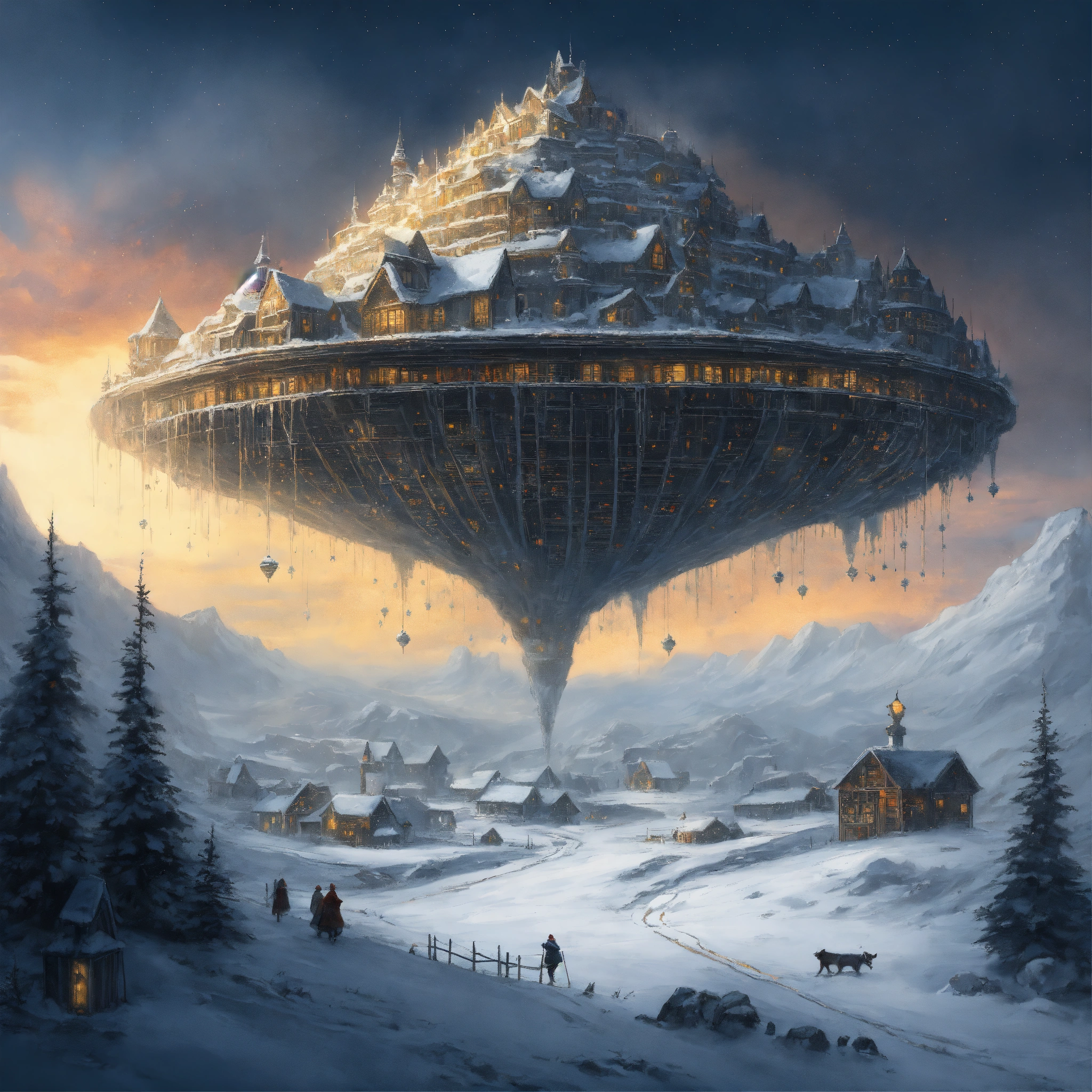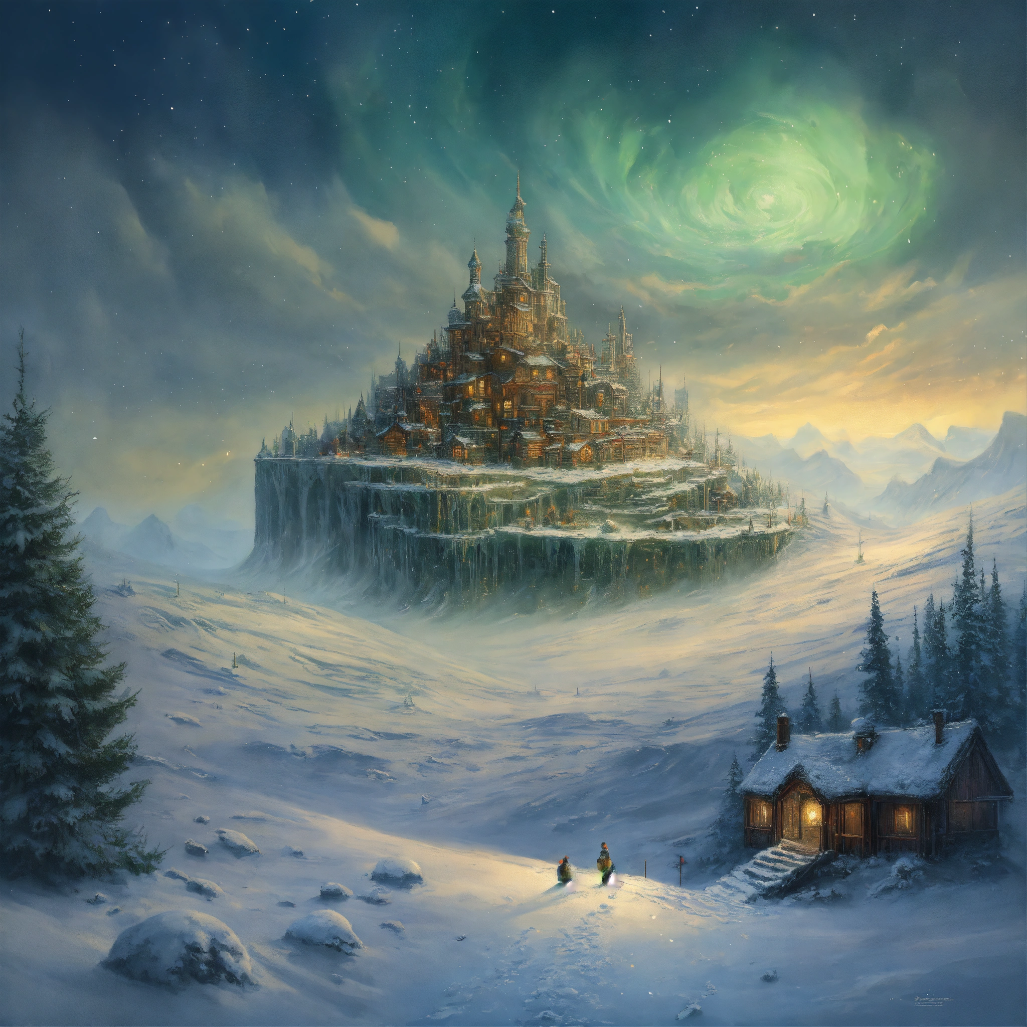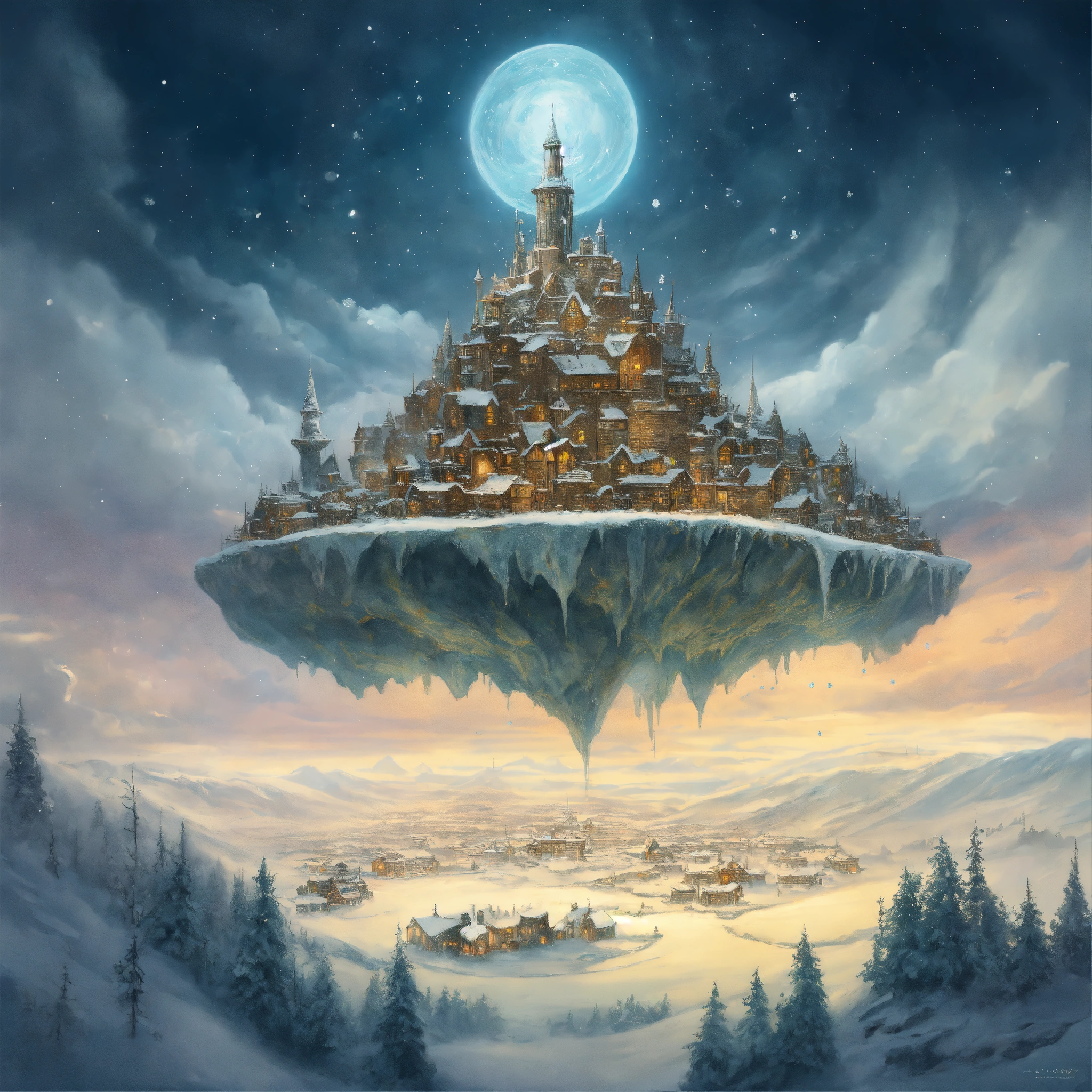 Best quality, composite artwork concept, painting depicting an intricately detailed floating city, levitating atop an arctic tundra enveloped in a swirling snowstorm, applying artistry reminiscent of such masters as cicely mary barker h. r. giger, and beksiński. the floating city should tell a different aspect of a magical children's tale a snowy wonderland, a dense, dormant forest, the bleak and lonesome north pole, embellished with crystals. 8k