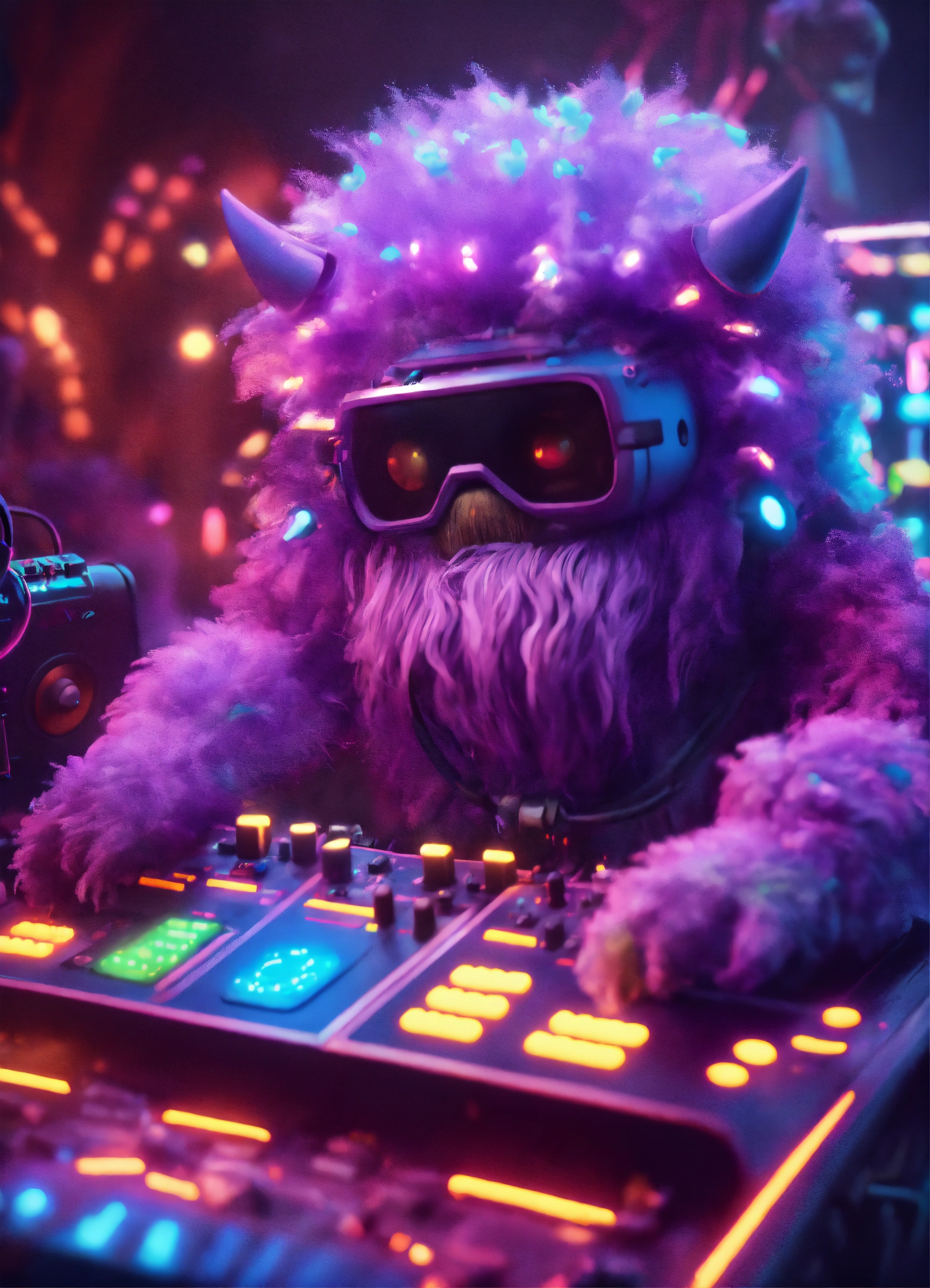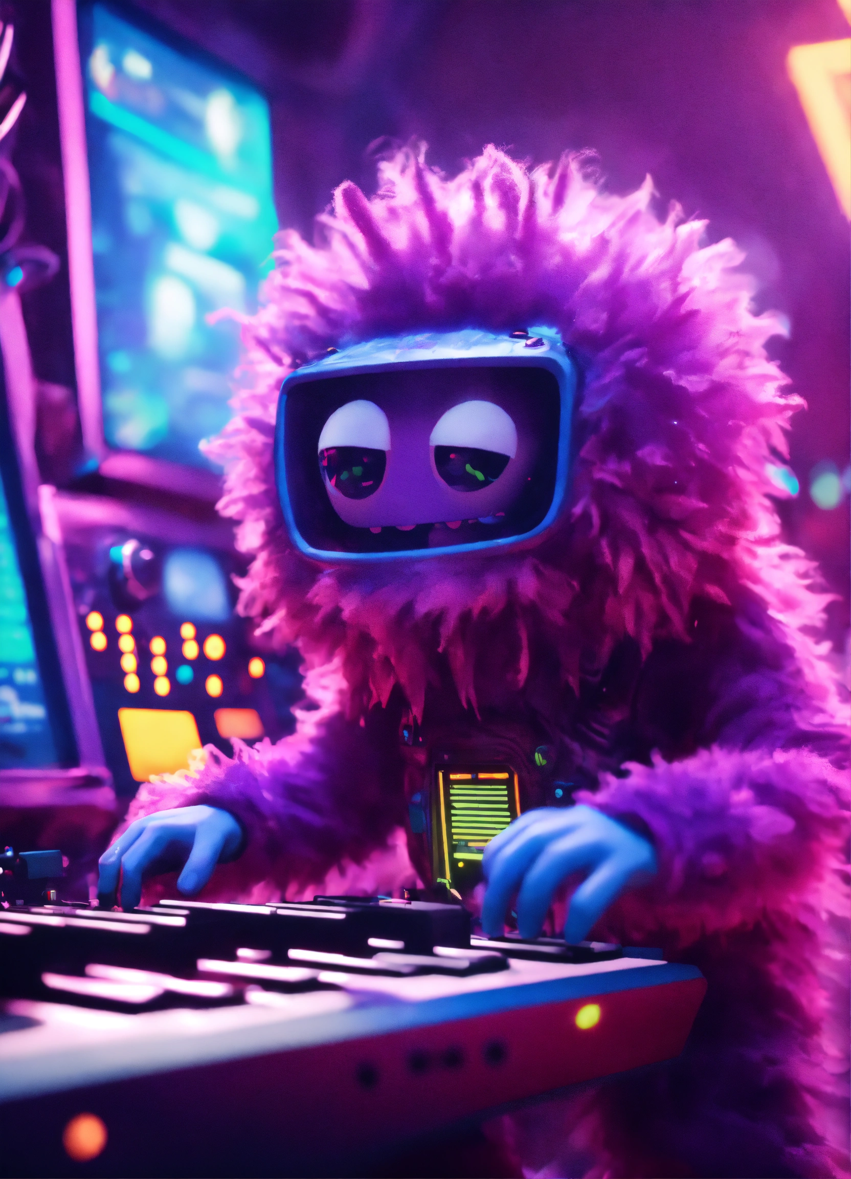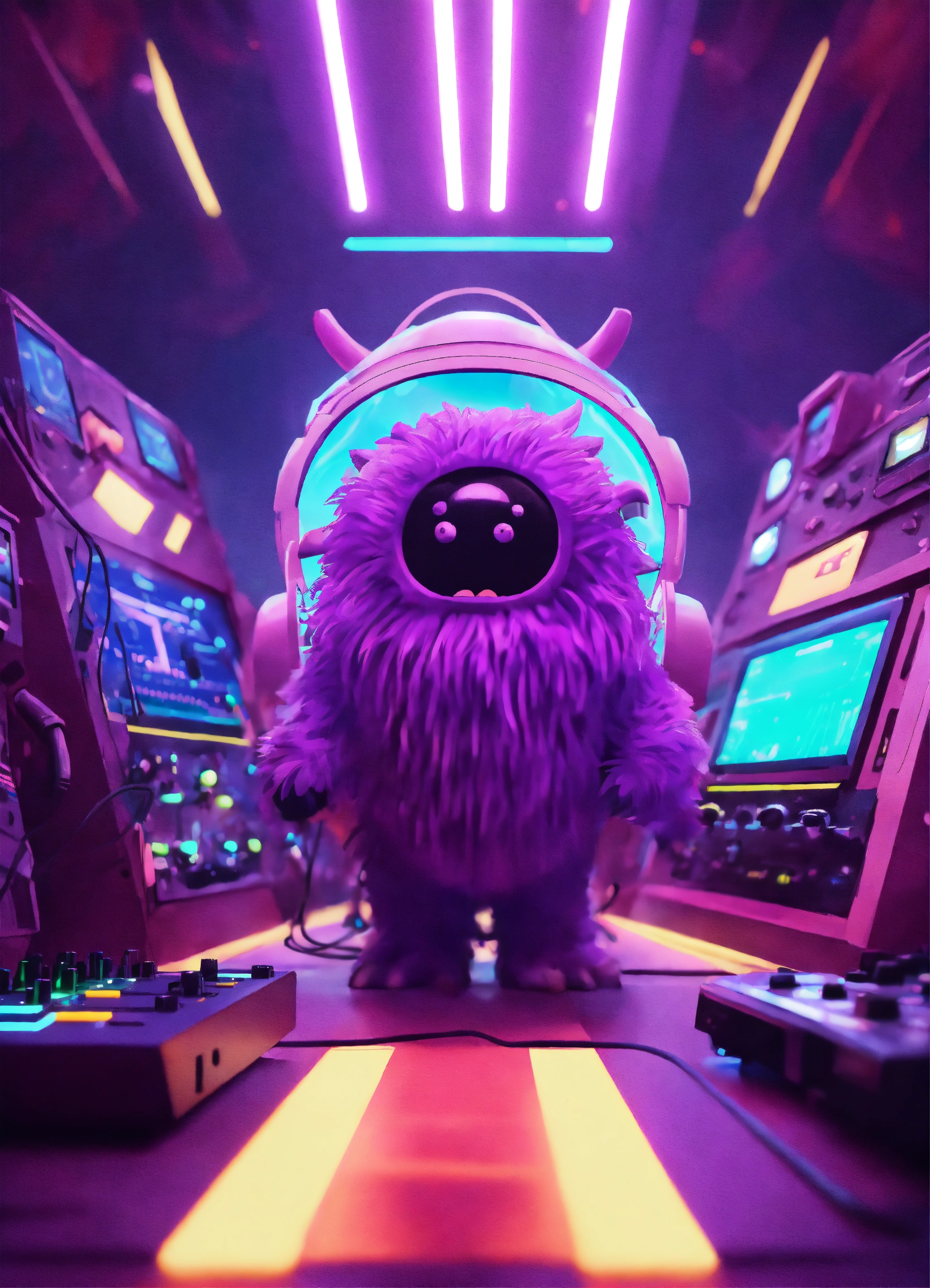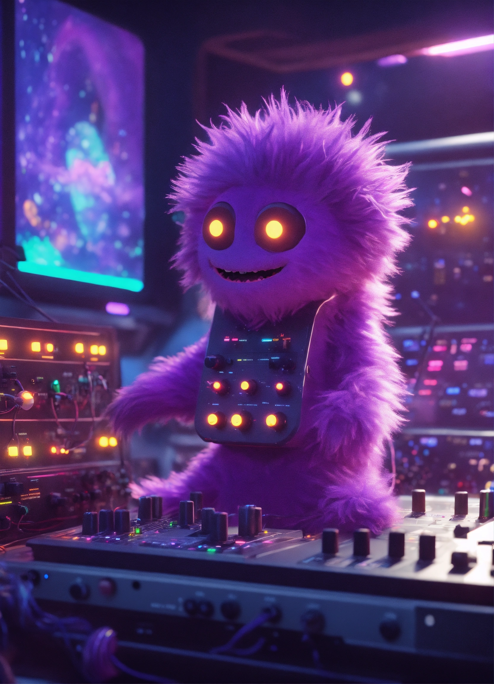 Zoom out fun loving cute hairy violet colored monster cartoon character playing a alien modular analog synthesizer at a rave on a spaceship, people from different galaxies dancing and enjoying the music, pixar, unreal engine, 8k.
