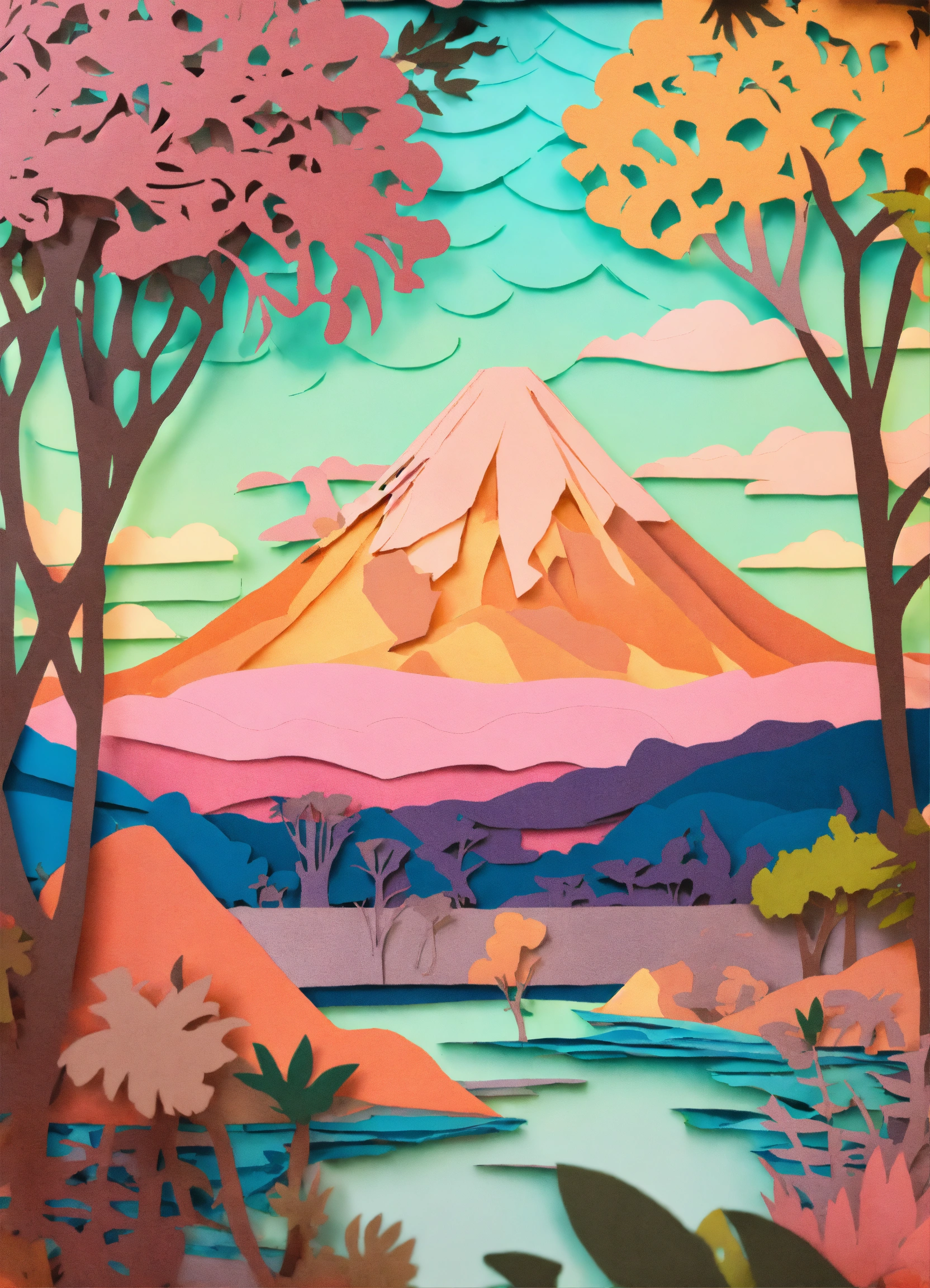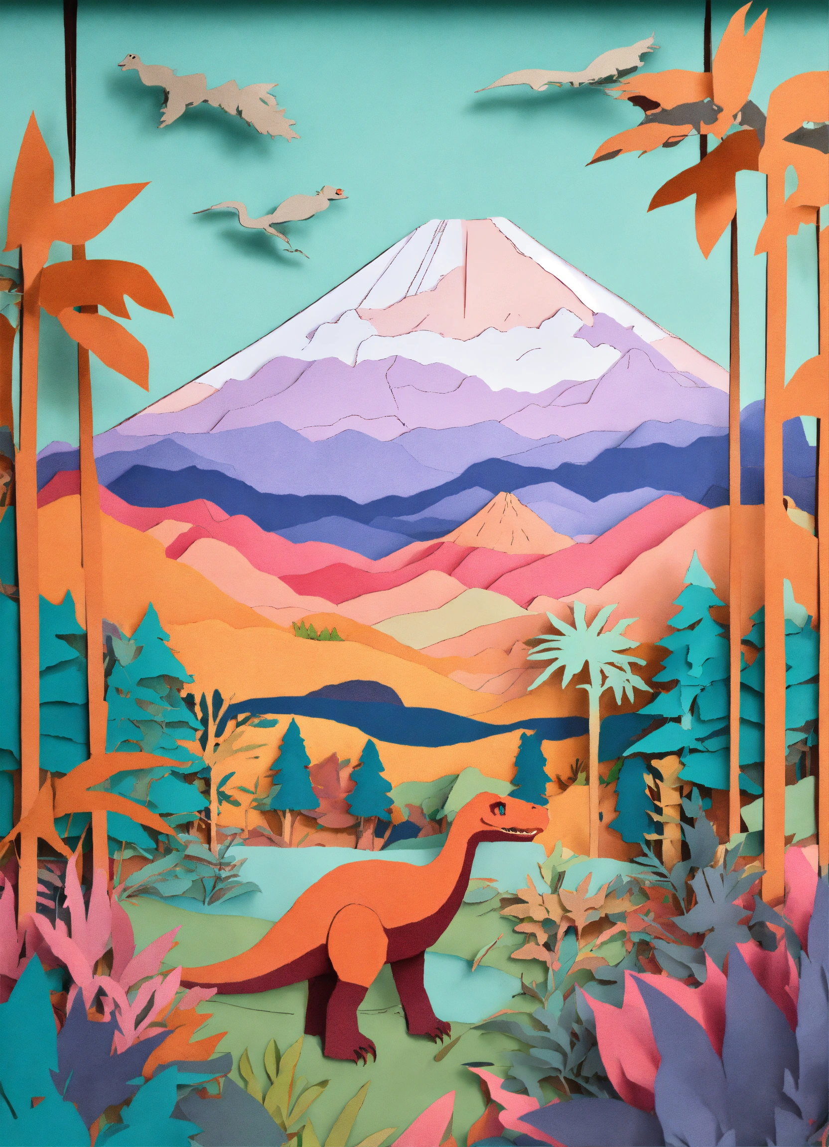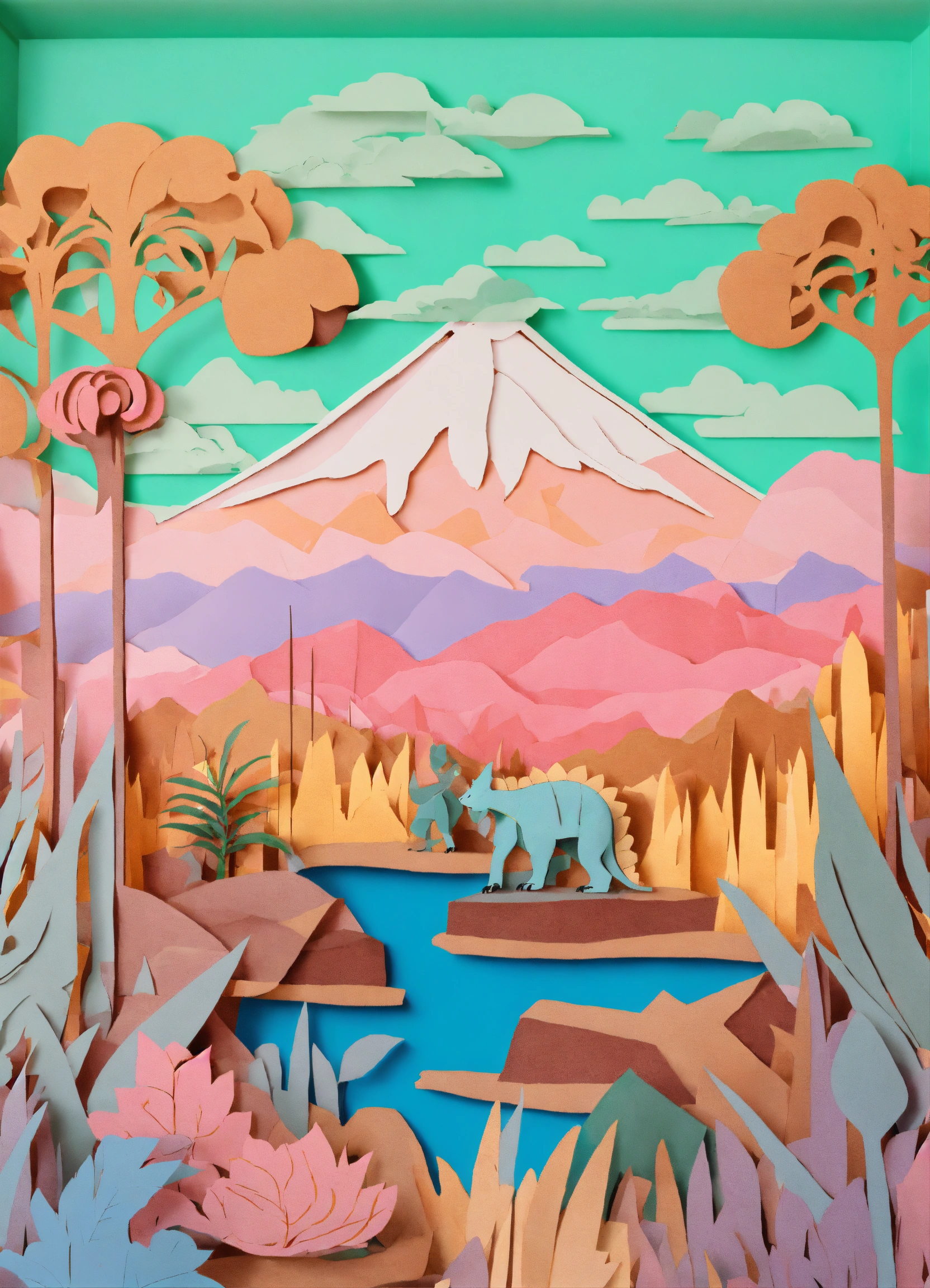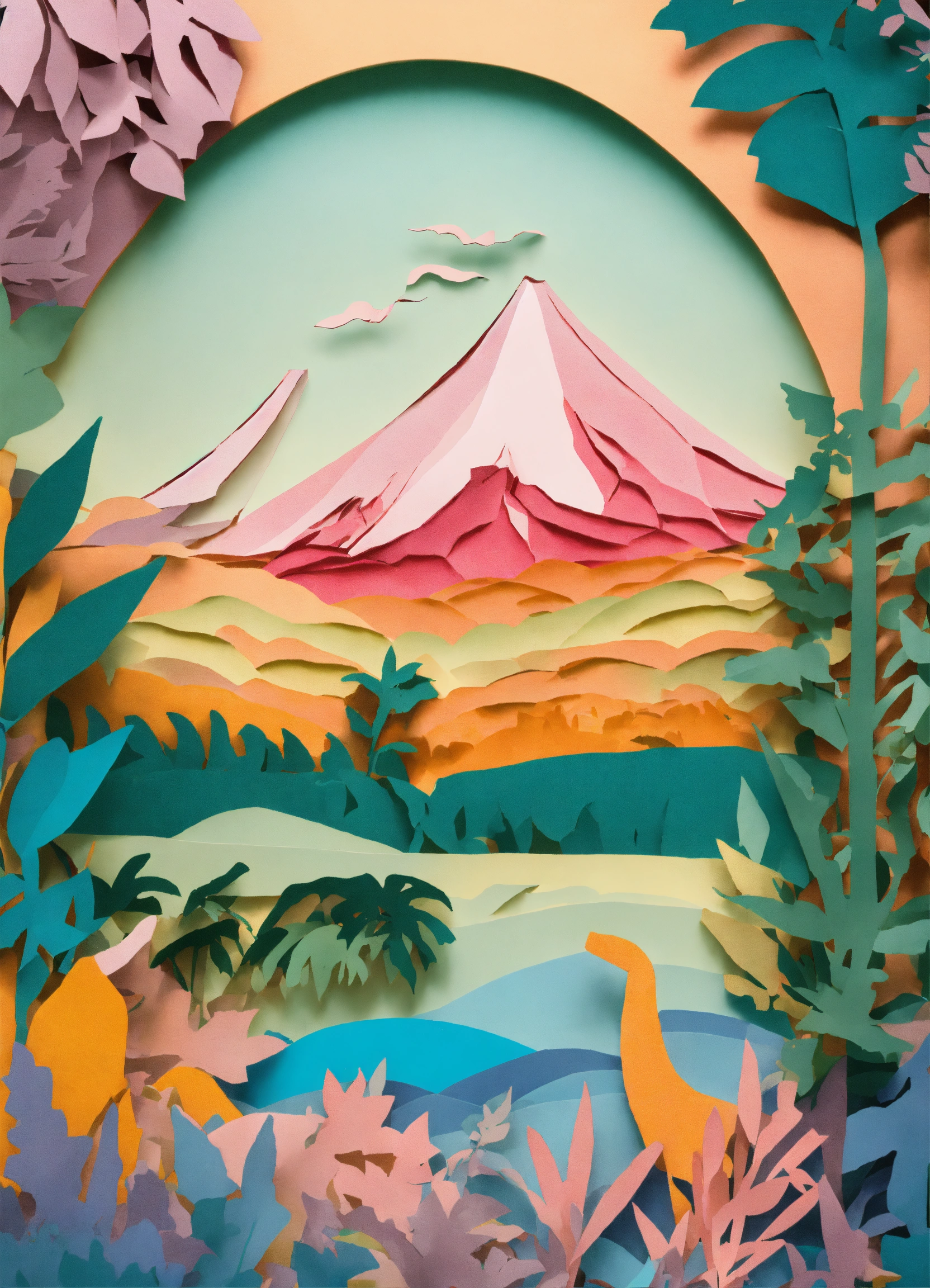 2d laser cut paper illustration, layered paper, foreground paper foliage, in the distance volcano and dinosaurs, pastel colors