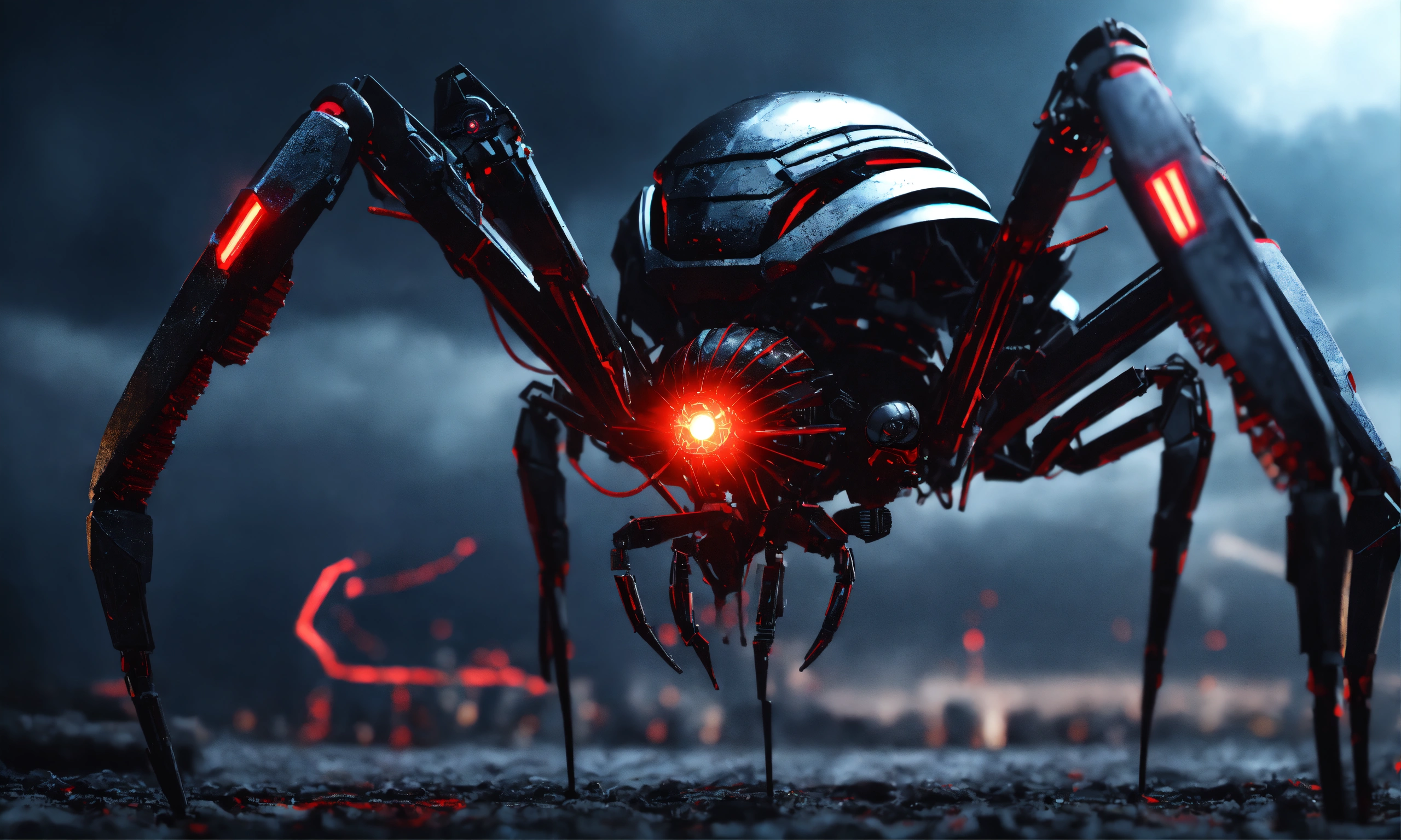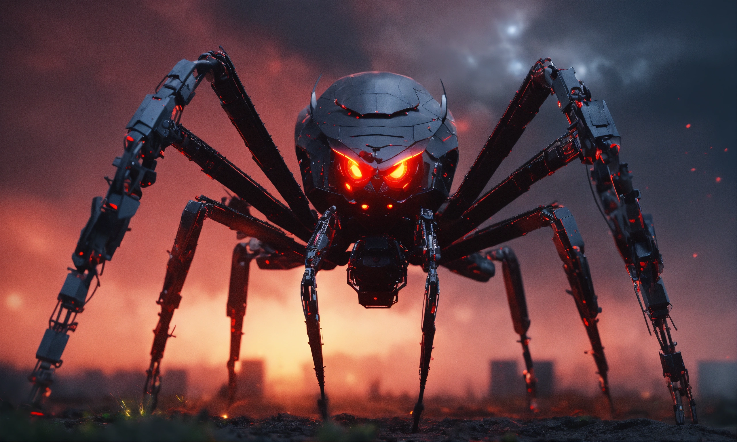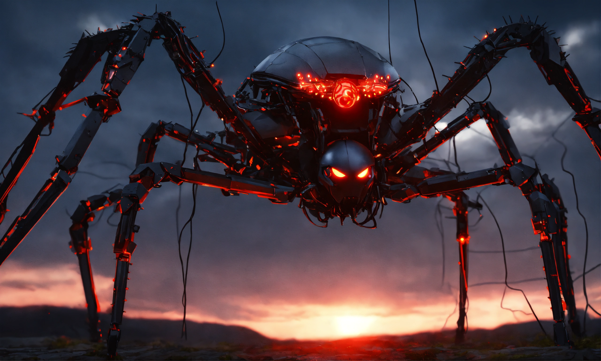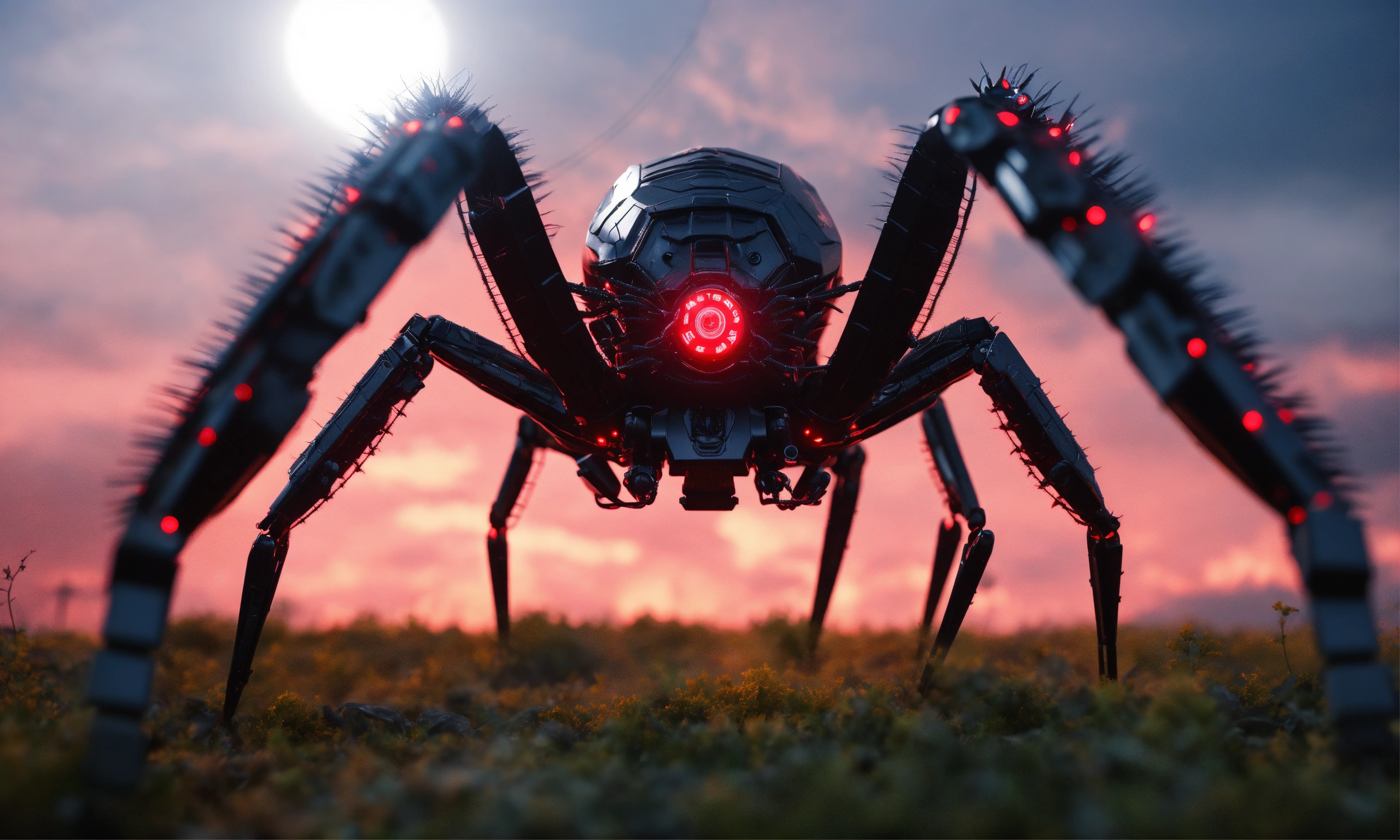 Long gigantic black armored robotic spider with red glowing eye flying through the sky, the electricity surges with power from the ground into its mouth, realistic, 8k