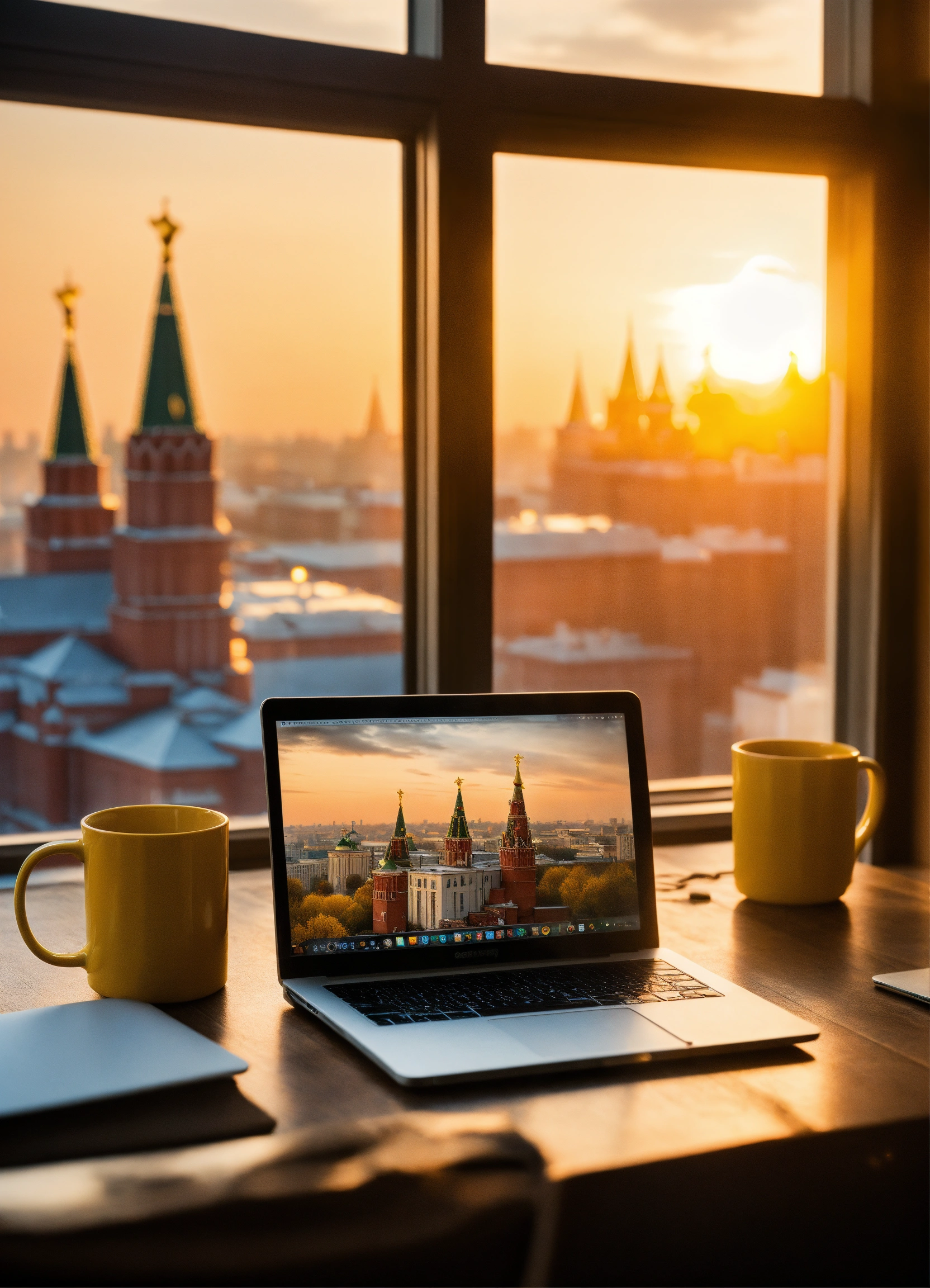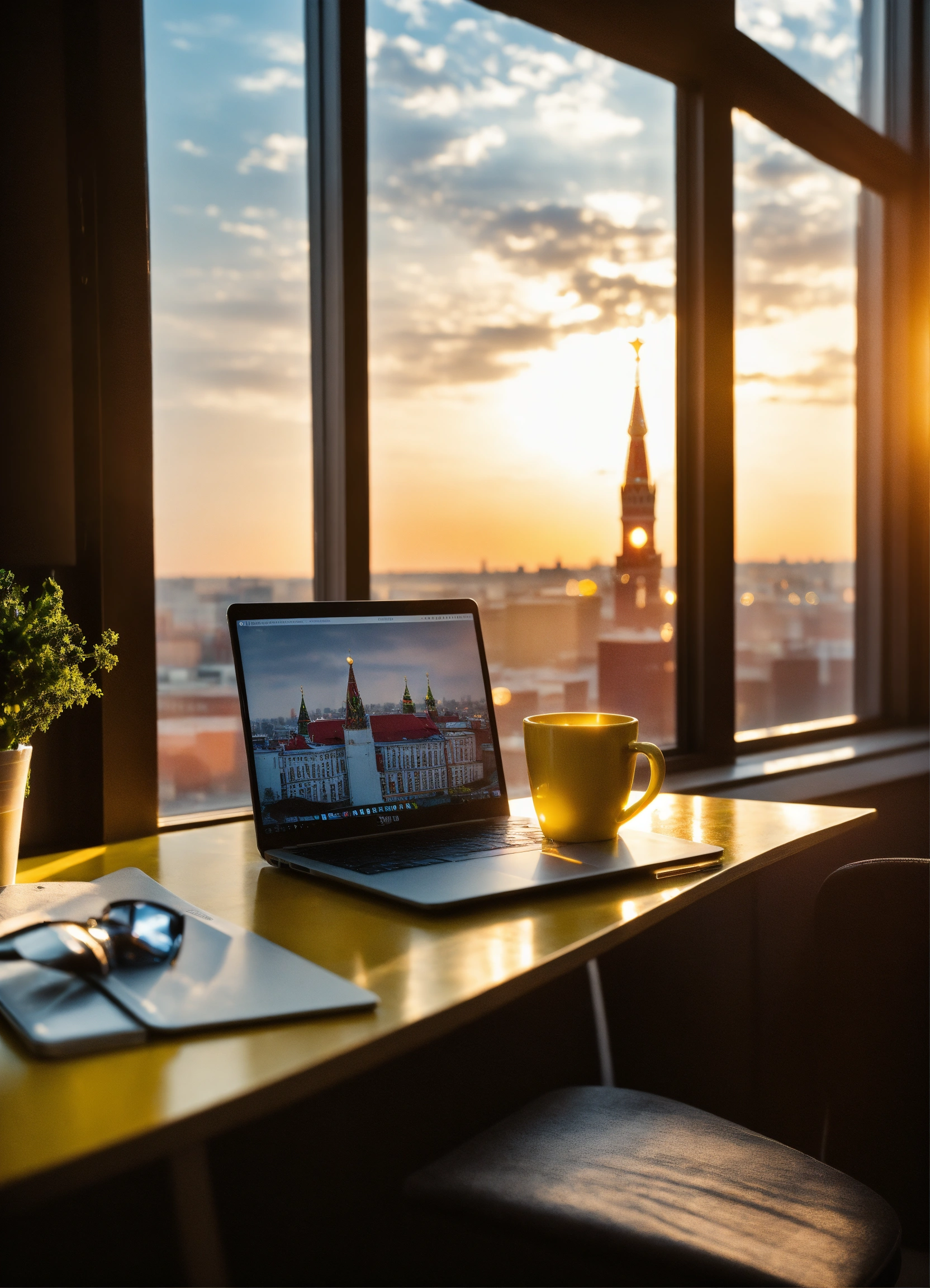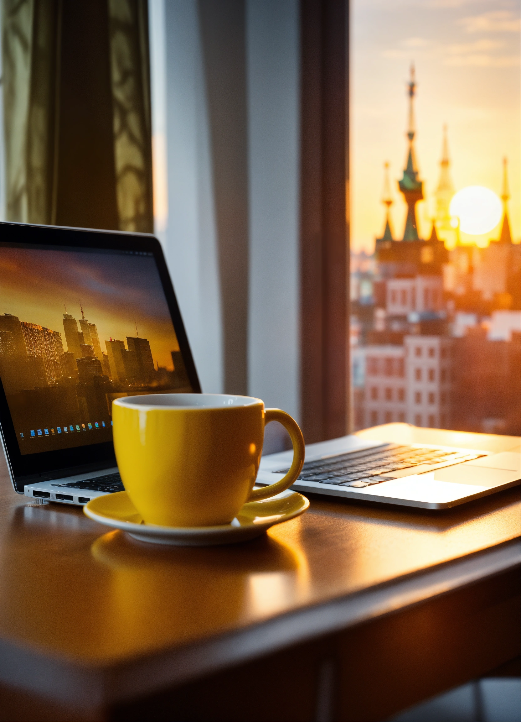 Office. a yellow mug with coffee on the table near the laptop. directly behind the laptop there is a large window overlooking the moscow, where the sunrise is visible. realistic photography.