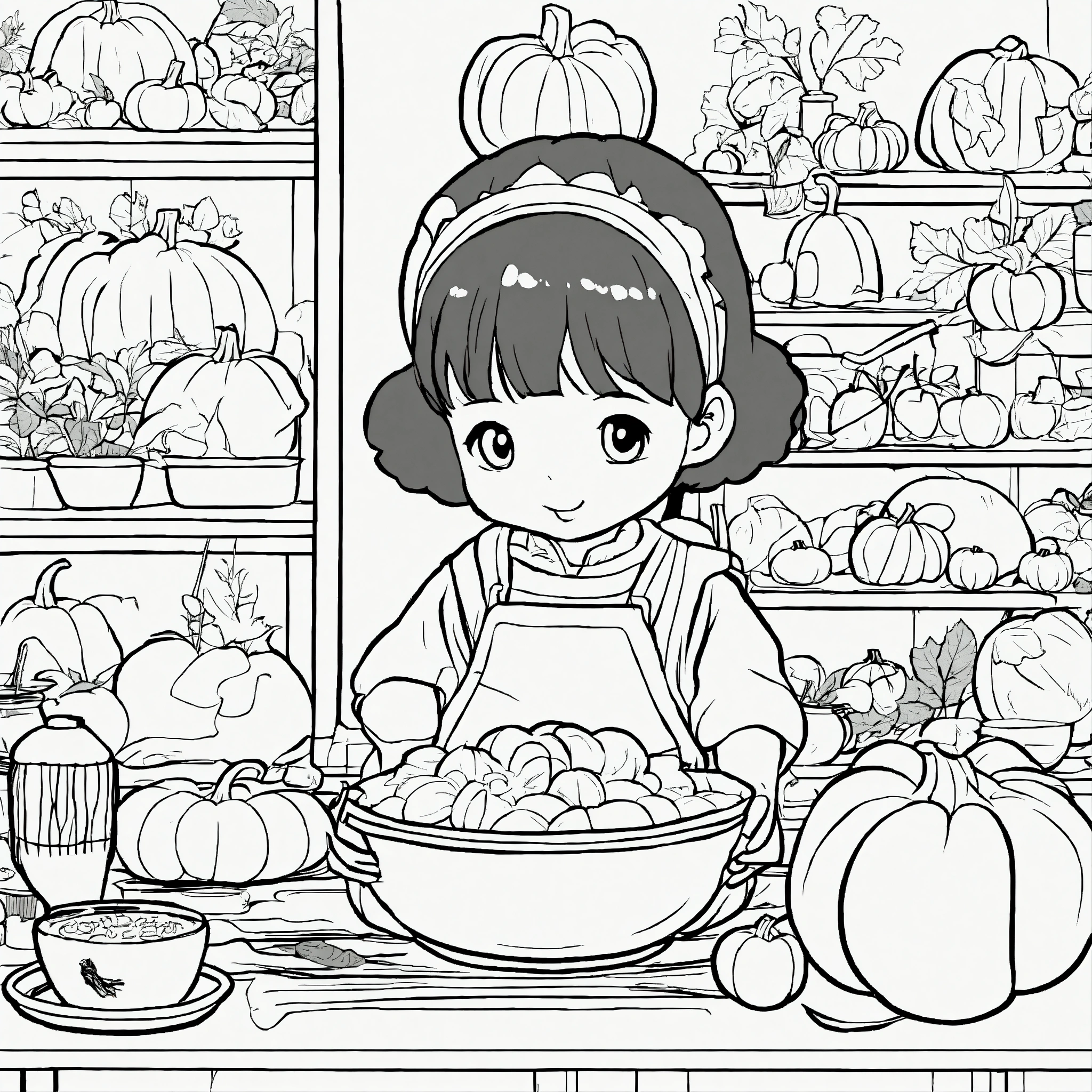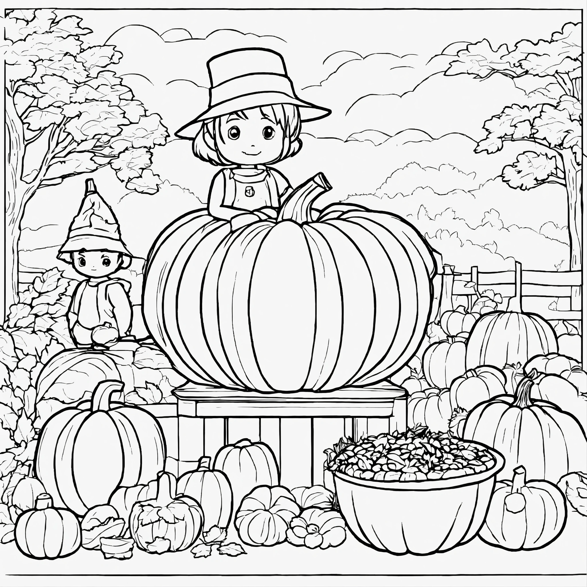 Cute thanksgiving pumpkin decorating" children paint and decorate pumpkins, preparing them for the holiday, for a toddler's, pixar style, simple outline and shapes, black and white coloring book, flat vector, white background, clean line art, studio ghibli studio, ukiyoe style, european characters by shiba kōkan, line art illustration