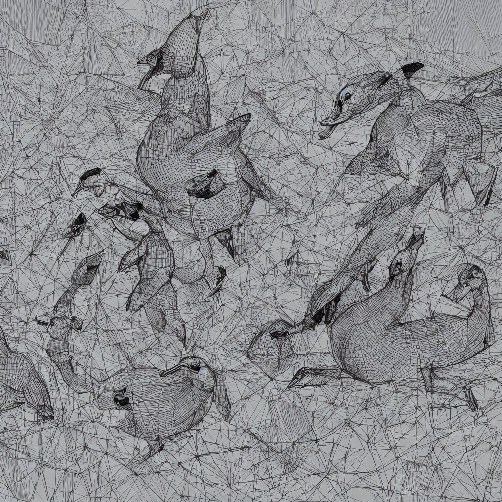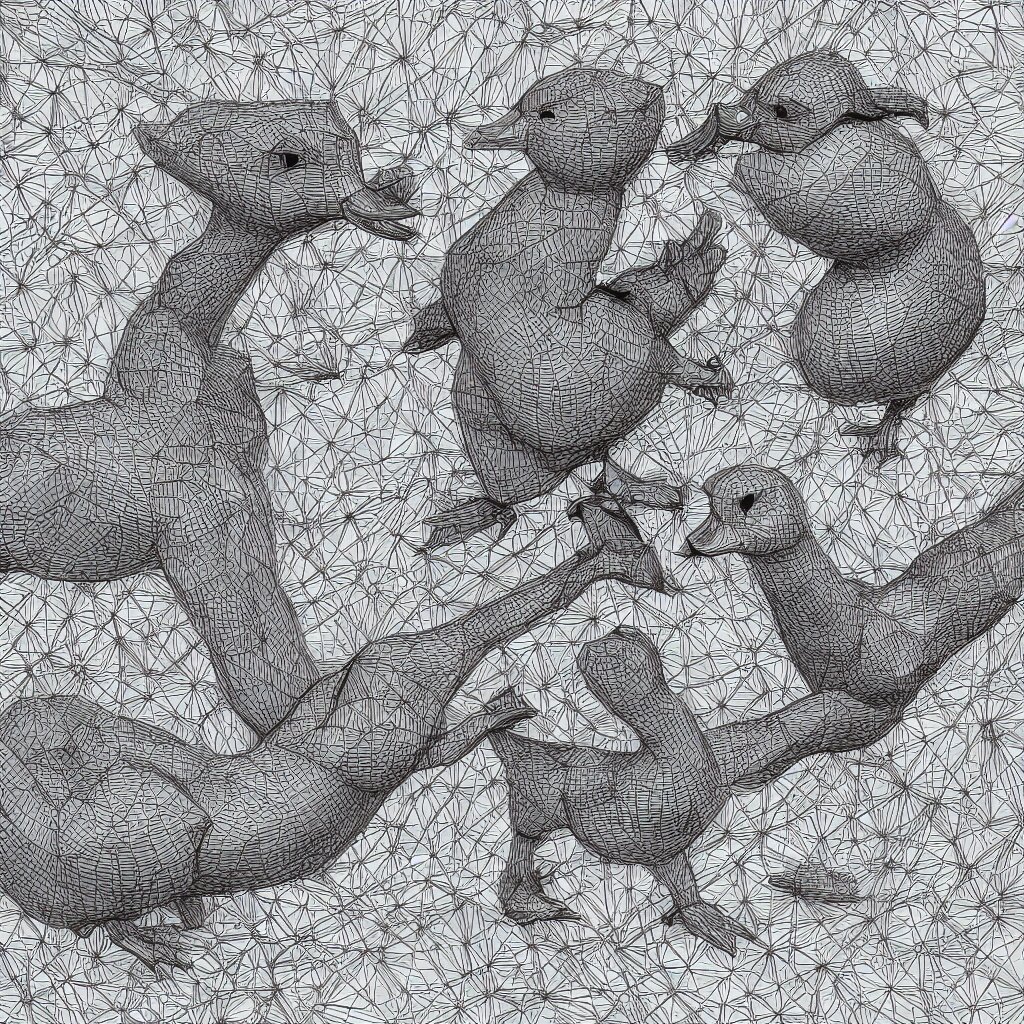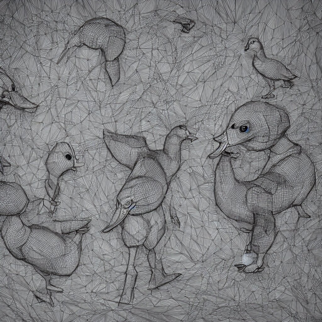 Duck brothers giving a secret handshake, closeup, wireframe 3d geometry warping in the background, in the style of james jean and hiroya oku, manga, extremely detailed, ambient lighting, intricate penwork, beautiful, epic, 8k, 3d render
