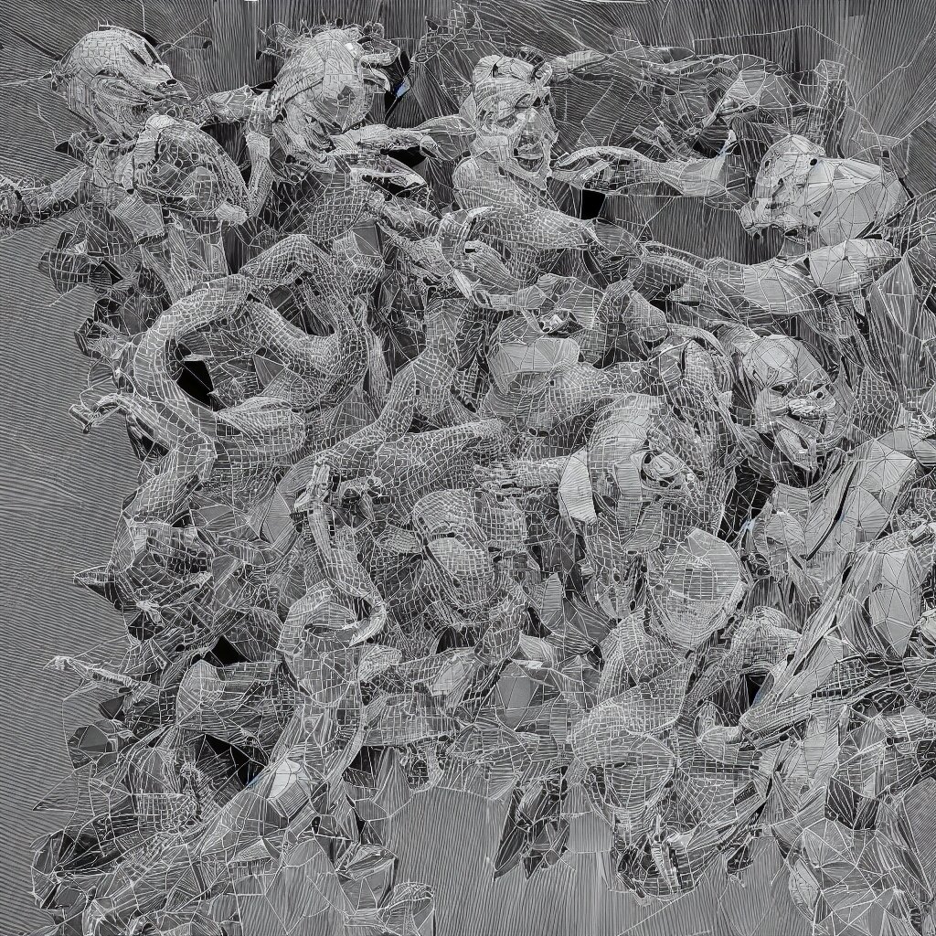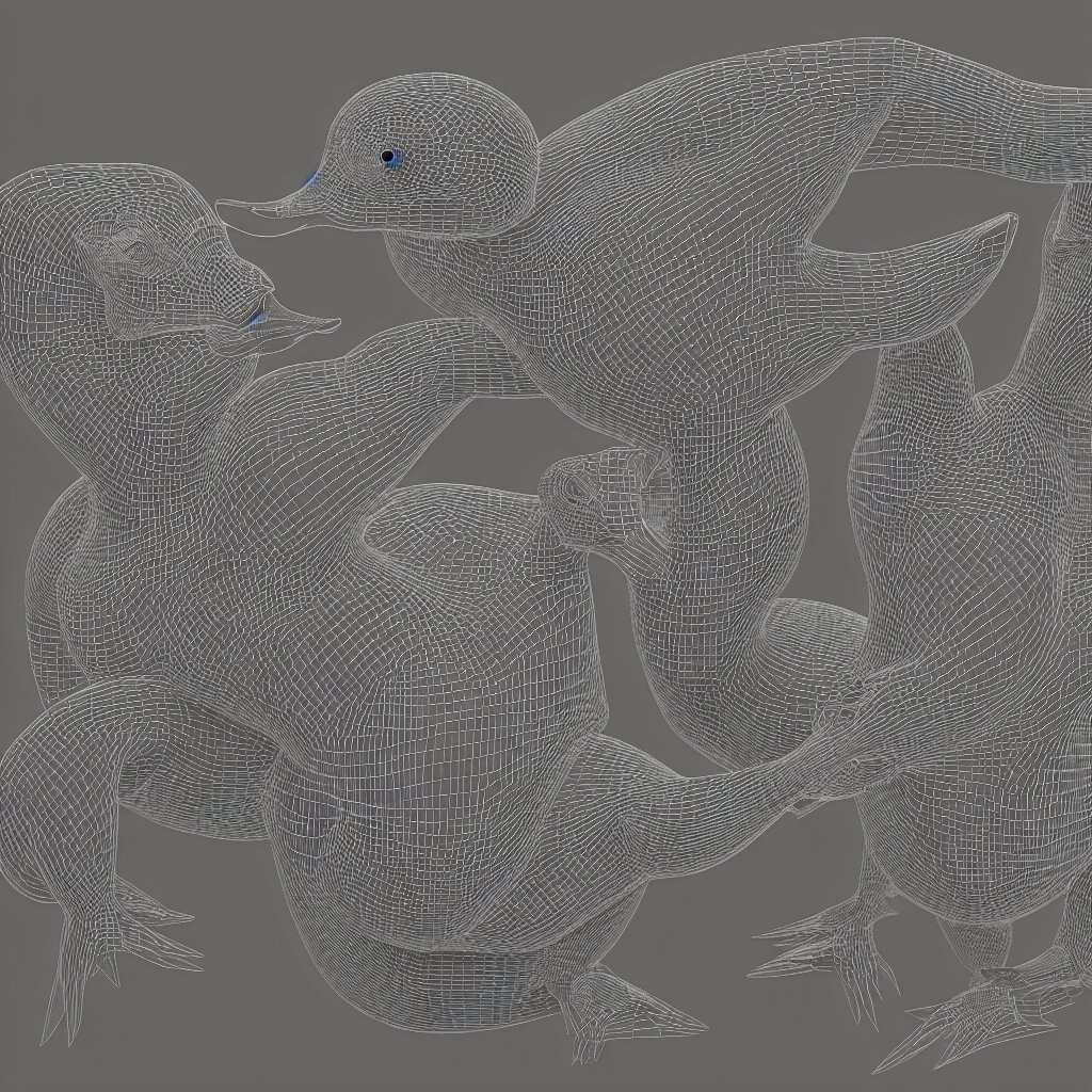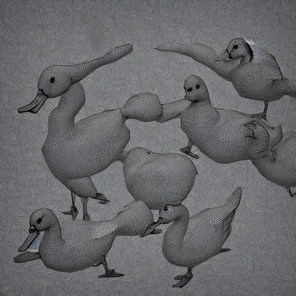 Duck brothers giving a secret handshake, closeup, wireframe 3d geometry warping in the background, in the style of james jean and hiroya oku, manga, extremely detailed, ambient lighting, intricate penwork, beautiful, epic, 8k, 3d render