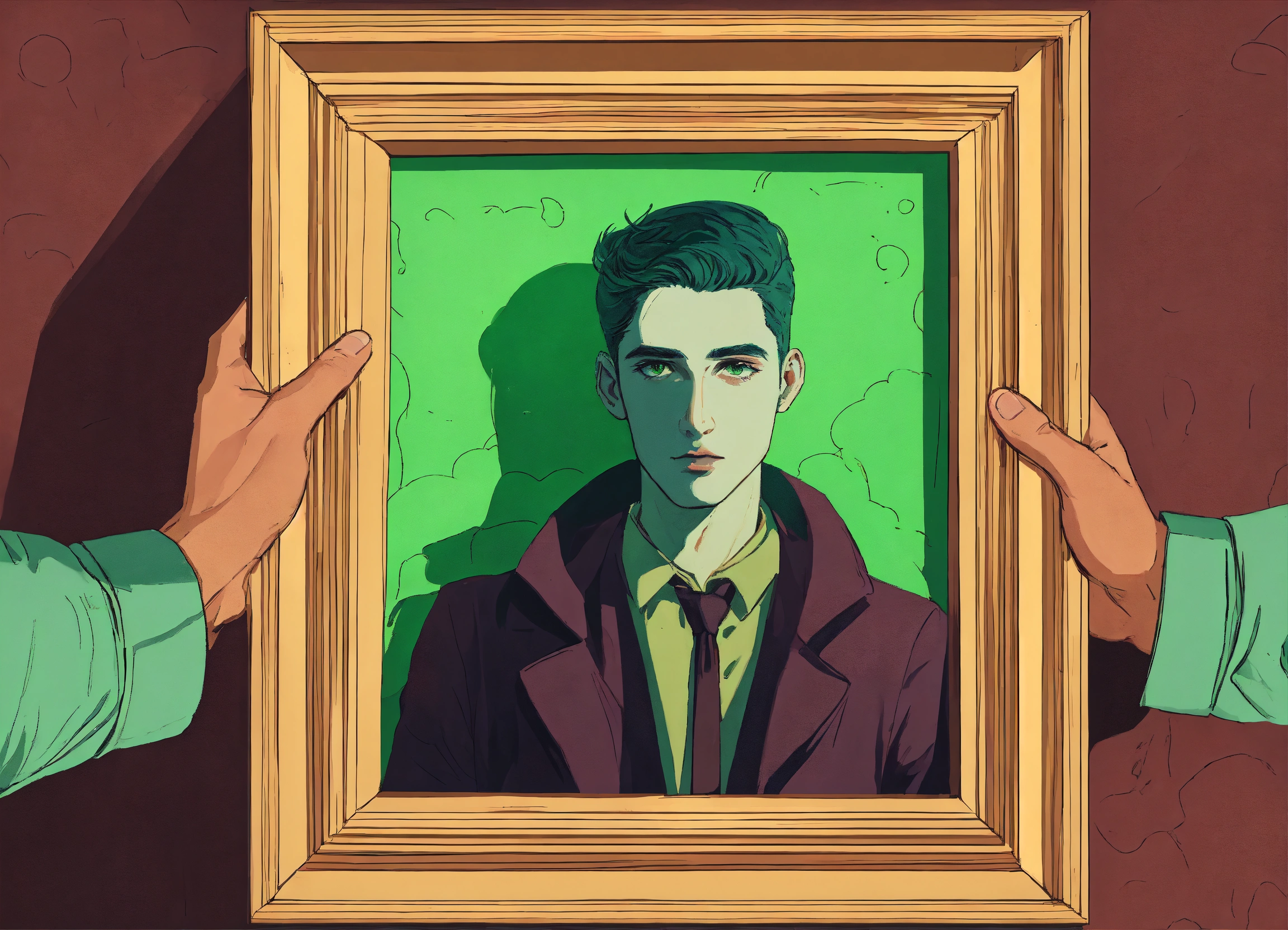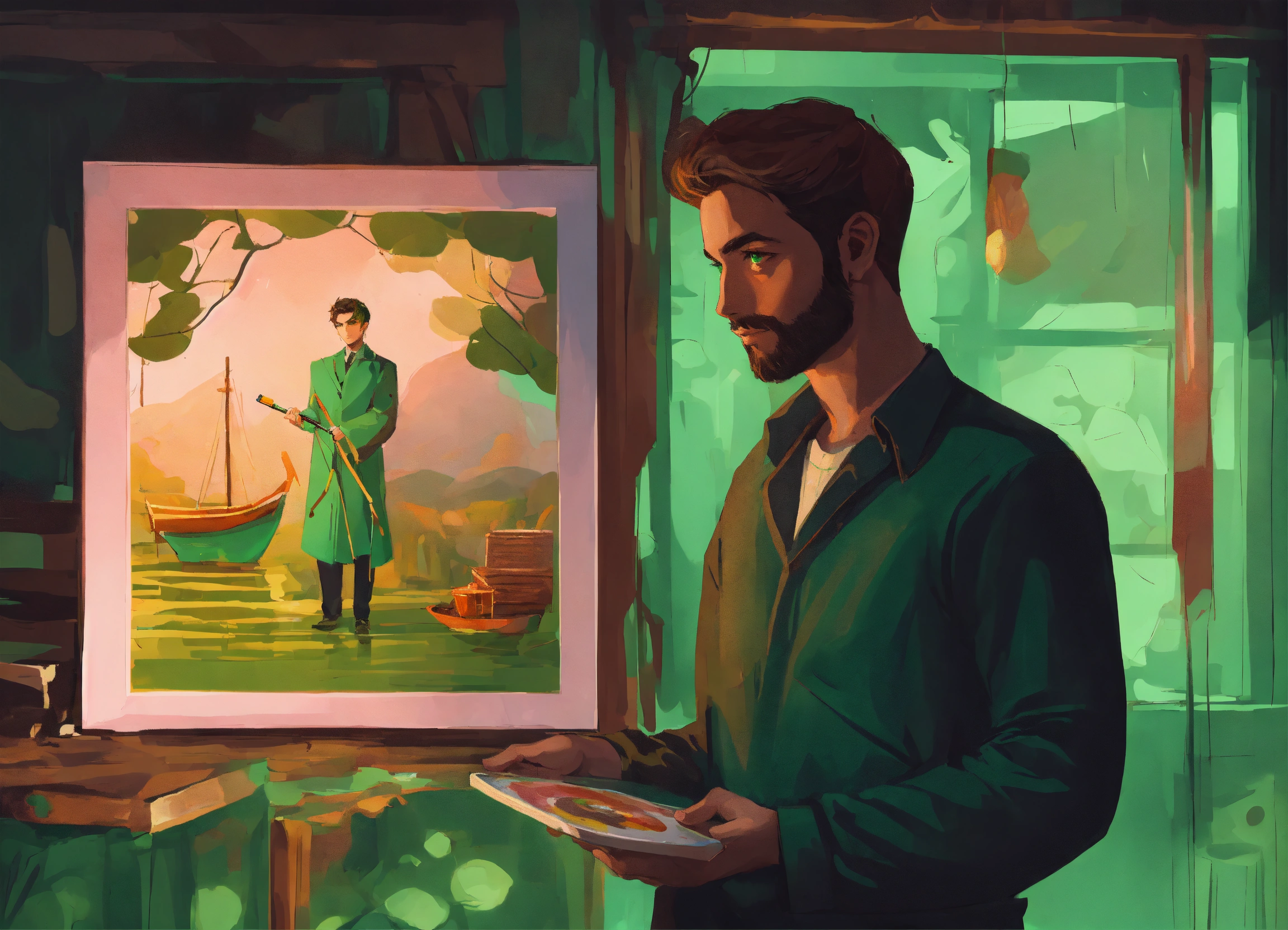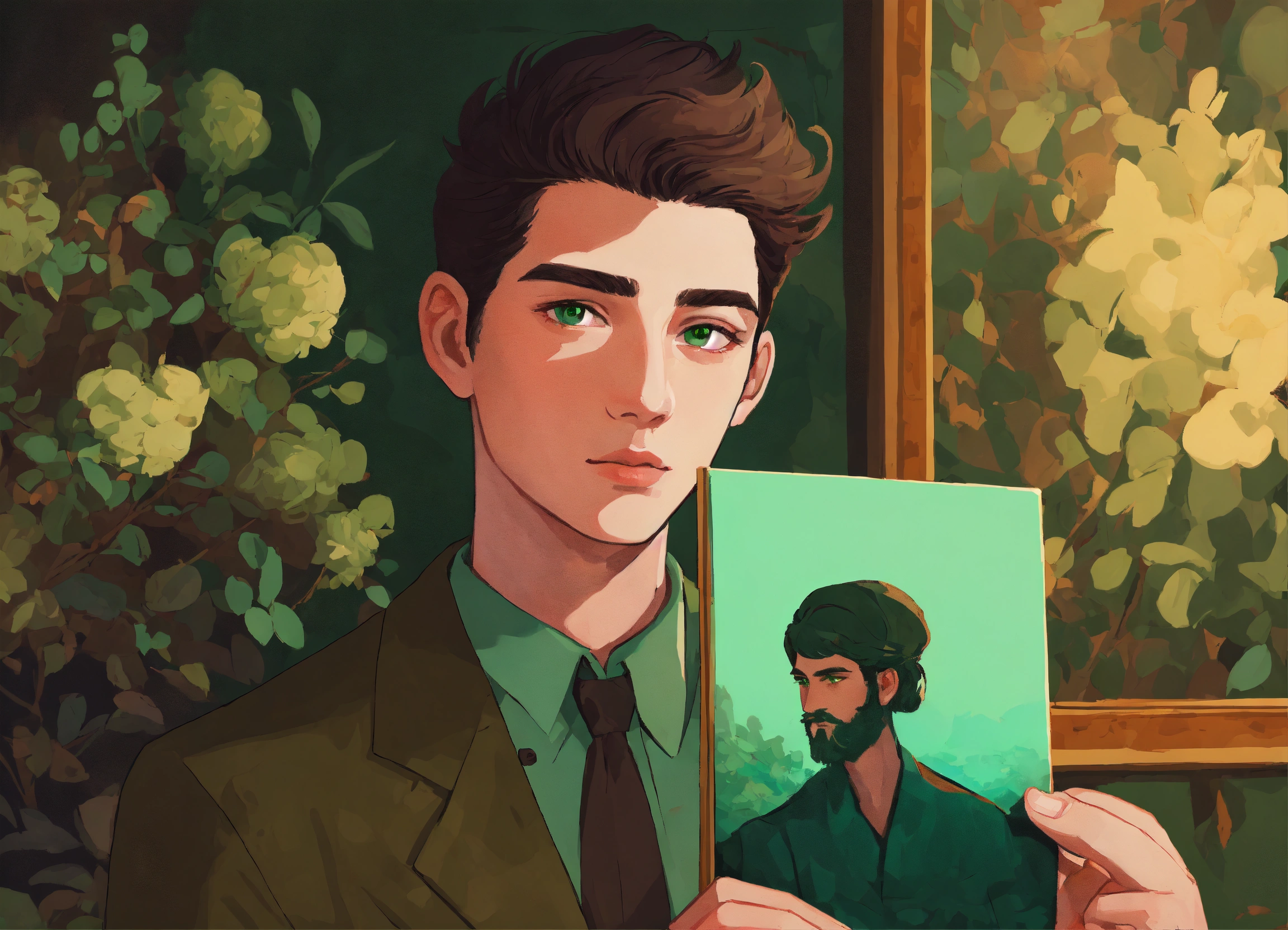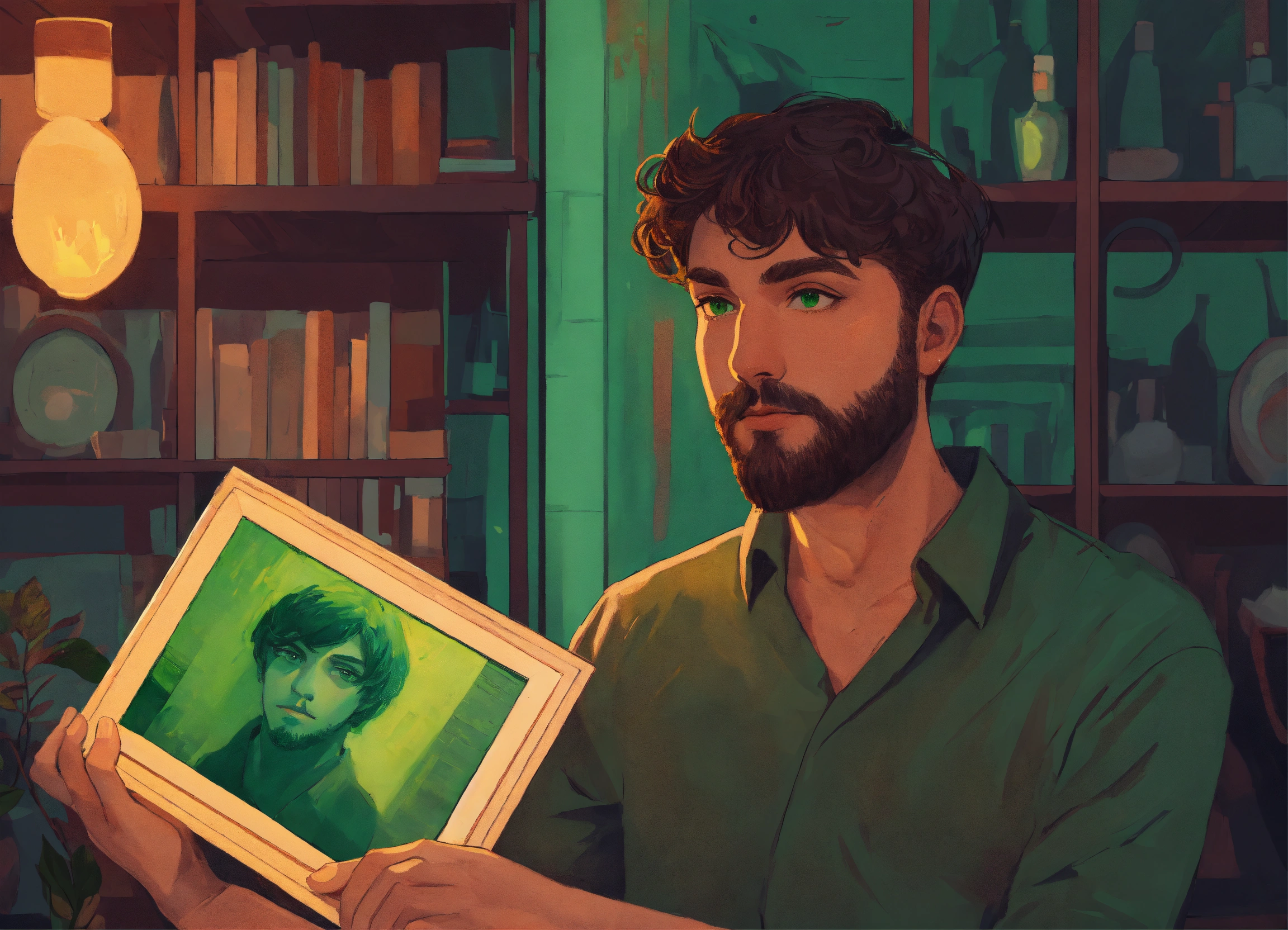 An illustration style where man with green eyes is holding painting with hidden dark secrets in a hand