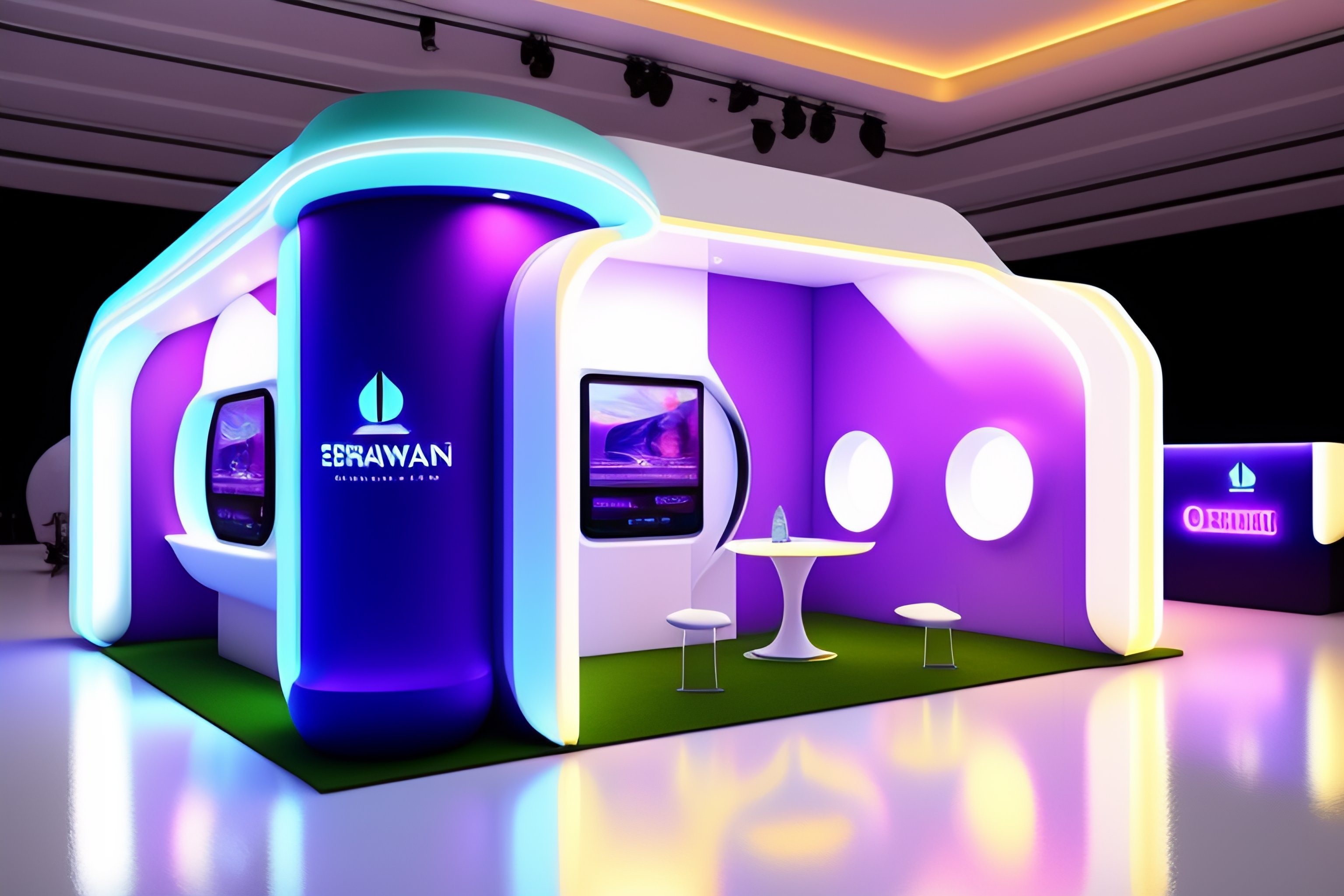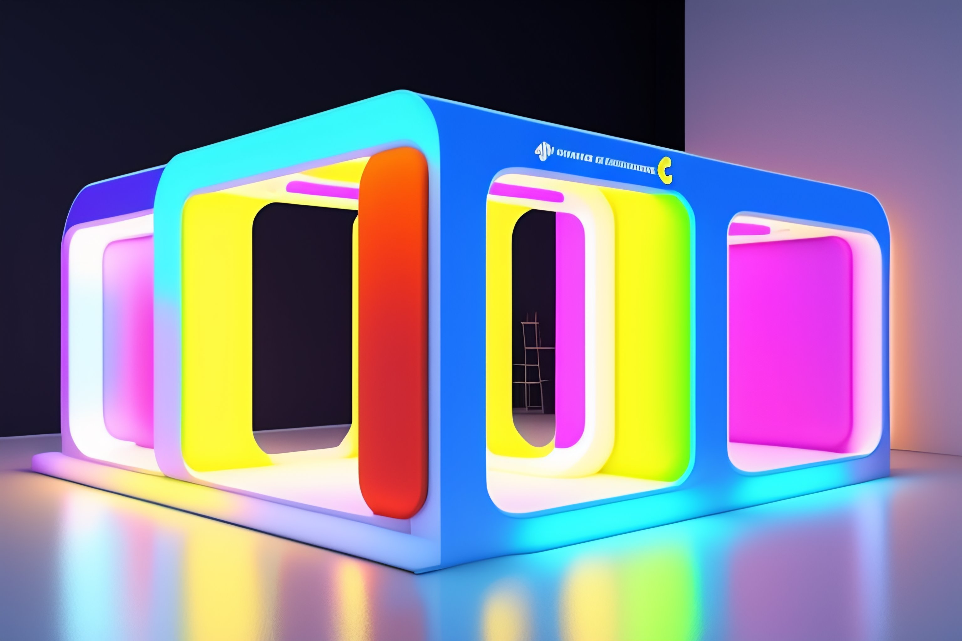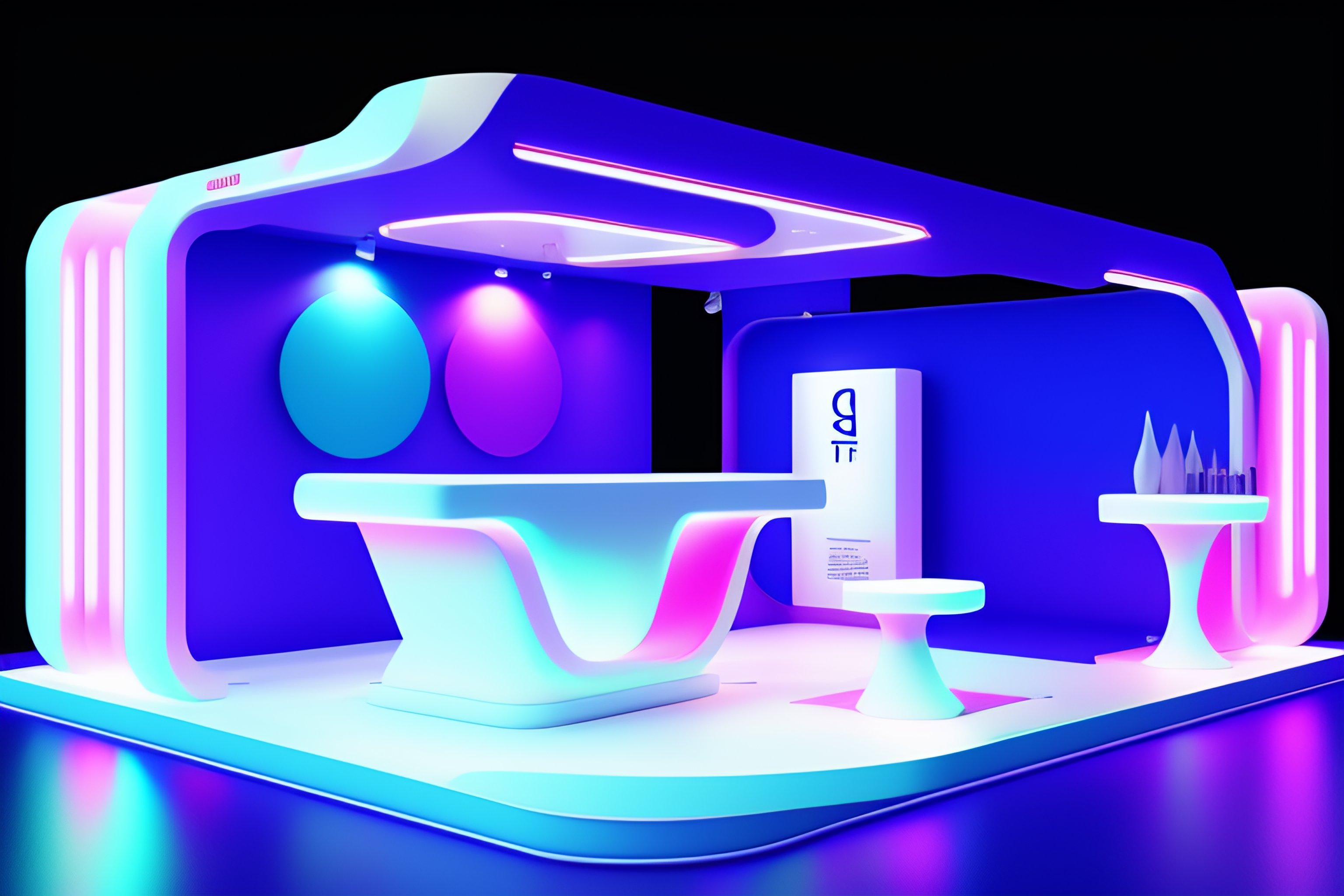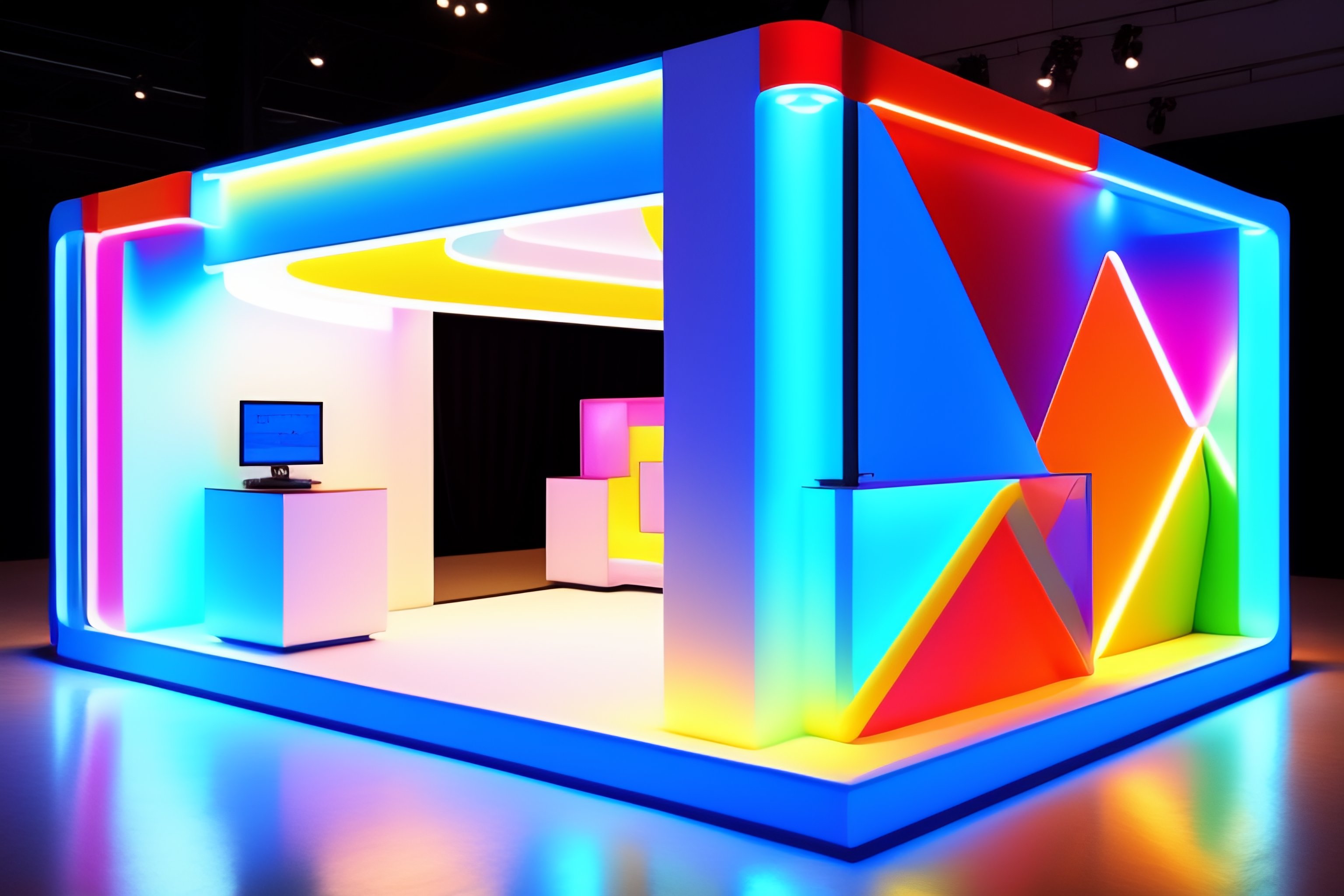 Exhibition stand design, expo, interior design, geometric shapes, bright light colors, 50mm, soft light, fabrics, white paint, led neon lights, 4k, --v 4 --q 2 --ar 2:3