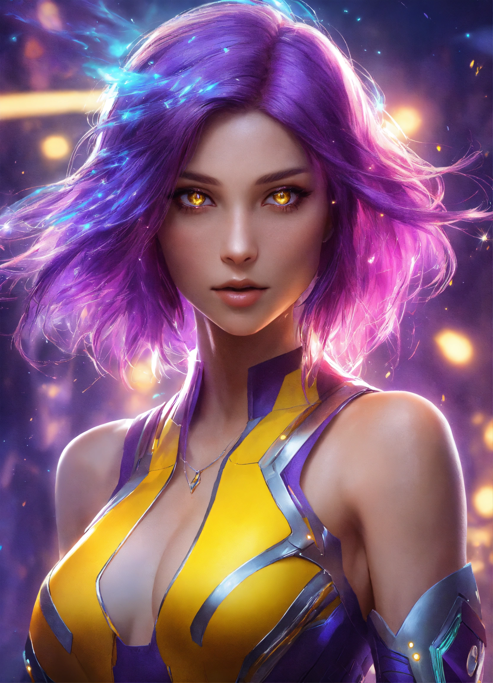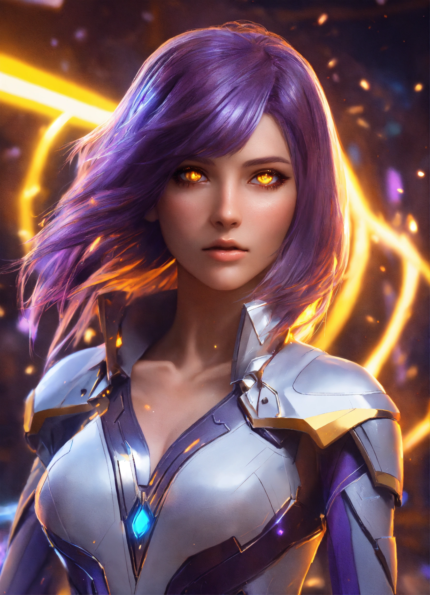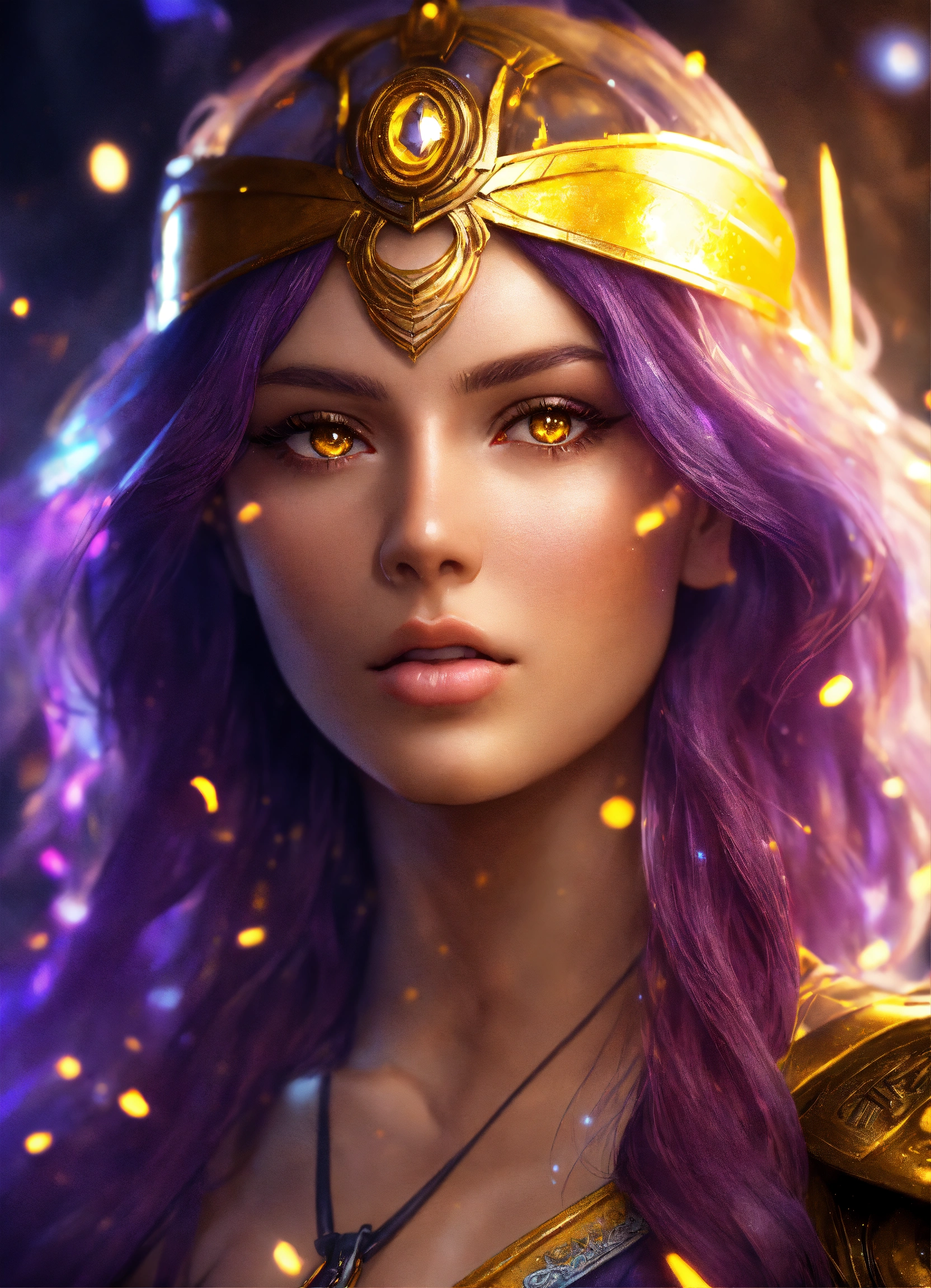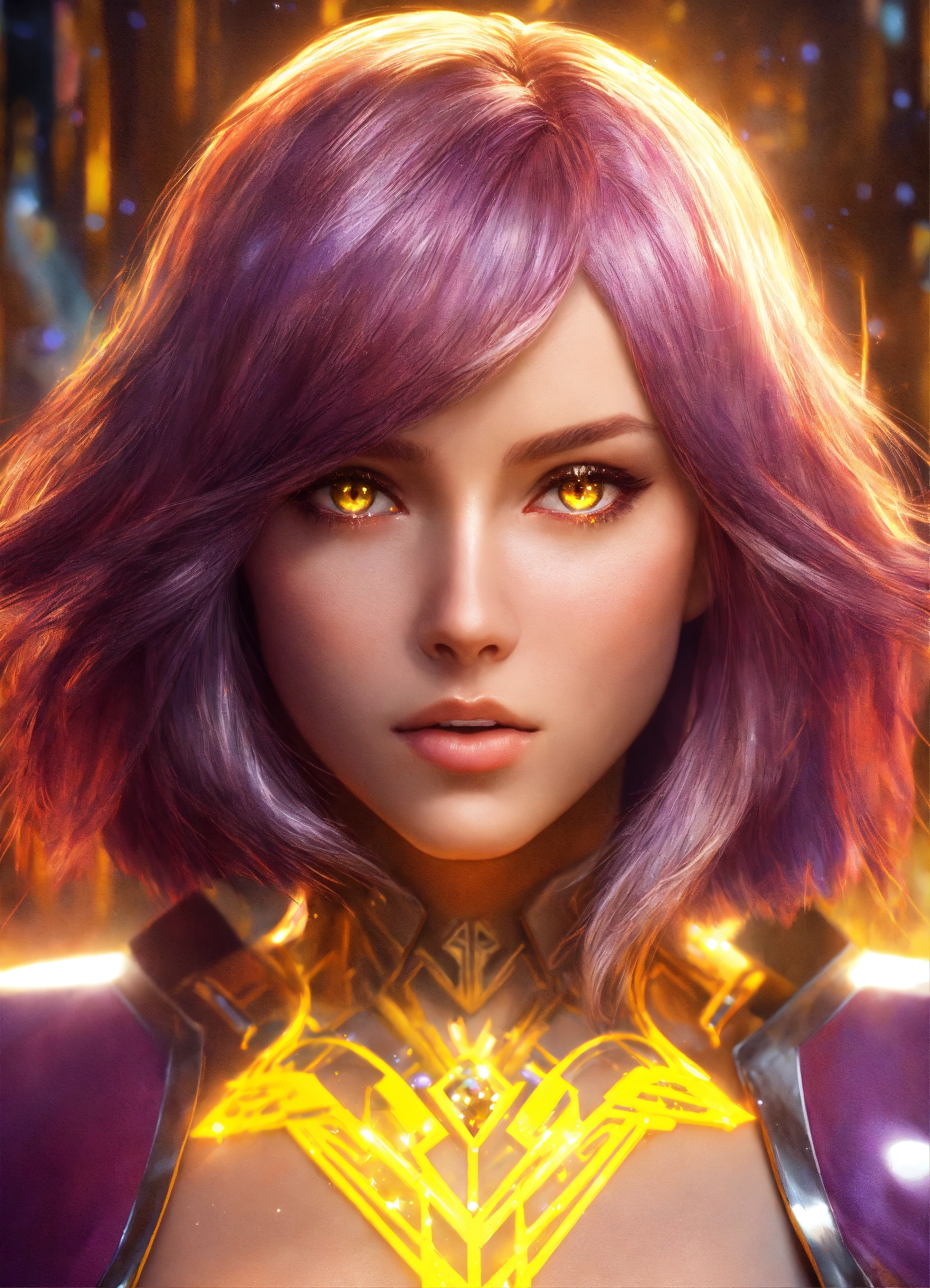 "magical wisdom goddess", energy bolts, sparkles, lights, beautiful white woman, brown and purple hair, bob cut, huge glowing yellow eyes, flowing hair, head and shoulders portrait, finely drawn eyes, 8k resolution concept art portrait dynamic lighting hyperdetailed intricately detailed splash art trending on artstation unreal engine 5 volumetric lighting