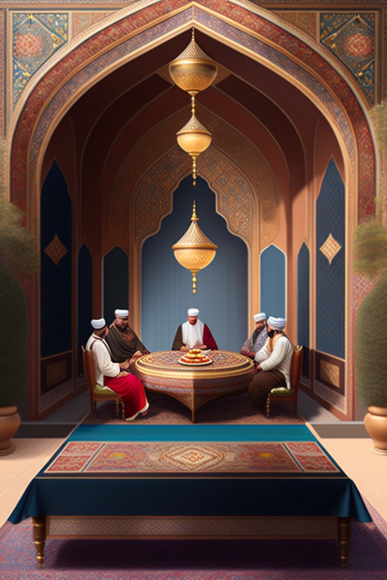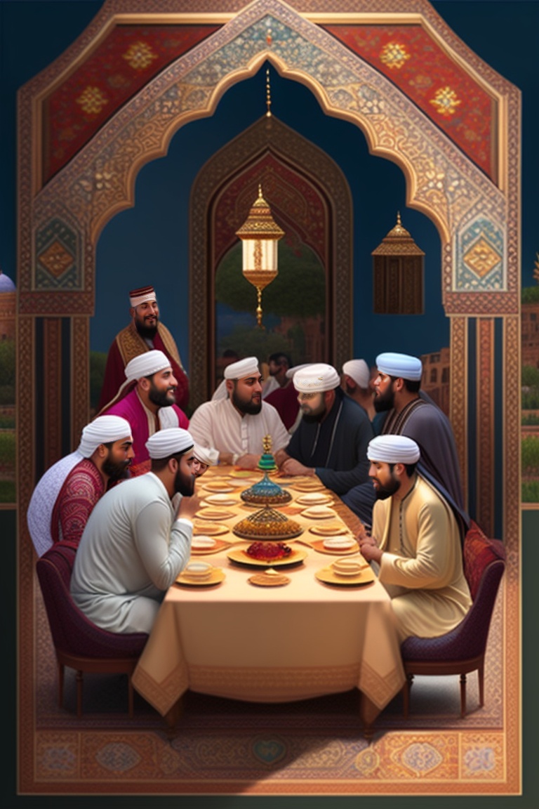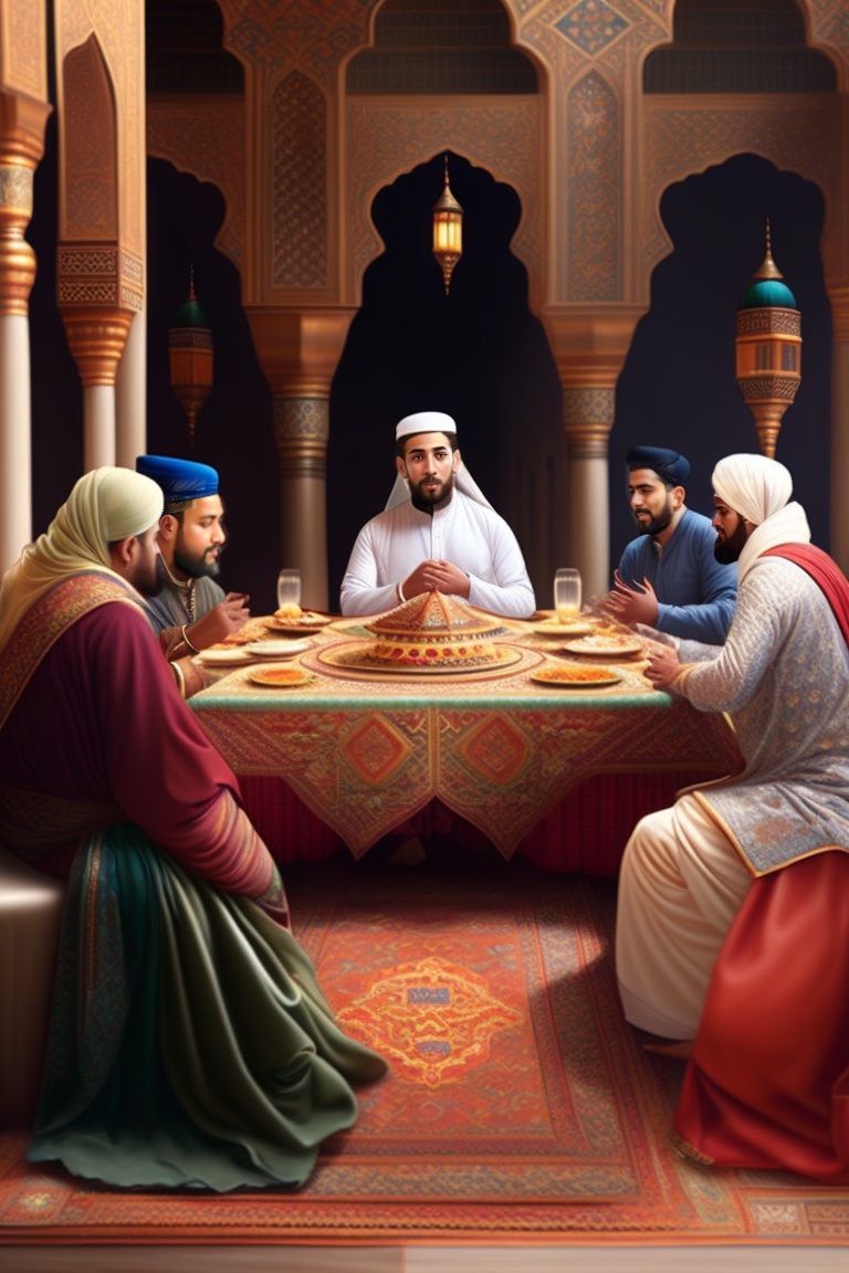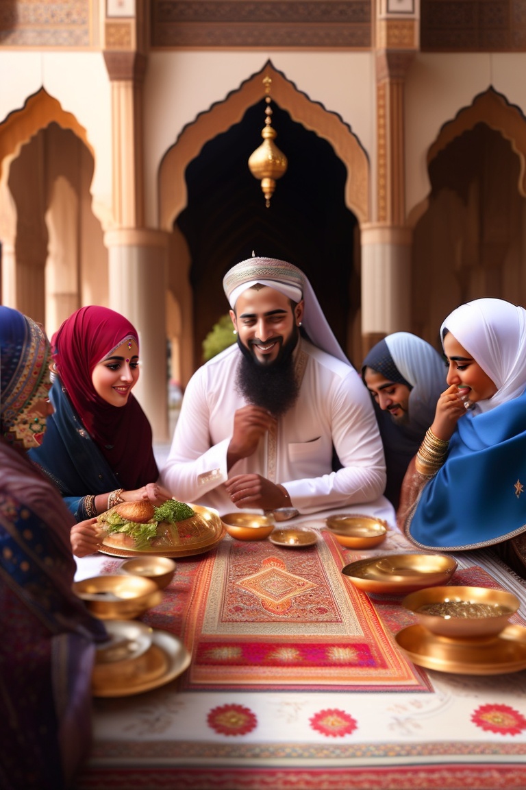 An hyper realistic muslim human image capturing an enchanting courtyard decorated with ornate carpets and low, cushioned seating. at the center of the scene, a long, lavishly adorned table stretches out, covered in a sumptuous feast. the table overflows with an array of mouthwatering dishes, symbolizing abundance and generosity. surrounding the table, a diverse group of people, from different age groups and backgrounds, gather together, engaged in lively conversations and laughter. their gestures and expressions exude warmth and inclusivity, emphasizing the act of sharing and community bonding during qurbani eid