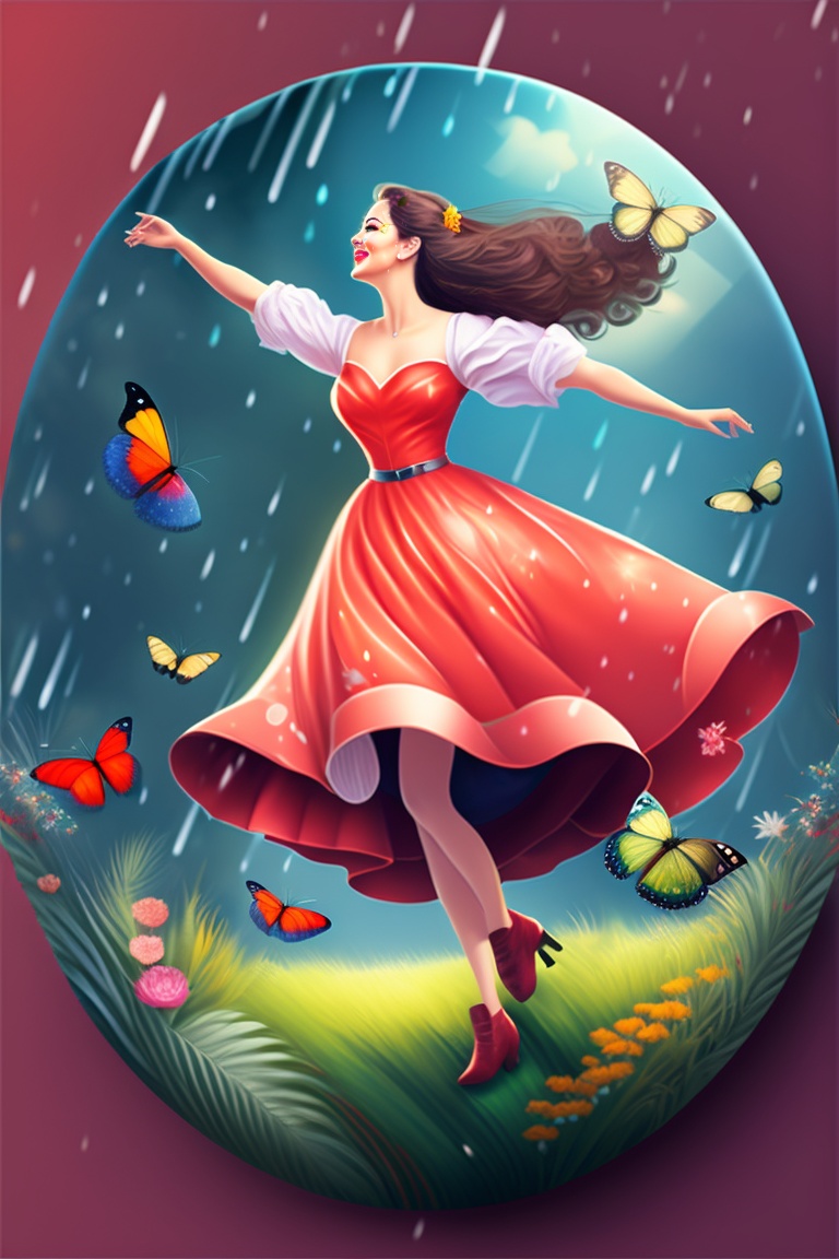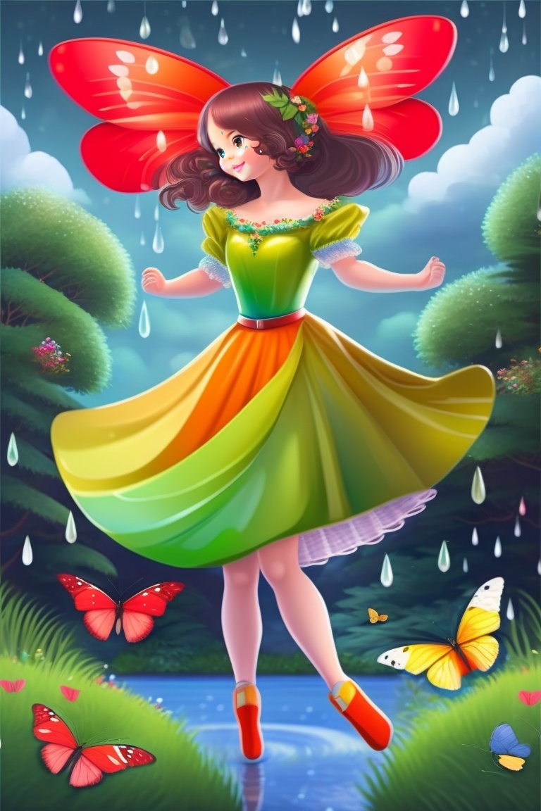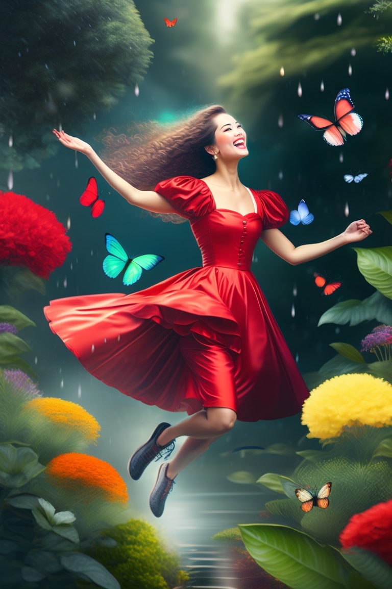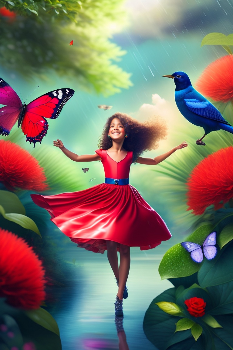 A girl happily dancing in rain wearing red dress, green garden, blue sky, birds in the sky, trees, butterflies, colourful flowers around her