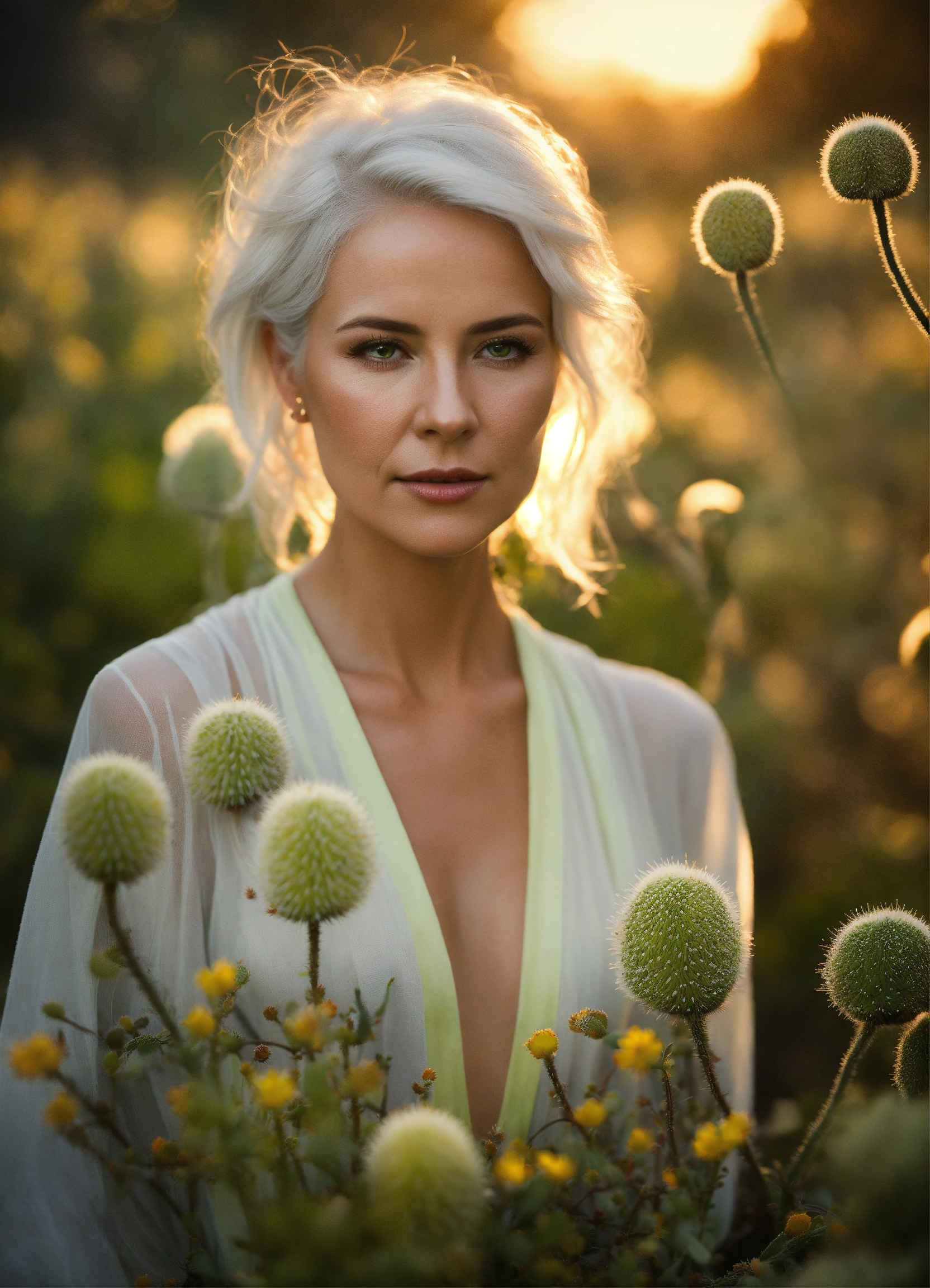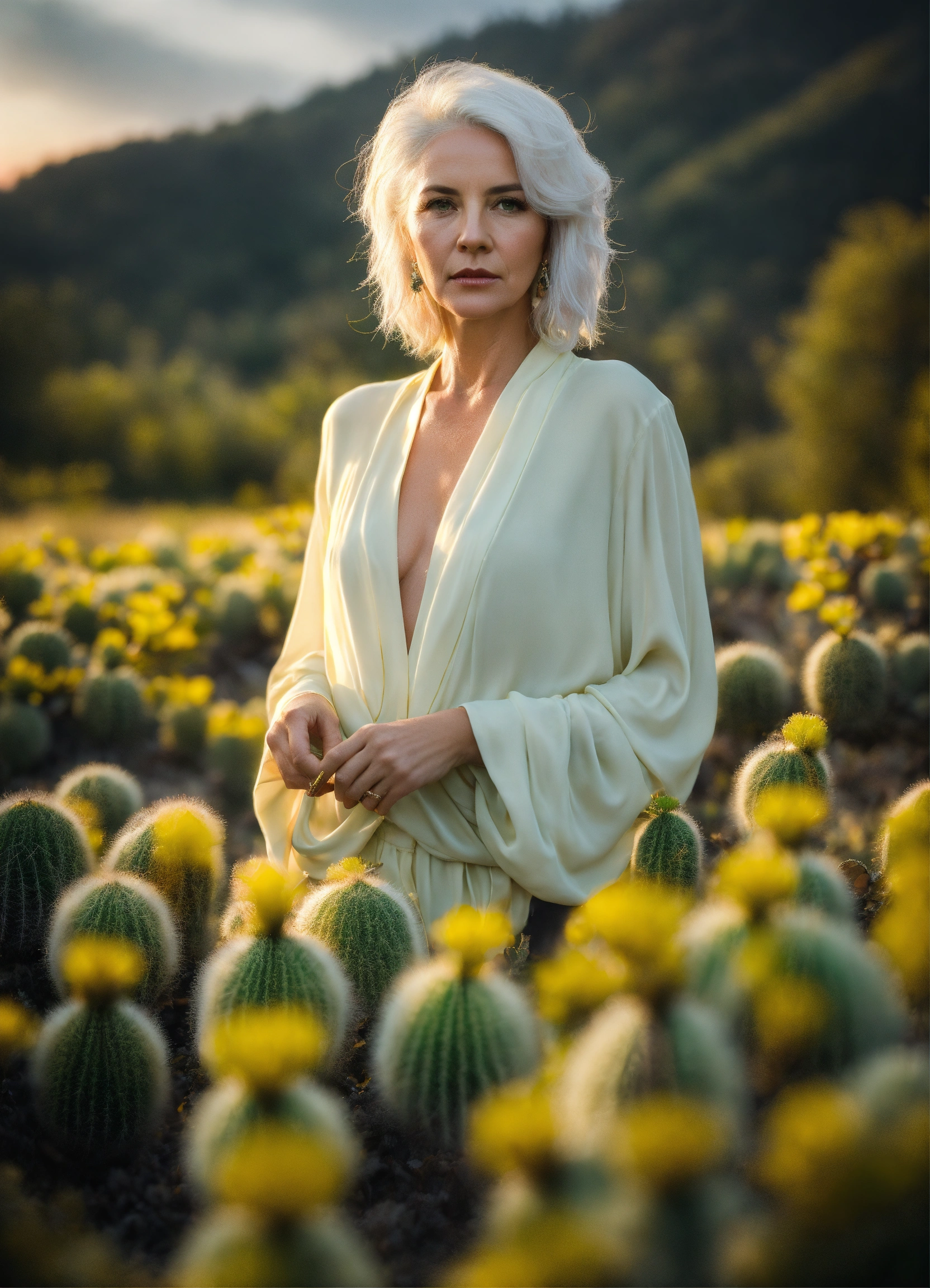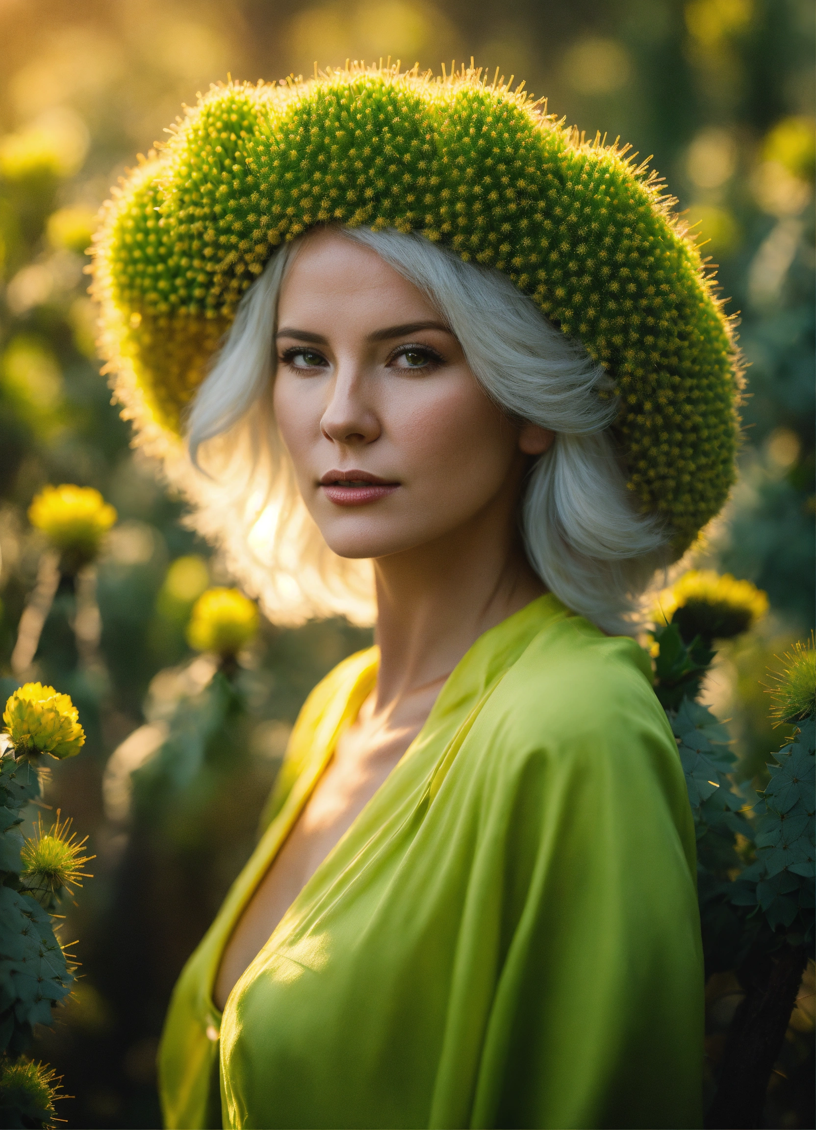 A real perfect full portrait fashion photography, a beautiful anatomy of a female, 52 year old, white hair like a wise woman in the shape of green yellow silk in the middle of a forrest, mammillaria, mammillary anatomy, front attractive, masterpiece elegant, third golden ratio photography, dramatic light pale sunrise cinematic lighting ultra detailed sharp focus, hearthstone, dramatic night light, pale sunrise, cinematic lighting, 8k, 16k uhd. a big hatt with flowers and leaves