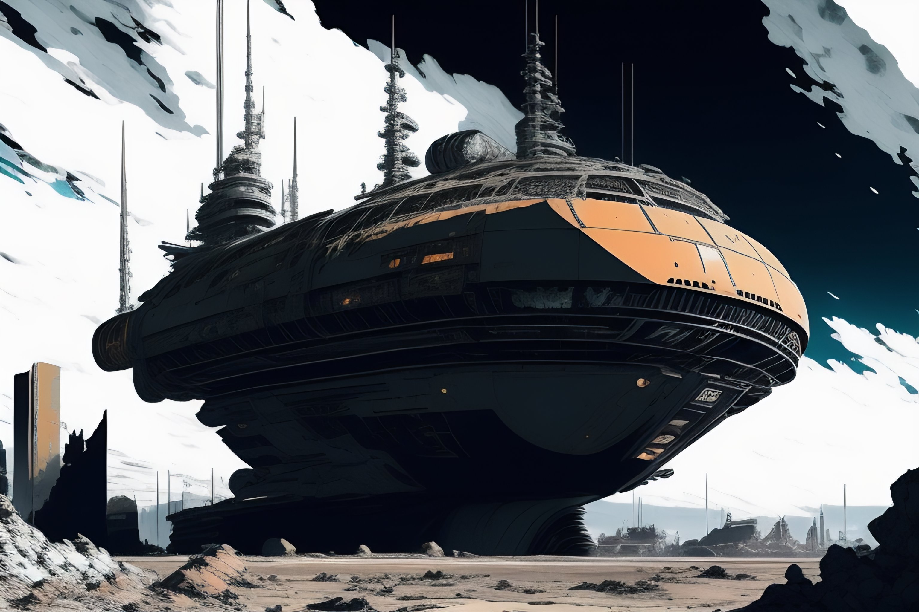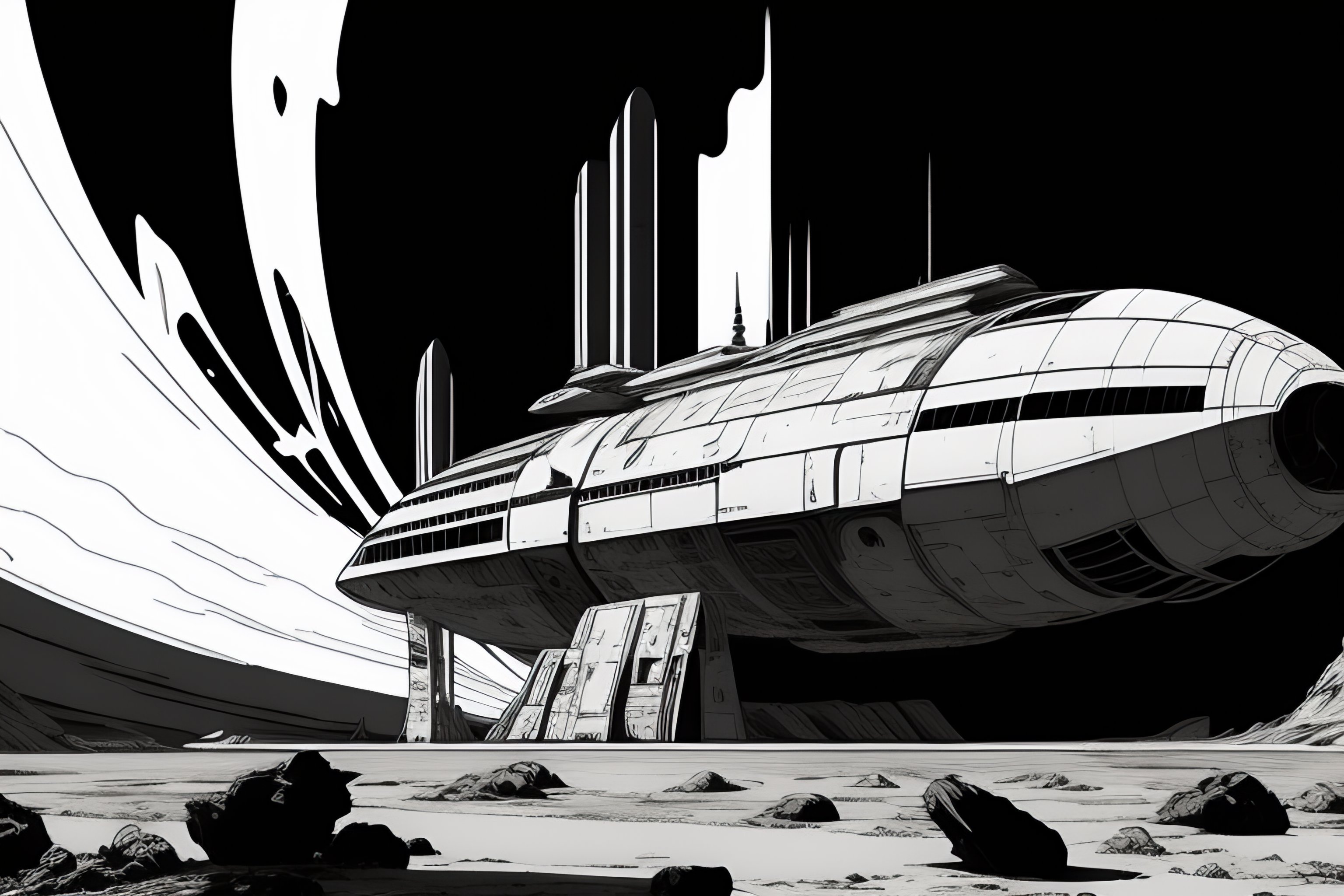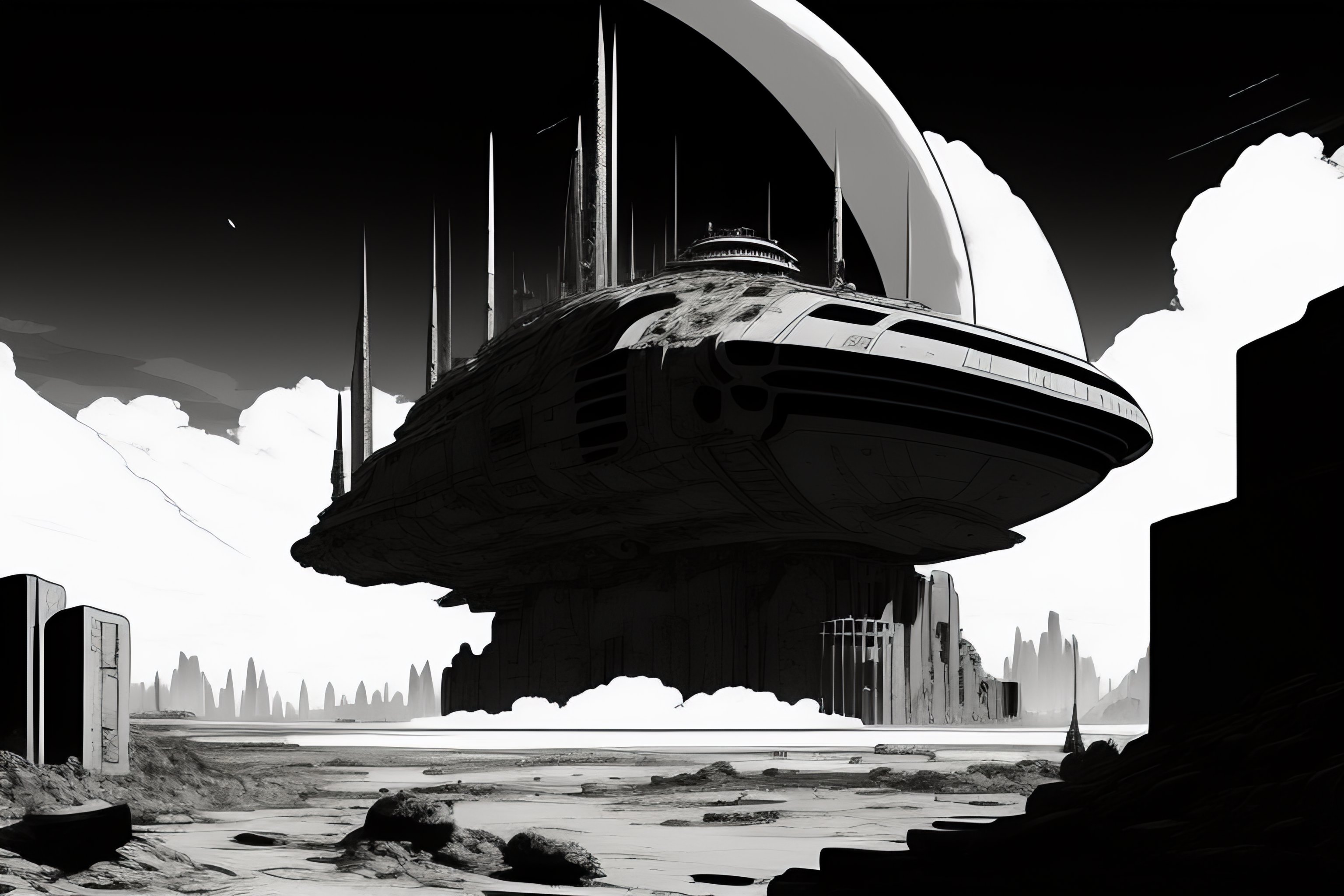 A manga vignette of an abandoned and destroyed giant spaceship, gigantic spaceship, colors black and white, flat colors, manga style, background of a destroyed city, black and white, insanely detailed, cinematic, epic composition, art inspired by katsuhiro otomo, line art, 8k