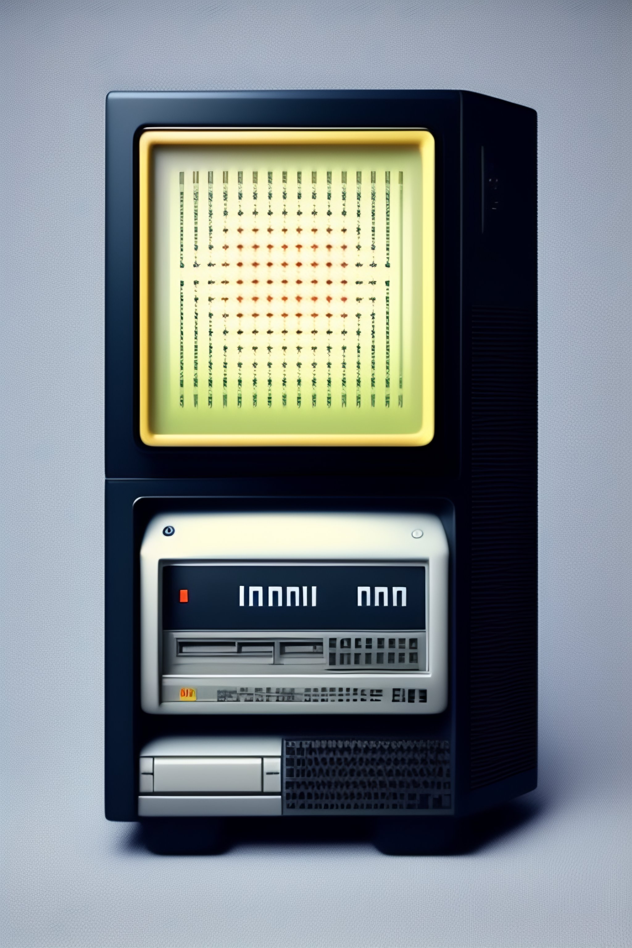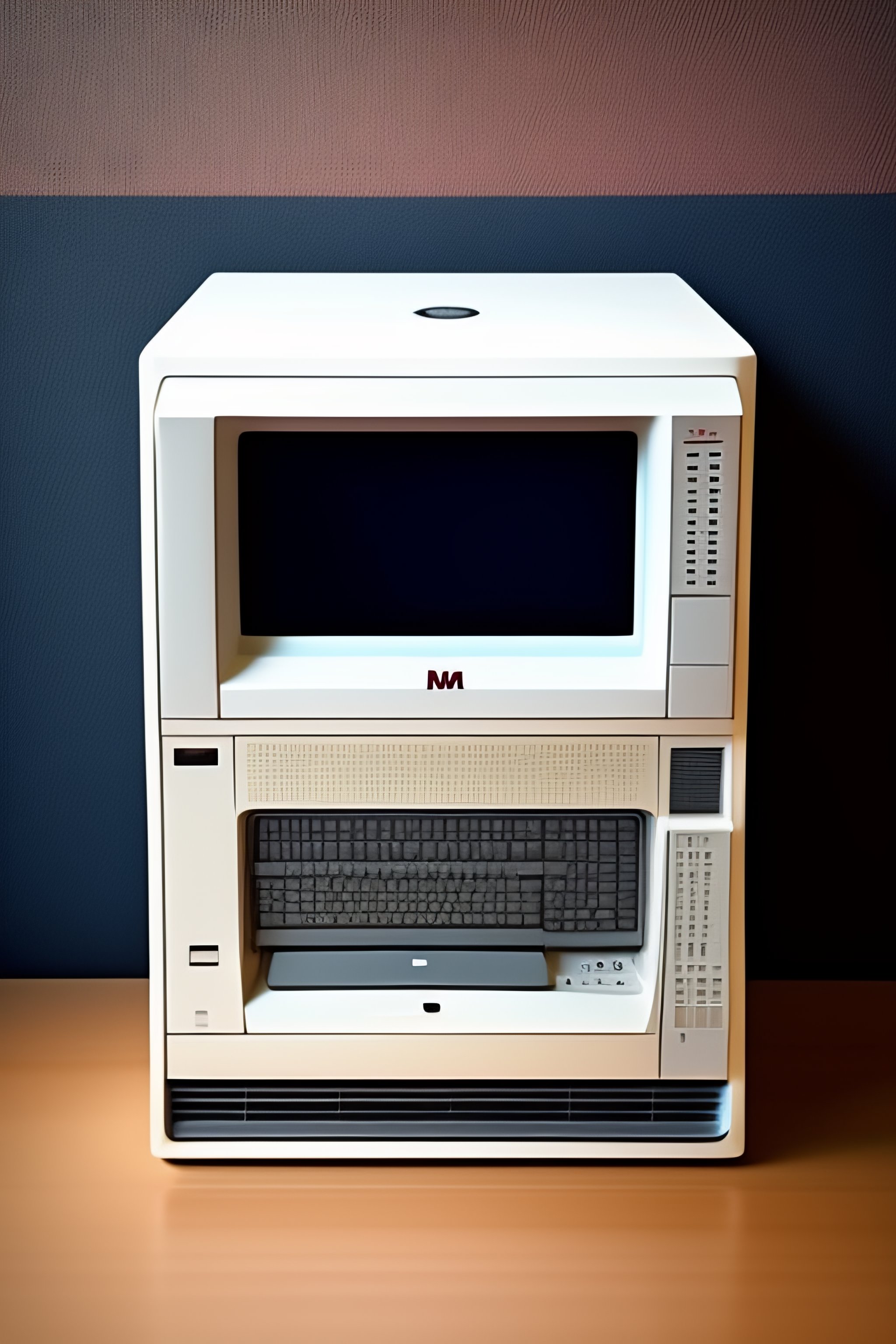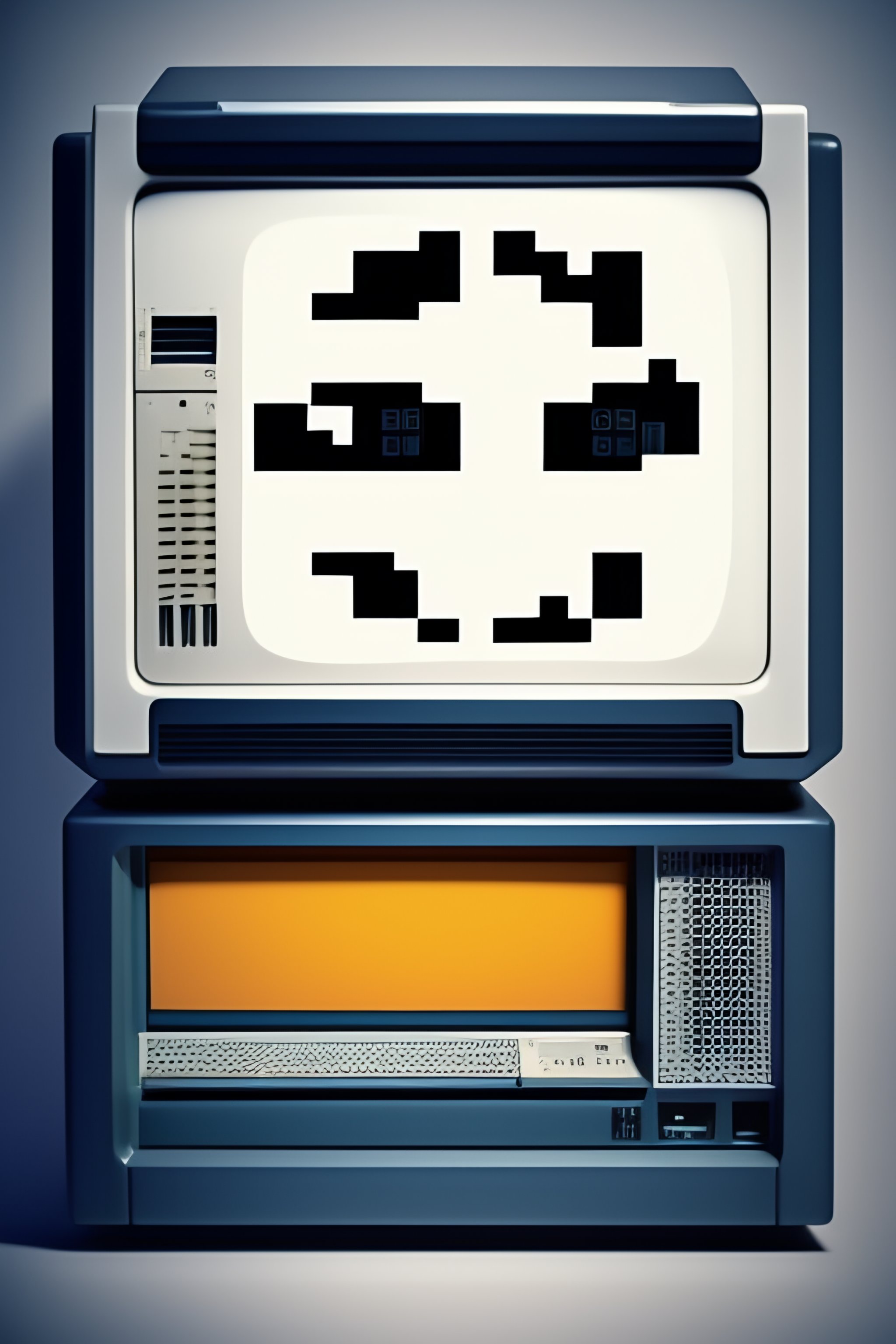 Old computer ibm macintosh blank screen with pixelated smiling face ascii art