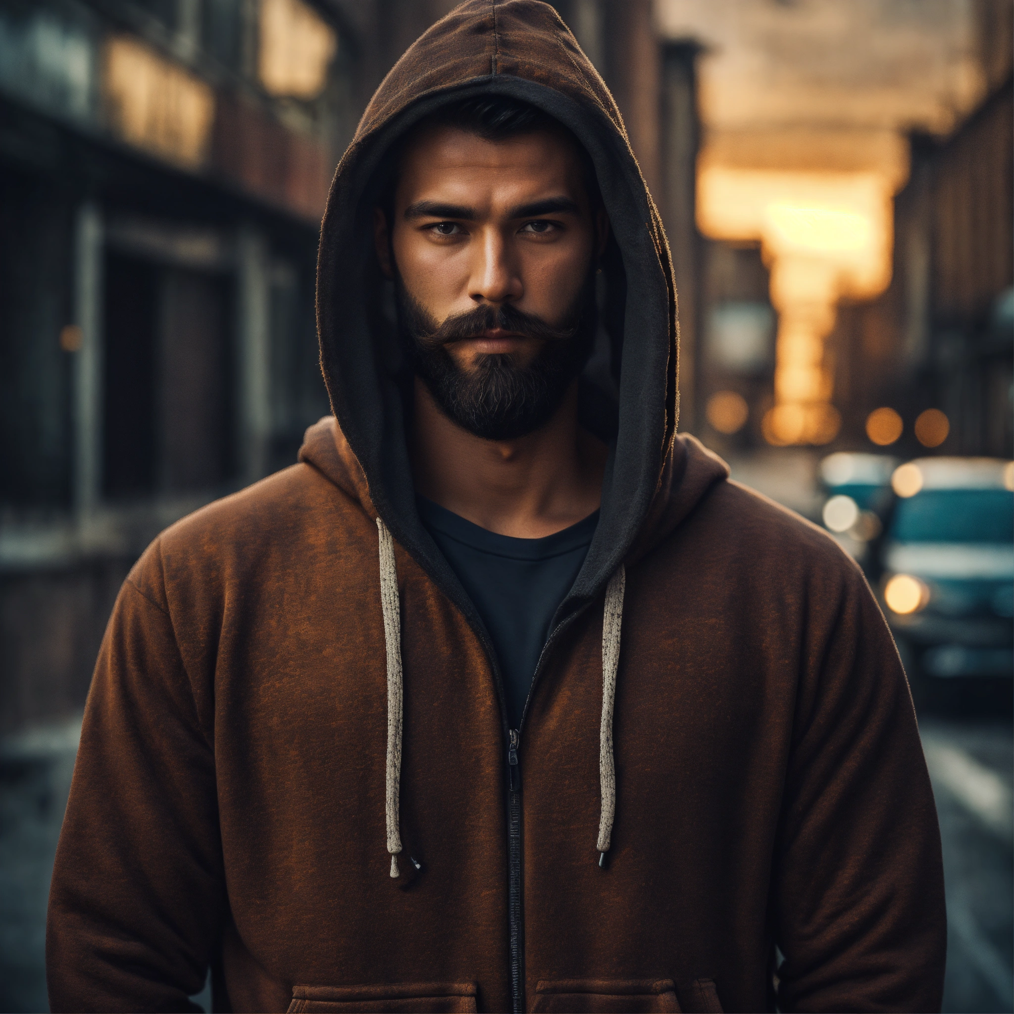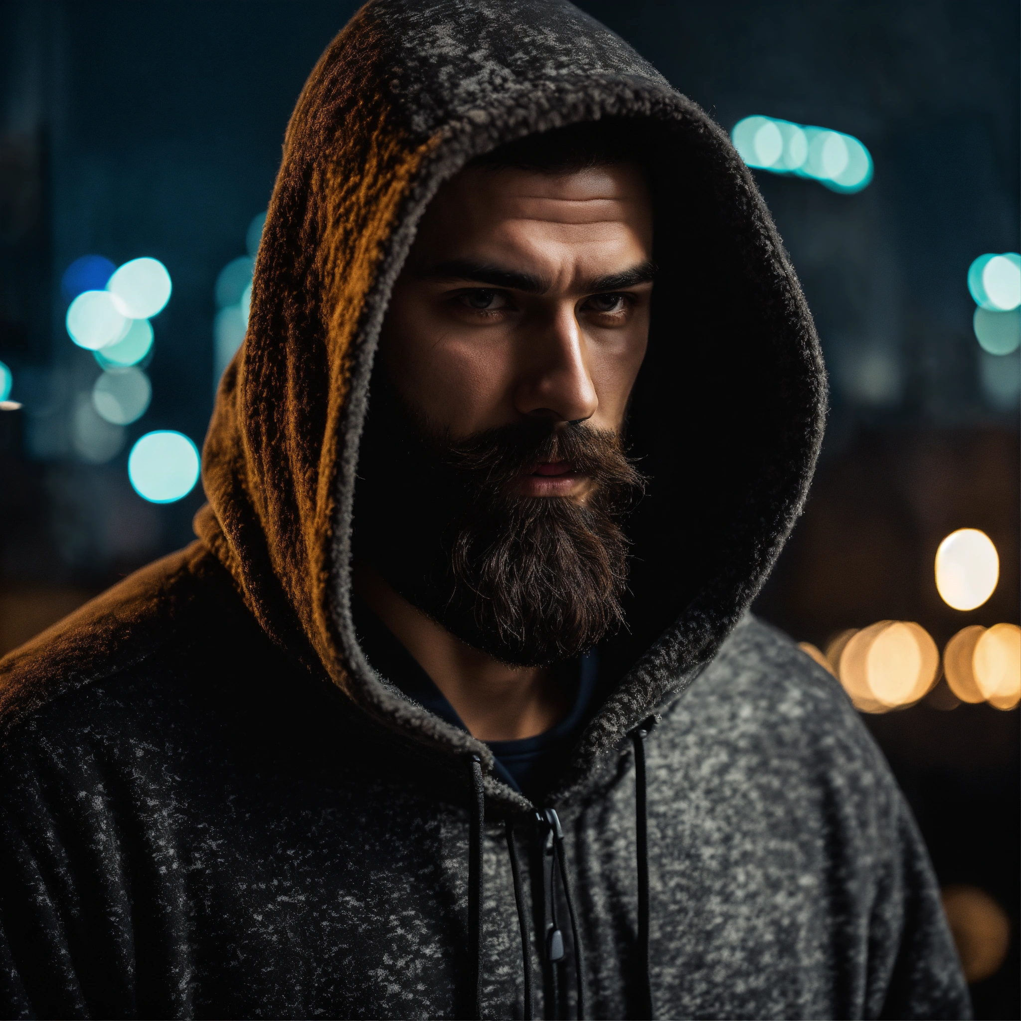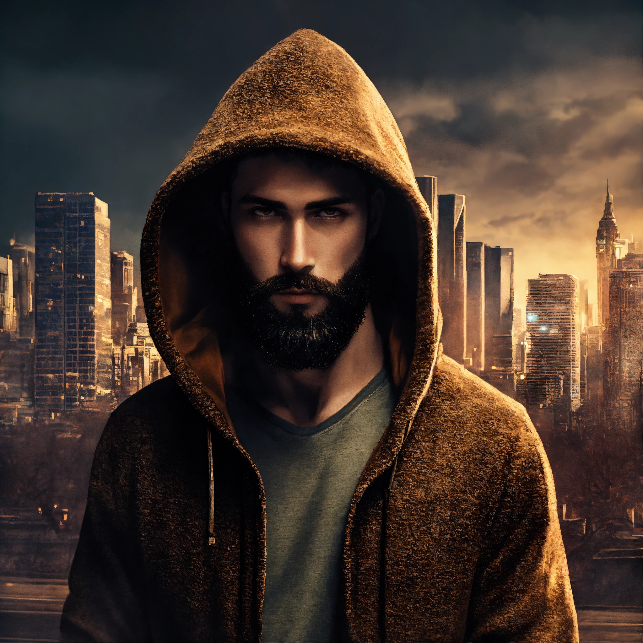 Tall male figure with a black lumberjack beard and brown eyes wearing a hoodie with the hood up. background is a faded city. portrait, fantasy, cinematic