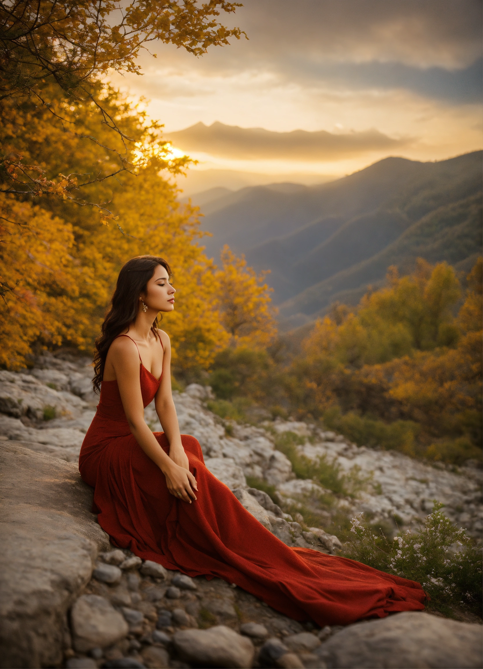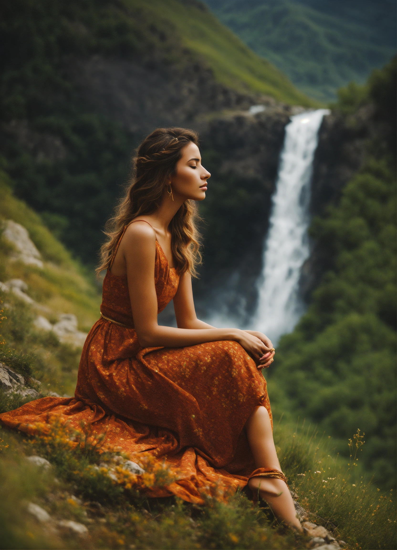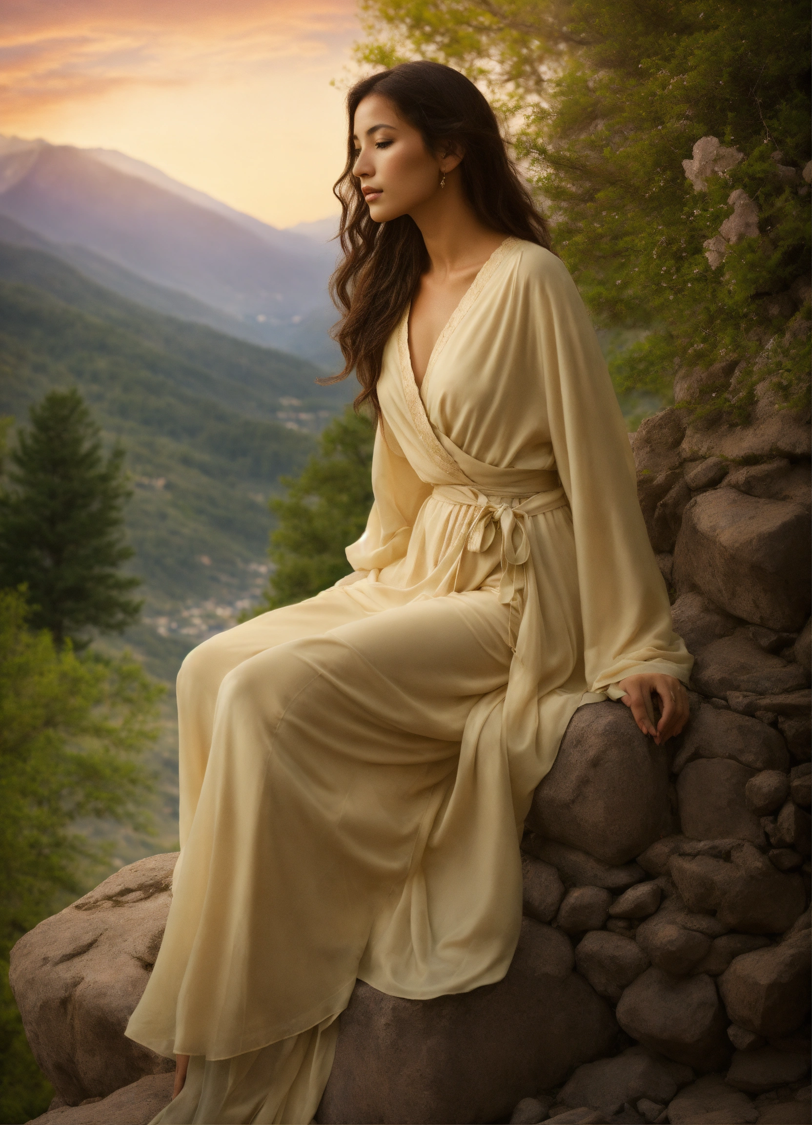 Foucus serene beautiful woman in a soothing setting of a serene mountain