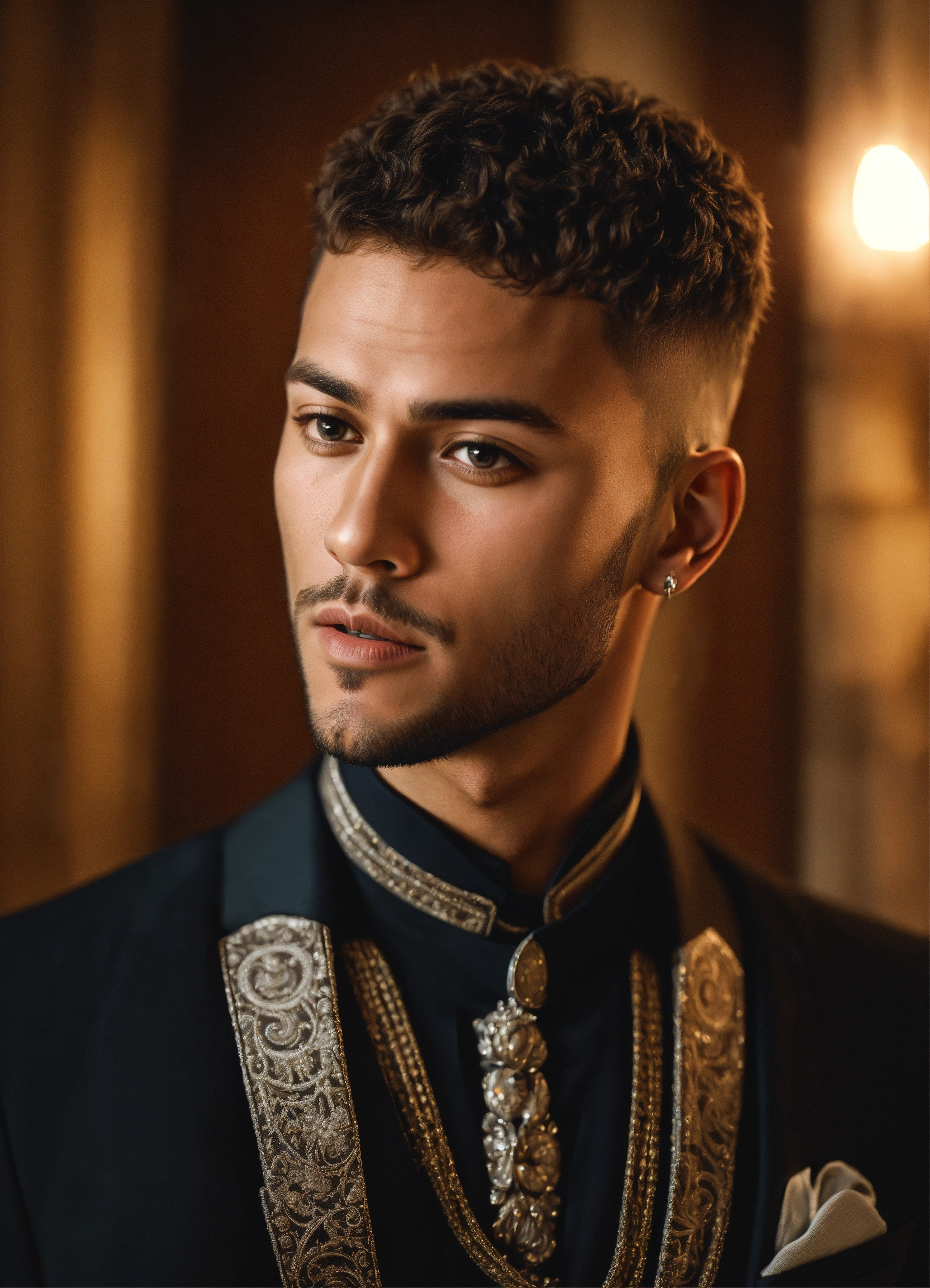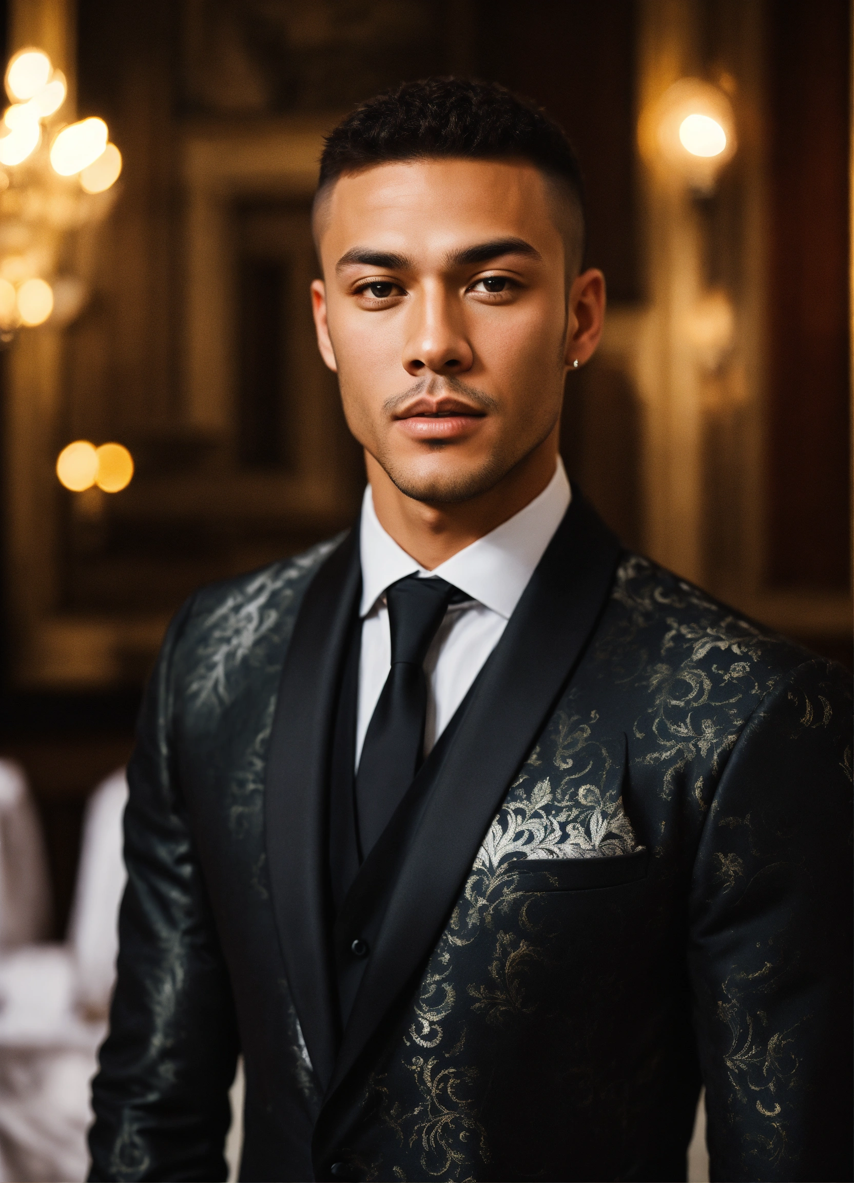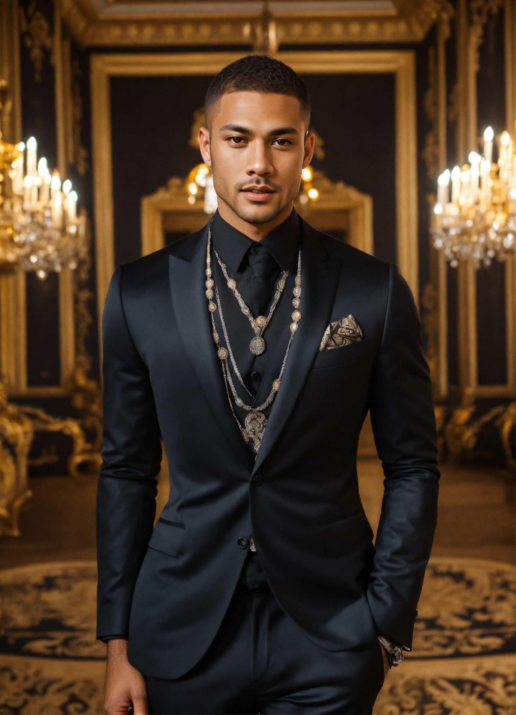 Handsome hot mulatto man with light brown eyes, with short blond straight hair, broad-shouldered tall in black suit with silver patterns in the in the ball room palace