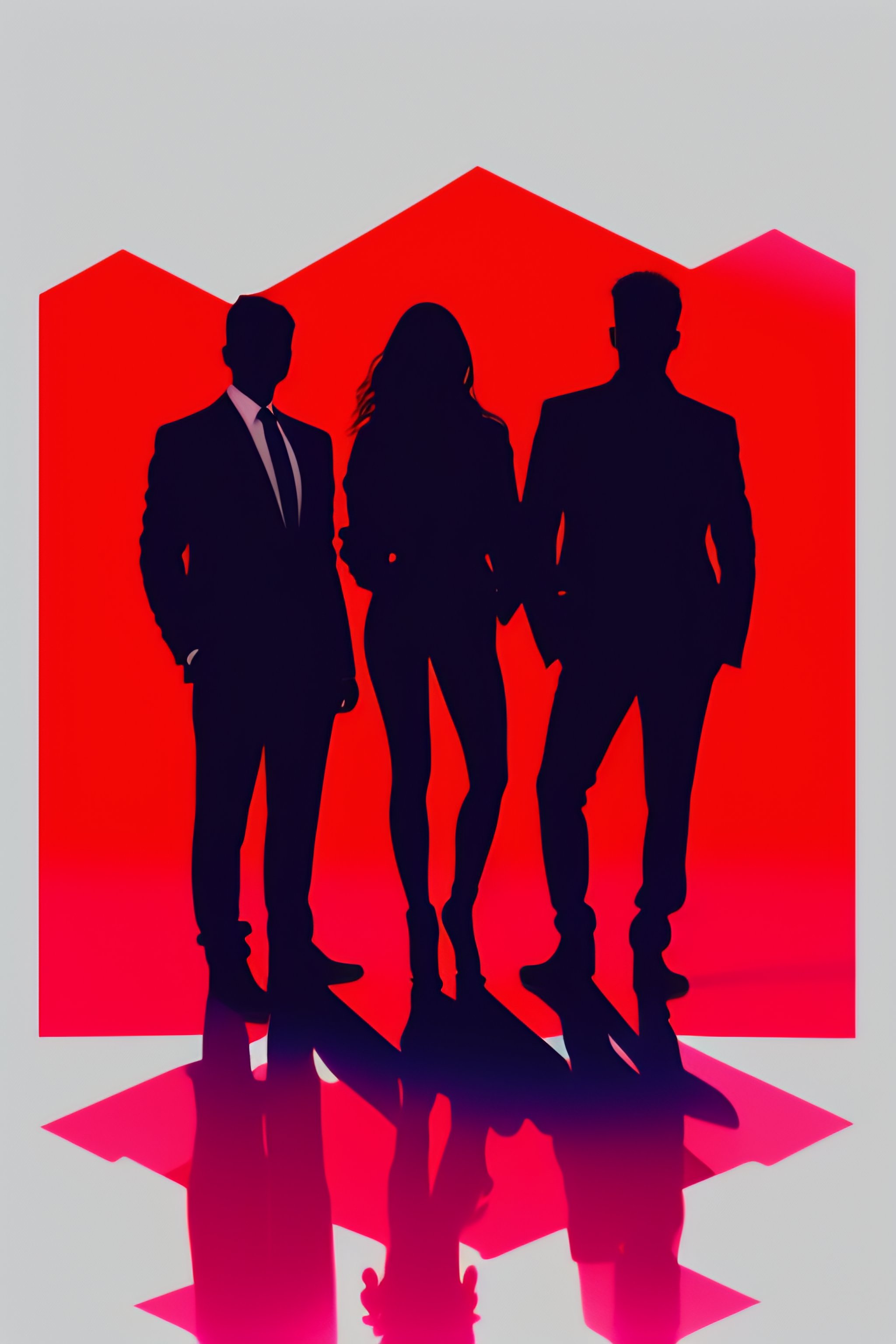 A silhouette of a band of four members standing together on stage with a bright red background
