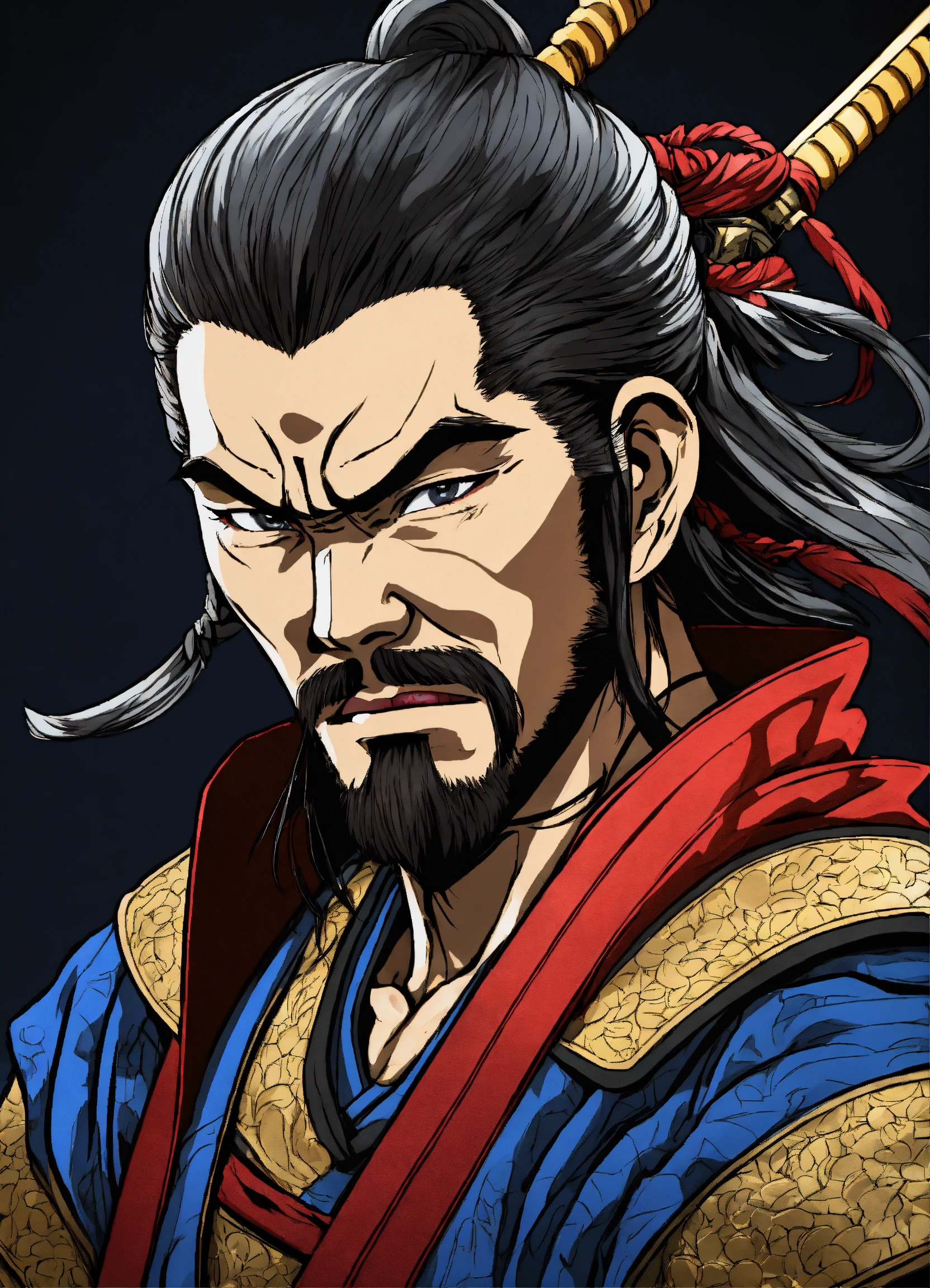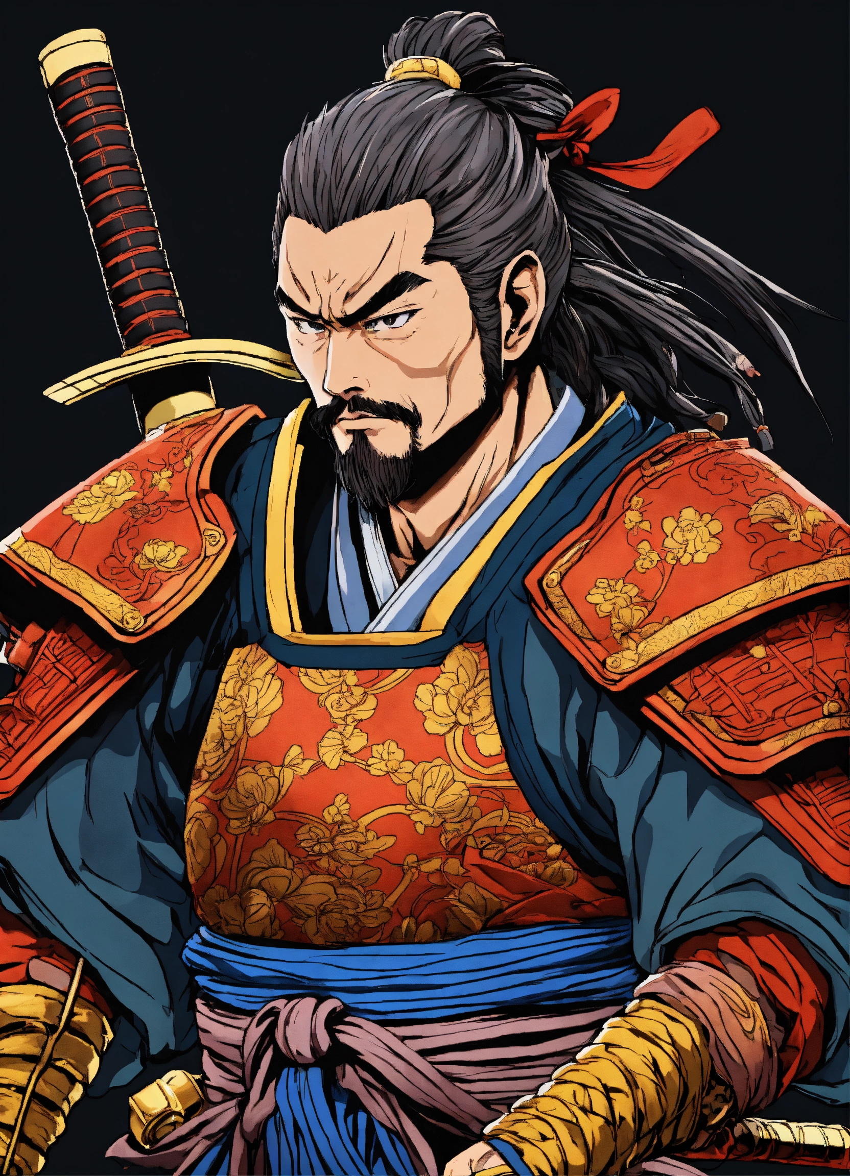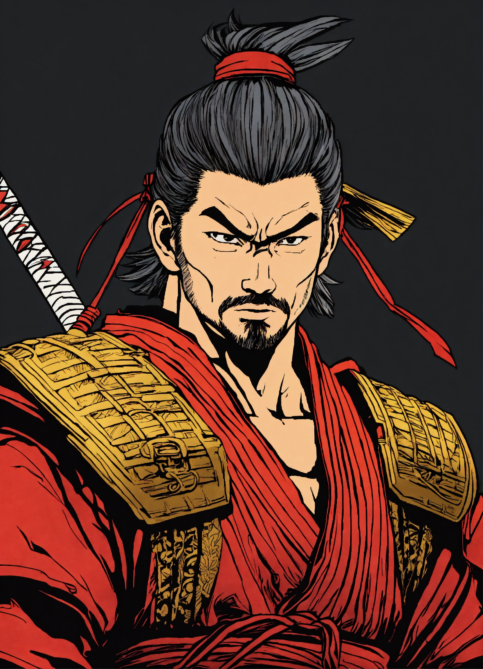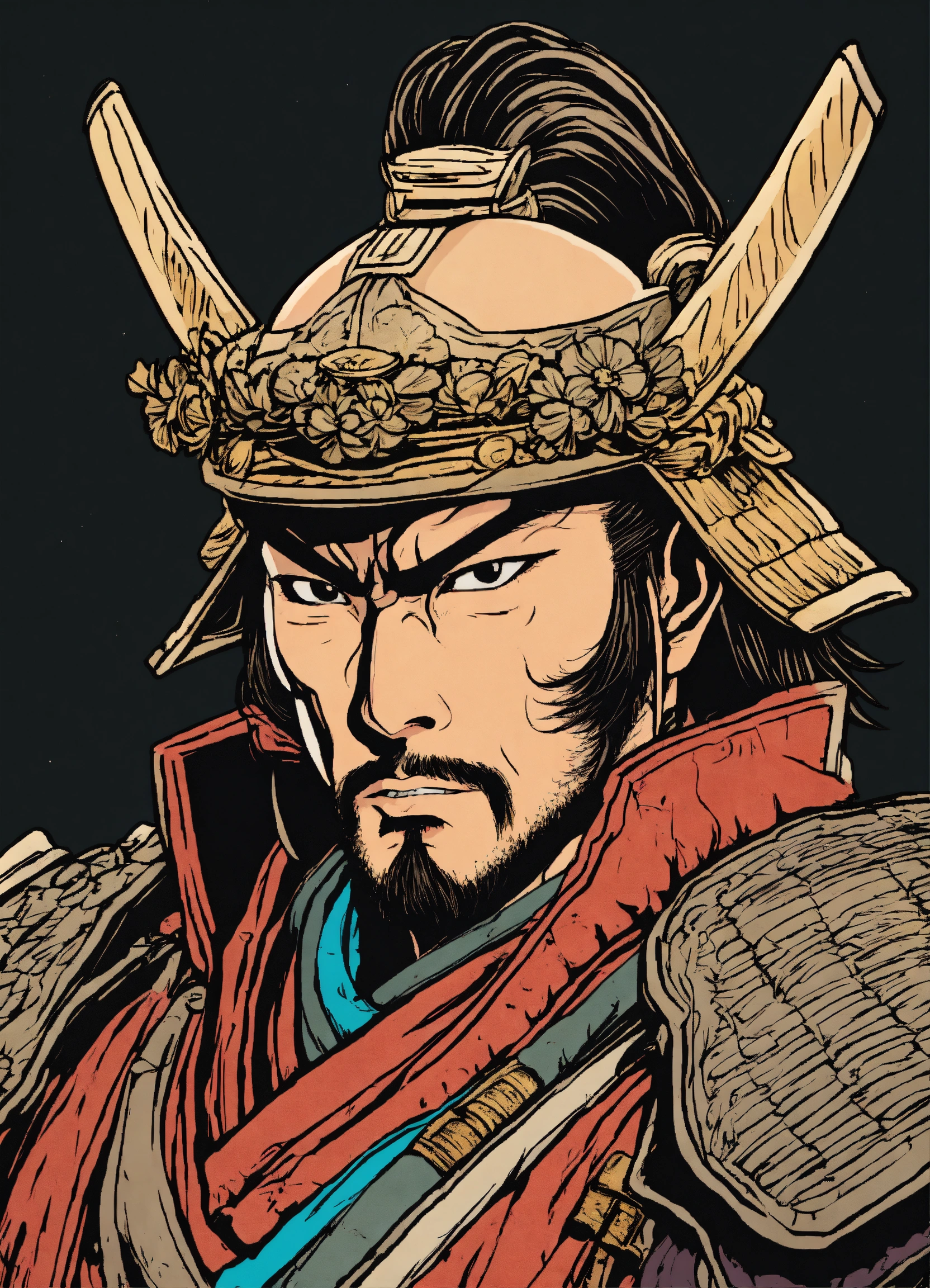 Generate a portrait of a samurai, 4k resolution, anime line art, in the style of akira toriyama, with clear lines, no shadows, on a pure black background suitable for a adult's coloring book, fully colored with stunning colors