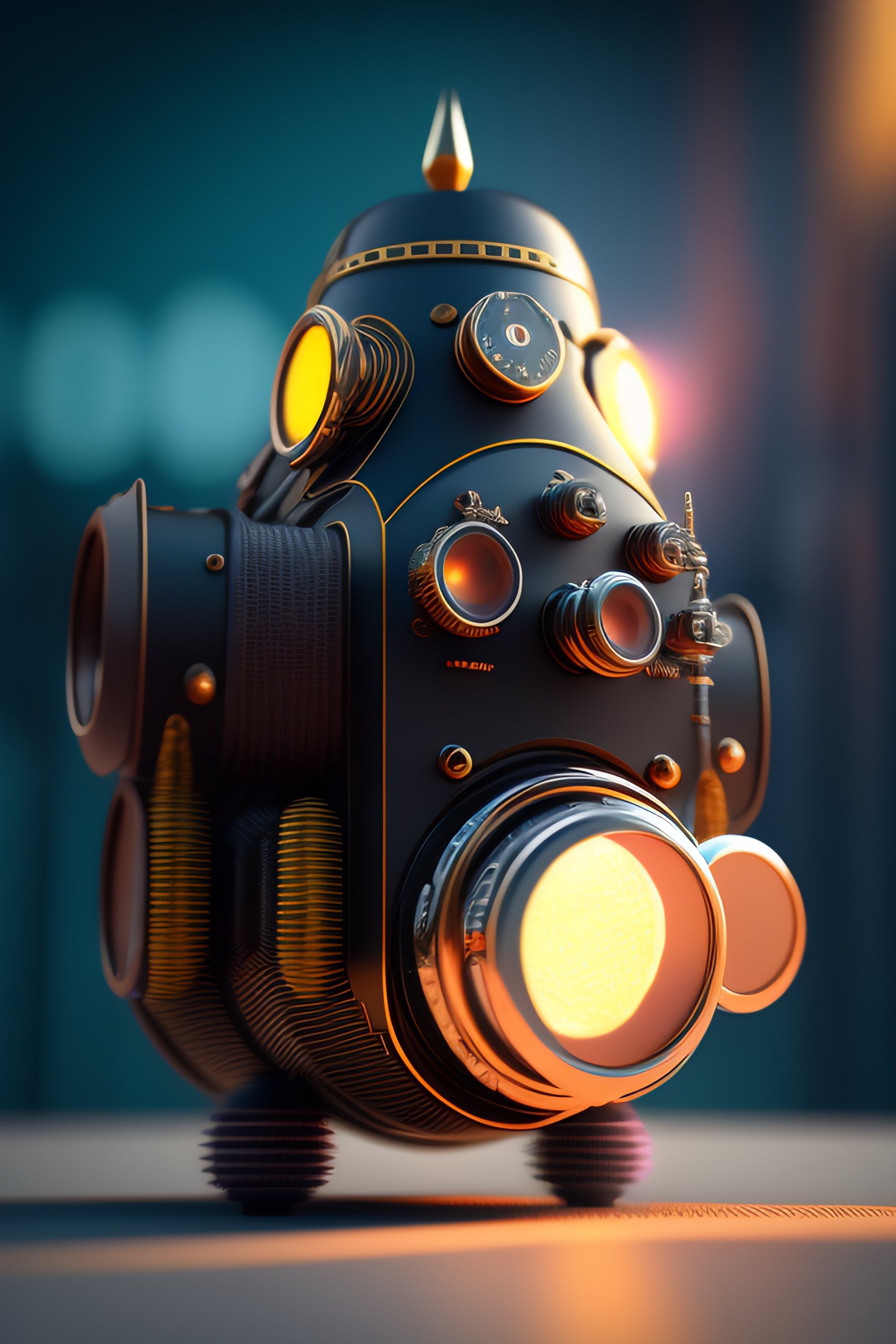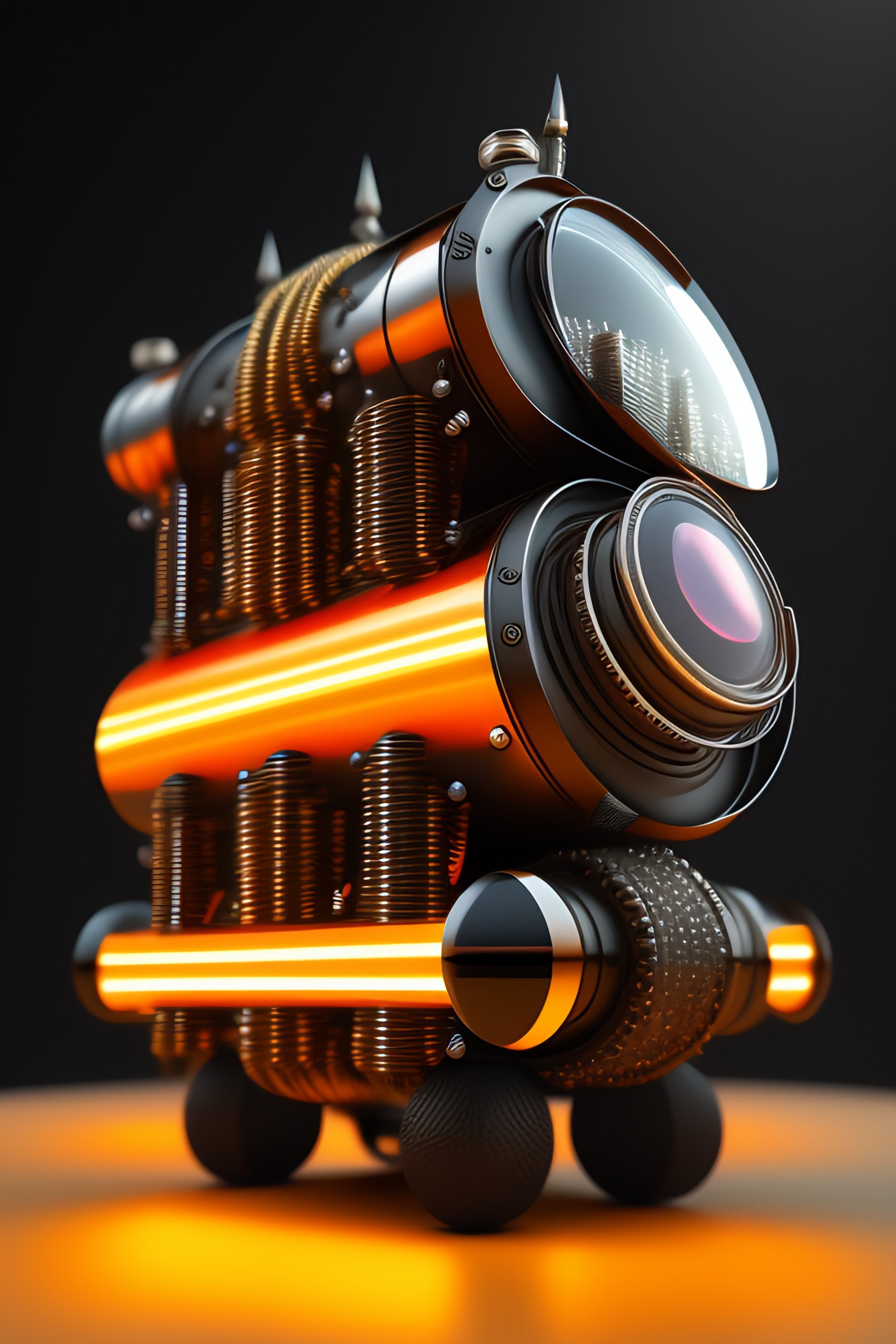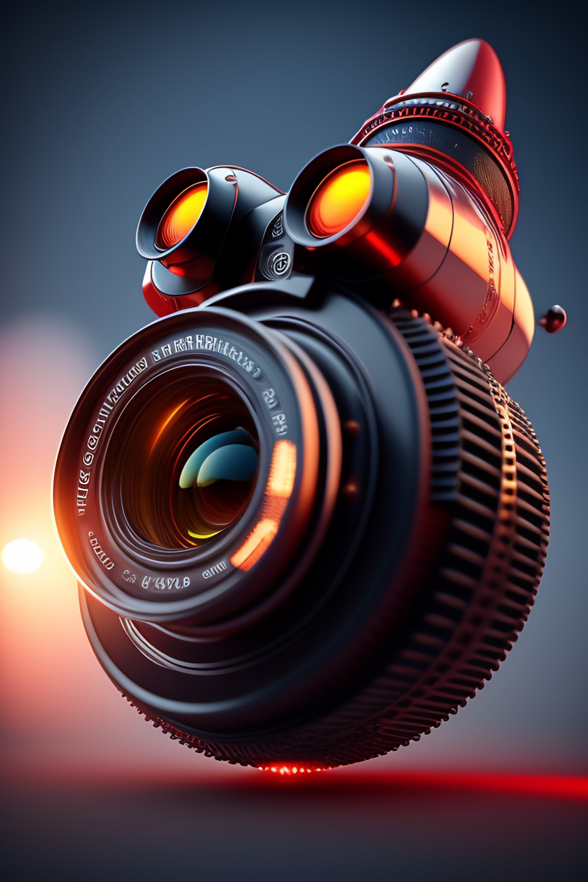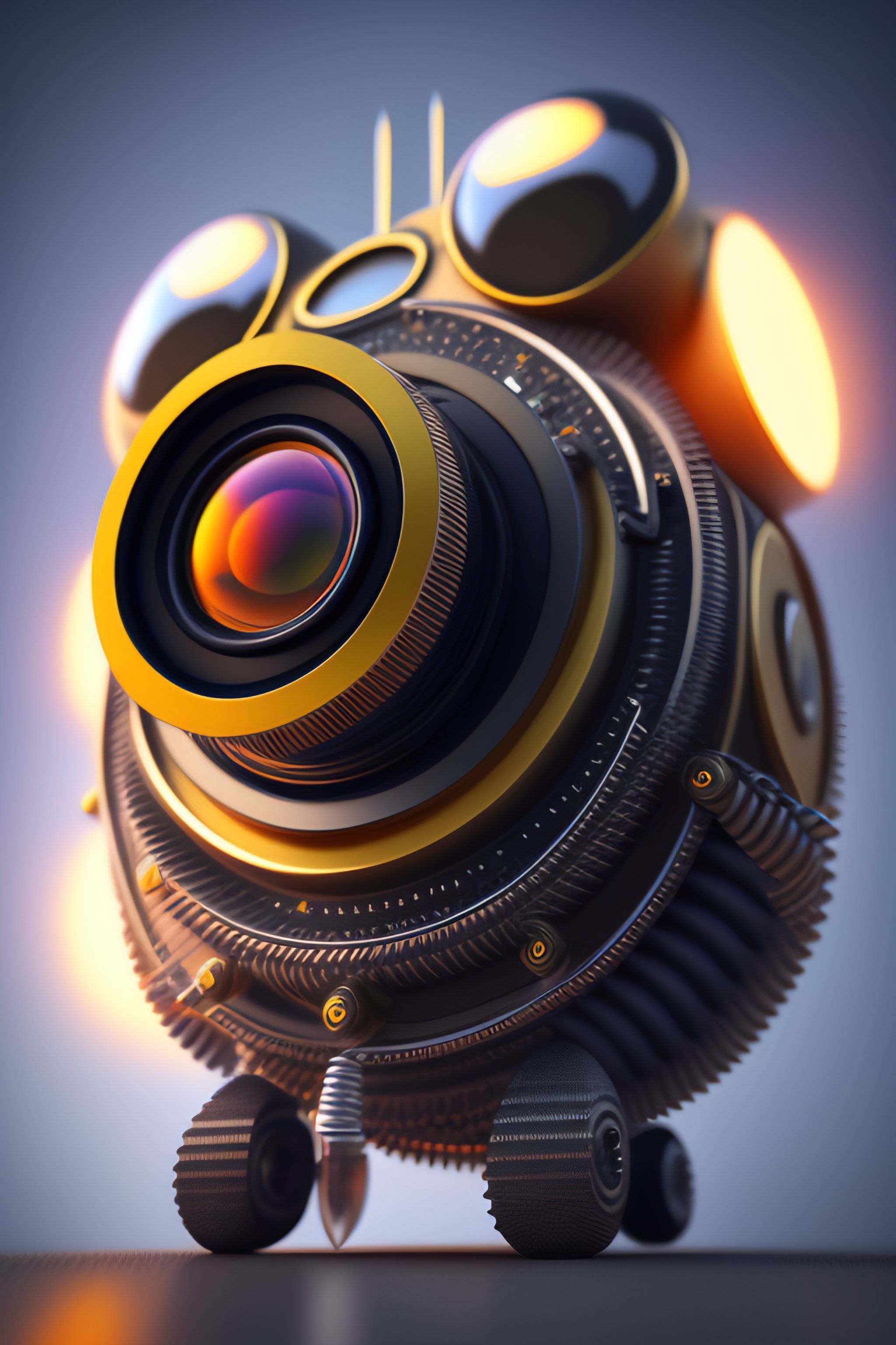 c4d render of a monster made out of camera lenses. lots of mechanical parts. aperture eyes