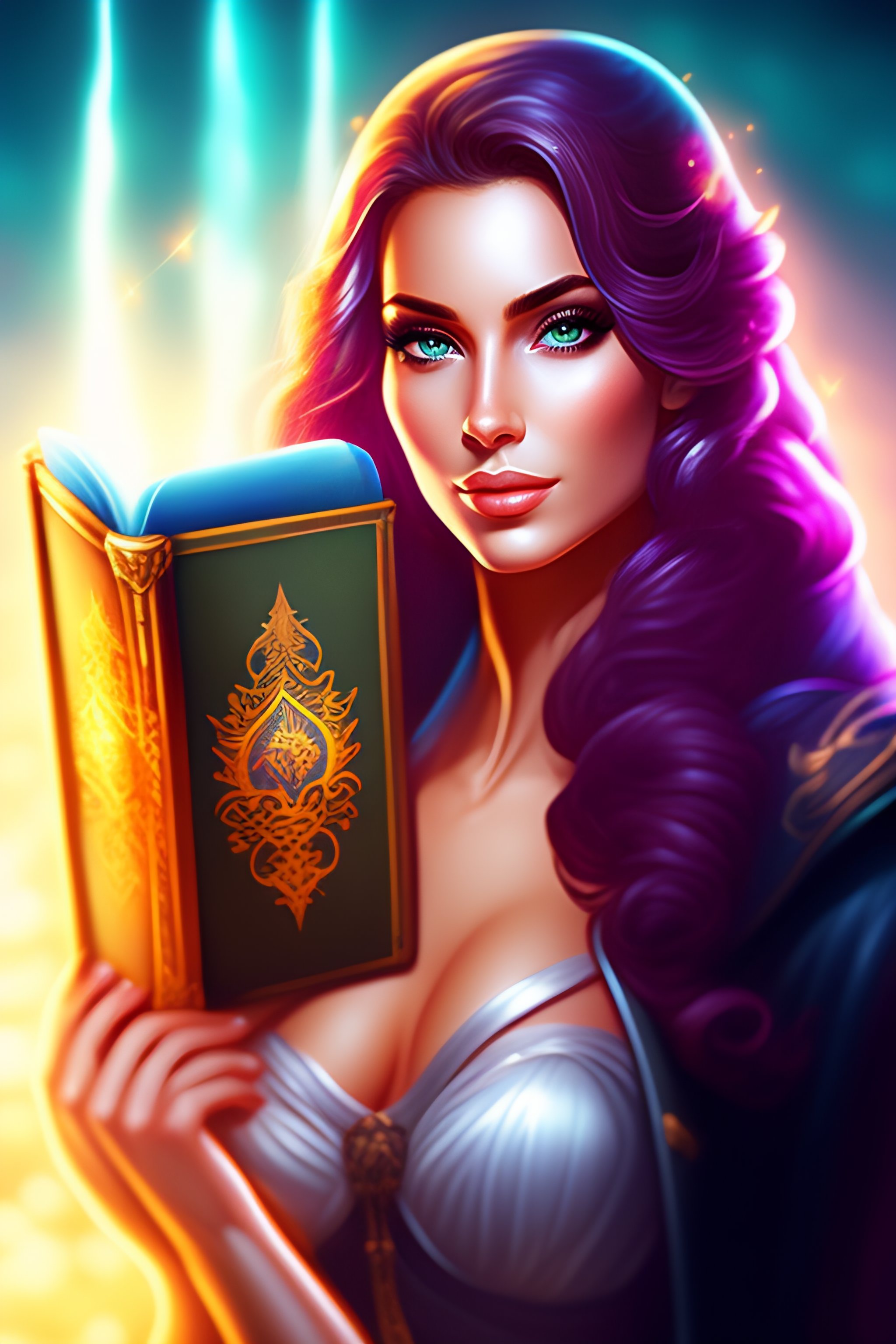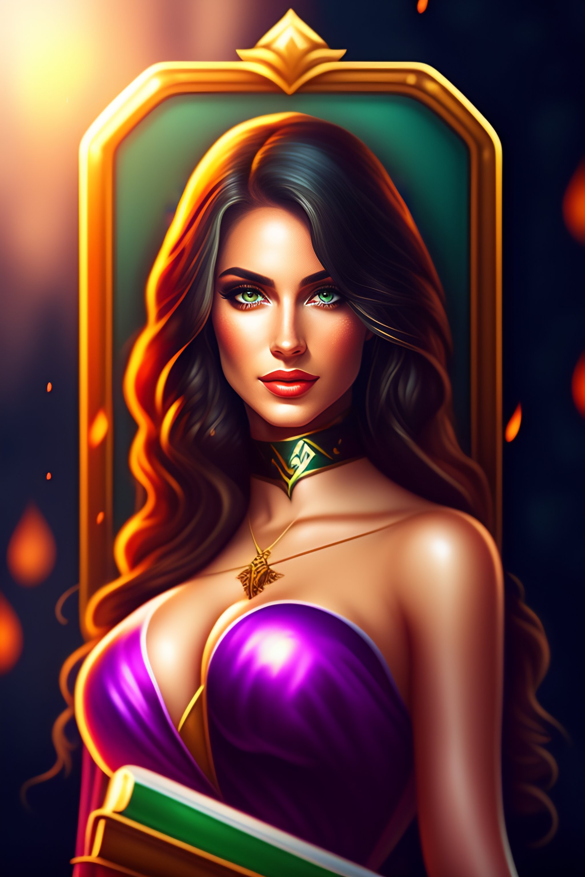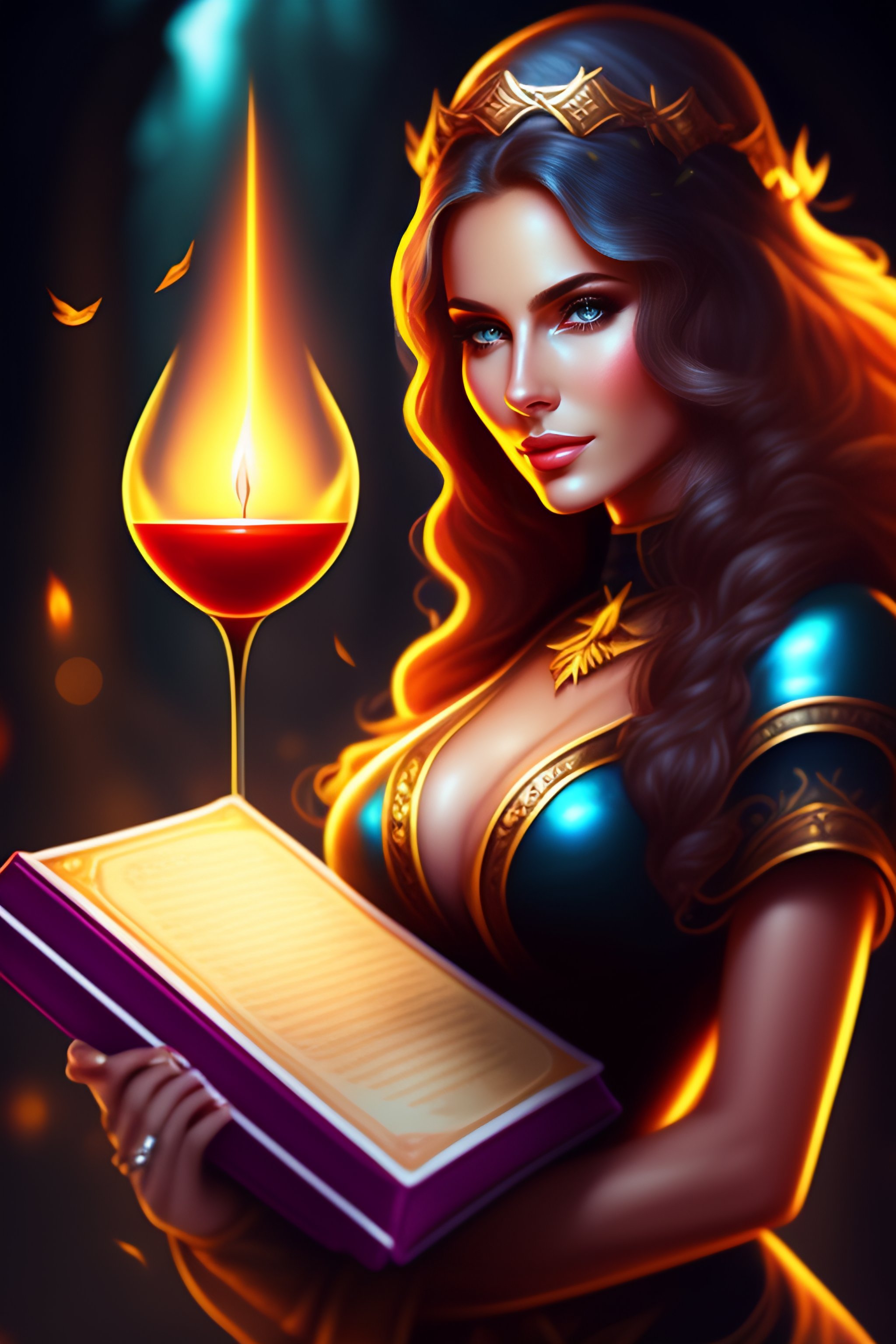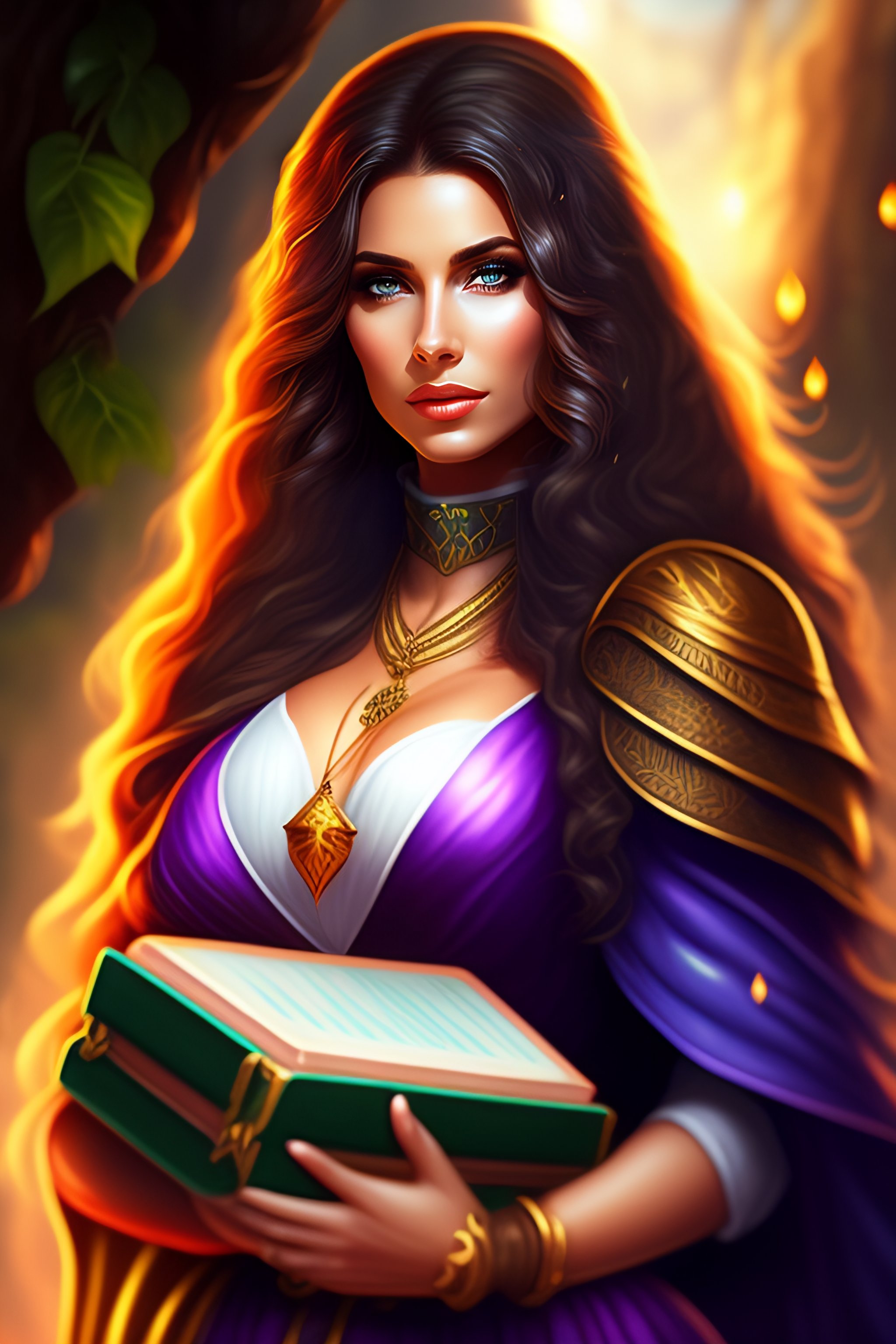 Game icon of sexy girl mage holding magic book with nature background