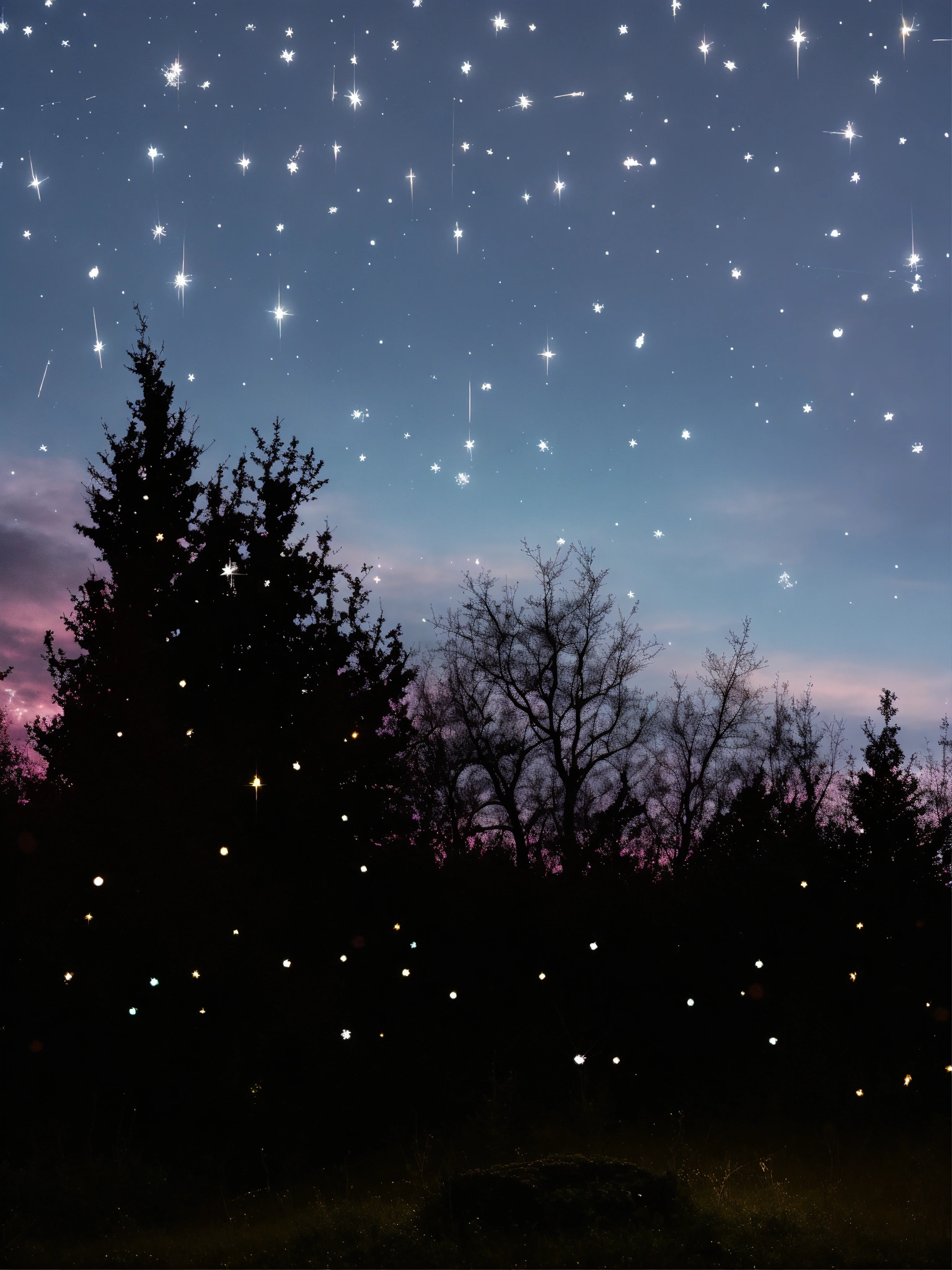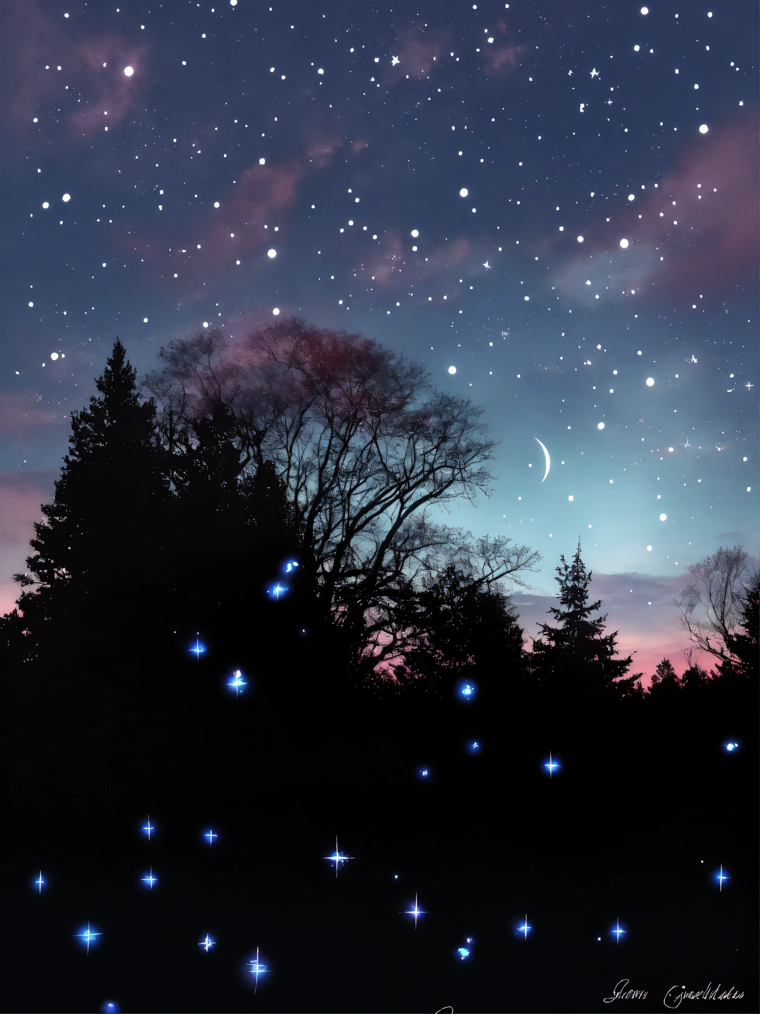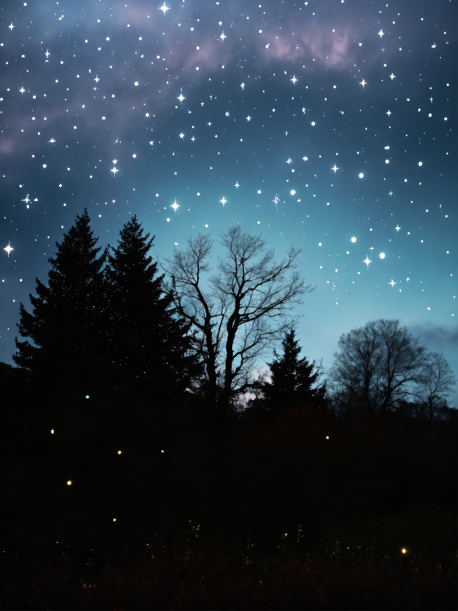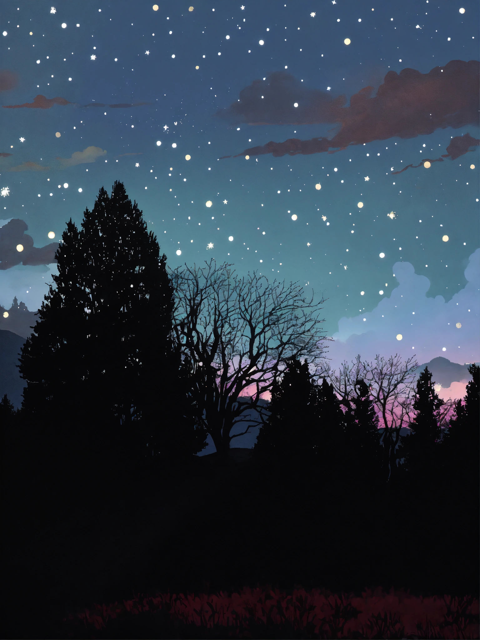 Burgundy night skies with constellations in the sky and silhouettes of enchanted trees