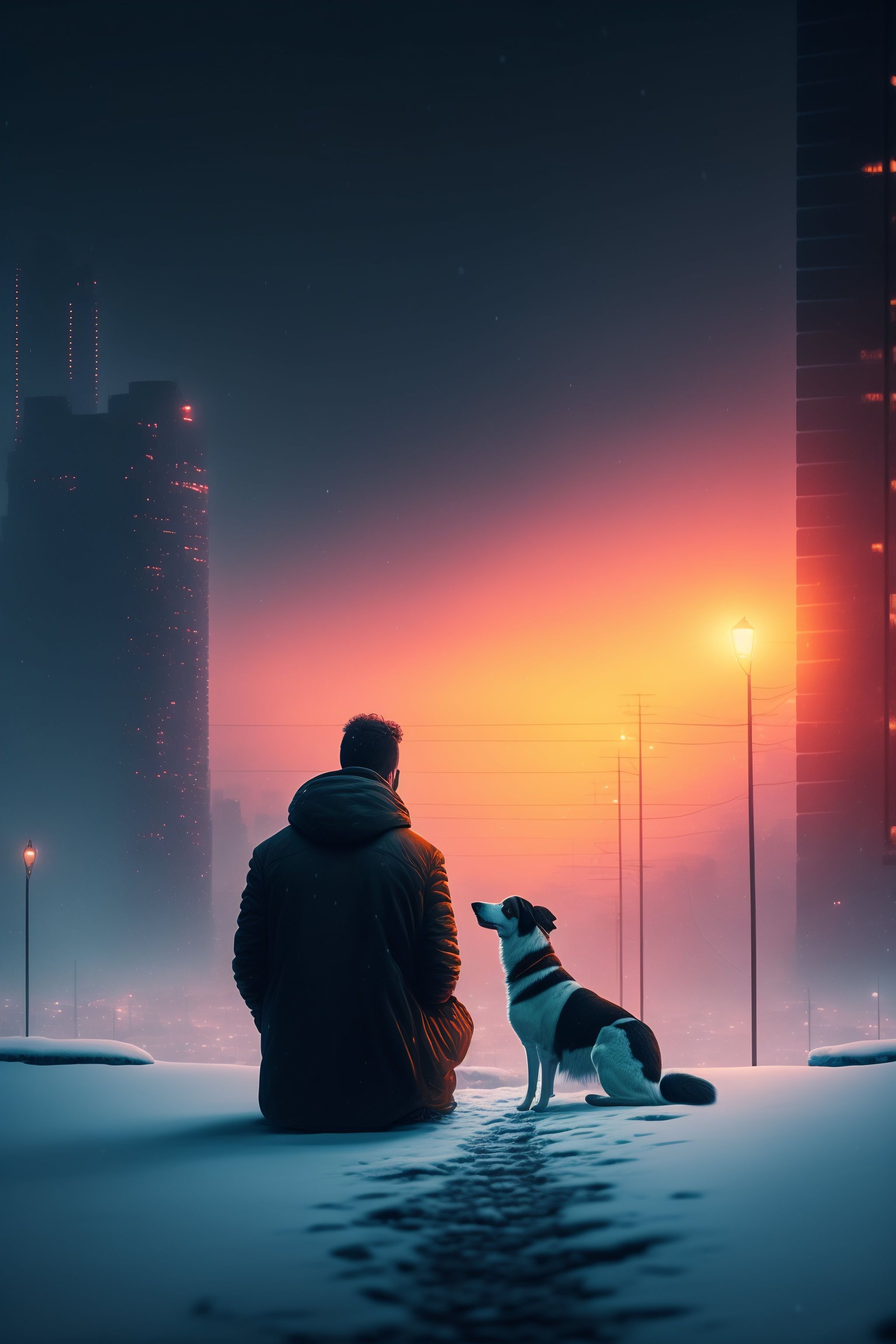 Depression embodied as a lone figure looking over a neon city like blade runner 2049 at night from under a dead tree with a dog aside in snowfall, photo realistic, 4k hd, solitude meaning