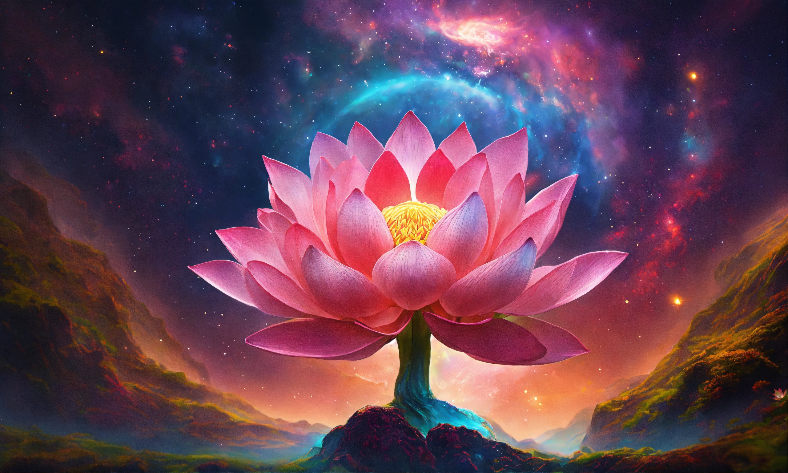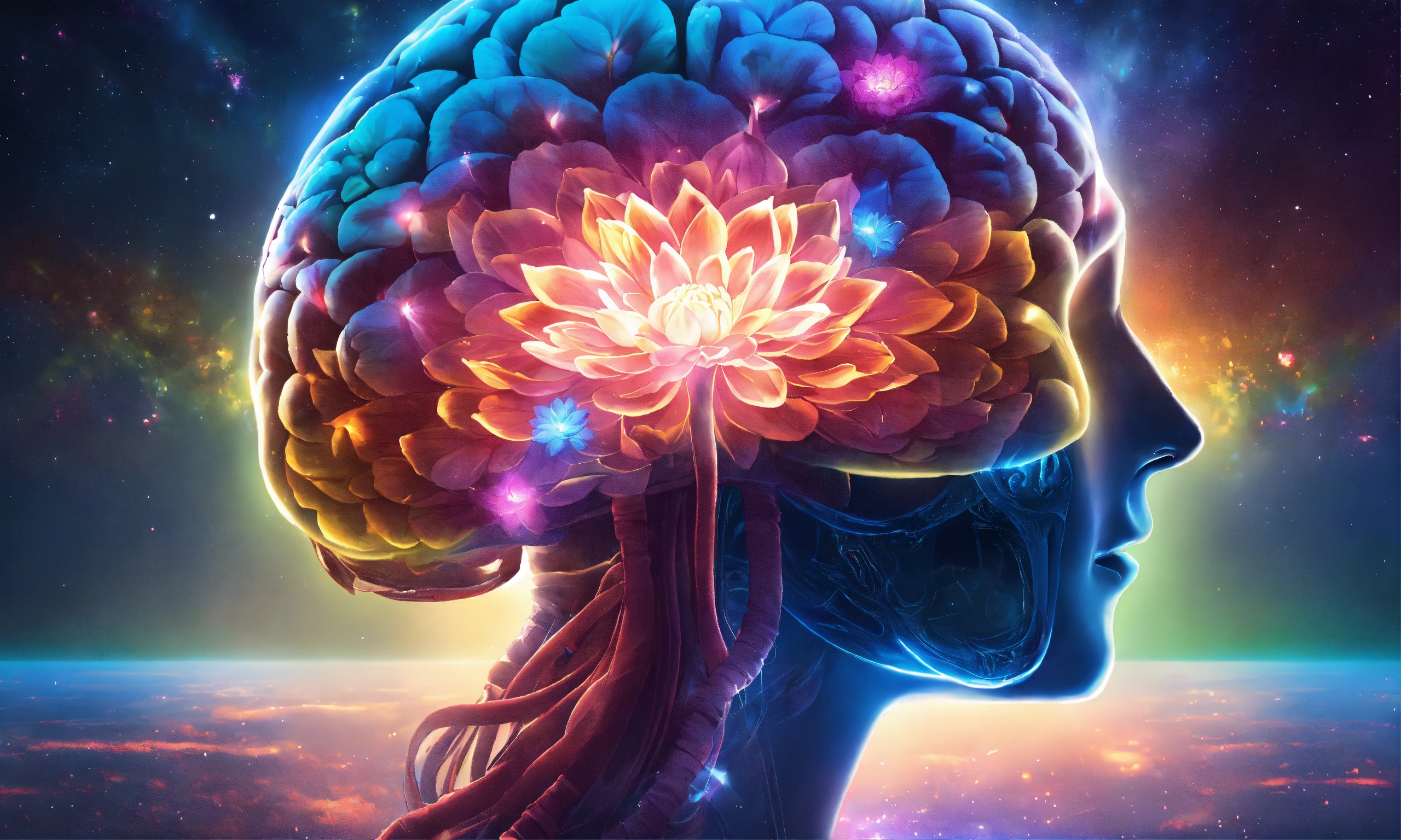 Human brain is exuding magical light of vibrant colors, put a vibrant lotus flower inside this human brain, a mesmerizing universe