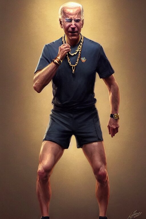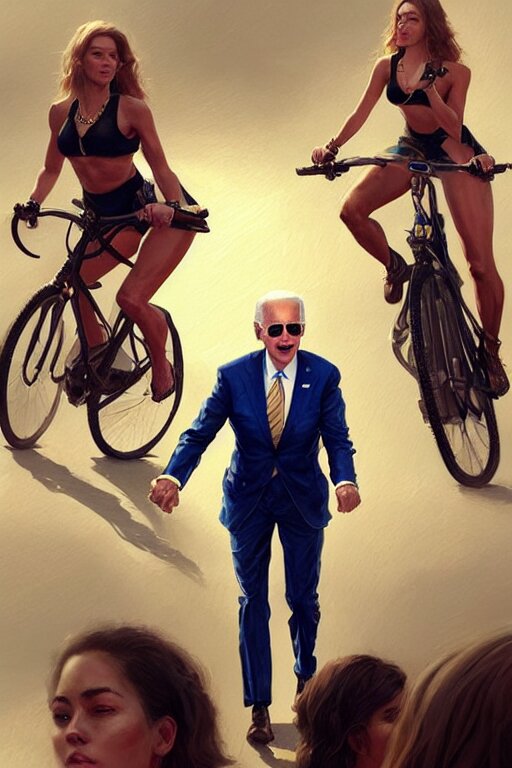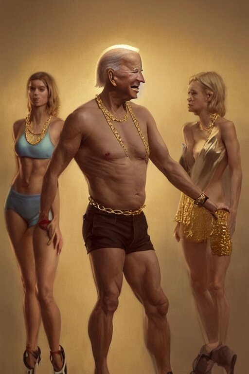 Joe biden wearing cycling shorts and gold chains surrounded by beautiful women, elegant, real life skin, intricate, high detailed, artstation, concept art, smooth, sharp focus, art by artgerm and greg rutkowski