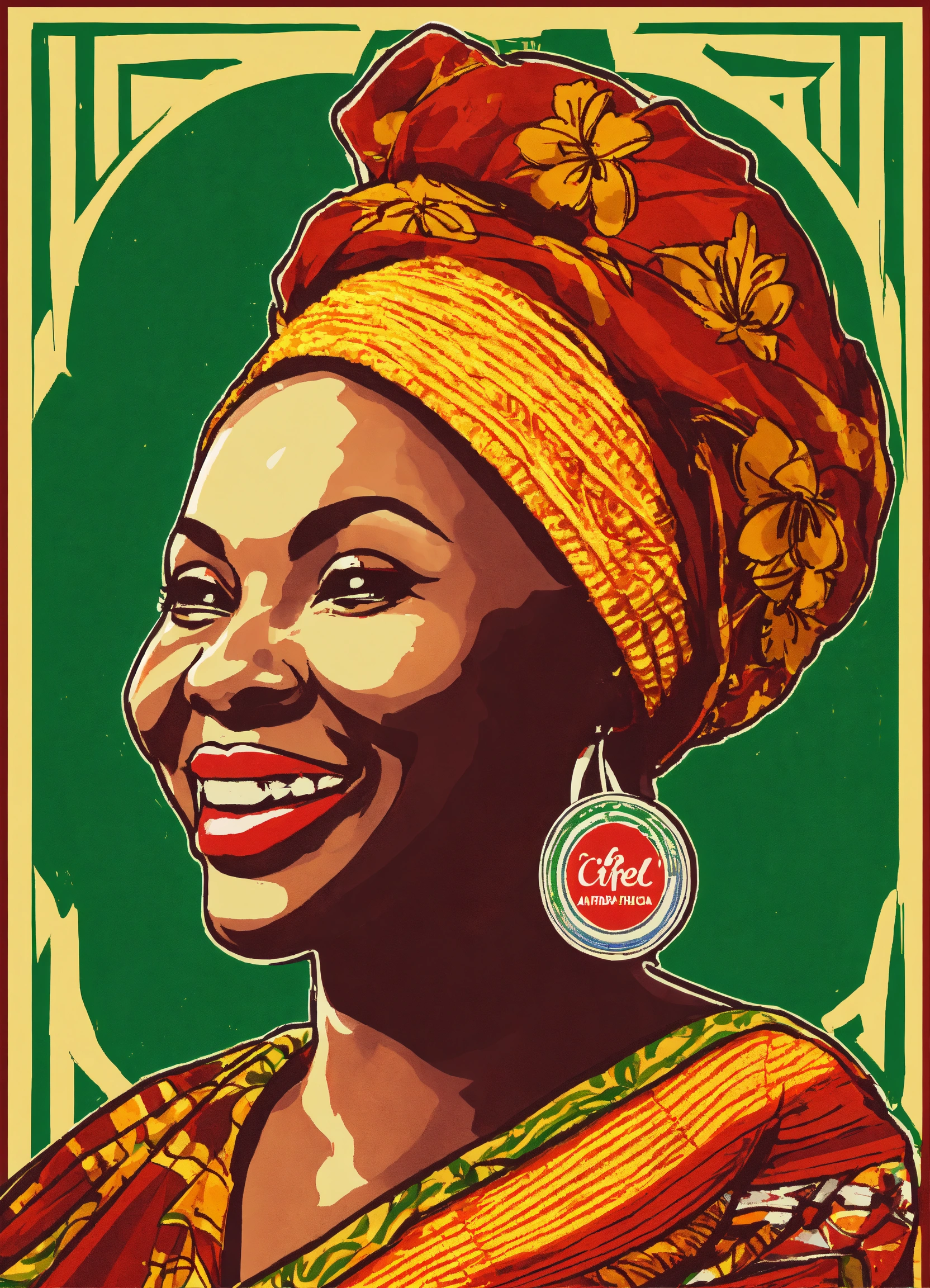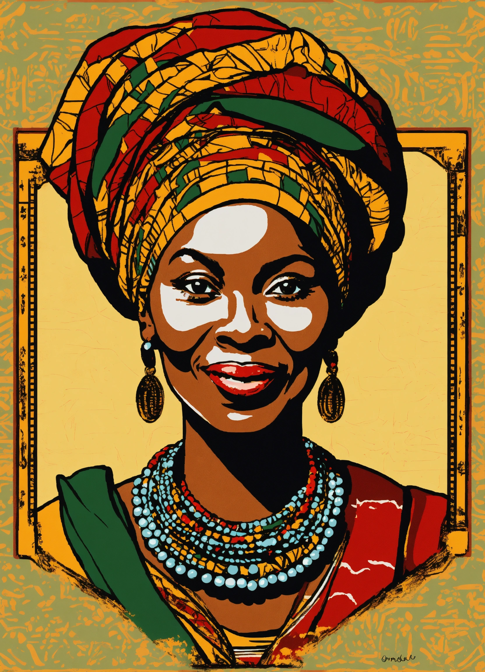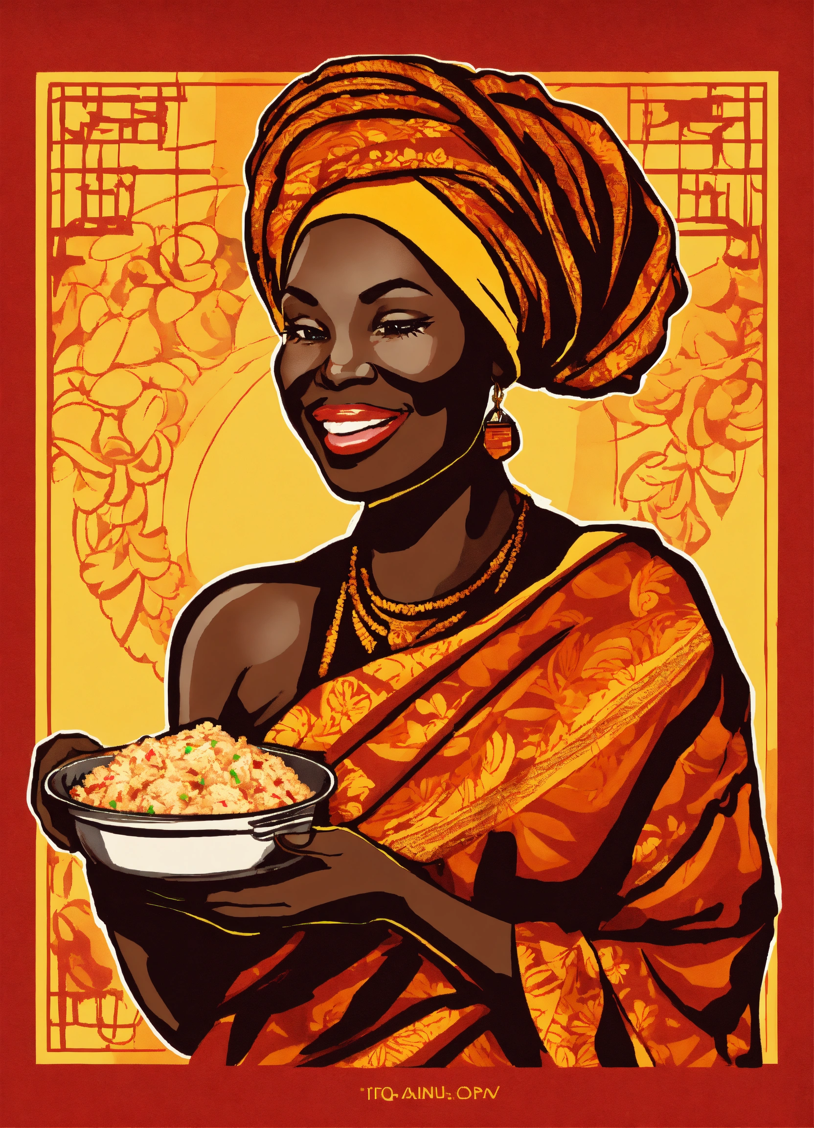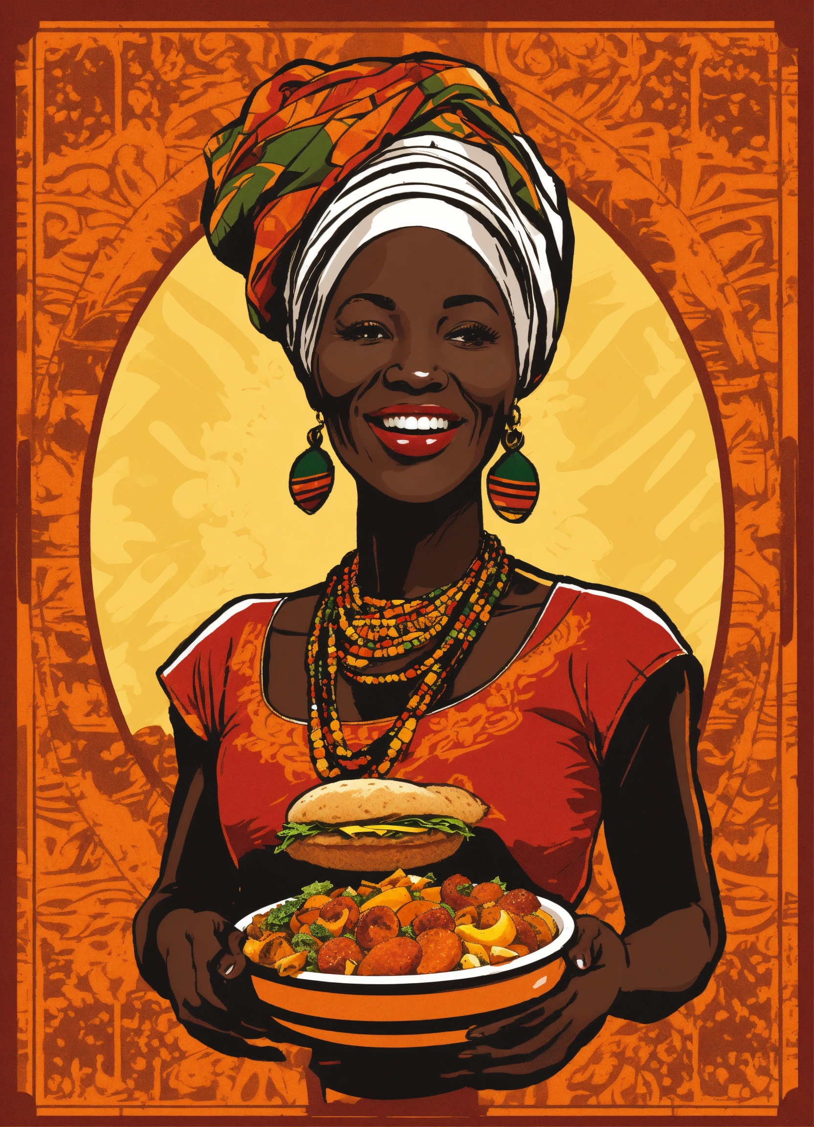 A logo for an african fast food consisting of an african middle-aged woman wearing an african head wrap showing only her upper body. should be smiling like the aunt jemima logo and her head slightly tilted down while holding an african pot but also looking up toward the target audience. it should be more vector shaped and modern, like kfc and made with basic shapes but kept traditional.