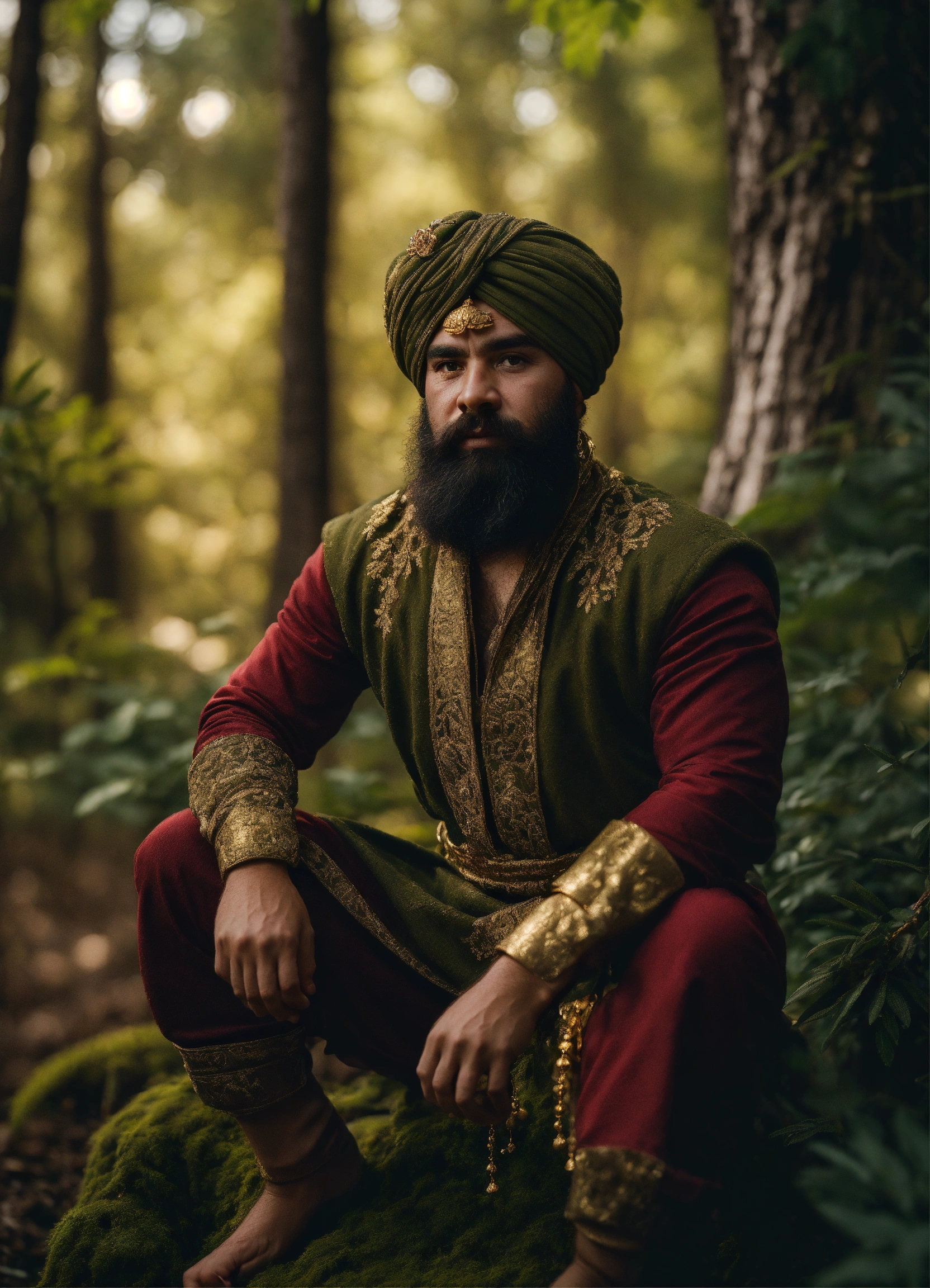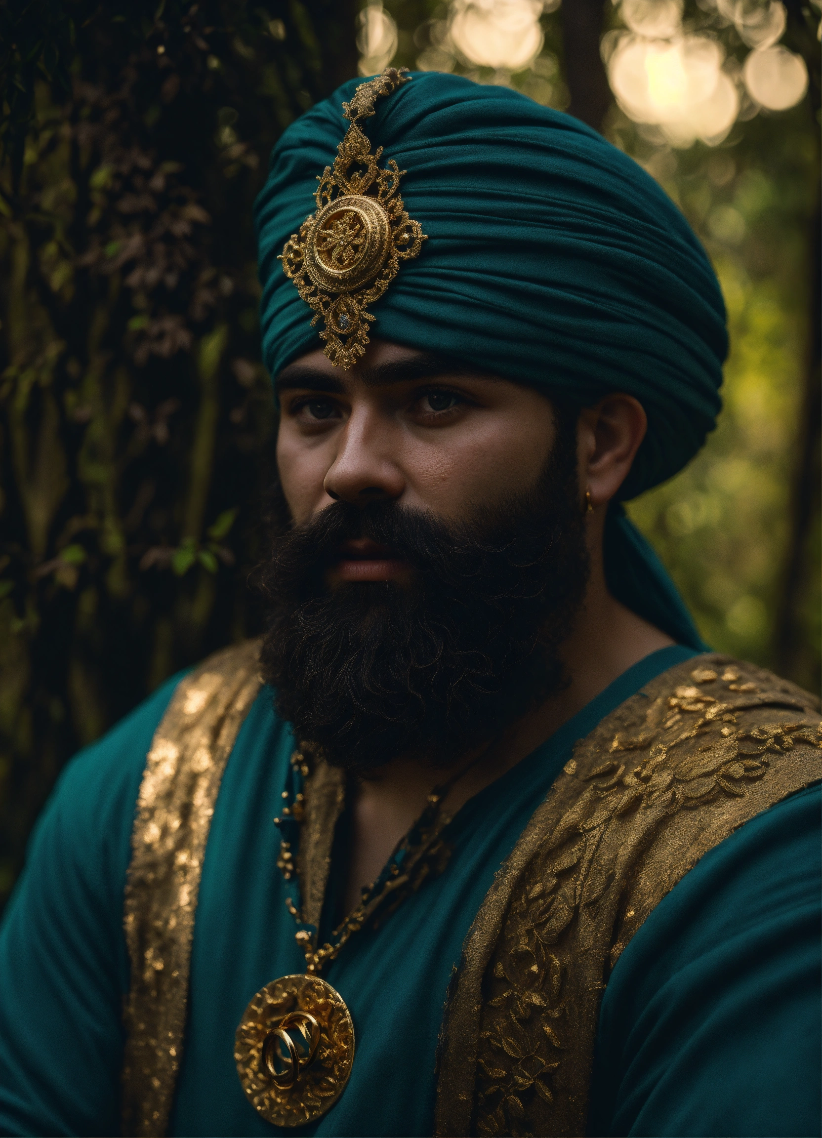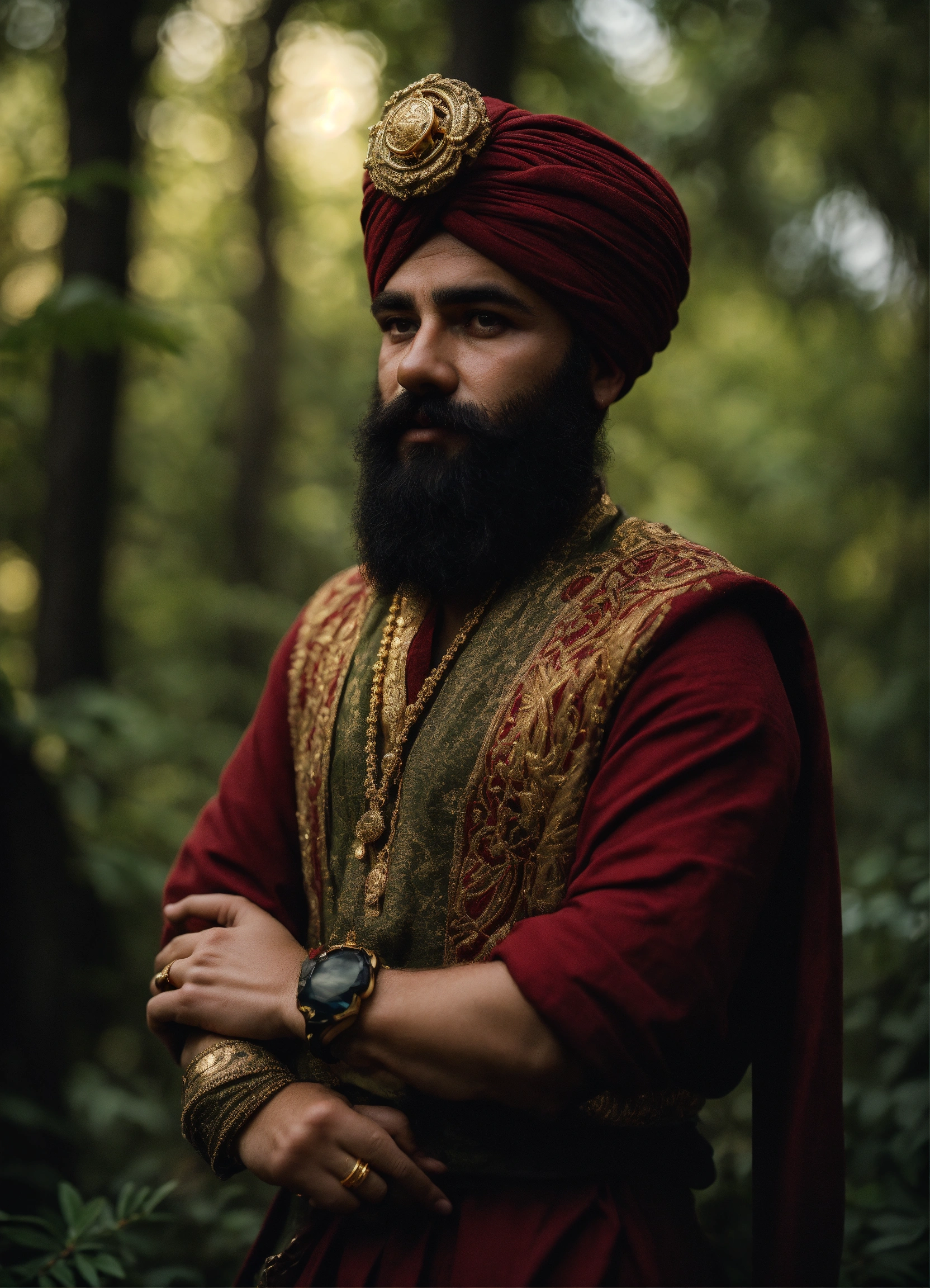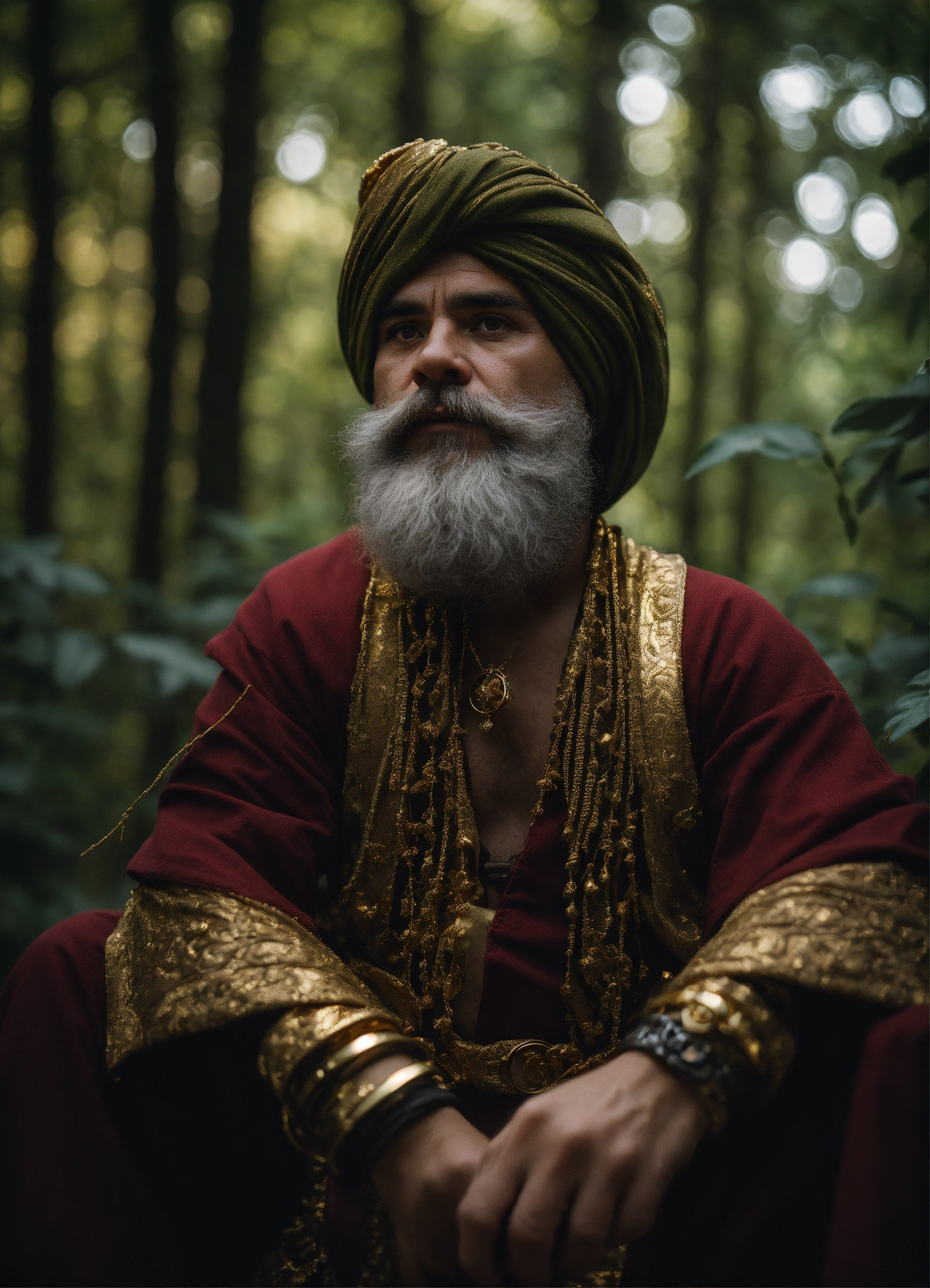 Olive skinned, dwarf man, turban with gold ring, in a forest, moody lighting, best quality, full body portrait, real picture, intricate details, depth of field, in a forest, fujifilm xt3, outdoors, bright day, beautiful lighting, raw photo, 8k uhd, film grain, unreal engine 5, ray tracing