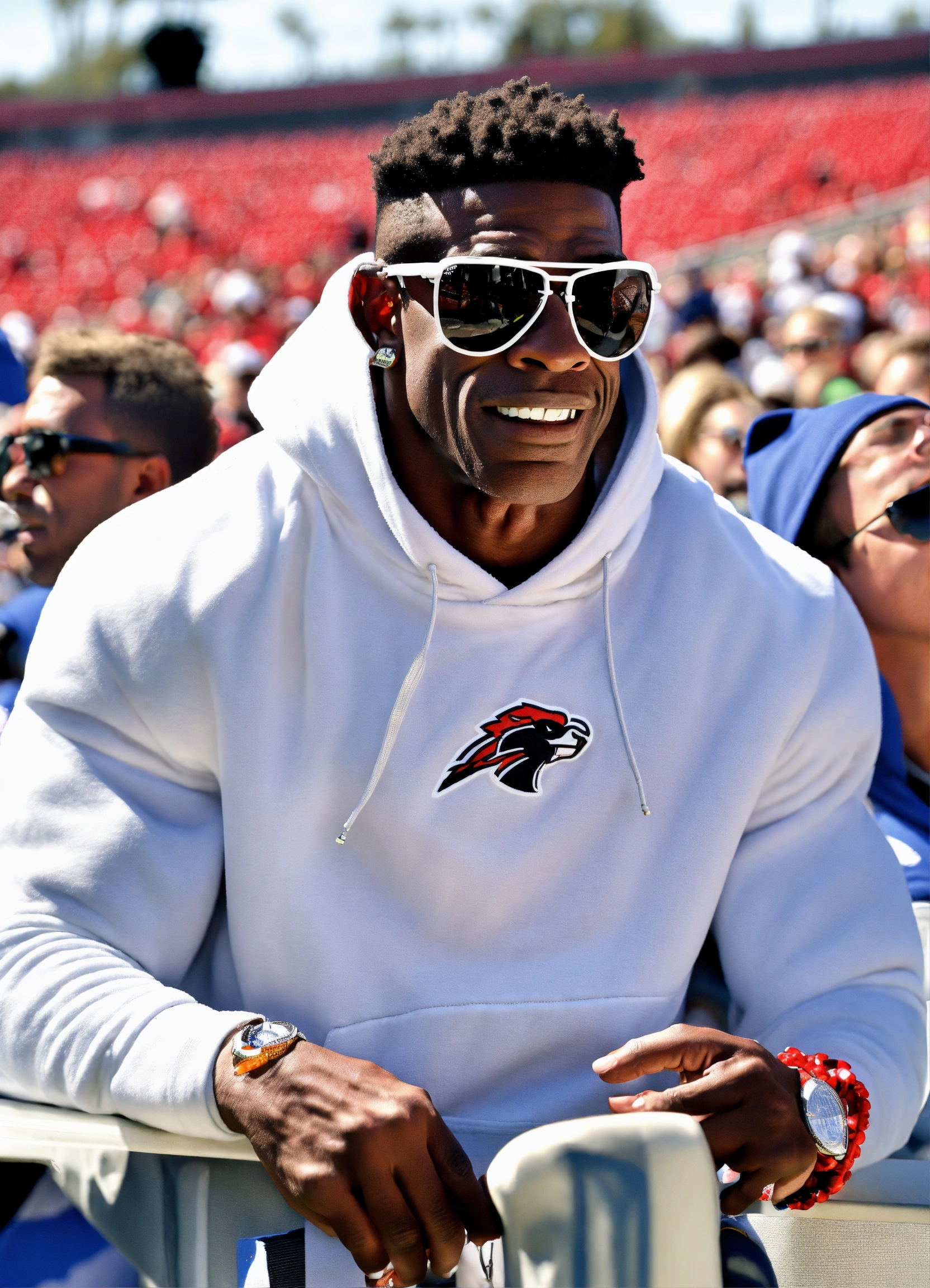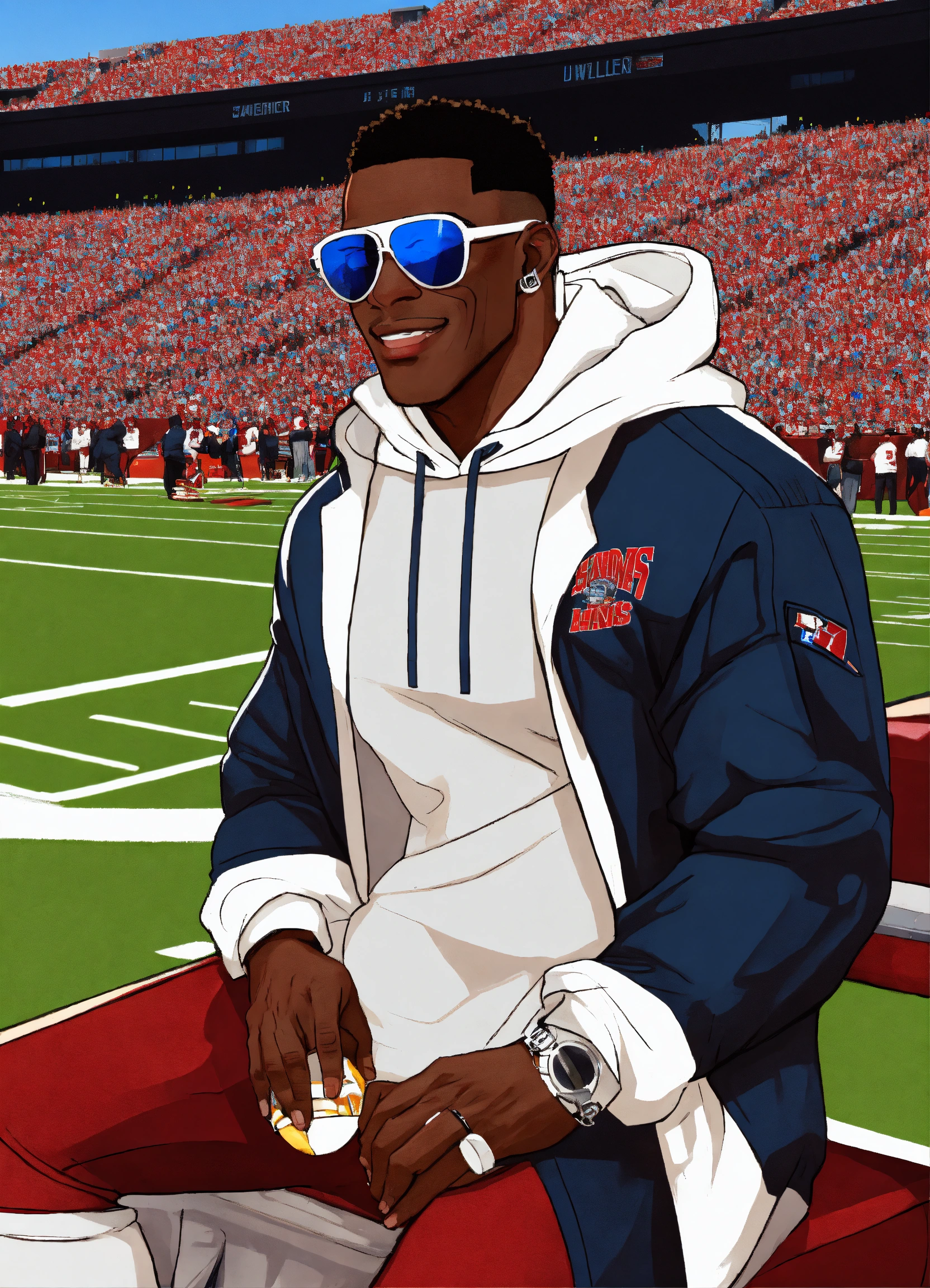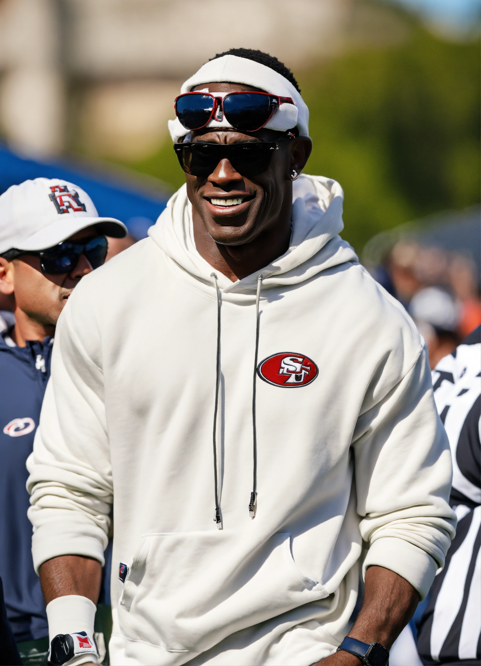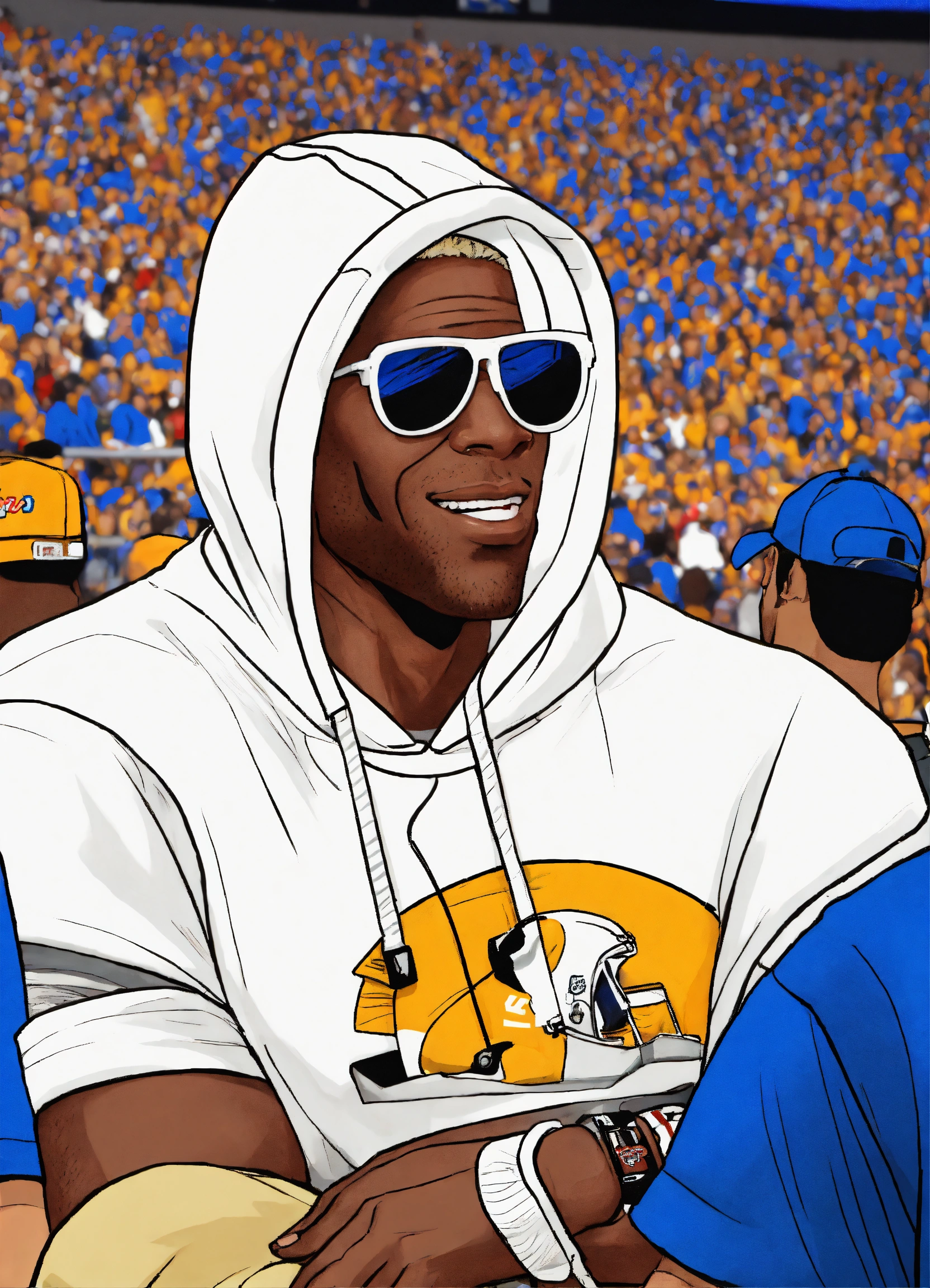 Handsome cartooned deion sanders in a white hoodie and sunglasses, on the sideline at a college football game--v 5.0