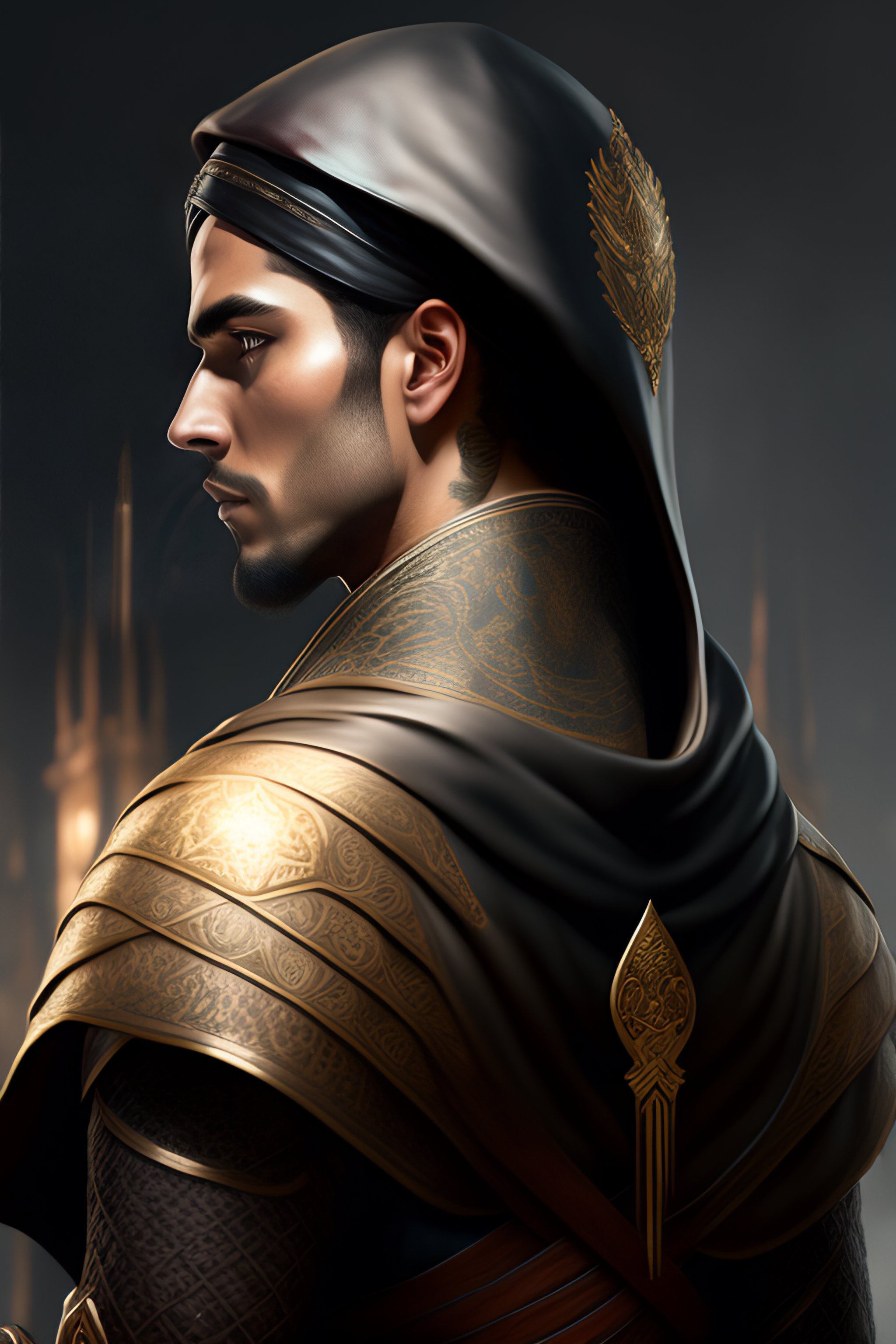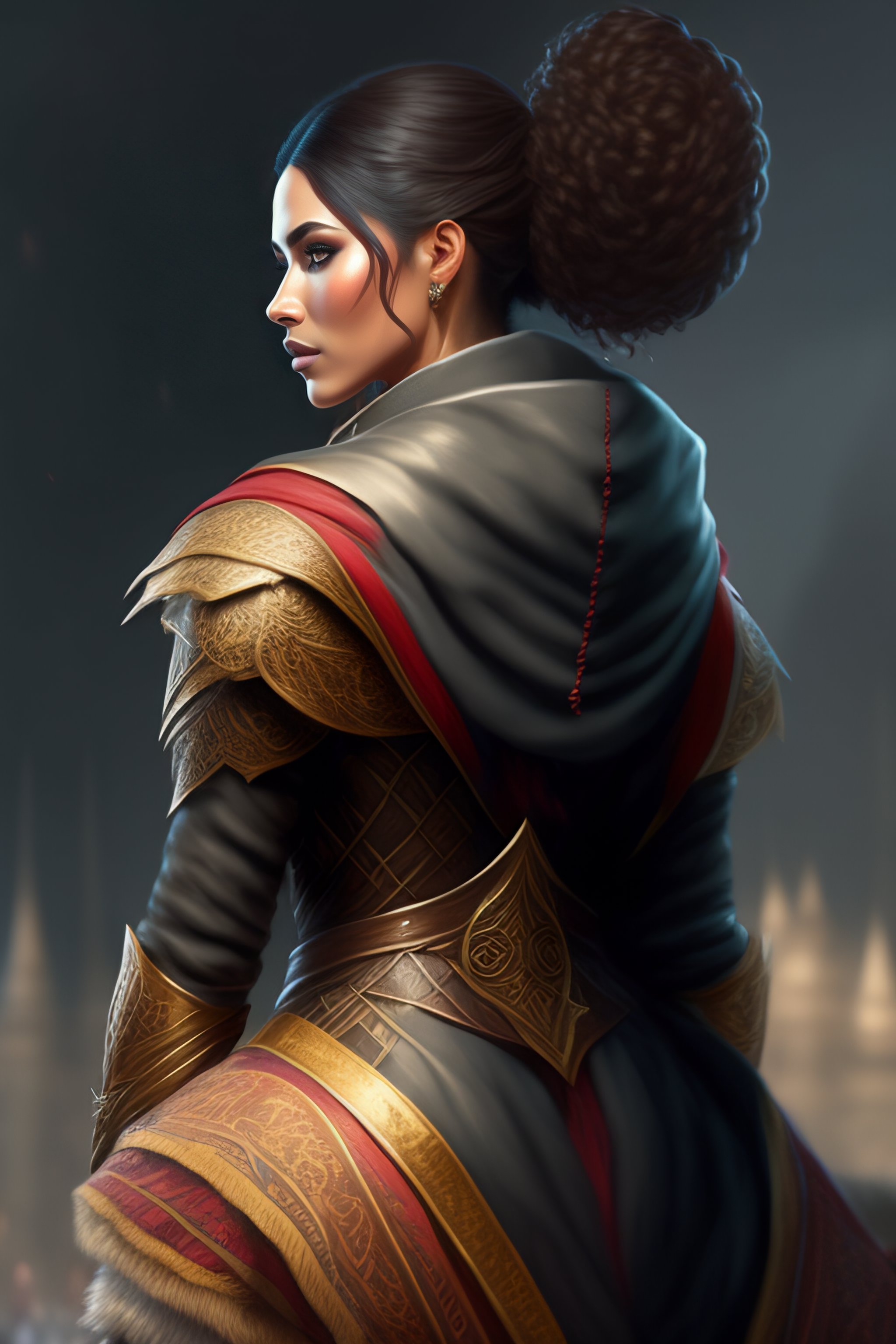 Back portrait of an hooded assassin wearing an assassin creed inspired outfit, full body, hairy torso, half bun, d&d, fantasy, intricate, elegant, highly detailed, digital painting, artstation, concept art, matte, sharp focus, illustration, art by artgerm and greg rutkowski and alphonse mucha