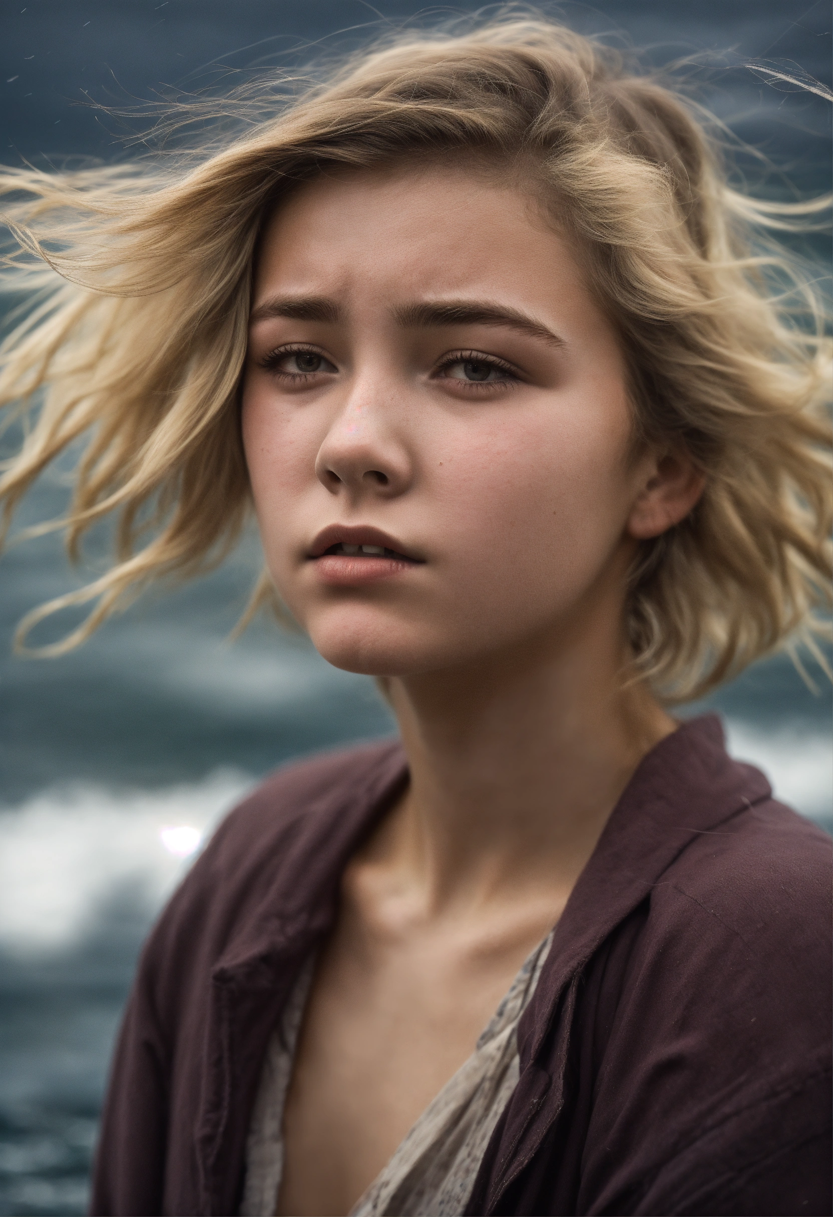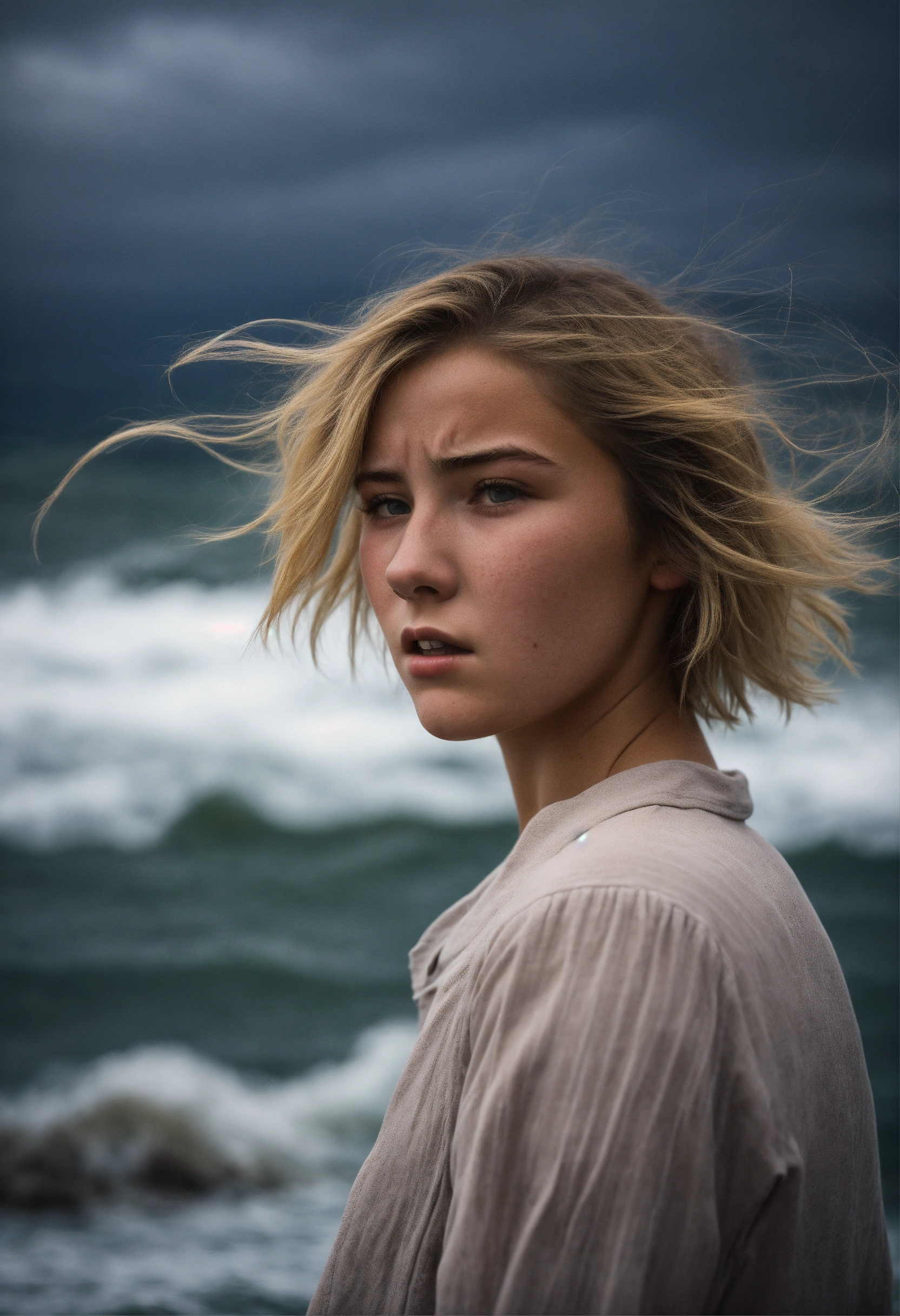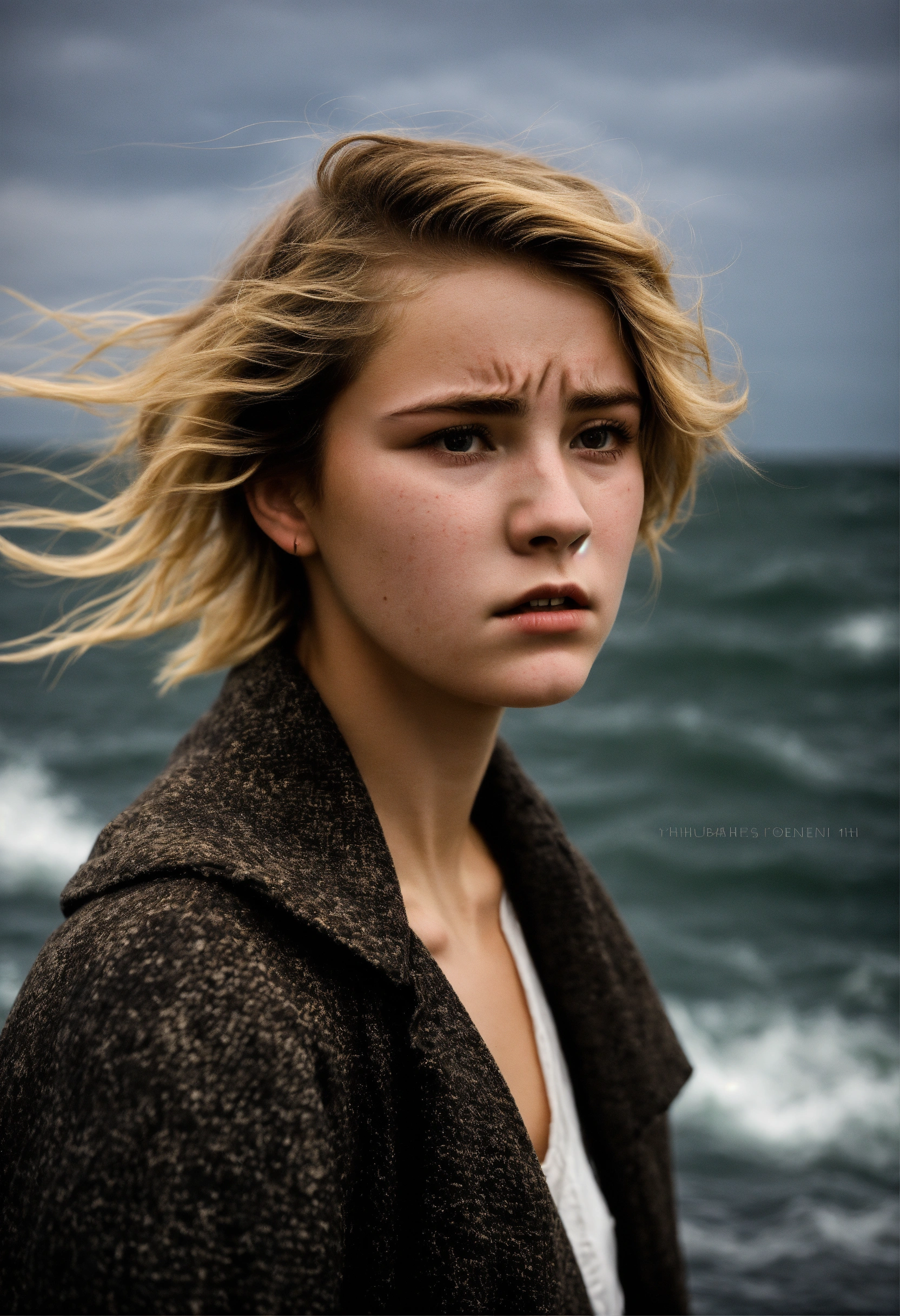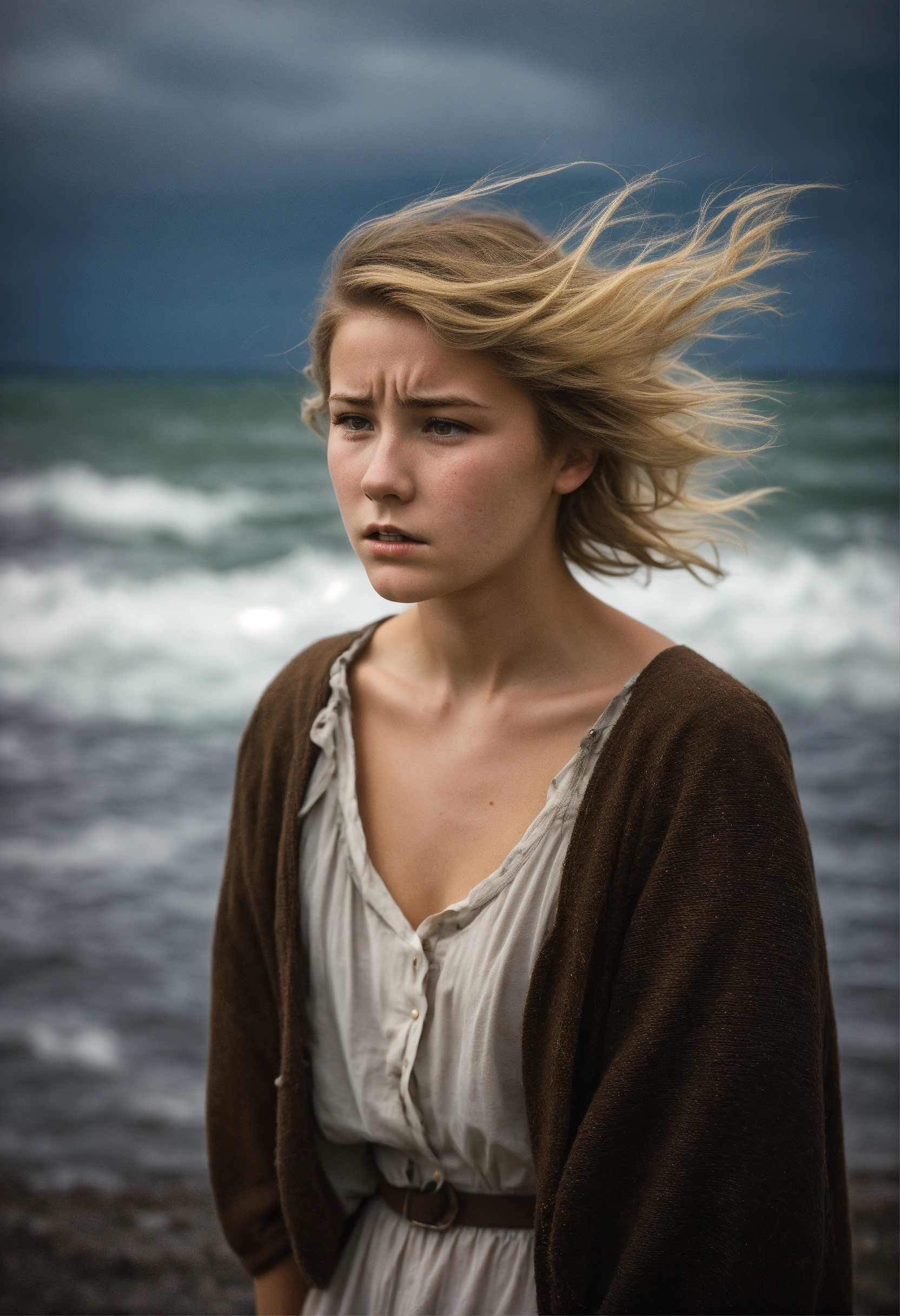1910's 16 year old girl, worried face, short blonde hair blowing in the wind, by the dark ocean, in storm