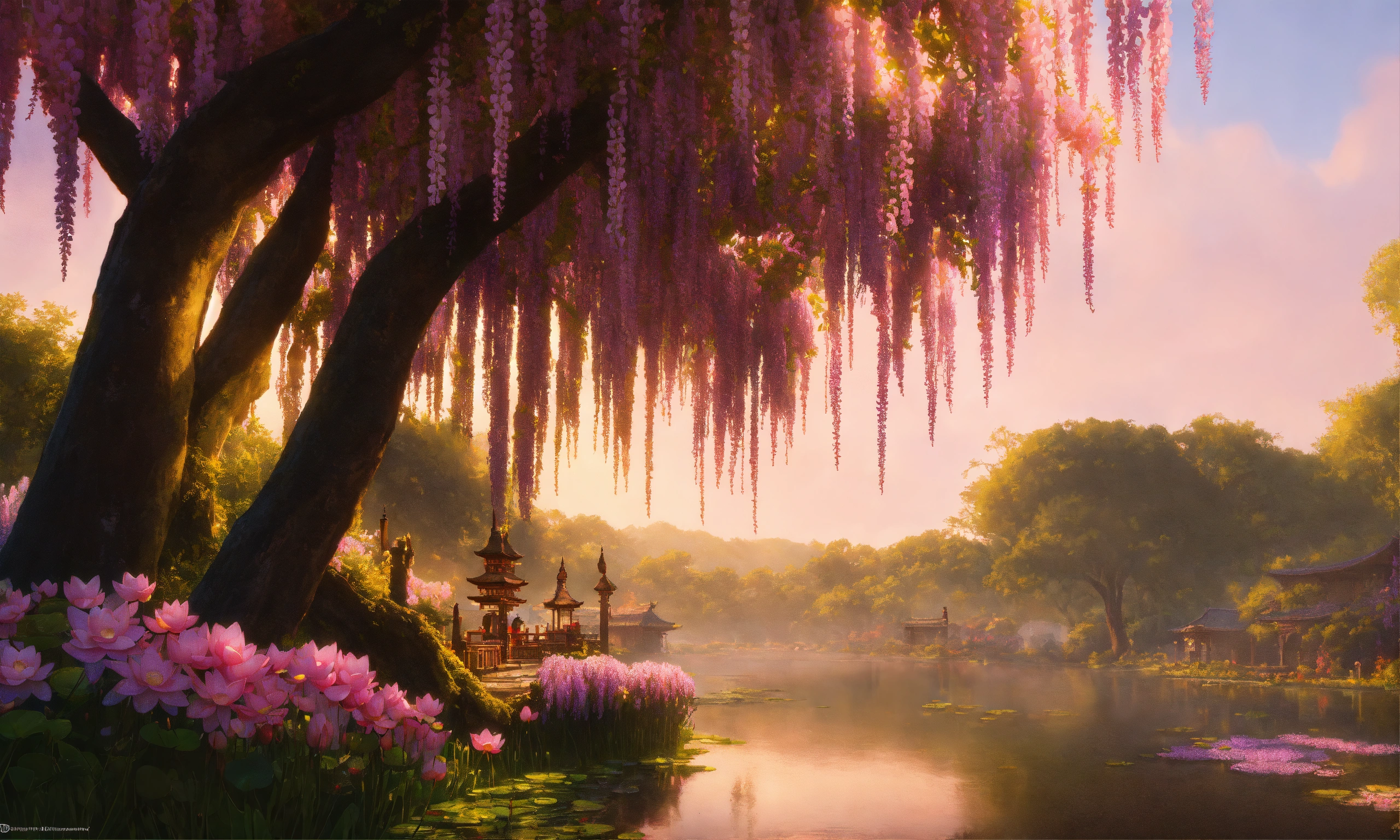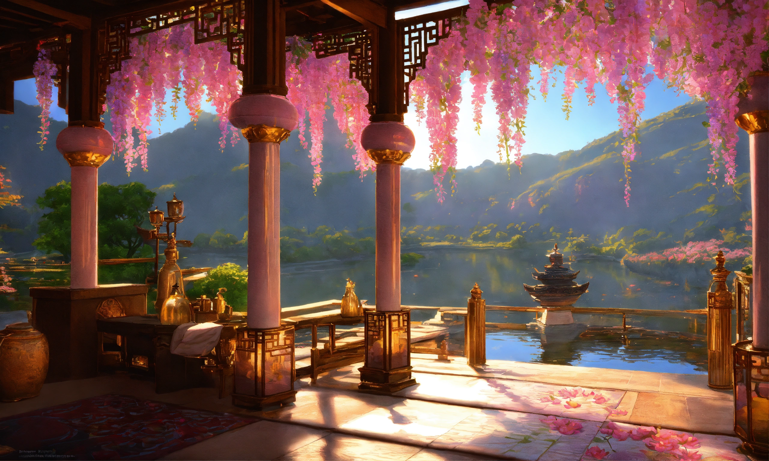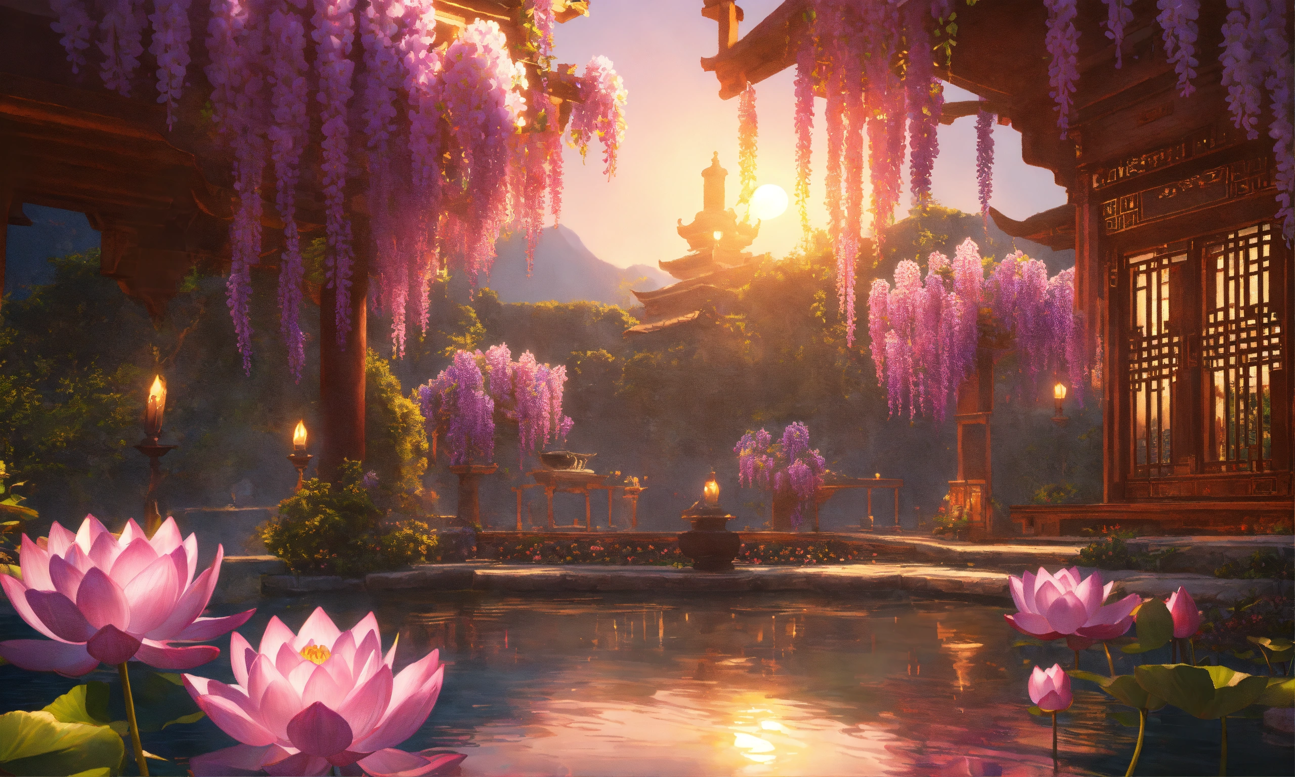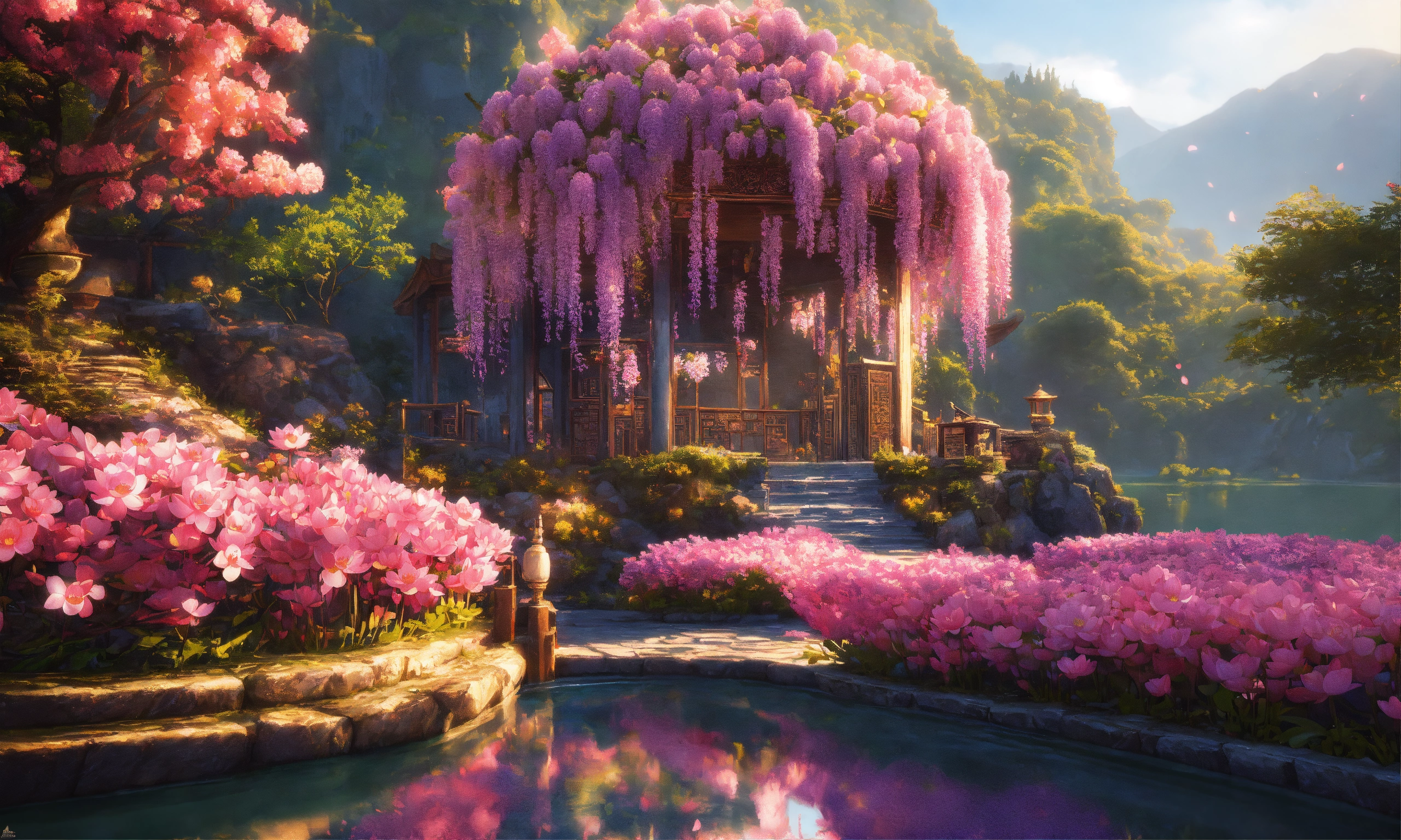 Oriental ogives flowered pink and gold very fine chiseled with basins covered with beautiful pink lotus and colorful paths with bright reflections, creating a heavenly world with pastel landscapes covered with flowers and trees covered with pink wisteria realistic, photorealistic pastel vintage colorful, art by, hildebrandt, in the style of, disney deviant art pinterest, sunlight candlelight natural lighting, oriental, ogives, flowered, wisteria, sharp complex picture octane fine details unreal engine ultra realistic cinematic 4k