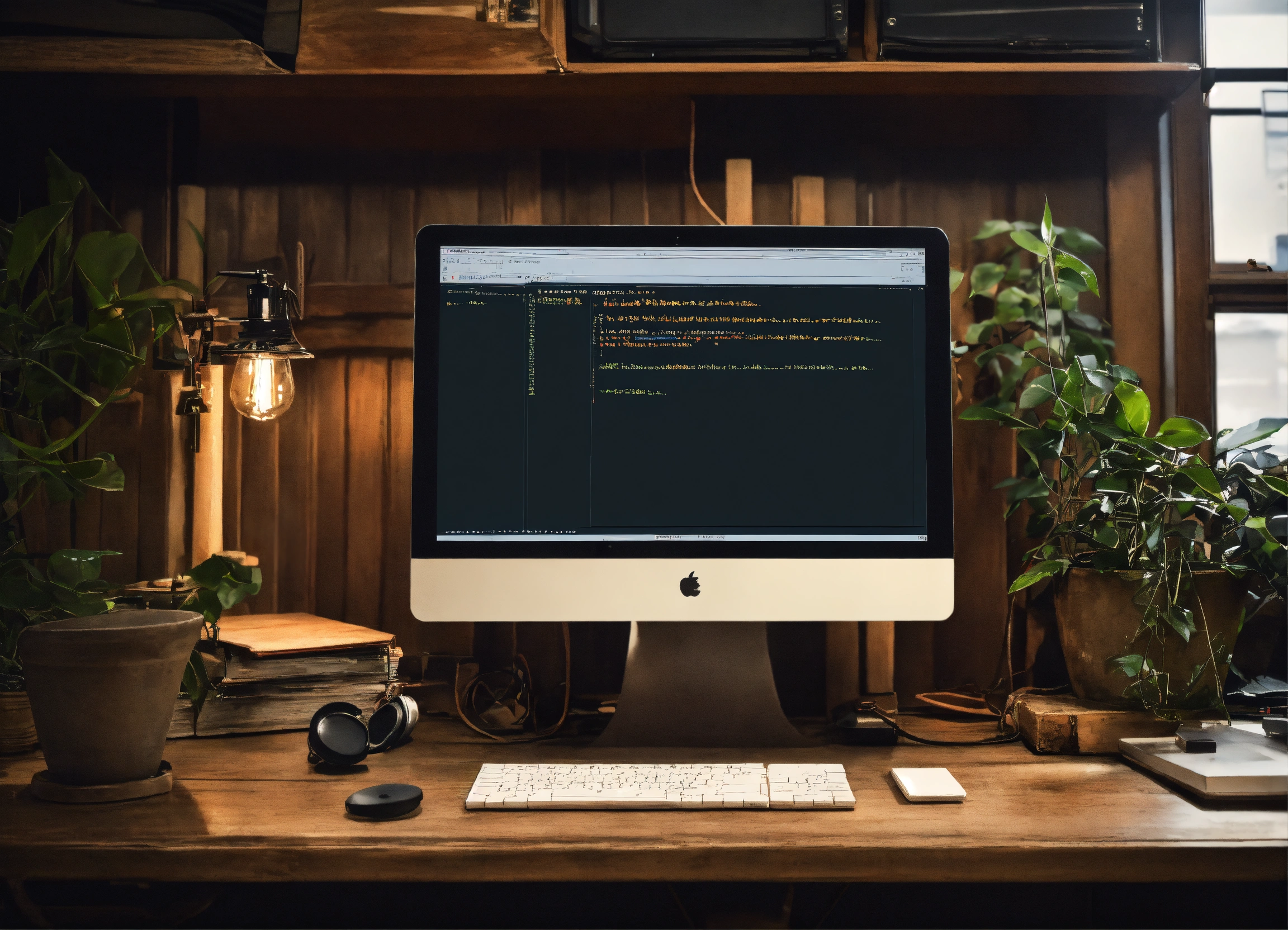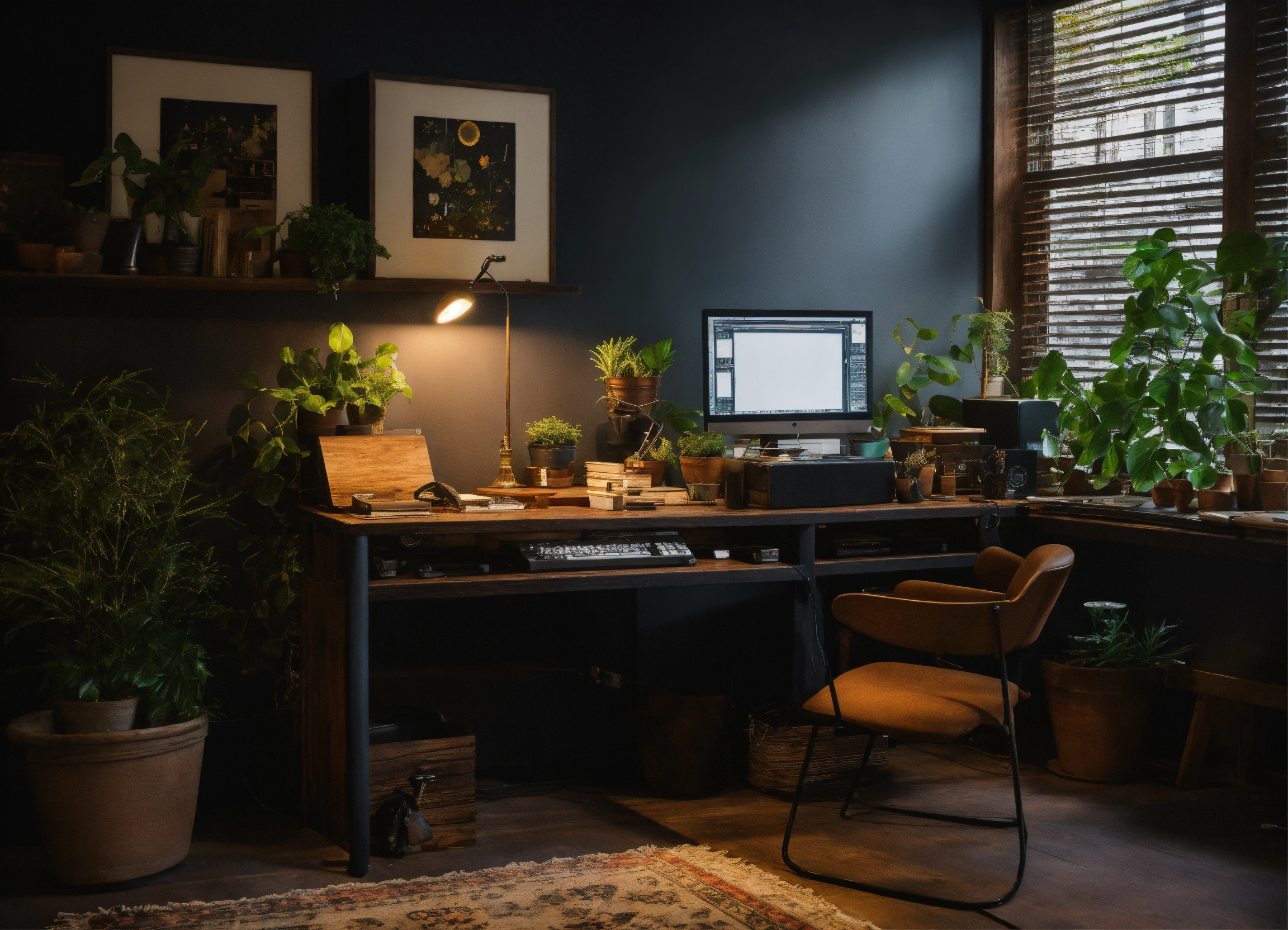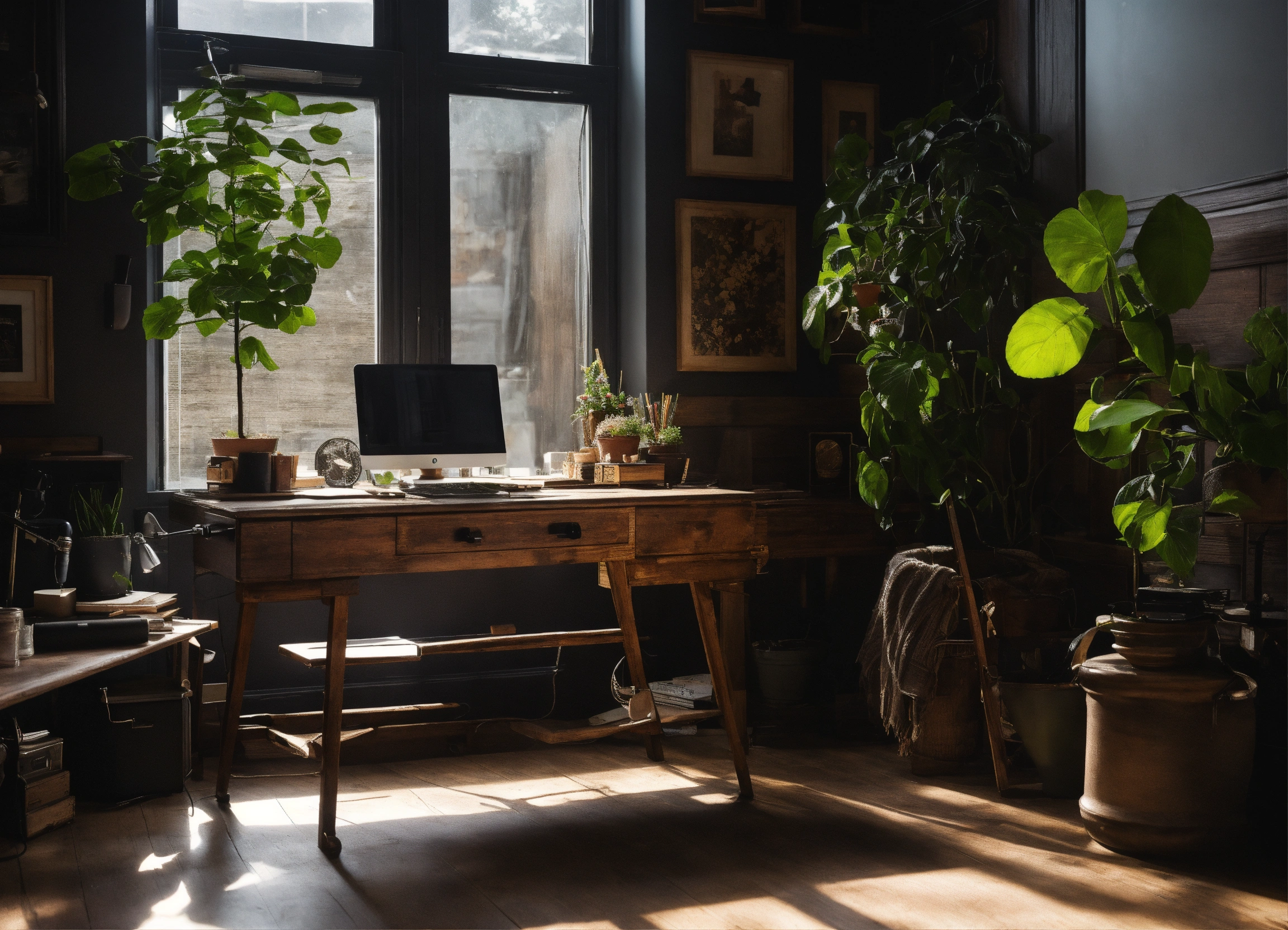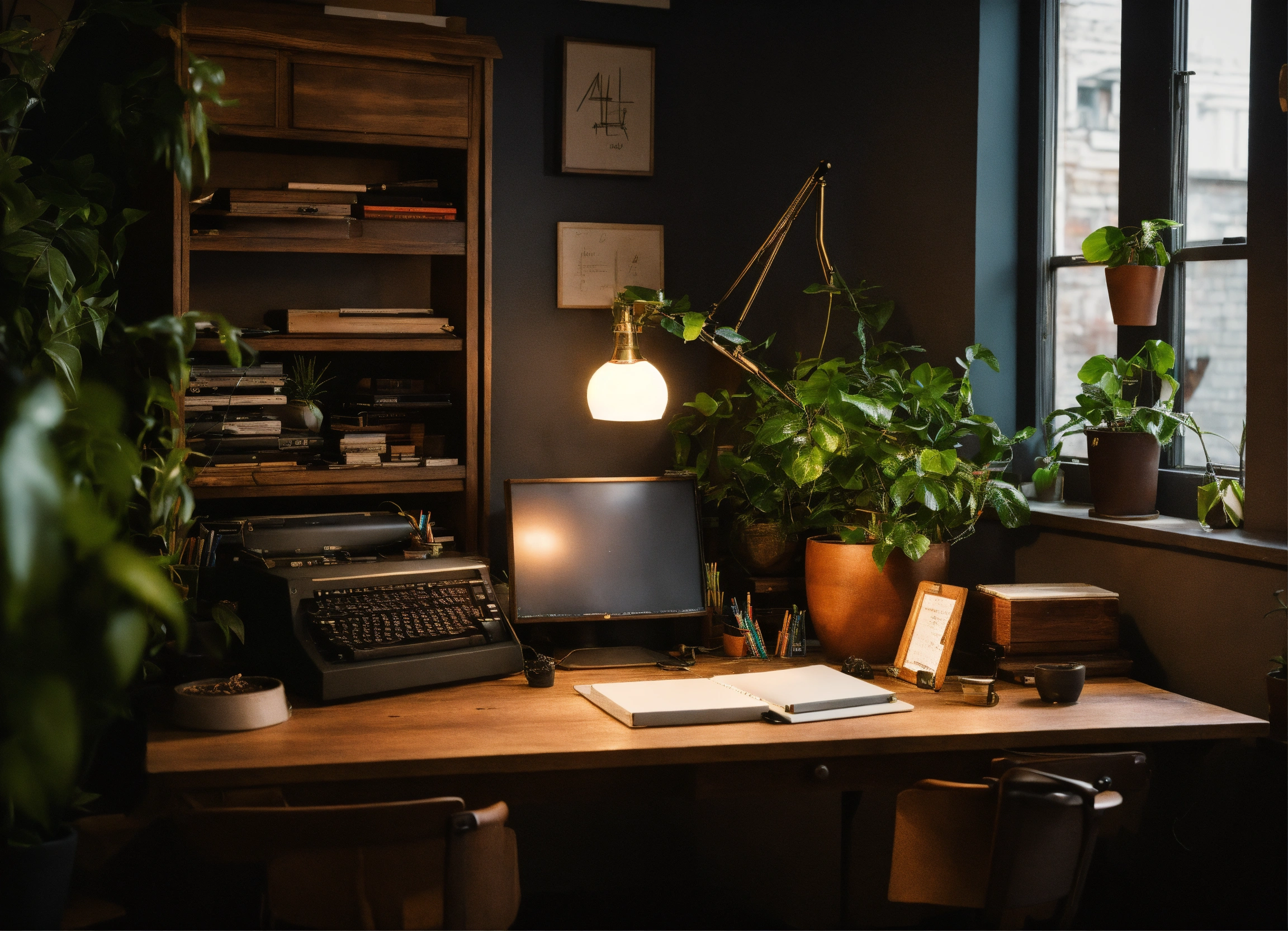 A photo of a studio and desk, old school writing and computer, mix the old and the new in one cohesive photo, dark color scheme, wood aesthetic, 1 potted plant, eye level, 1, 4/f