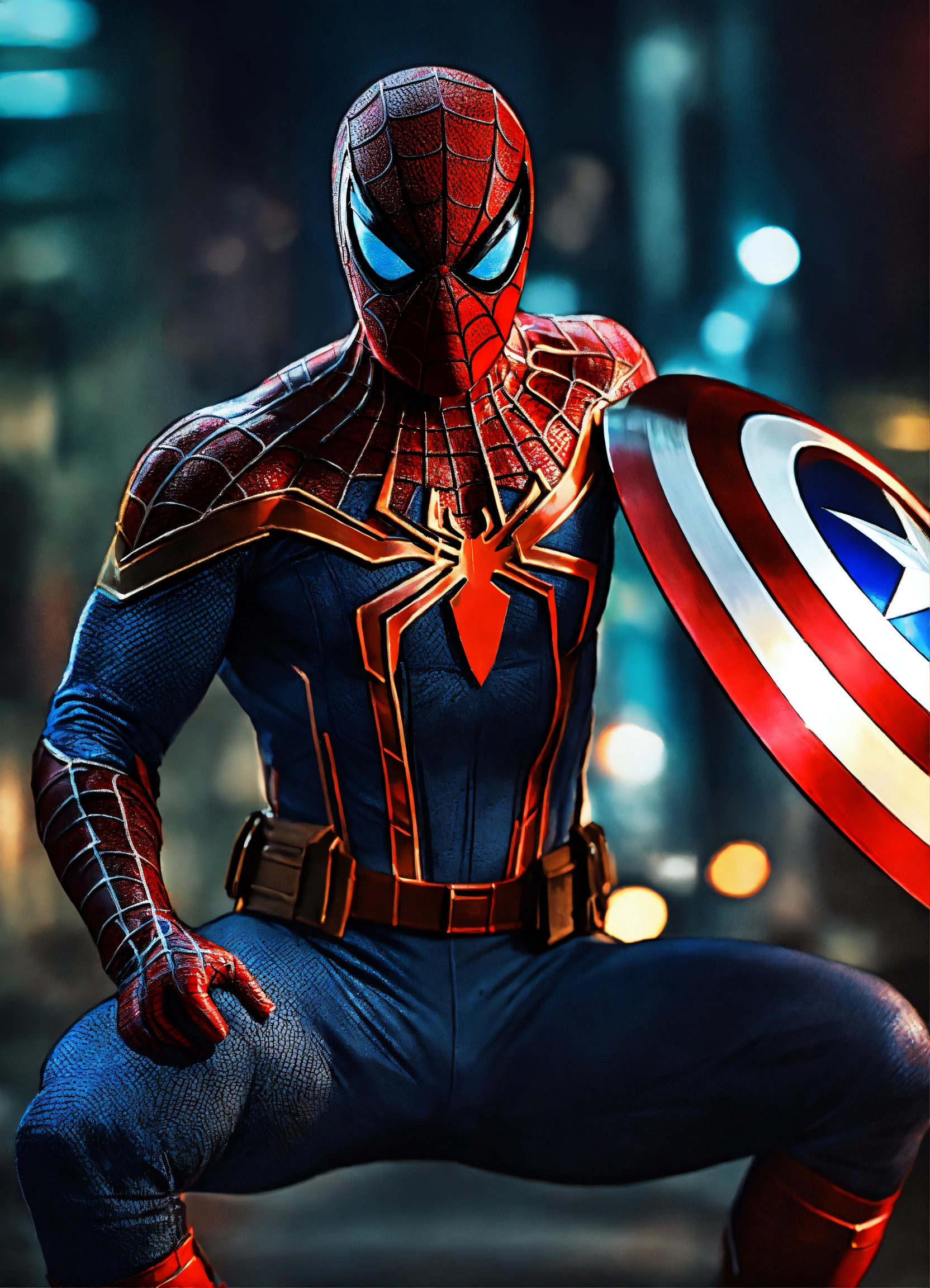 Spiderman themed captain america, amazing, intricate, sharp focus, fantasy, cinematic lighting, otherworldly, real 8k photo, dark moody aesthetic