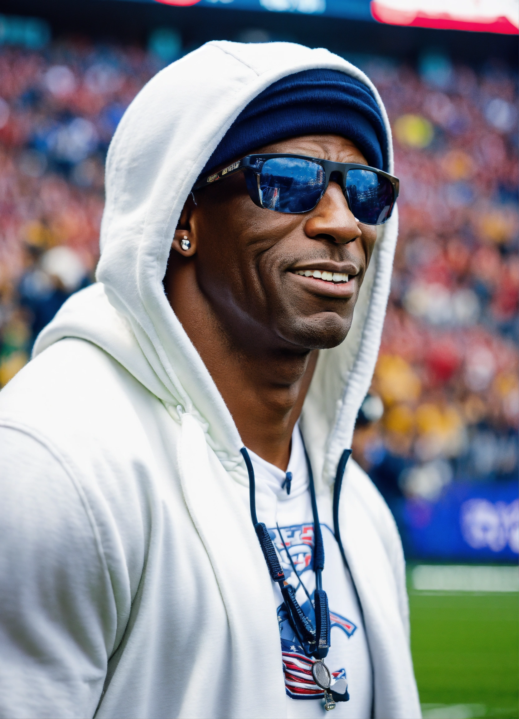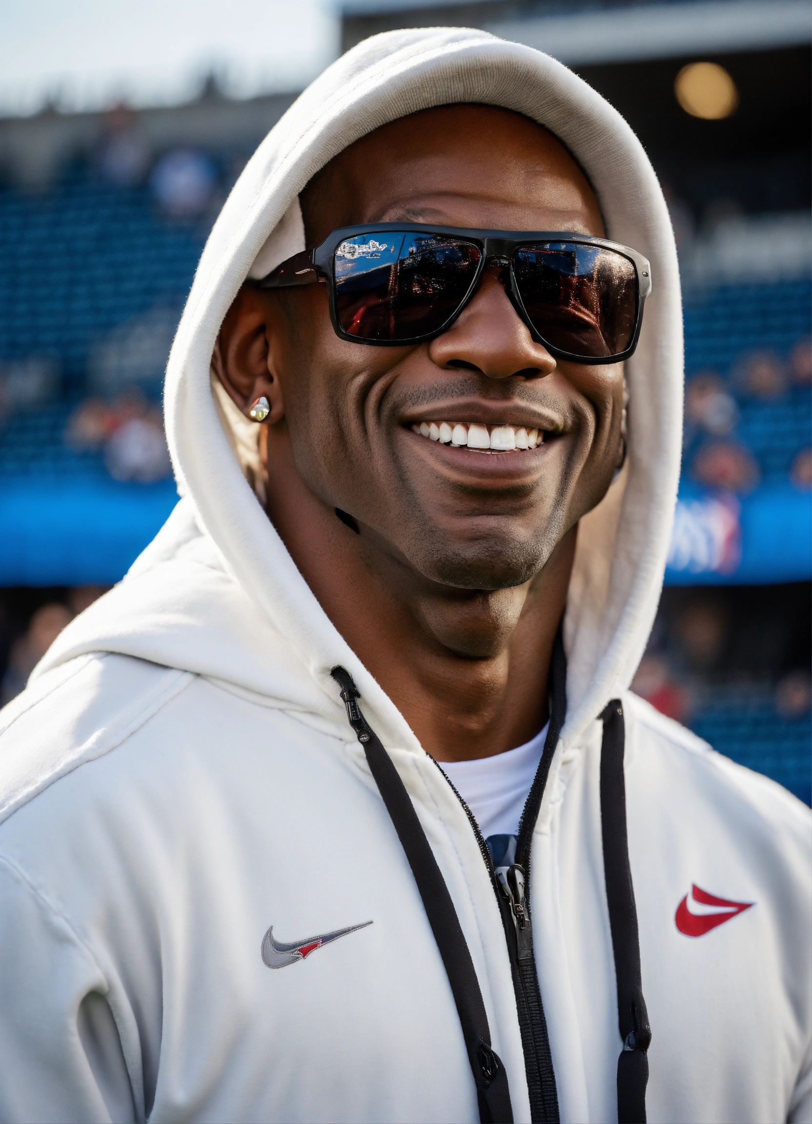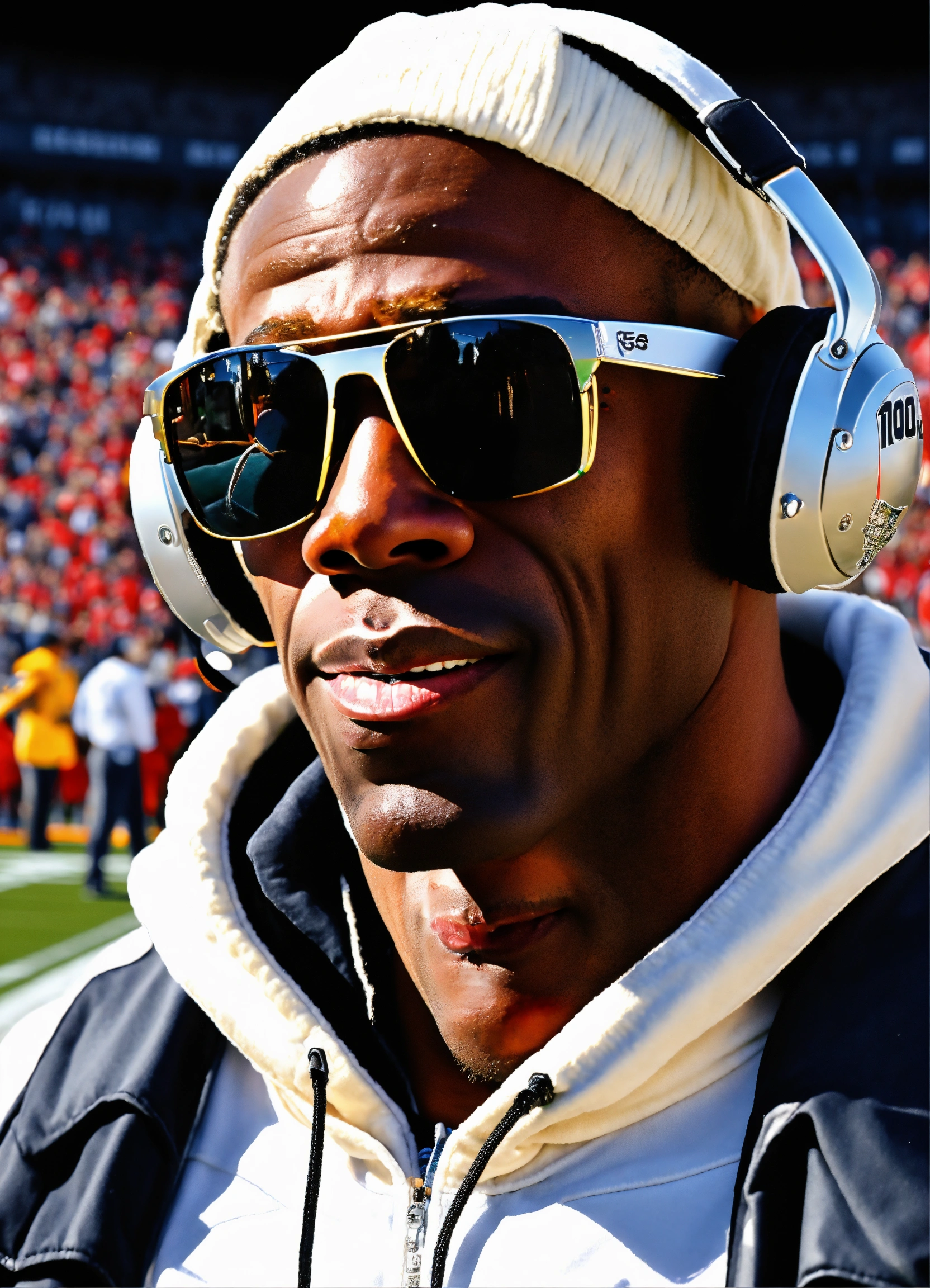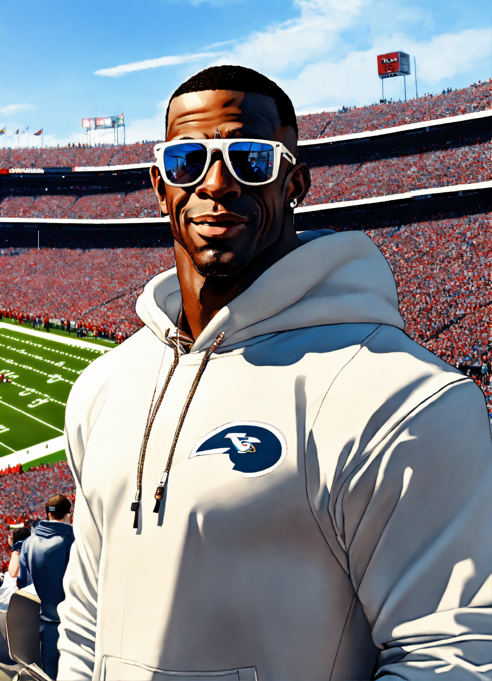 Handsome cartooned deion sanders in a white hoodie and sunglasses, on the sideline at a college football game--v 5.0