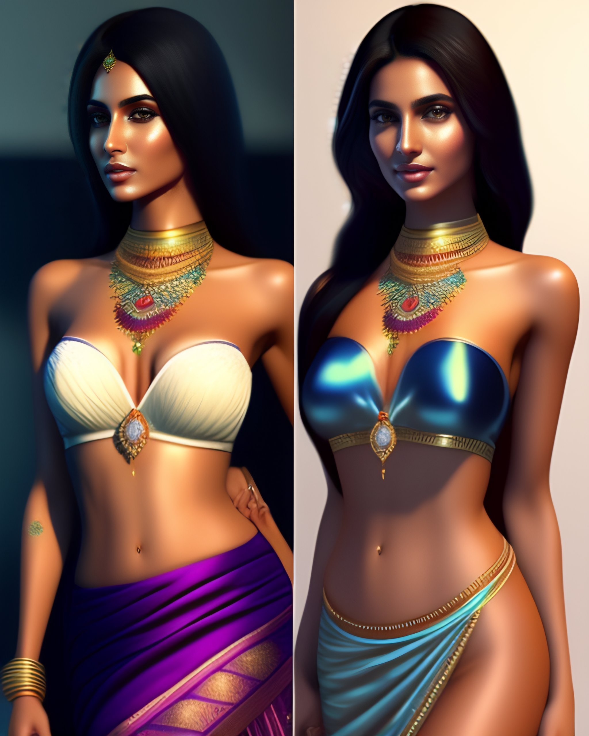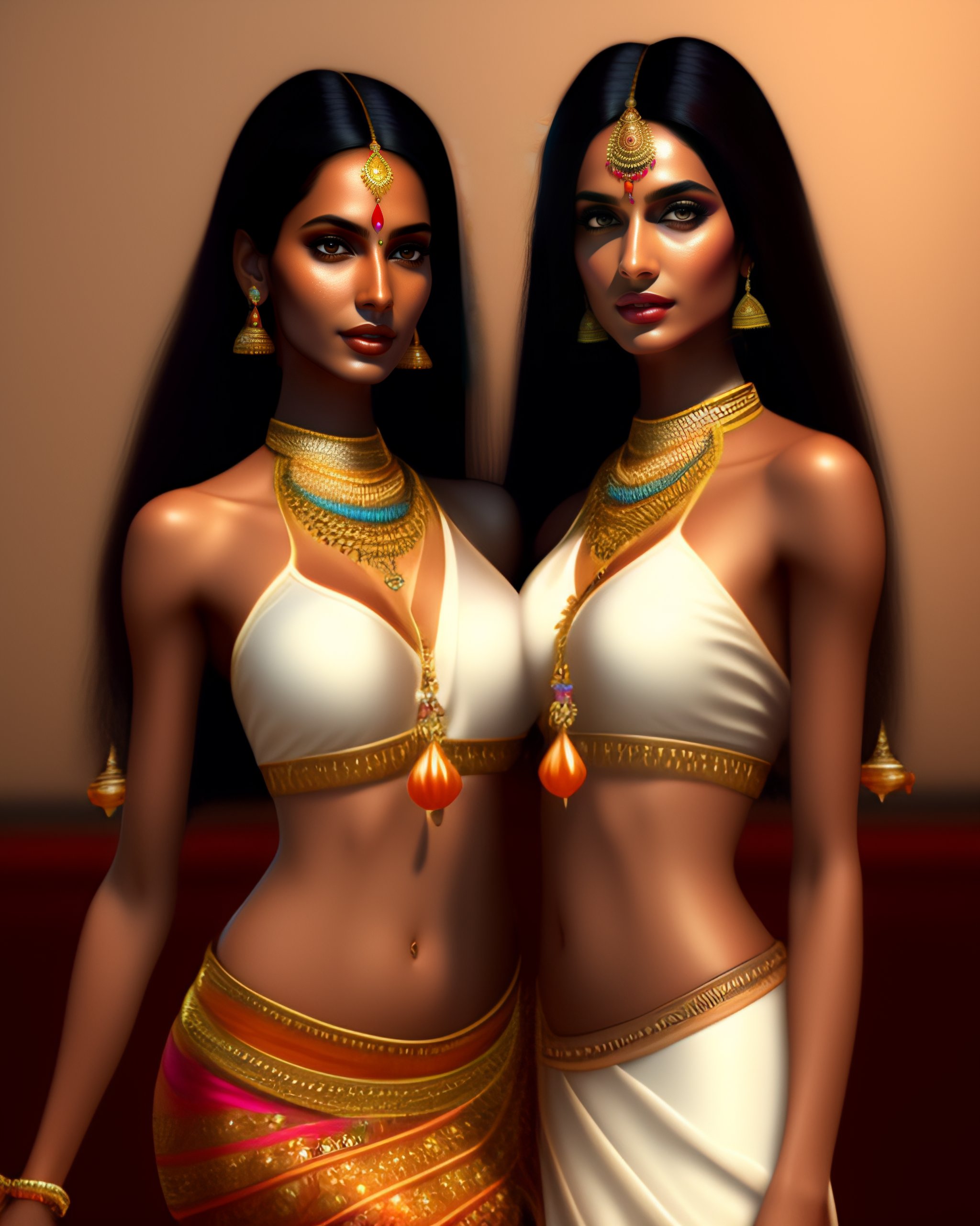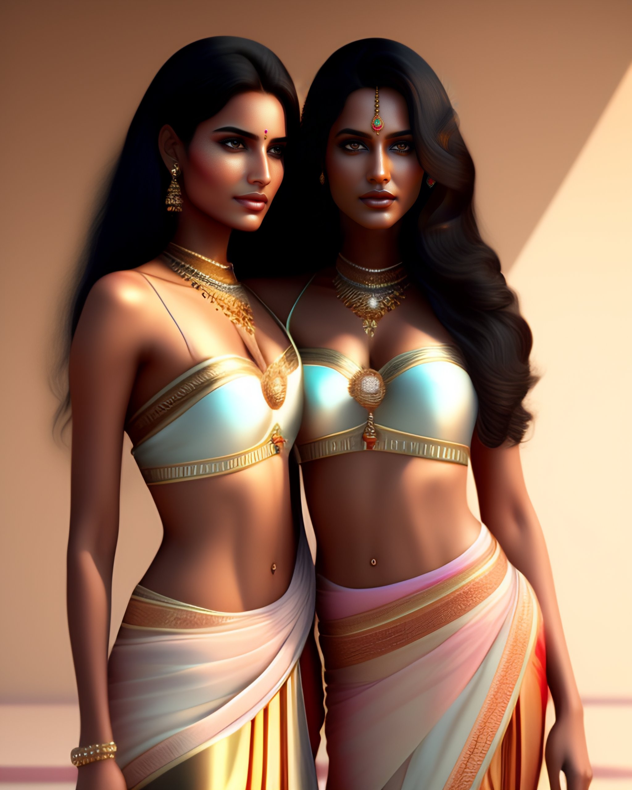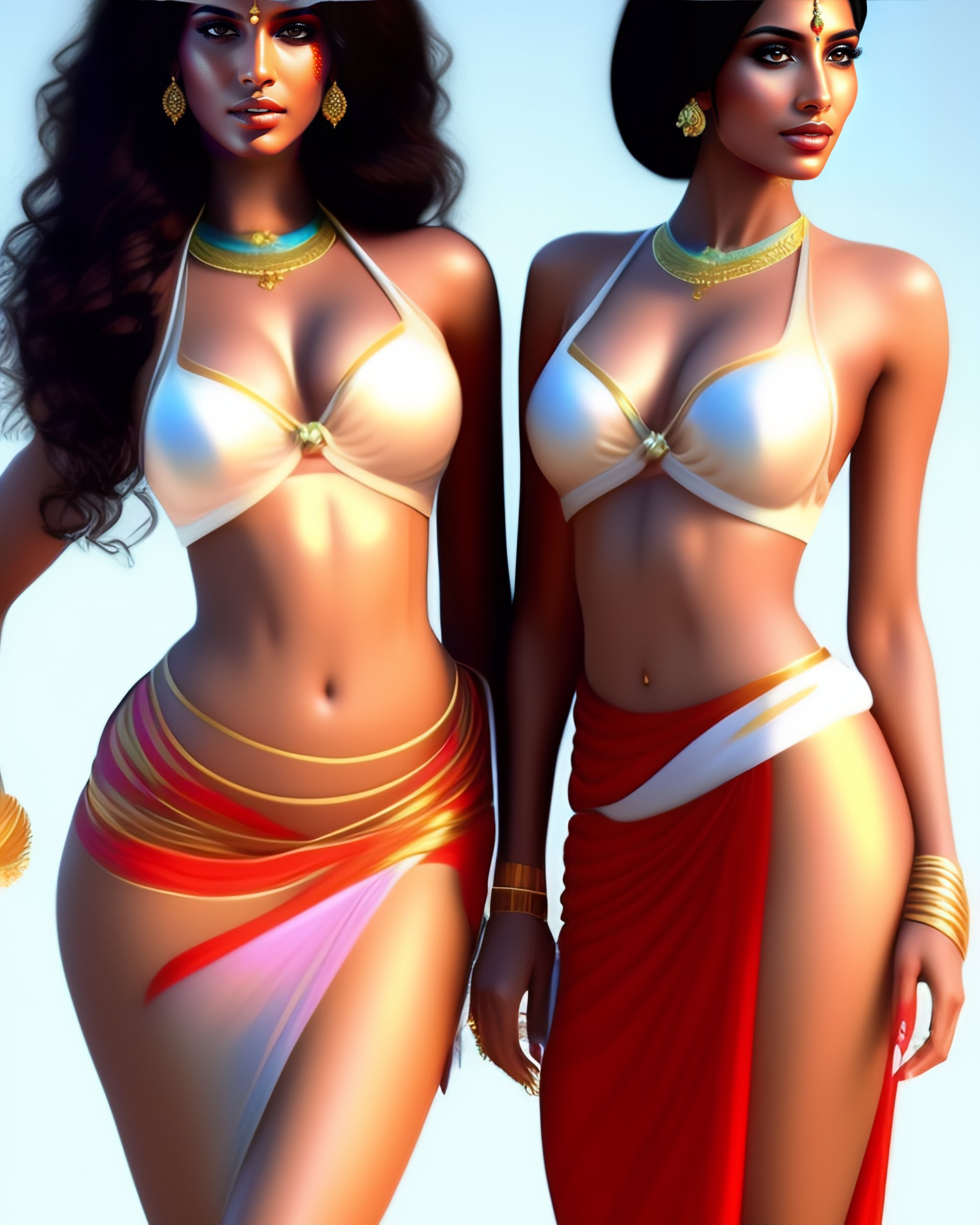 Beautiful indian princesses touching eachother, stomach entirely visible, long legs mostly visible, hyper-realistic art style, pale skin, full body length portrait, sharp facial features, clothing is skintight, small bra, tiny skirt, saree style, stomach is uncovered, sarong wrap, slight smile, standing high heels, minimal clothing, minimal coverage, d cup chest, chest uncovered, navel piercing, realistic